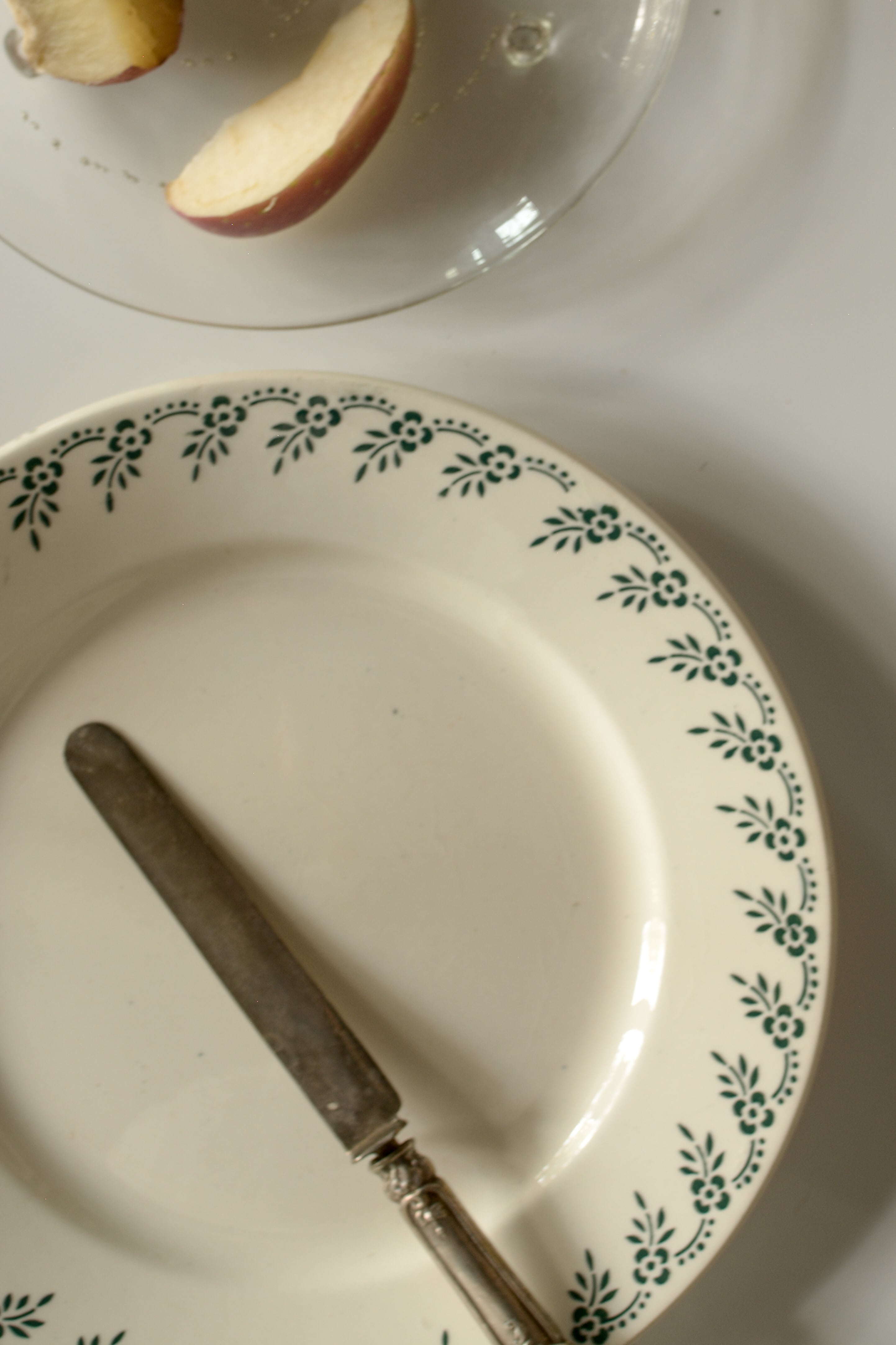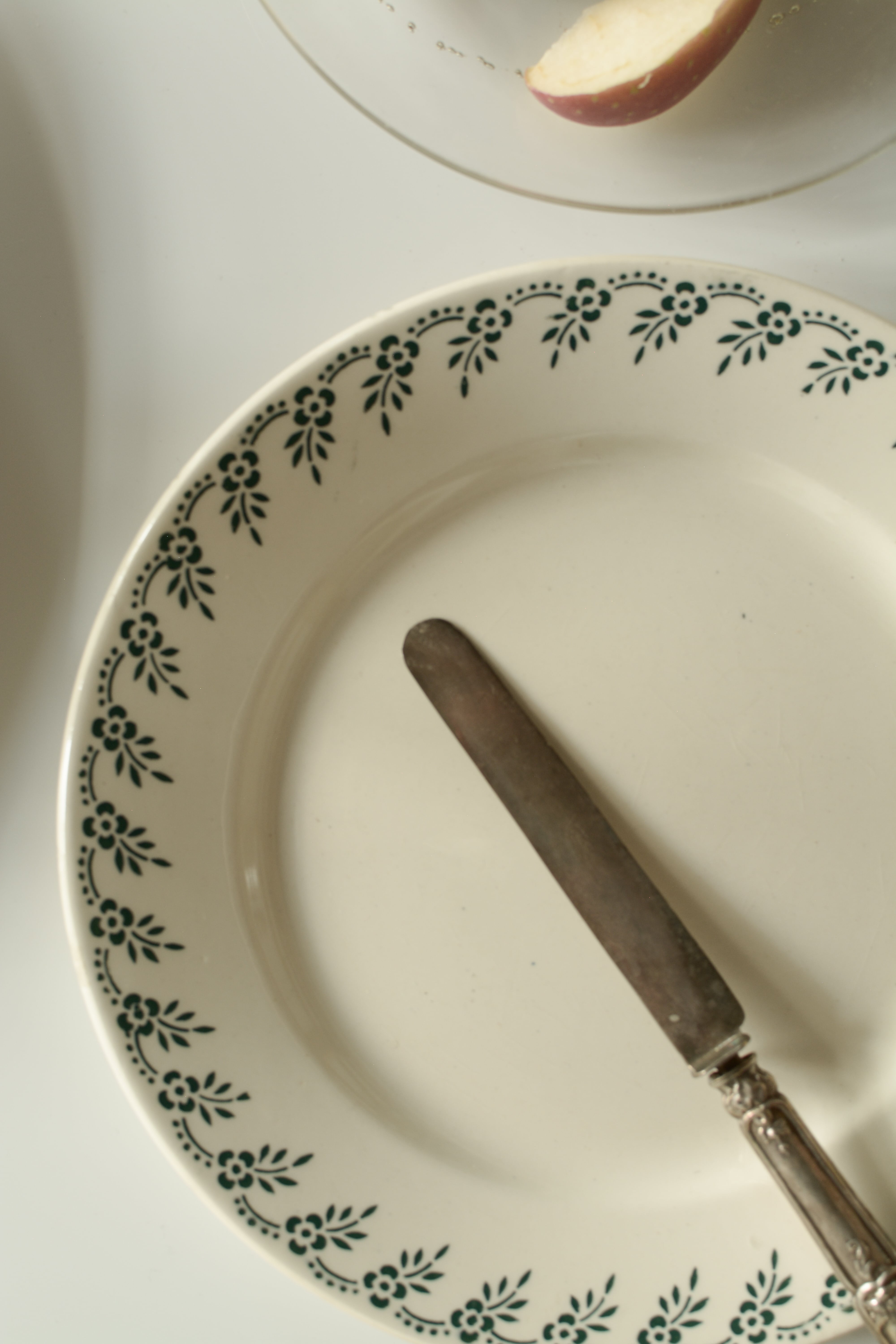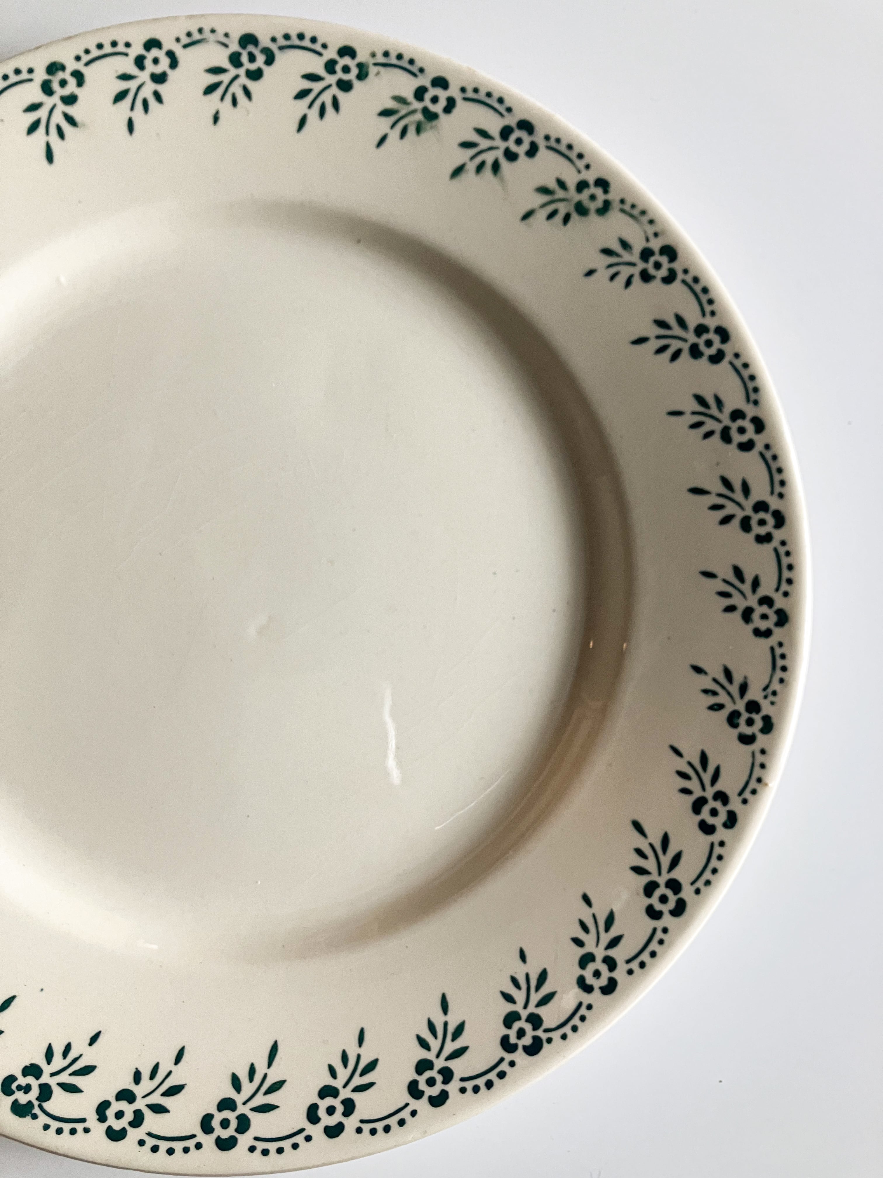 アイボリーカラーの陶肌にグリーンのお花が飾られたChoisy -le-Roi のアンティークプレート。素朴で可愛らしい印象で、お料理にも合わせやすい一枚です。