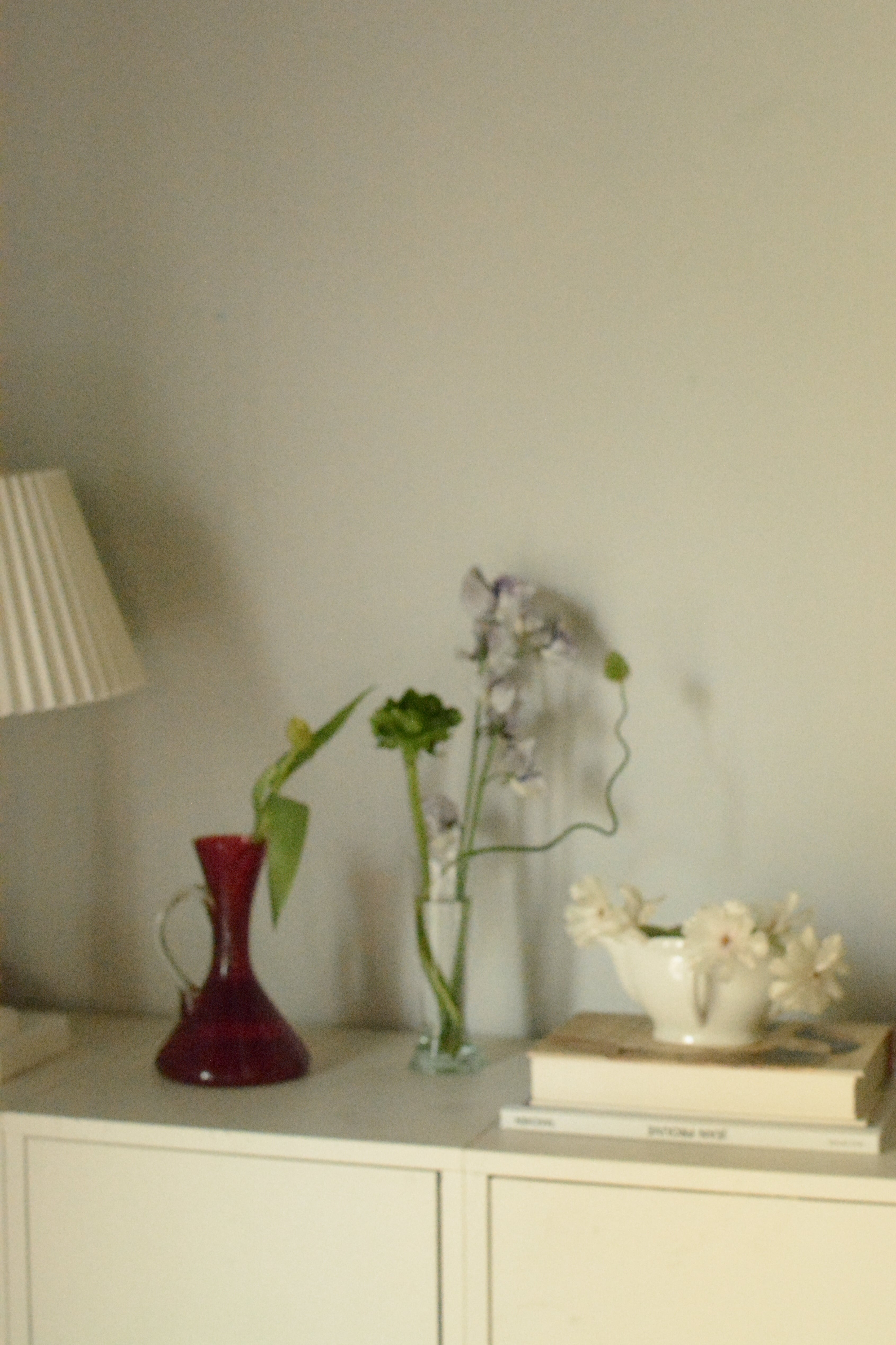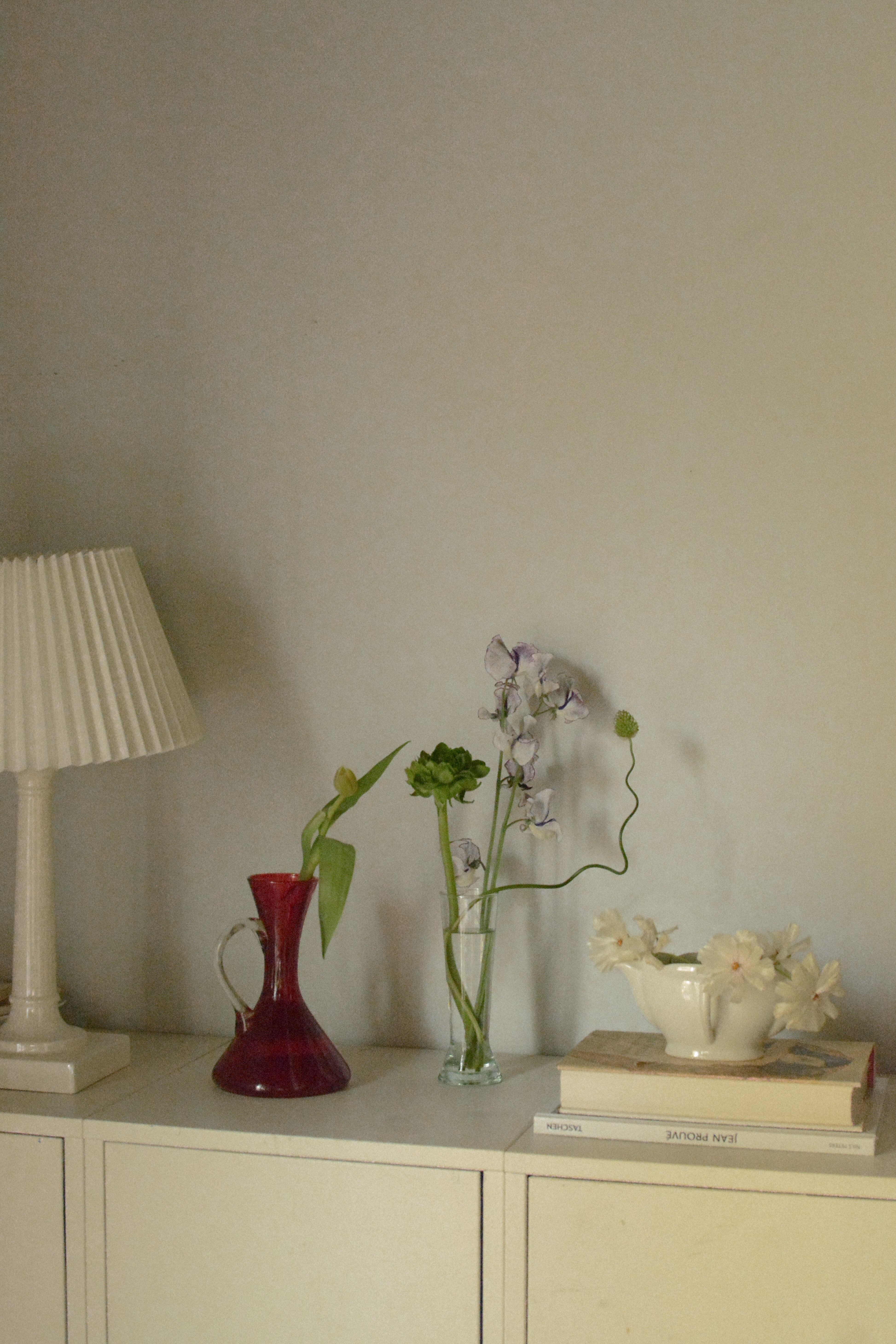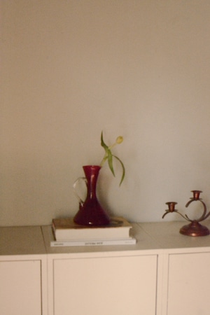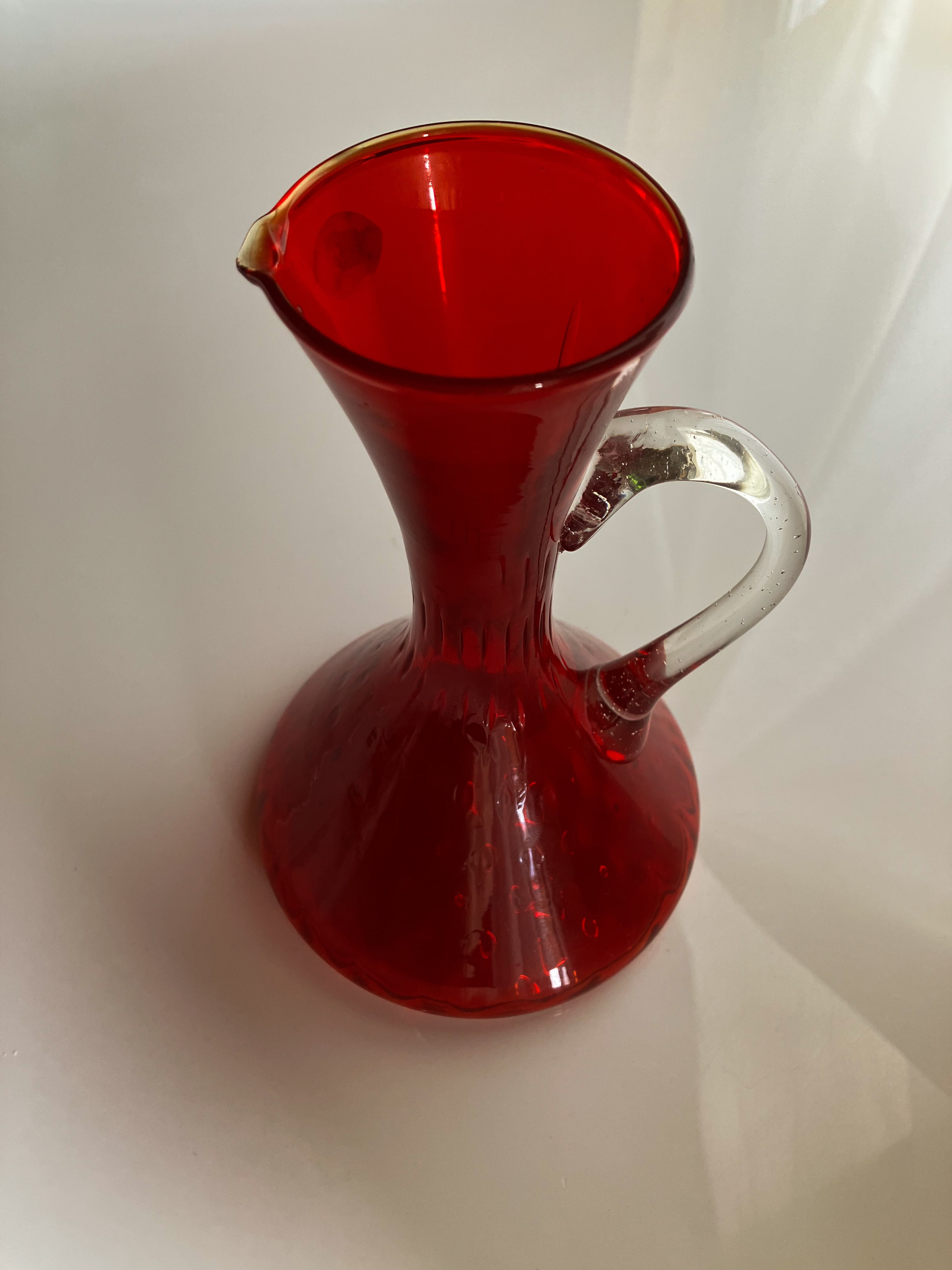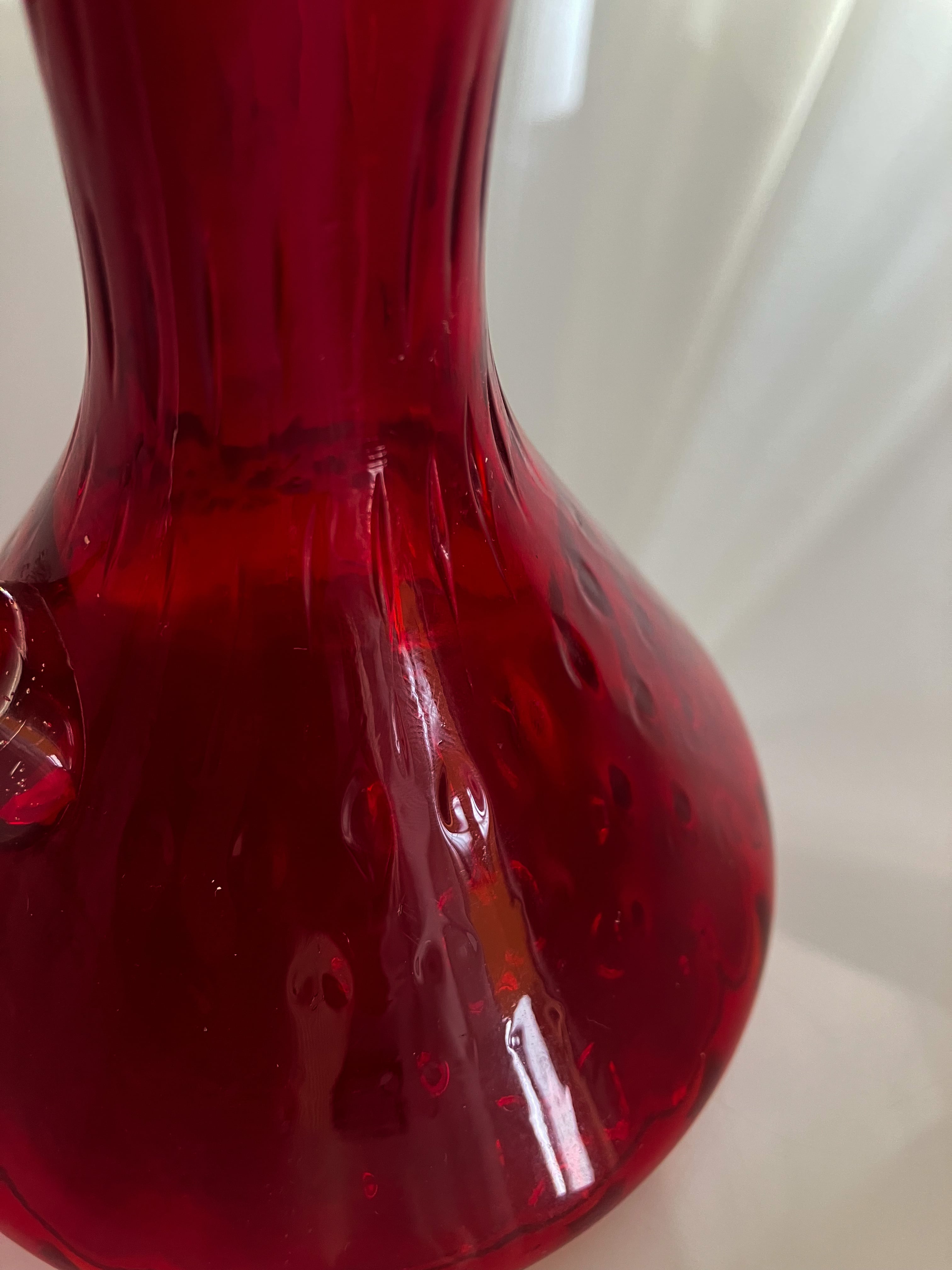 深い赤の美しいヴィンテージフラワーベース。そのものがオブジェのような雰囲気のあるお品です。持ち手の気泡がたっぷりのクリアガラスの部分とのコントラストがとても可愛いですね。小傷等ございますが、ヴィンテージとしては比較的綺麗な状態です。