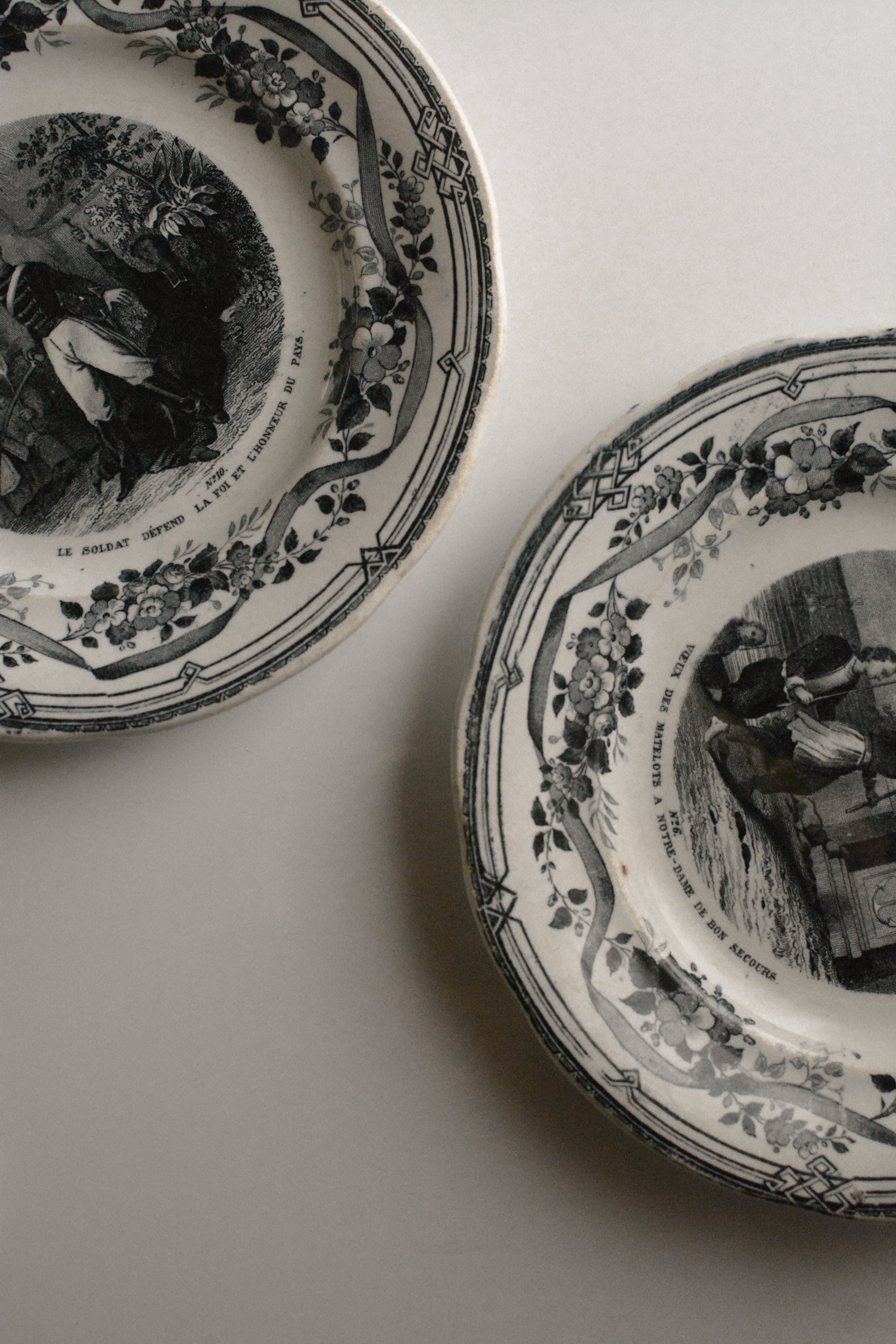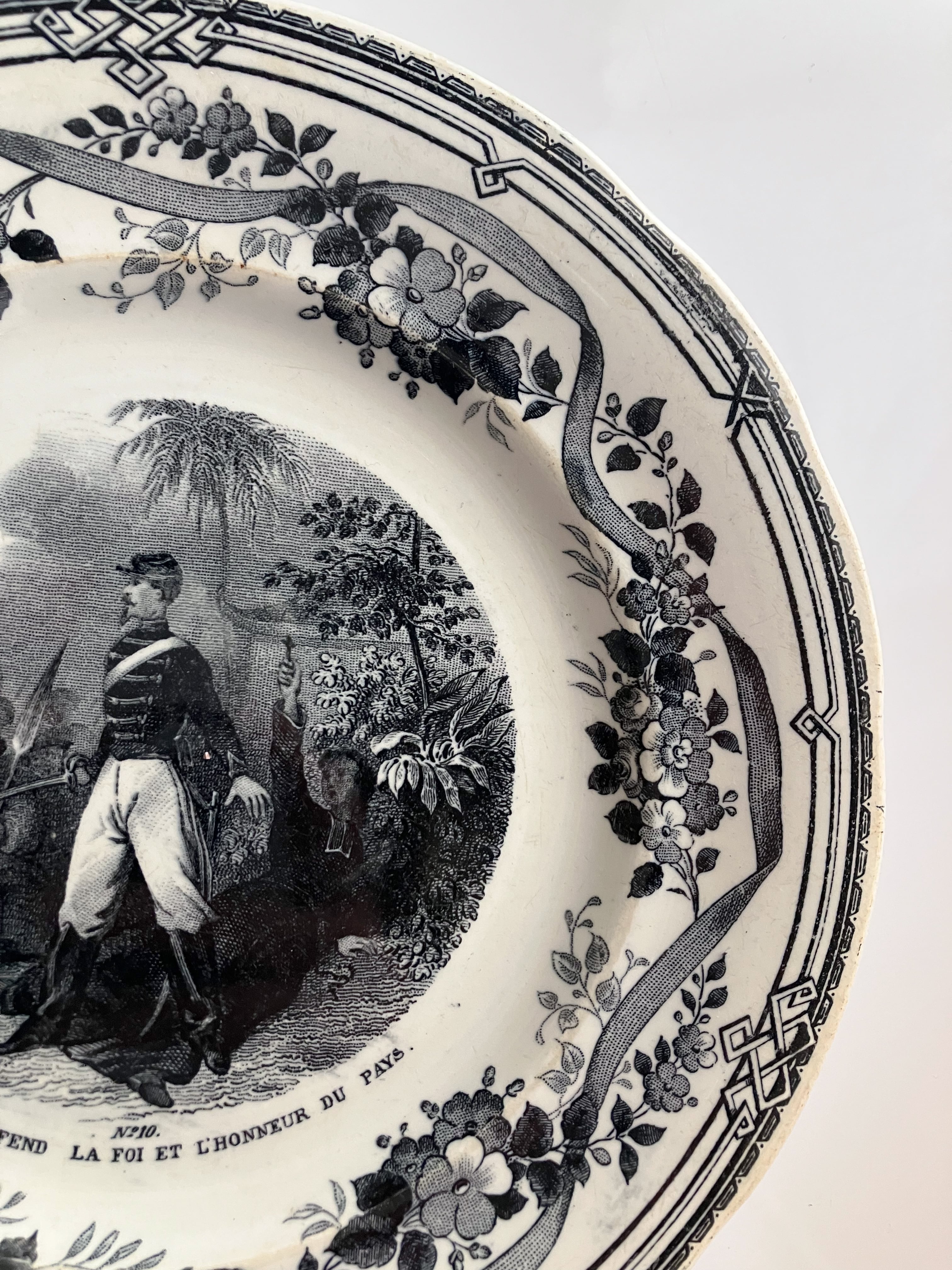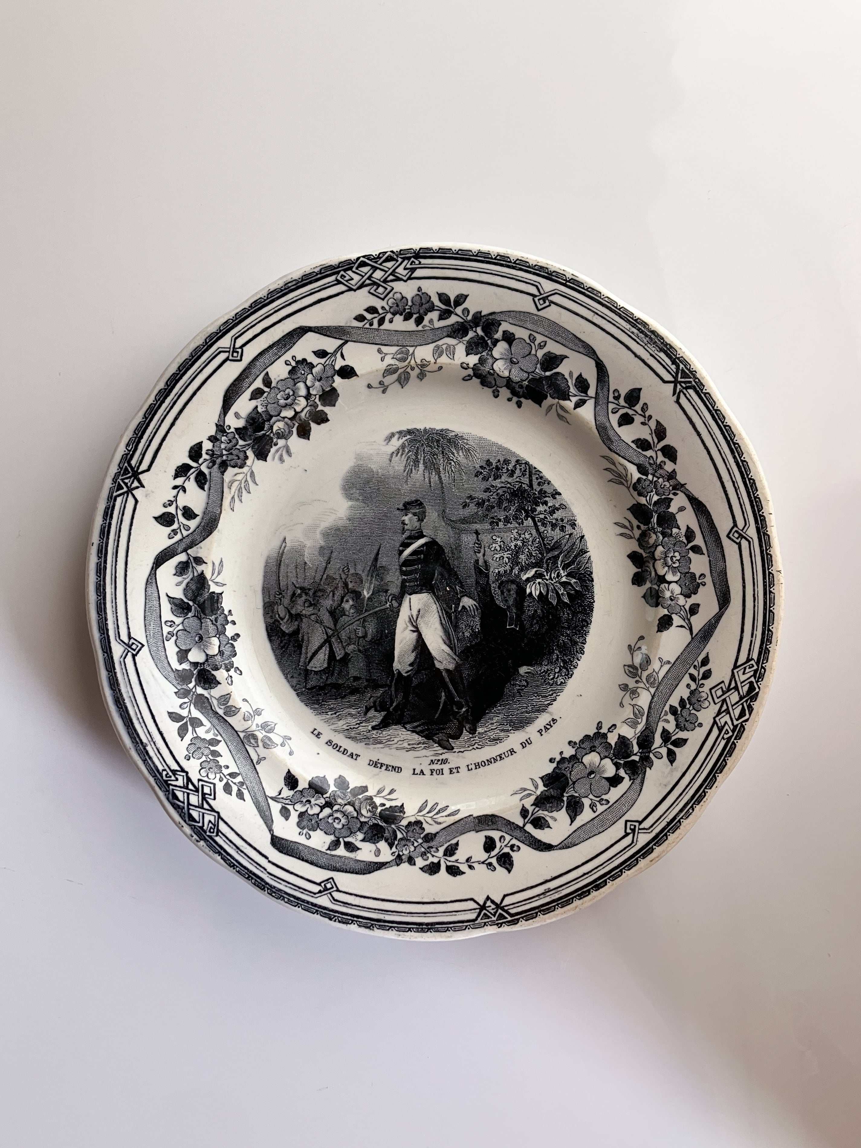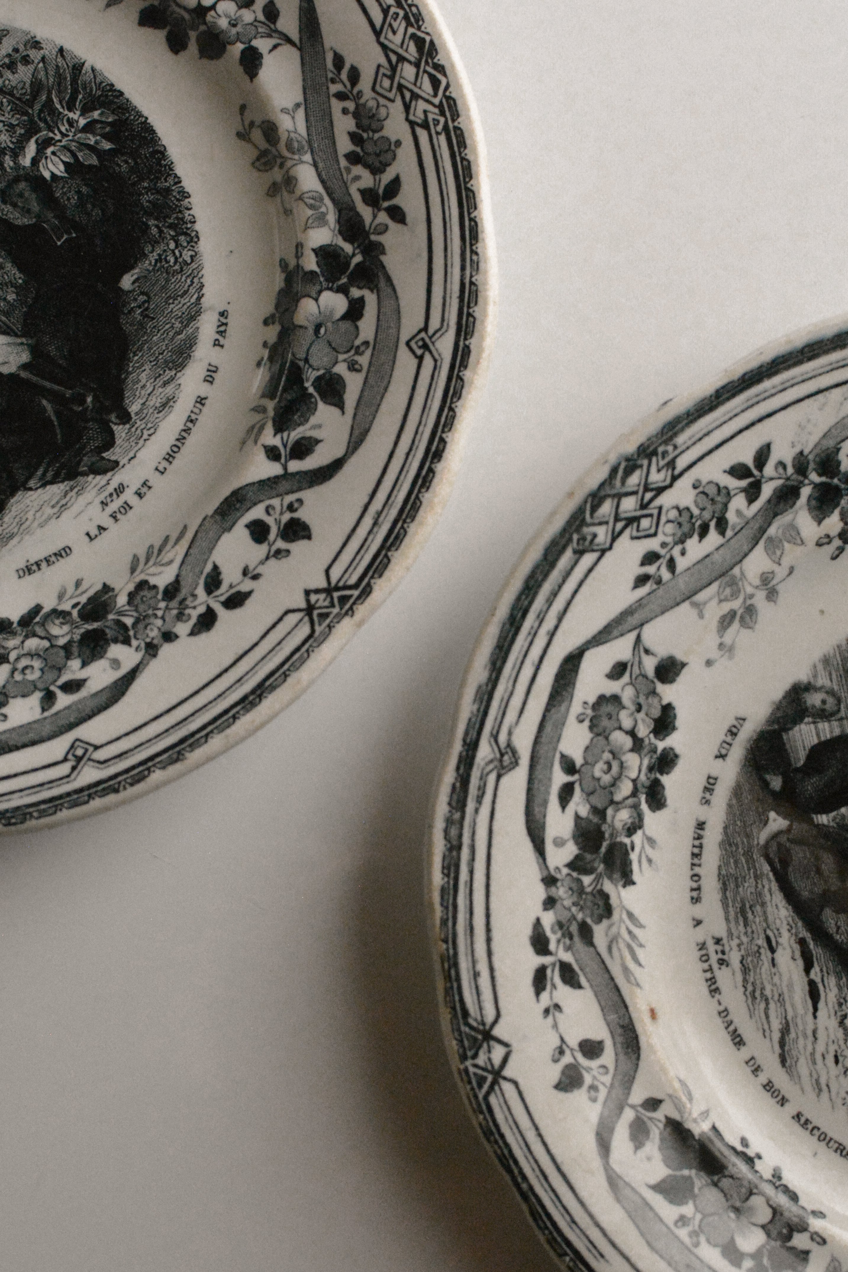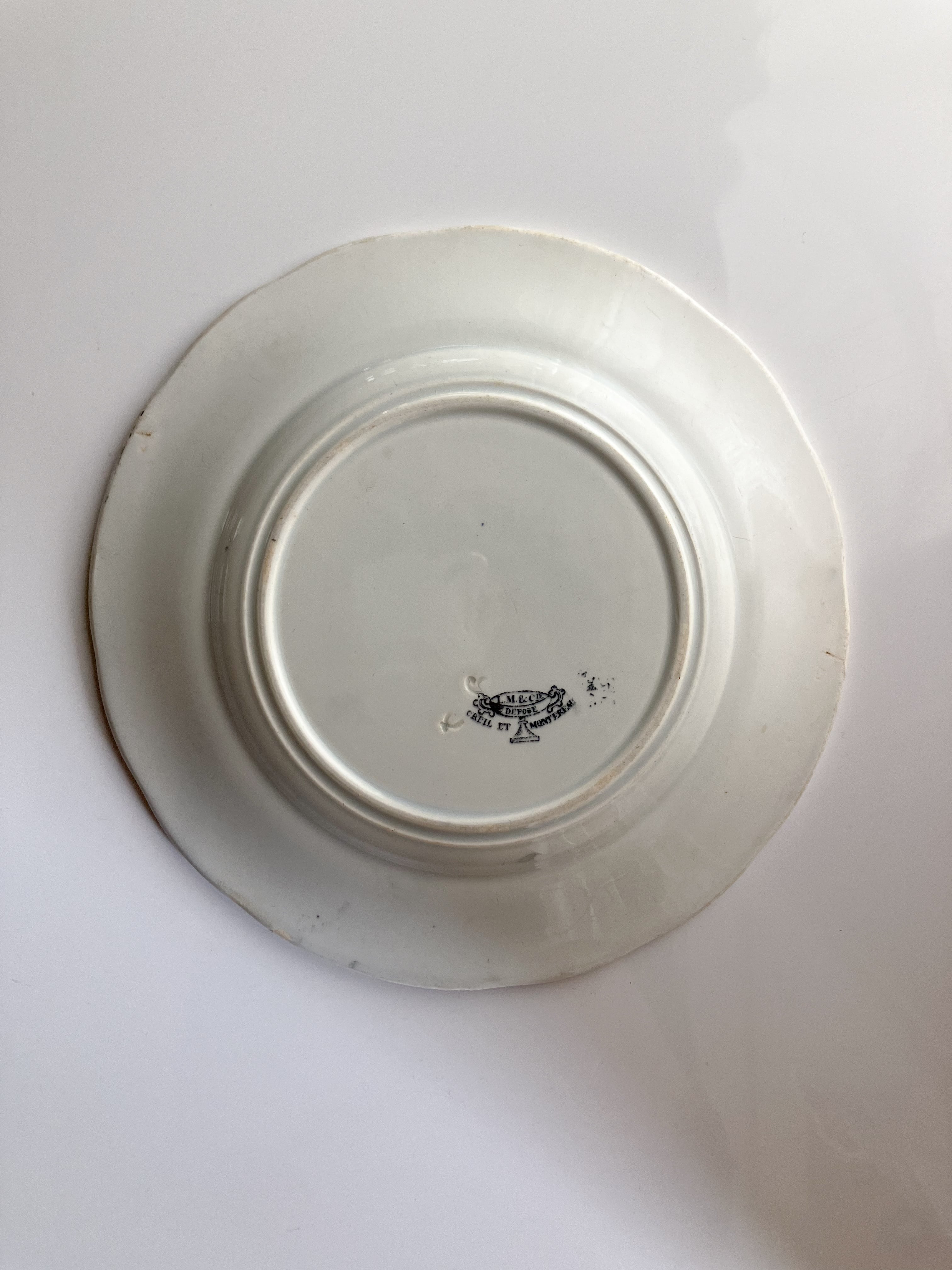 Creil et Montereauのグリザイユプレート。経年変化が現れ、とても趣きのある佇まいですが、カケやヒビ等はみられず比較的良い状態です。絵柄は2種類ございます。