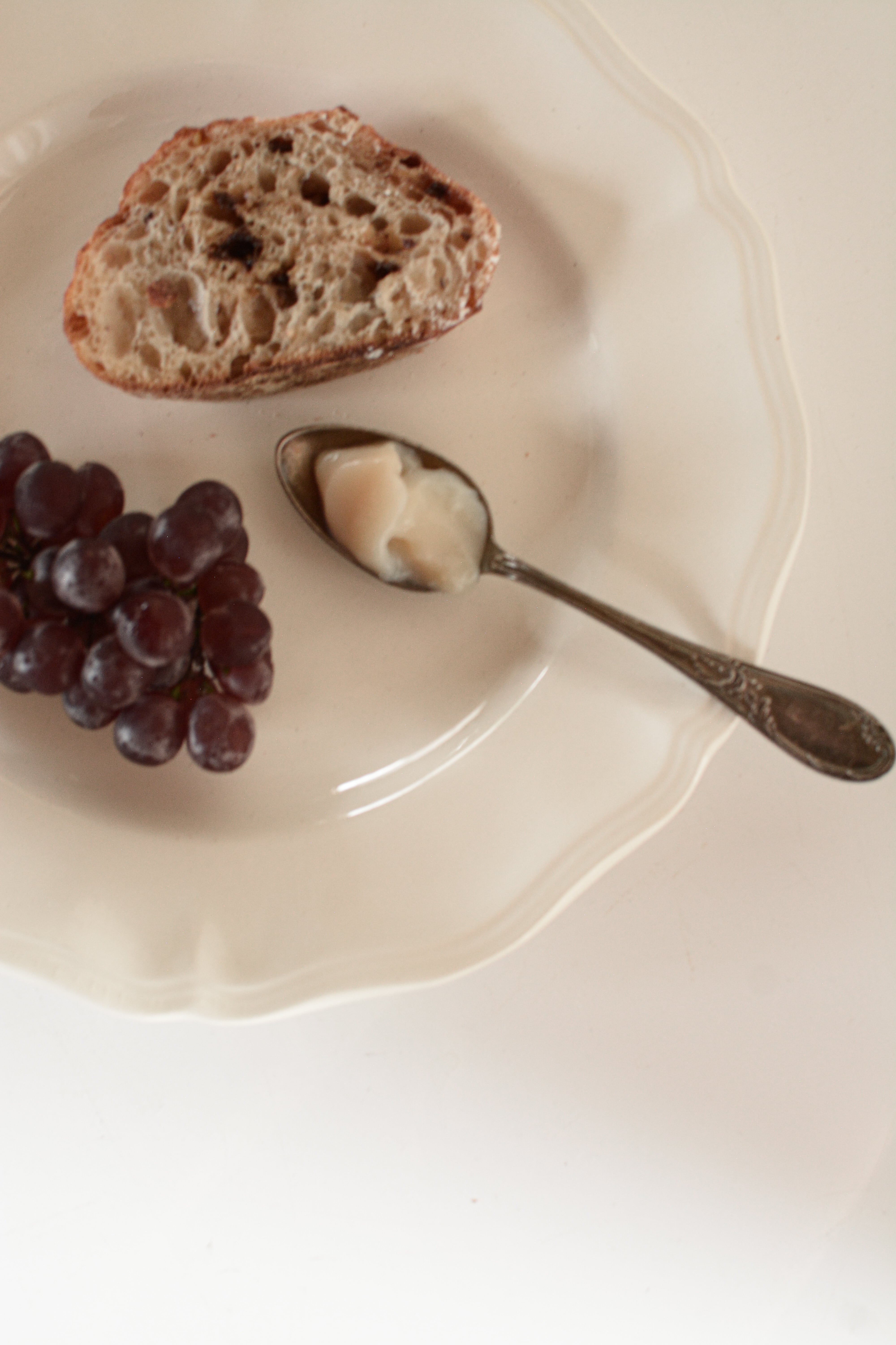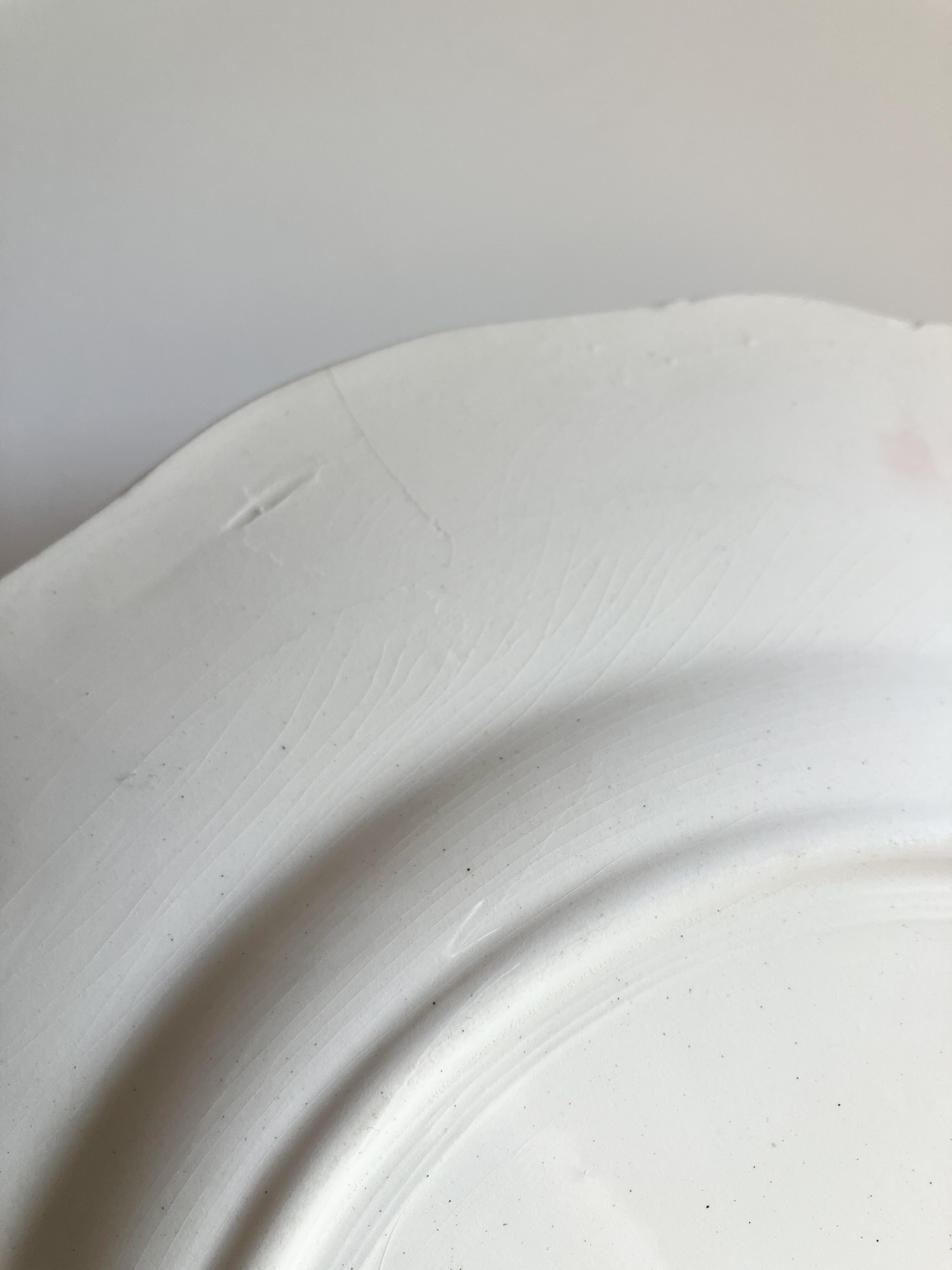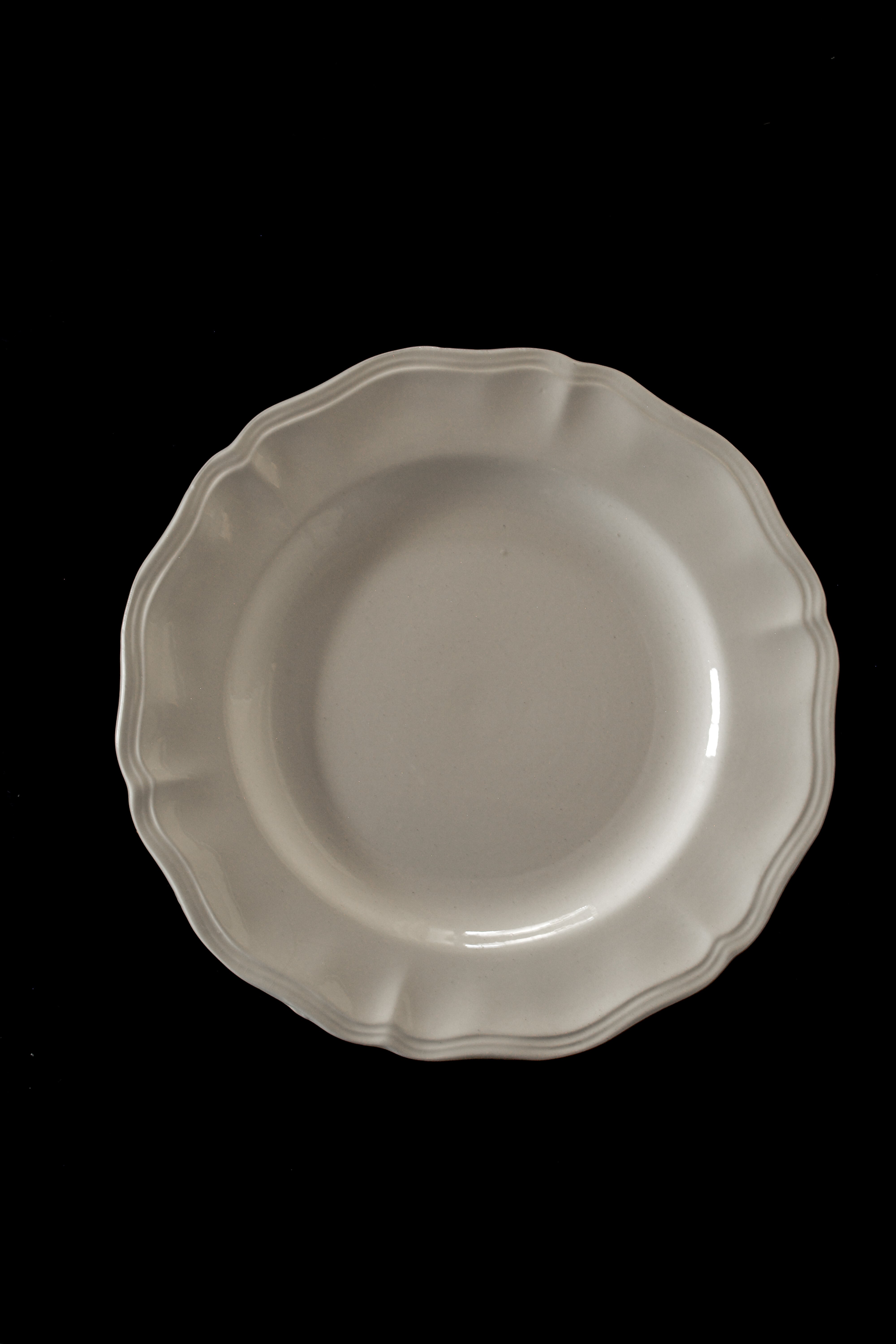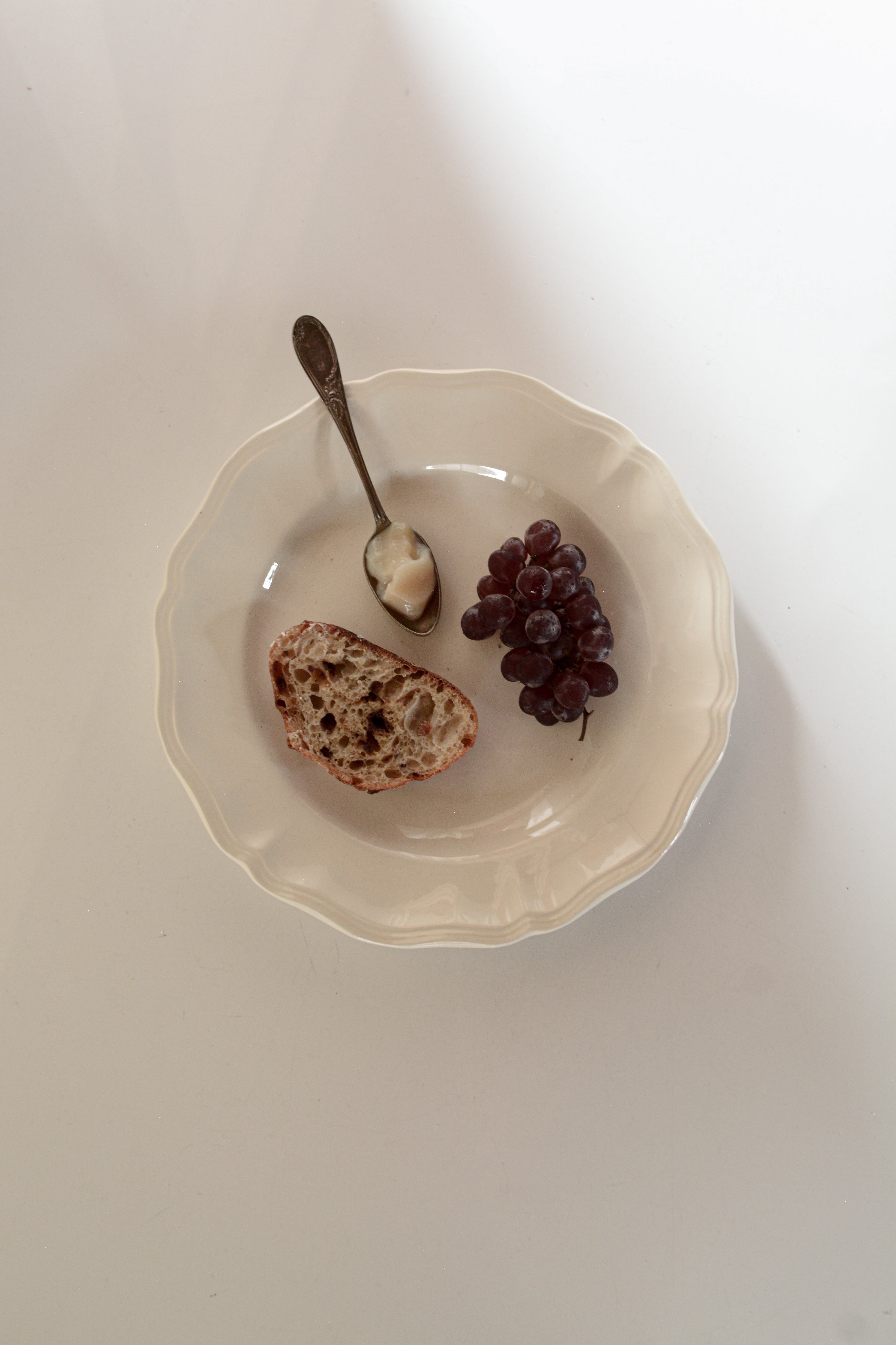 やわらかく象牙色がかった釉薬、実用性のなかにも装飾性を宿し、滑らかな艶が素朴な美しさを引き立てています。釉薬の奥に浮かぶ小さなシミや、そっと入った細かなひび、長い年月を経た器ならではの趣があり、静かな存在感を放つ一枚。パンとチーズをのせてワインとともに。季節の果物や、小さな焼き菓子にも。日々の食卓を、さりげなく整えてくれるアイテムです。