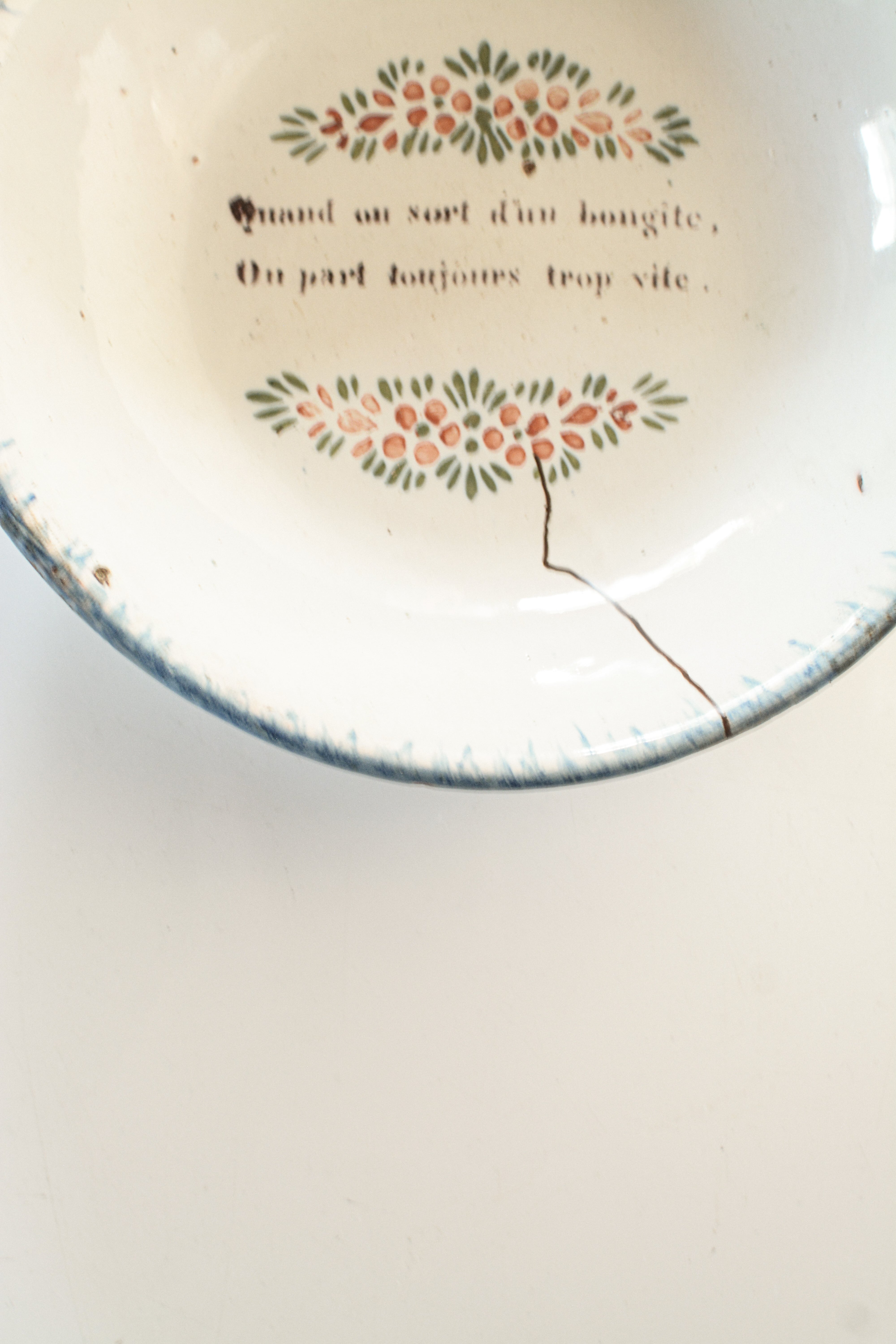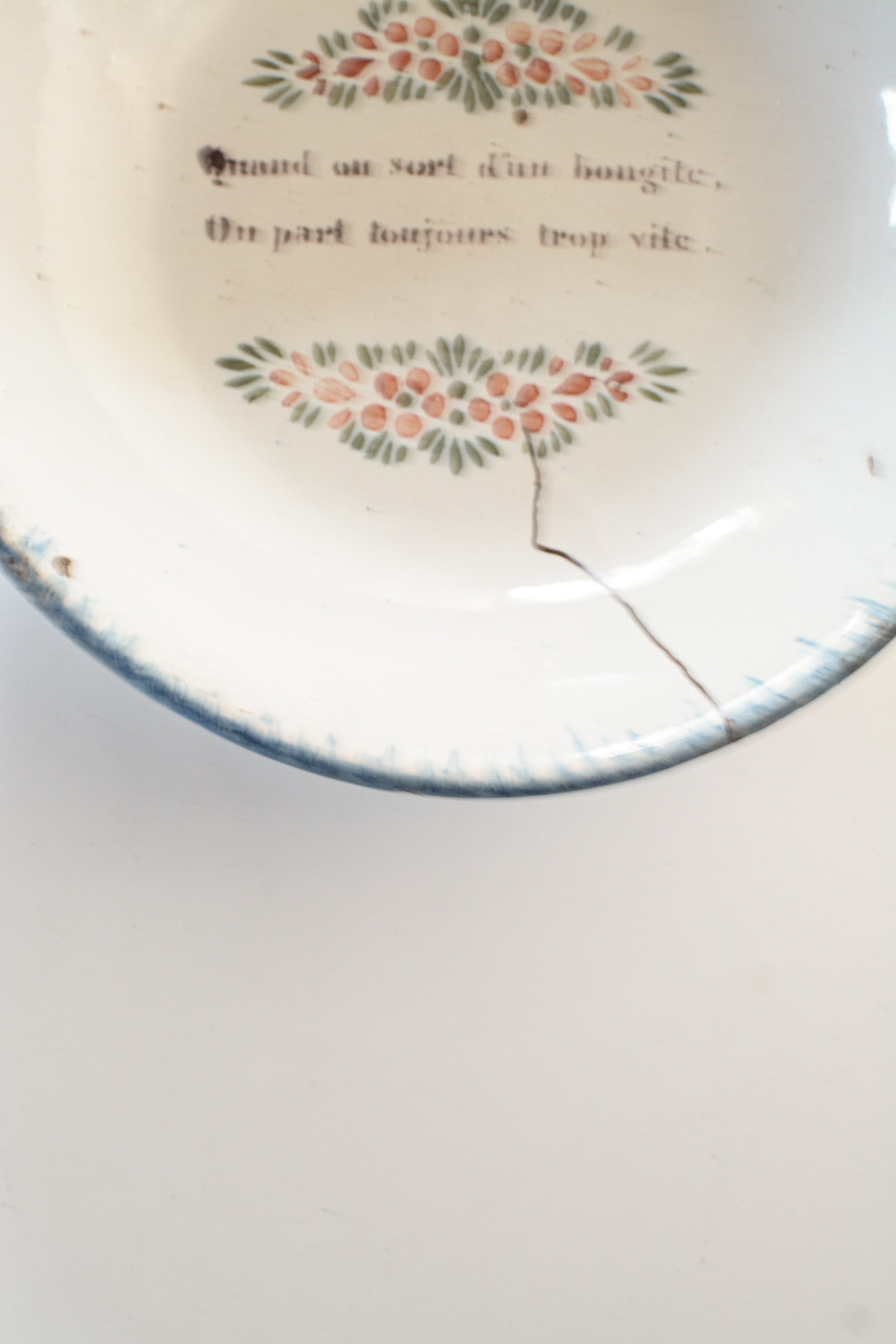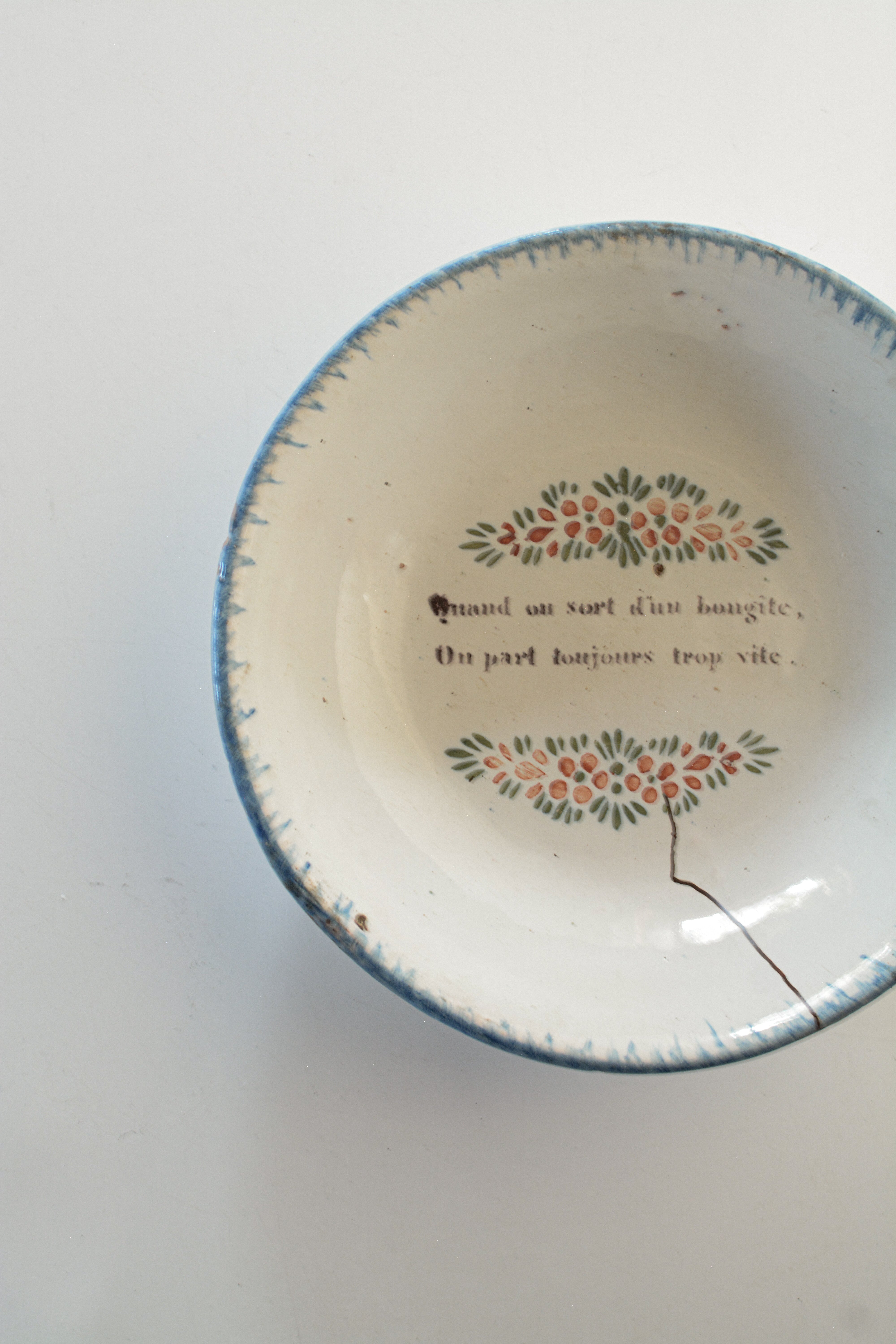 小さなボウルの内側には、そっと言葉が刻まれています。“Quand on sort d’une bougîte, on part toujours trop vite.” 時間がくれた風合いも、この器の物語の一部として縁の欠けはあえてそのままに、ヒビは漆で補修しています。金ではなく、かといって黒漆だと強すぎるので、色味を調節して器のもつ素朴な表情と調和するように仕上げました。カケなどございますのでお値段も控えめにしております。一度は役目を終えたと思われた一枚、そっと受け継がれていってくれれば嬉しいです。継がれた器についての注意点は、注意事項をご確認下さいませ。