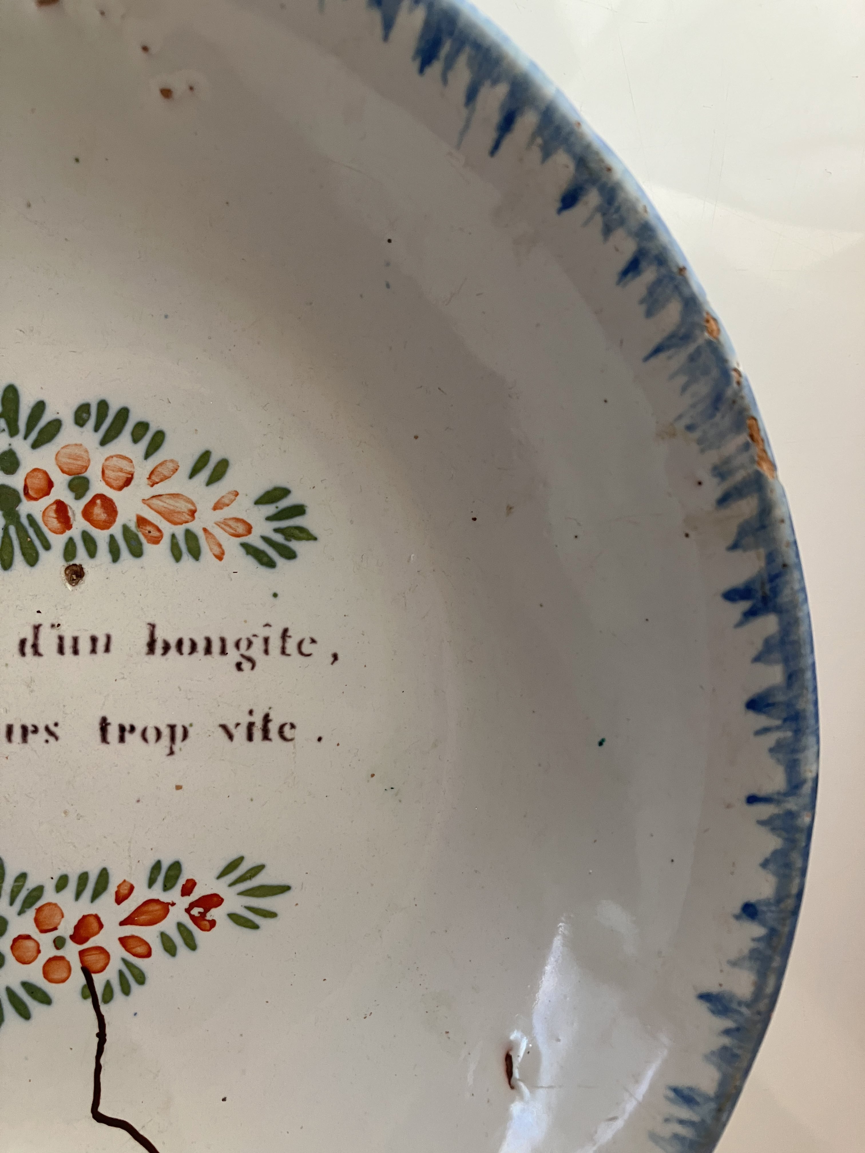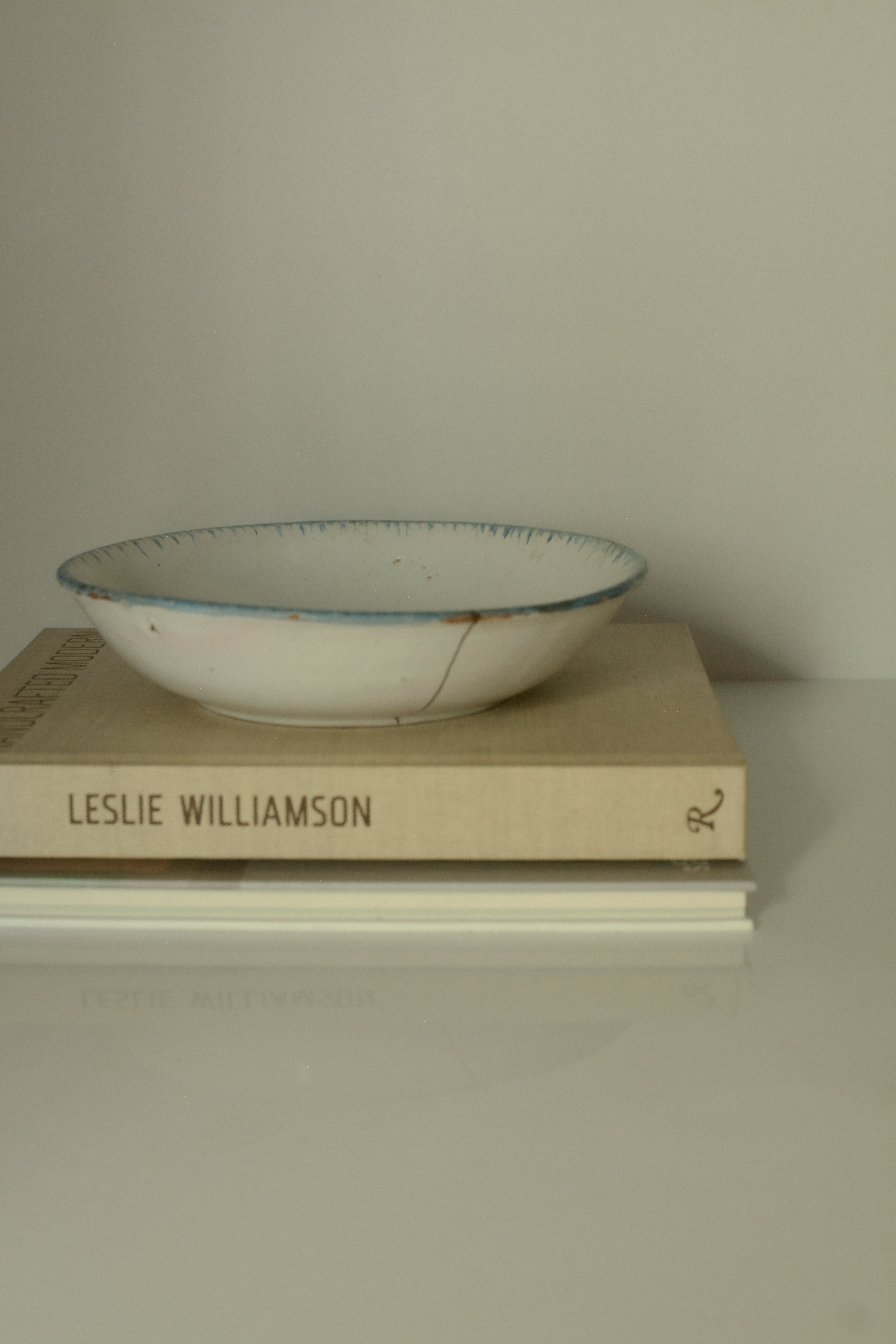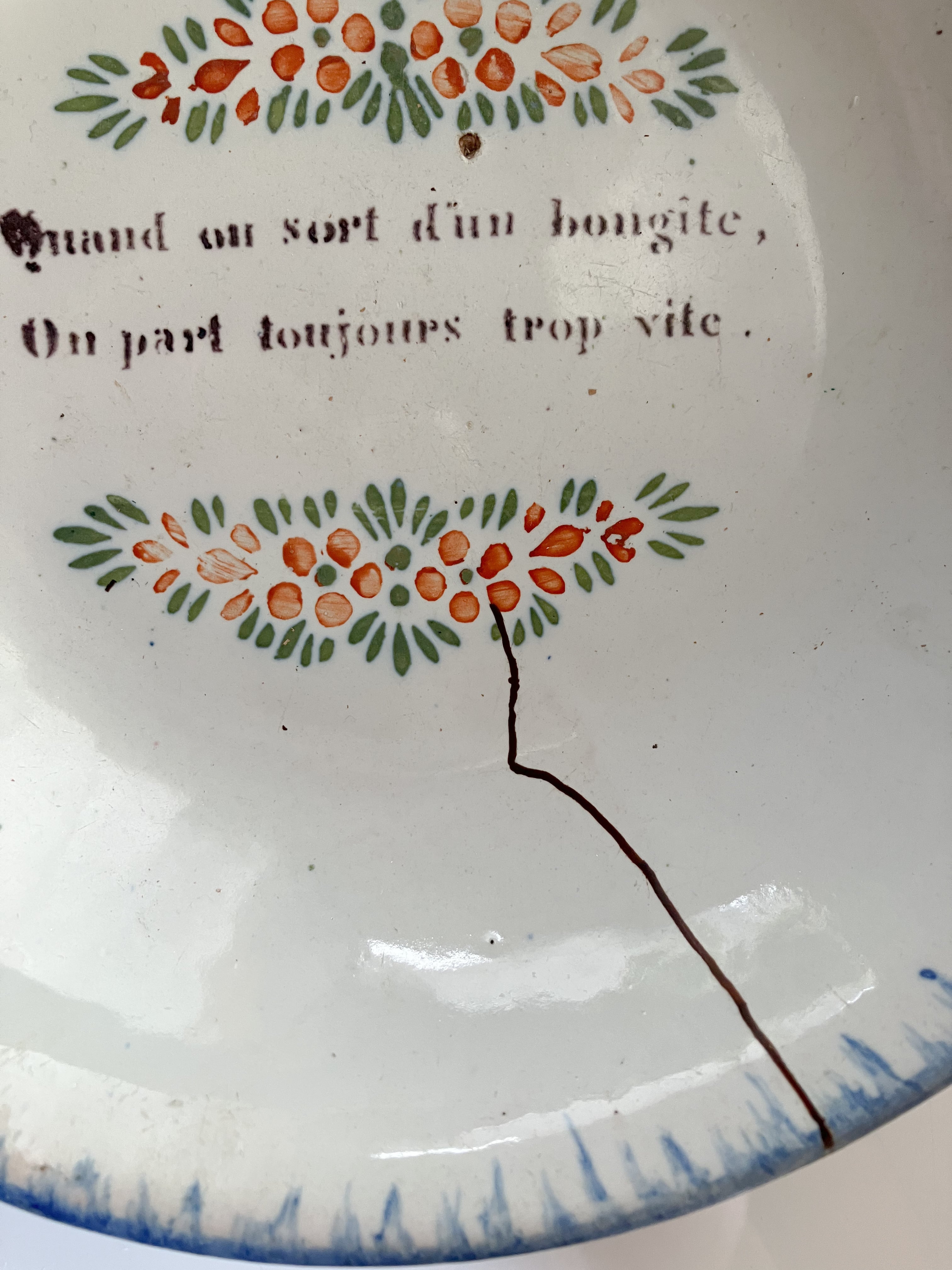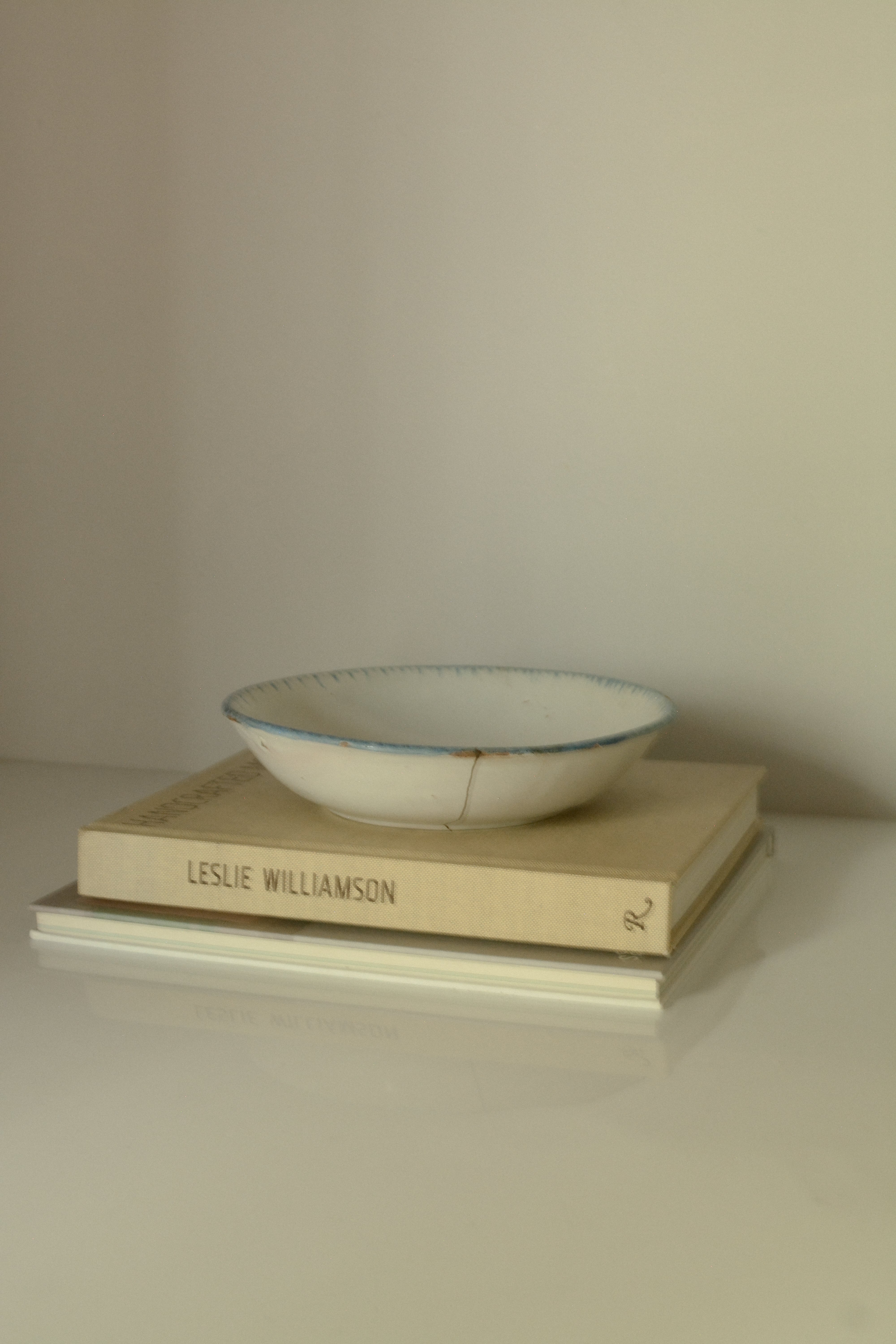小さなボウルの内側には、そっと言葉が刻まれています。“Quand on sort d’une bougîte, on part toujours trop vite.” 時間がくれた風合いも、この器の物語の一部として縁の欠けはあえてそのままに、ヒビは漆で補修しています。金ではなく、かといって黒漆だと強すぎるので、色味を調節して器のもつ素朴な表情と調和するように仕上げました。カケなどございますのでお値段も控えめにしております。一度は役目を終えたと思われた一枚、そっと受け継がれていってくれれば嬉しいです。継がれた器についての注意点は、注意事項をご確認下さいませ。