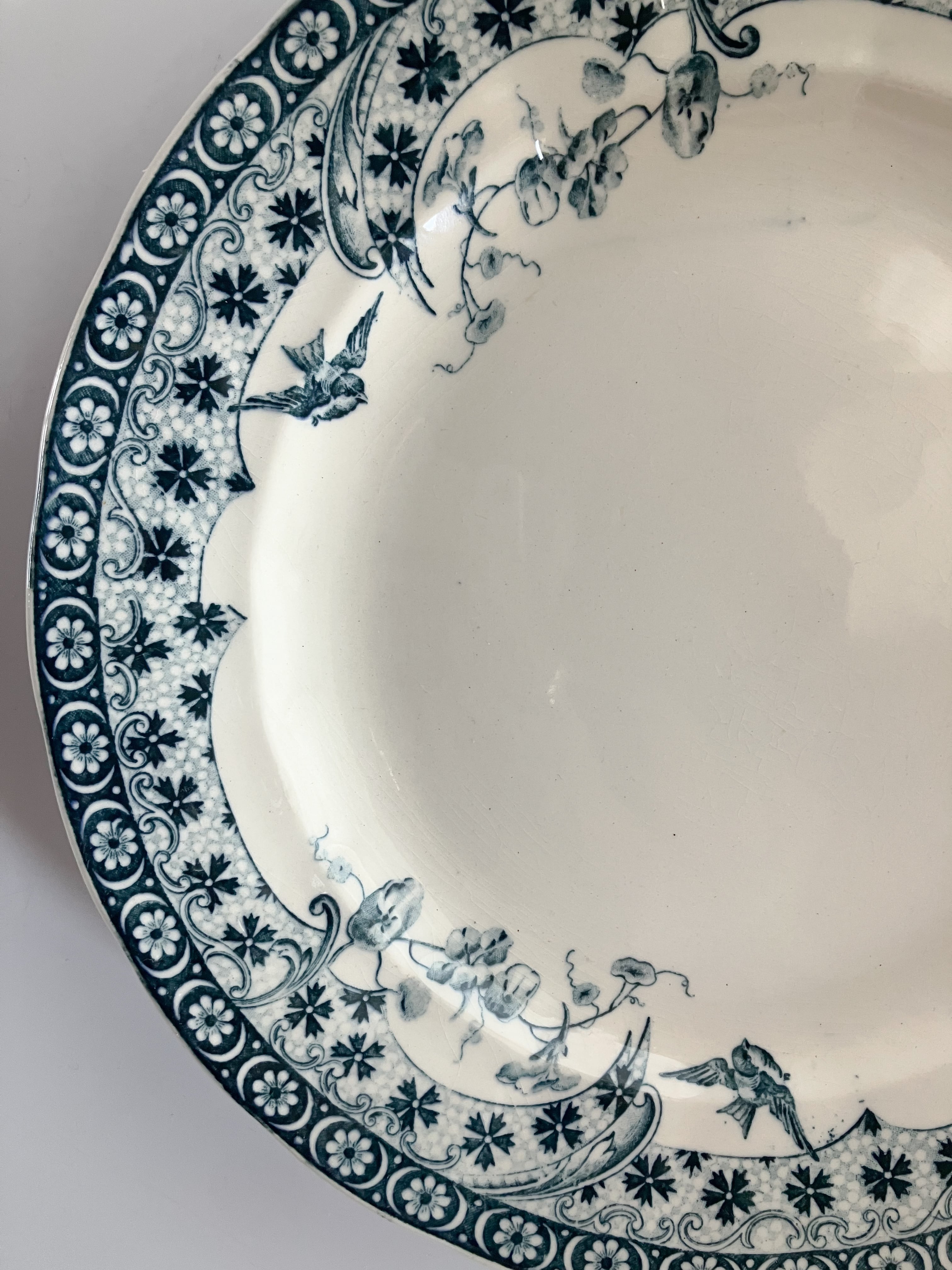 深みのあるブルーで描かれた昼顔、小鳥たちが空を自由に舞うように配されたChoisy -le-Roi のアンティークプレート。まるで物語の一場面を切り取ったかのような趣きがあります。深めのブルーは和洋問わず合わせやすく、どんなシーンのお料理にもマッチしてくれそう。絵画のように飾っても美しい一枚です。小傷等ございますが、アンティークとしては比較的綺麗な状態です。