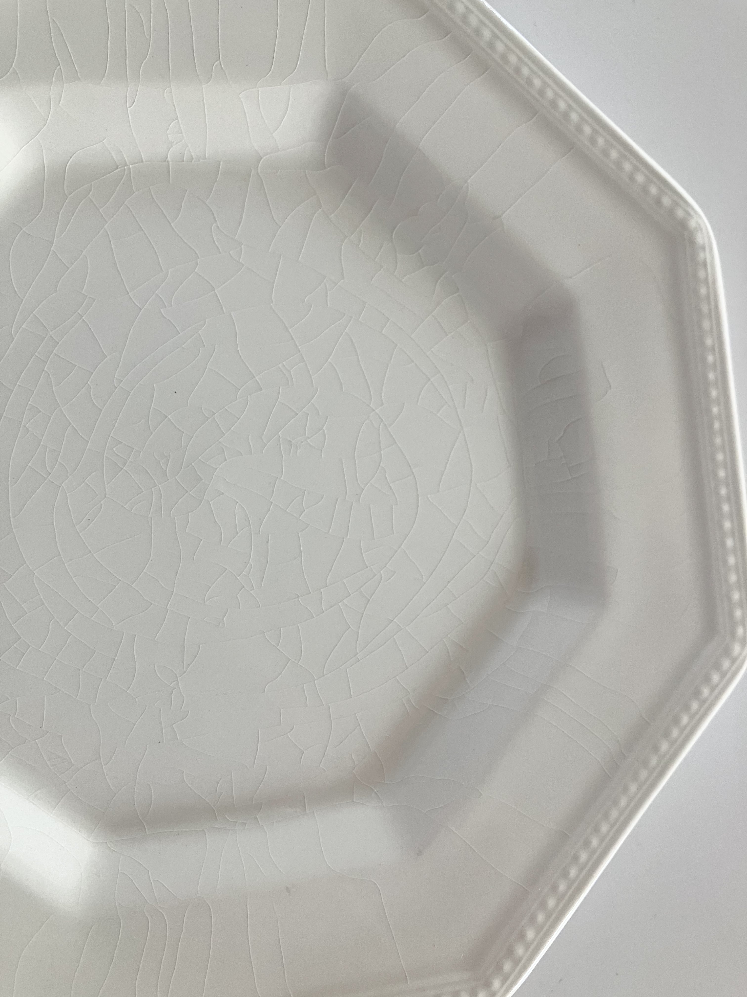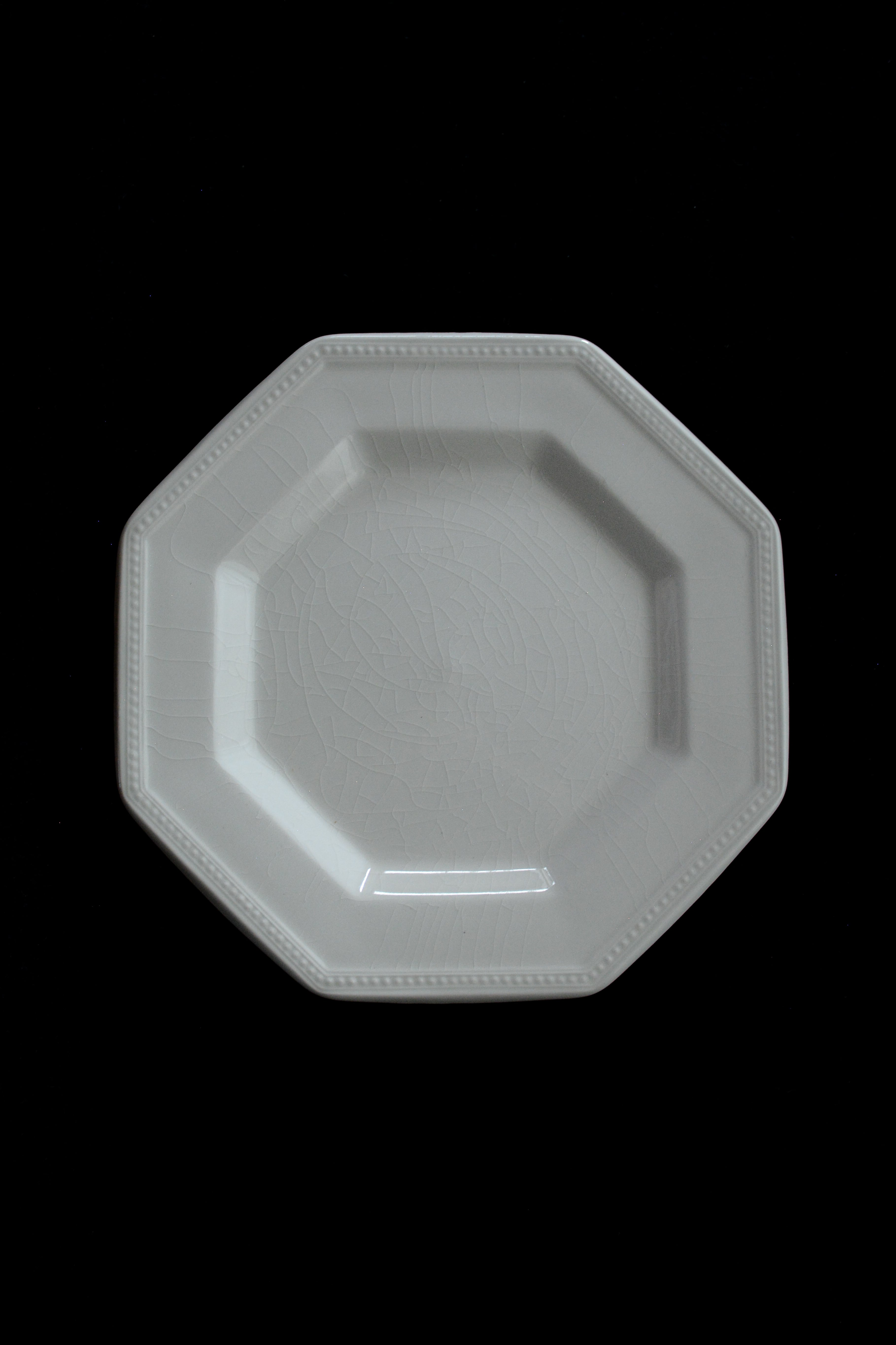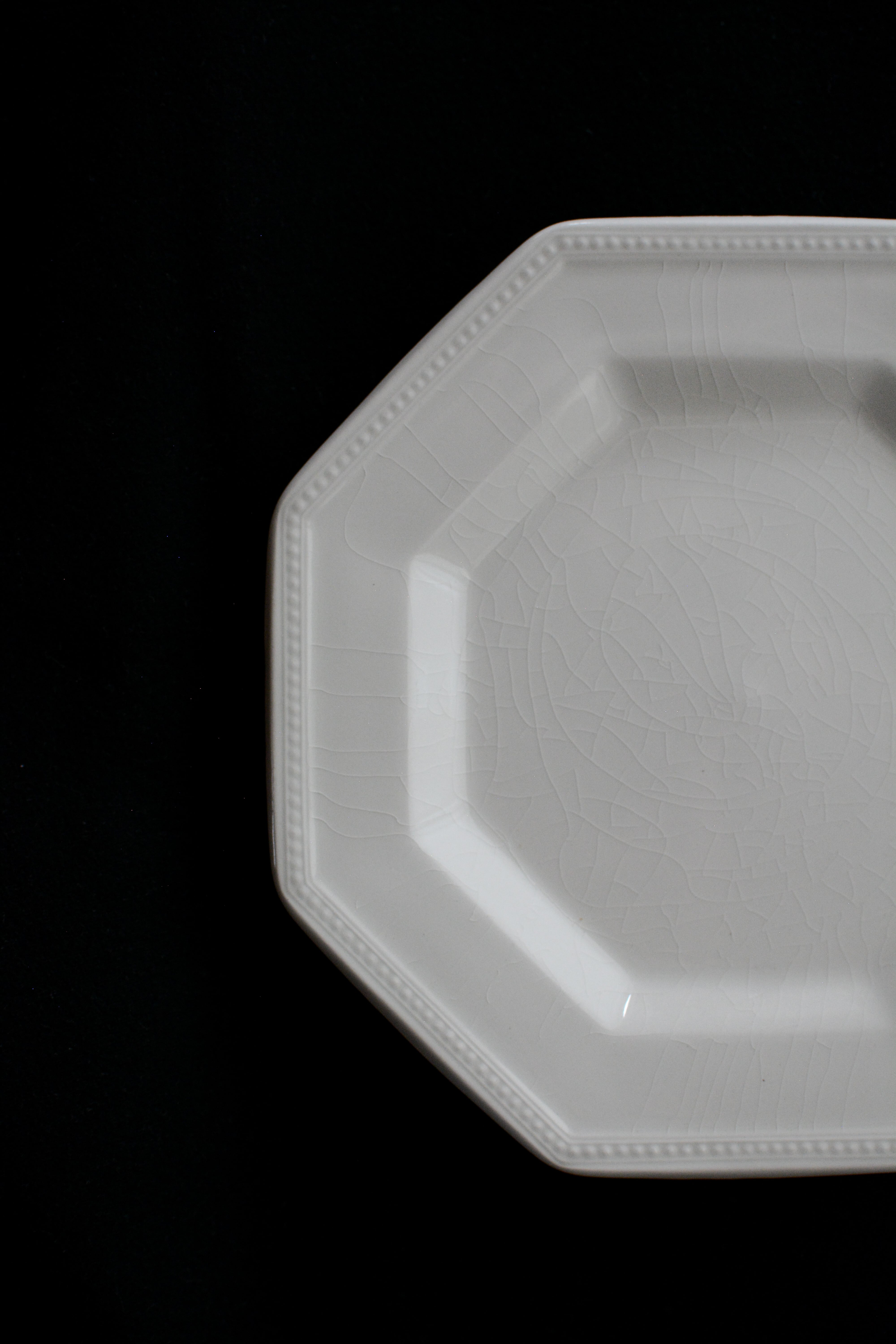フチにパールの飾られたJOHNSON BROTHERS のプレート。様々なコーディネートにマッチし、長く愛せる普遍的なデザイン、オクトゴナル(8角形)のプレートは主役をより魅力的に魅せてくれますね。また貫入も入り、とても雰囲気があります。光の角度や手に取る位置によって、かすかに浮かび上がる繊細なライン。一つひとつ異なるその模様は静かな美しさを宿しています。