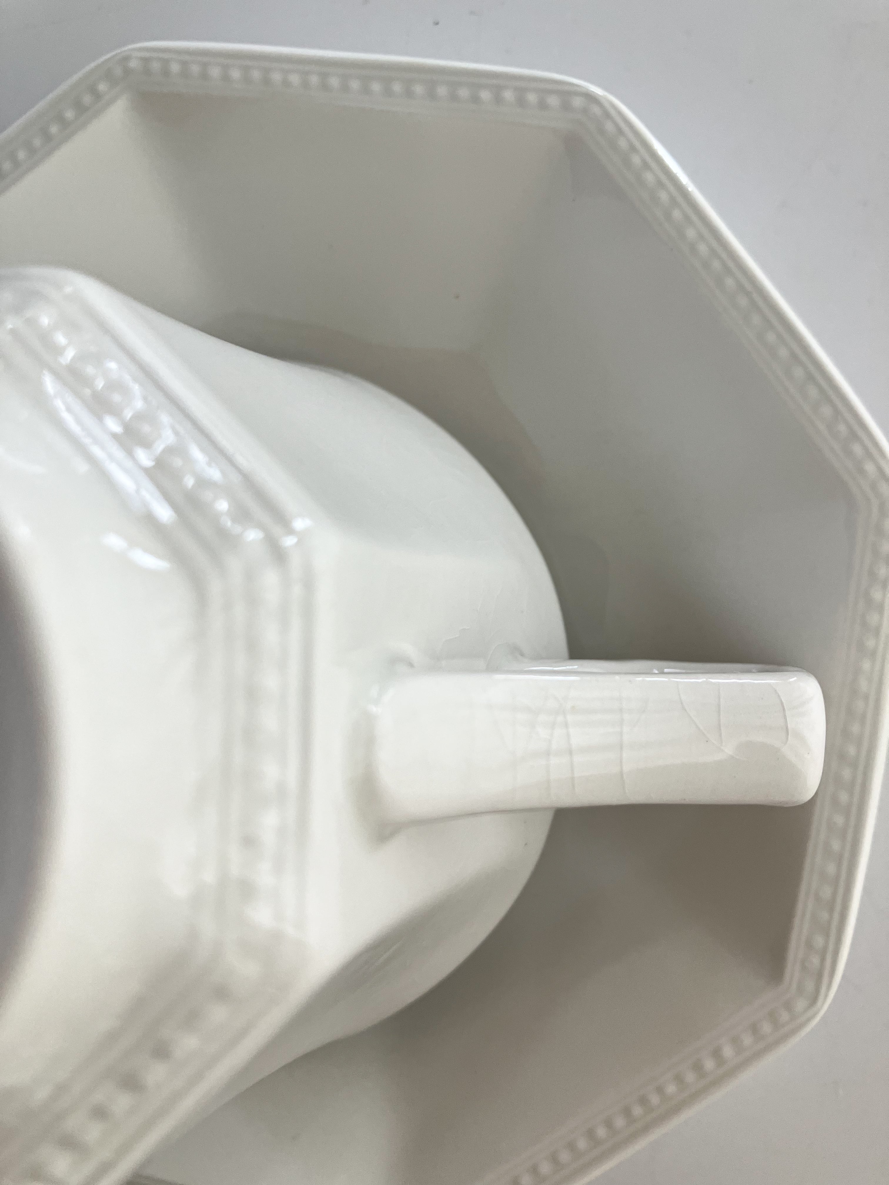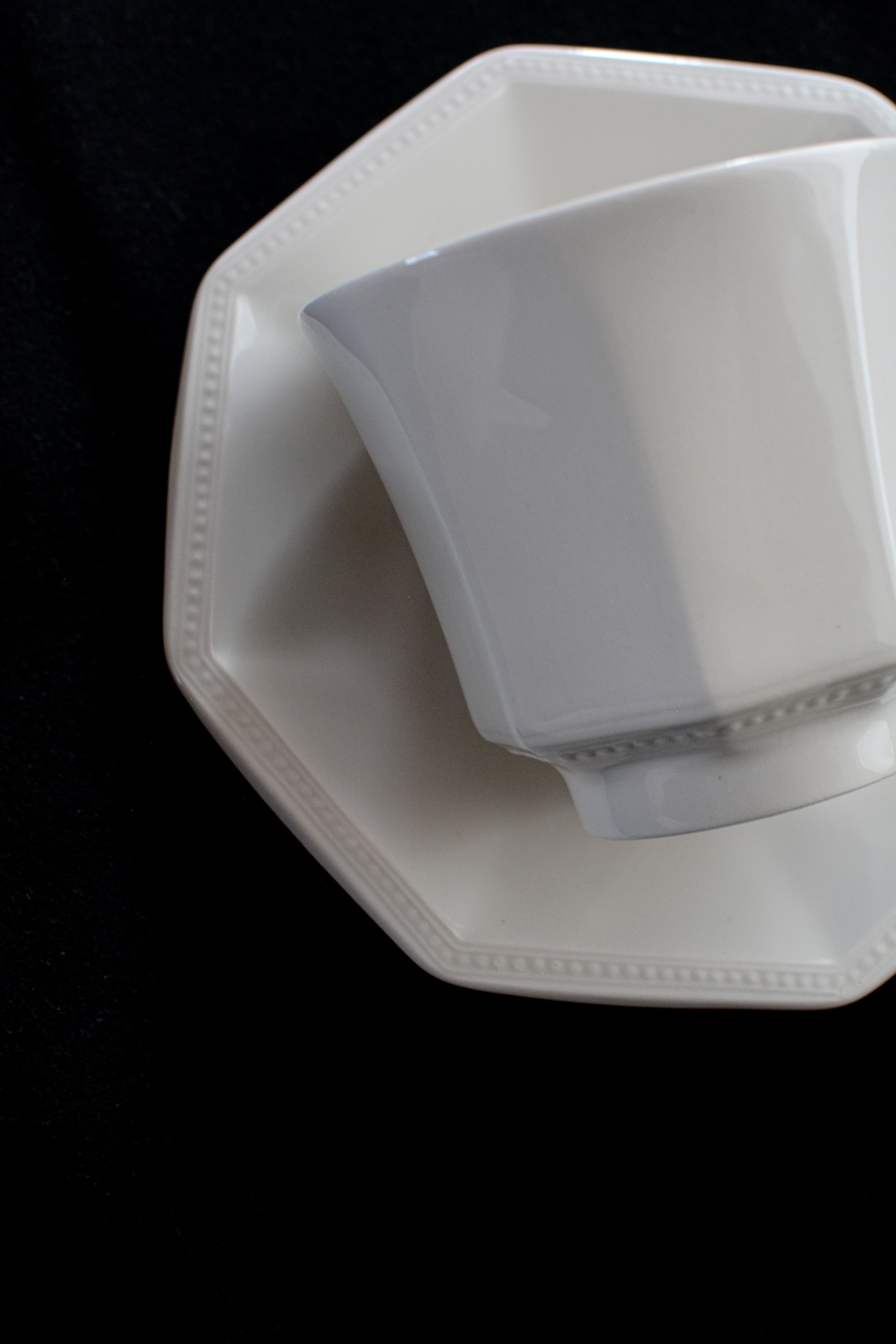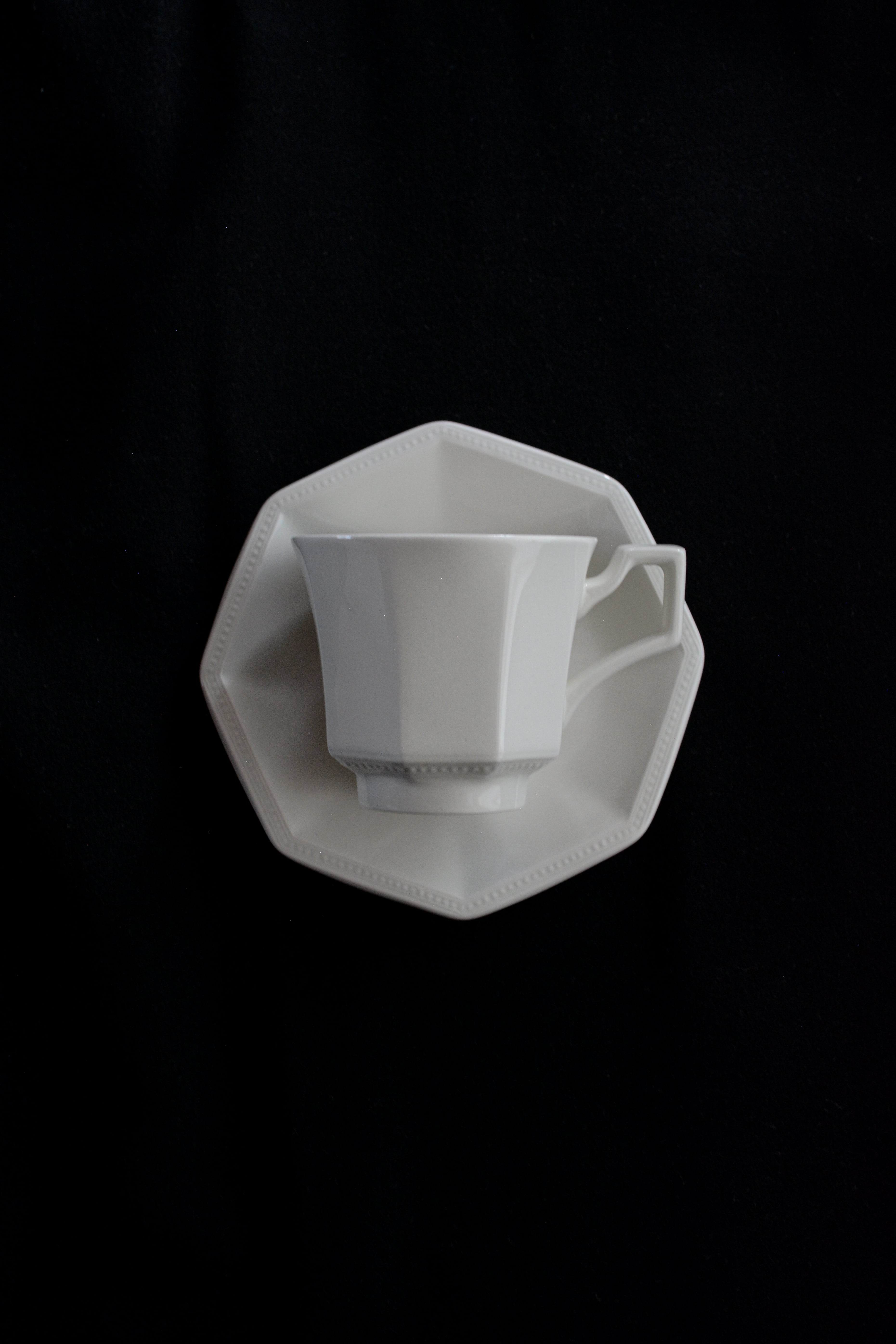 八角形のフォルムに、繊細なパール状のレリーフが縁取られた、ジョンソンブラザーズのヴィンテージカップ&ソーサー。シンプルながらもディテールに品の良さが宿る一客です。アールデコを思わせる直線的なフォルムに、柔らかなホワイト。凛とした佇まいの中にも、パールのレリーフがやさしさと可憐さを添えています。また貫入もとても良い雰囲気です。気取らず、けれどクラシカルな美しさを持つデザインは、現代の暮らしにもすっと溶け込み、容量がしっかり入るところも嬉しいですね。小傷等ございますがヴィンテージとしては比較的綺麗な状態です。