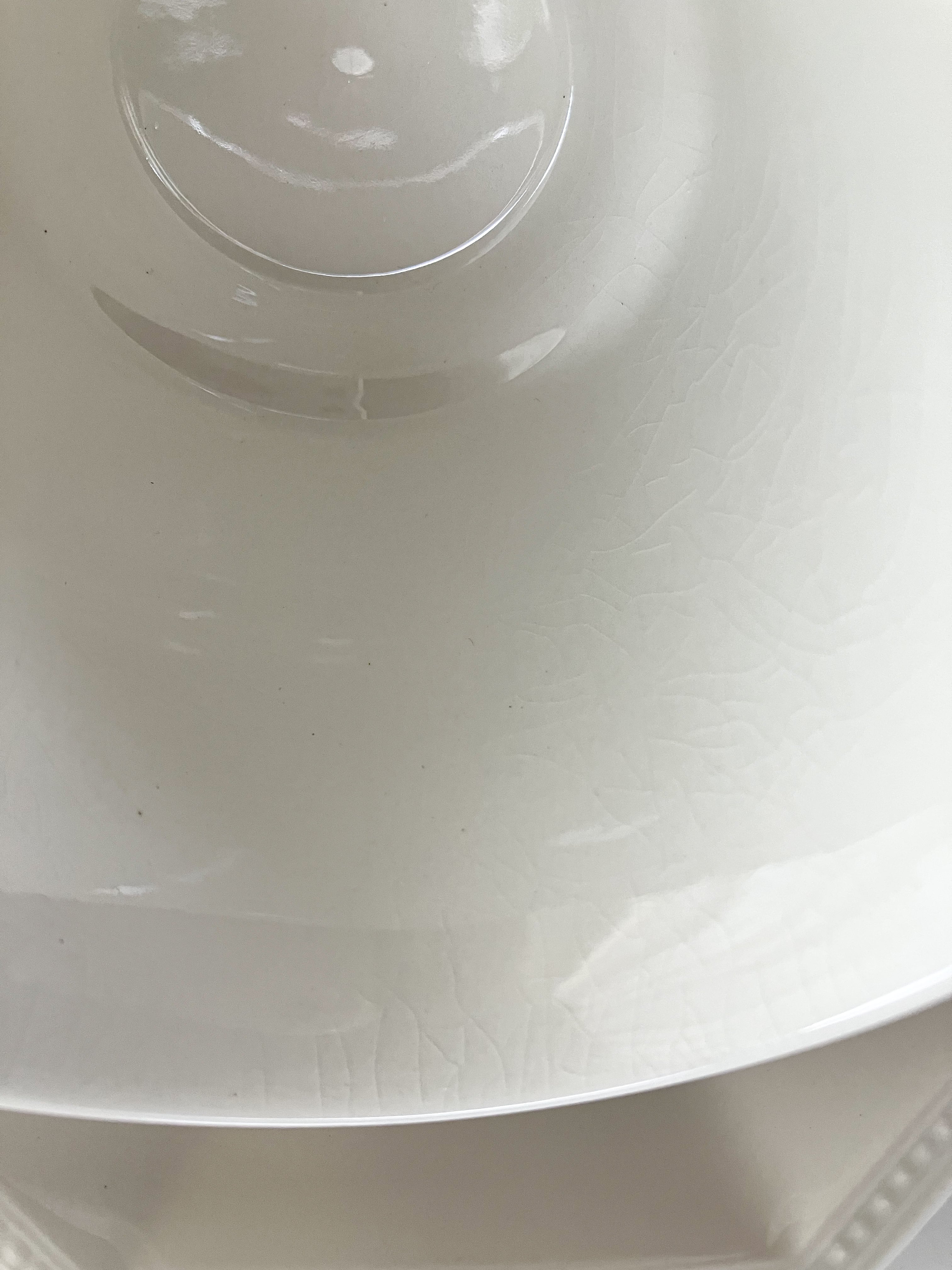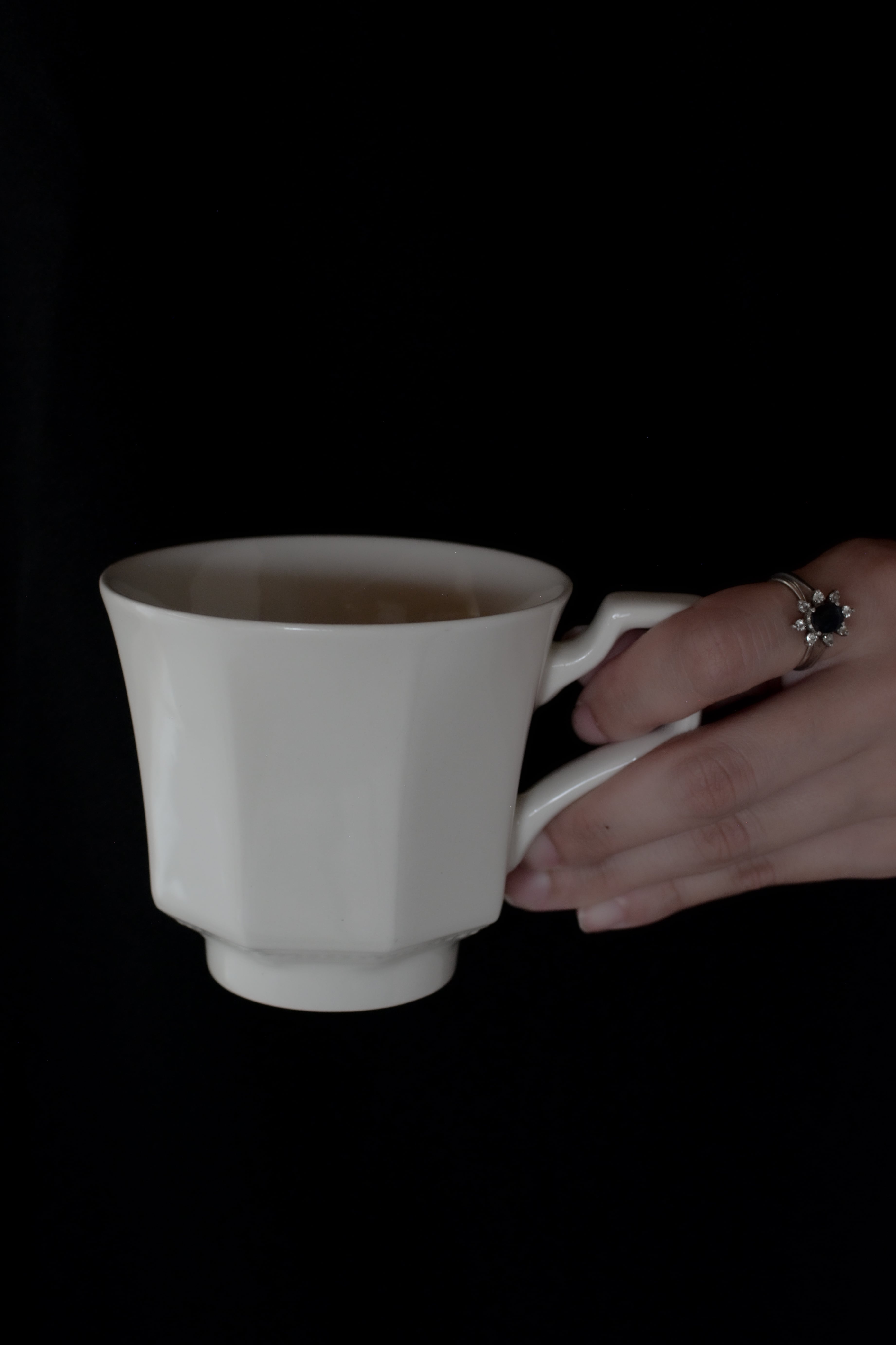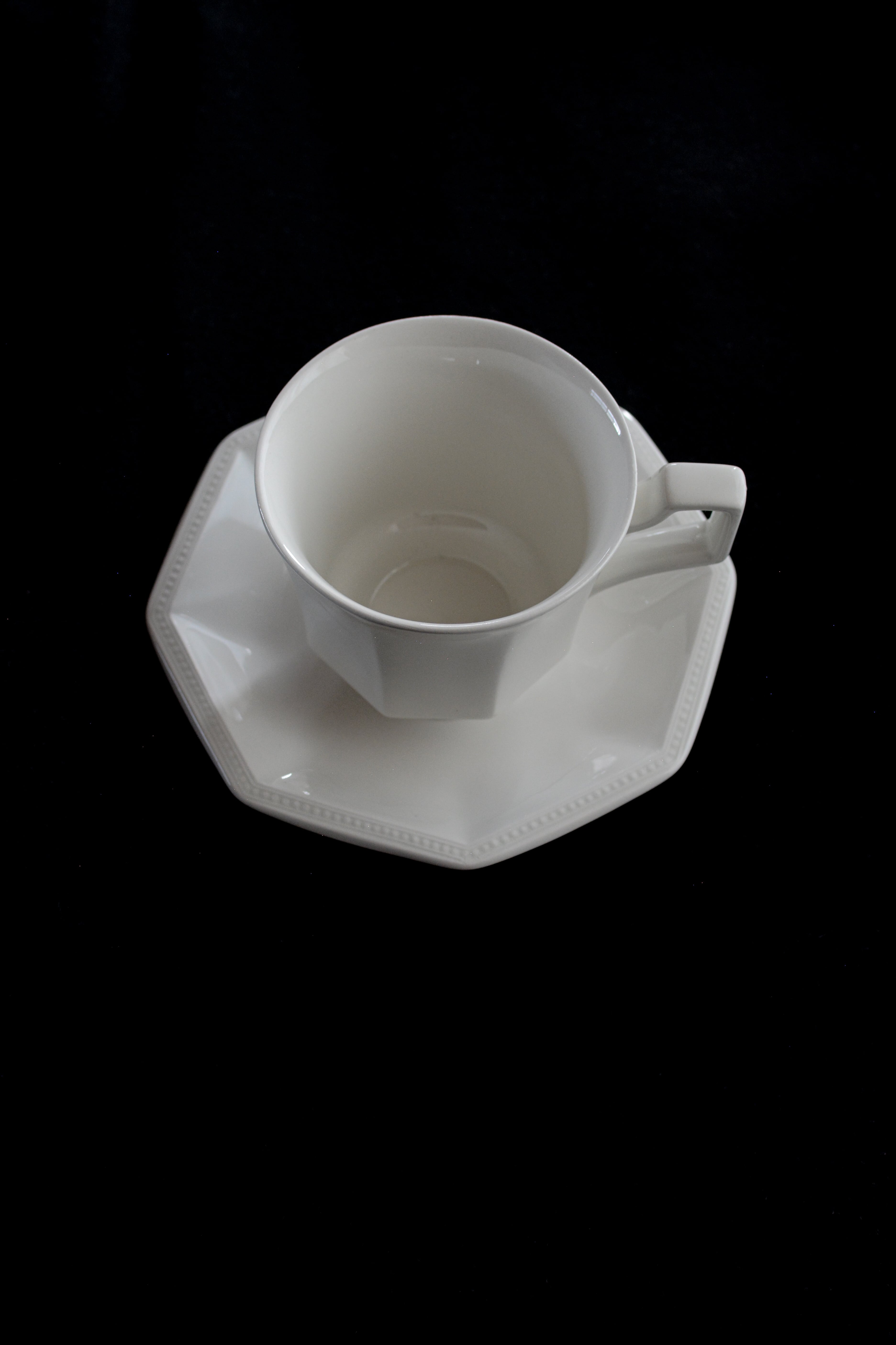 八角形のフォルムに、繊細なパール状のレリーフが縁取られた、ジョンソンブラザーズのヴィンテージカップ&ソーサー。シンプルながらもディテールに品の良さが宿る一客です。アールデコを思わせる直線的なフォルムに、柔らかなホワイト。凛とした佇まいの中にも、パールのレリーフがやさしさと可憐さを添えています。また貫入もとても良い雰囲気です。気取らず、けれどクラシカルな美しさを持つデザインは、現代の暮らしにもすっと溶け込み、容量がしっかり入るところも嬉しいですね。小傷等ございますがヴィンテージとしては比較的綺麗な状態です。