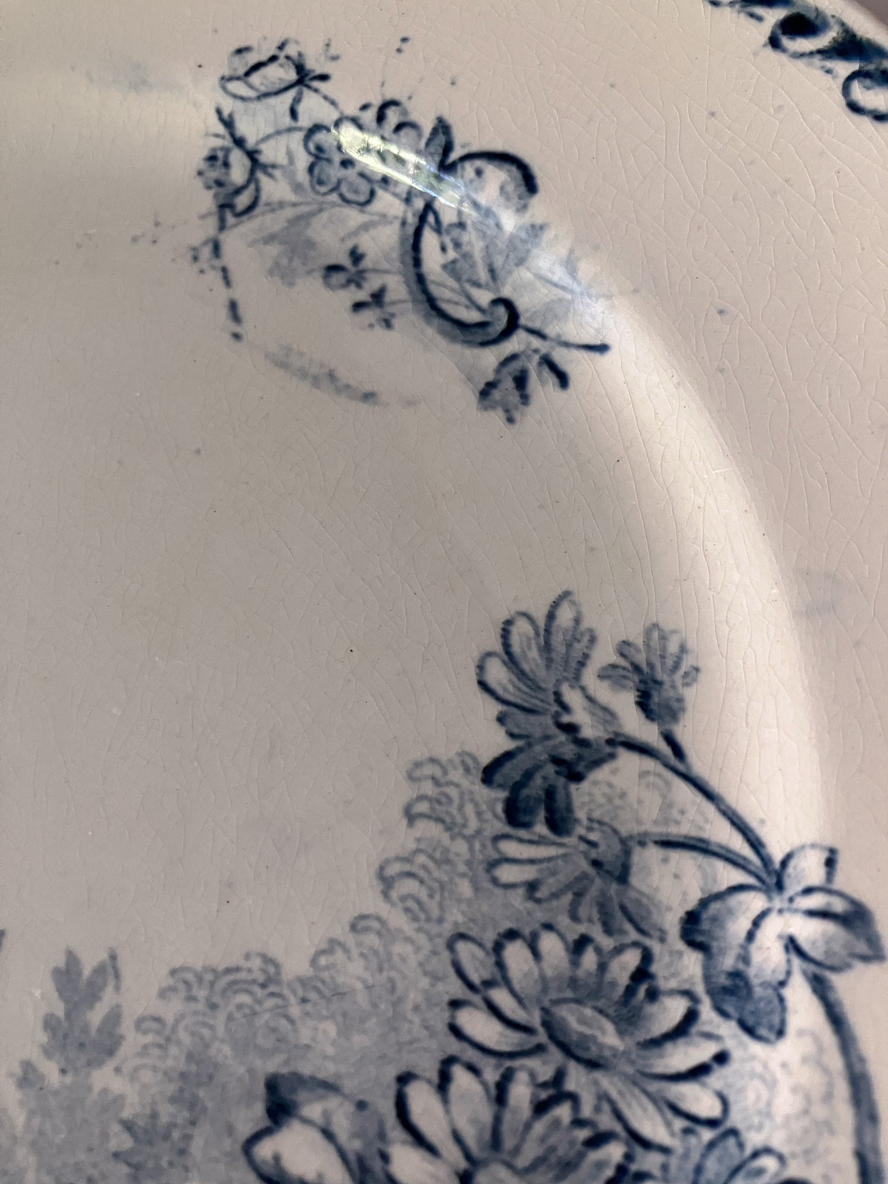可憐な花々と、蝶のささやかな世界が描かれた、クレイユモントローのアンティークプレート。繊細でありながらどこかのびやか。フランスの自然や暮らしの中から切り取ったような、やさしい情景が広がる一枚です。表からはみえませんが、裏側に欠けがあるため特別なお値段でのご案内です。