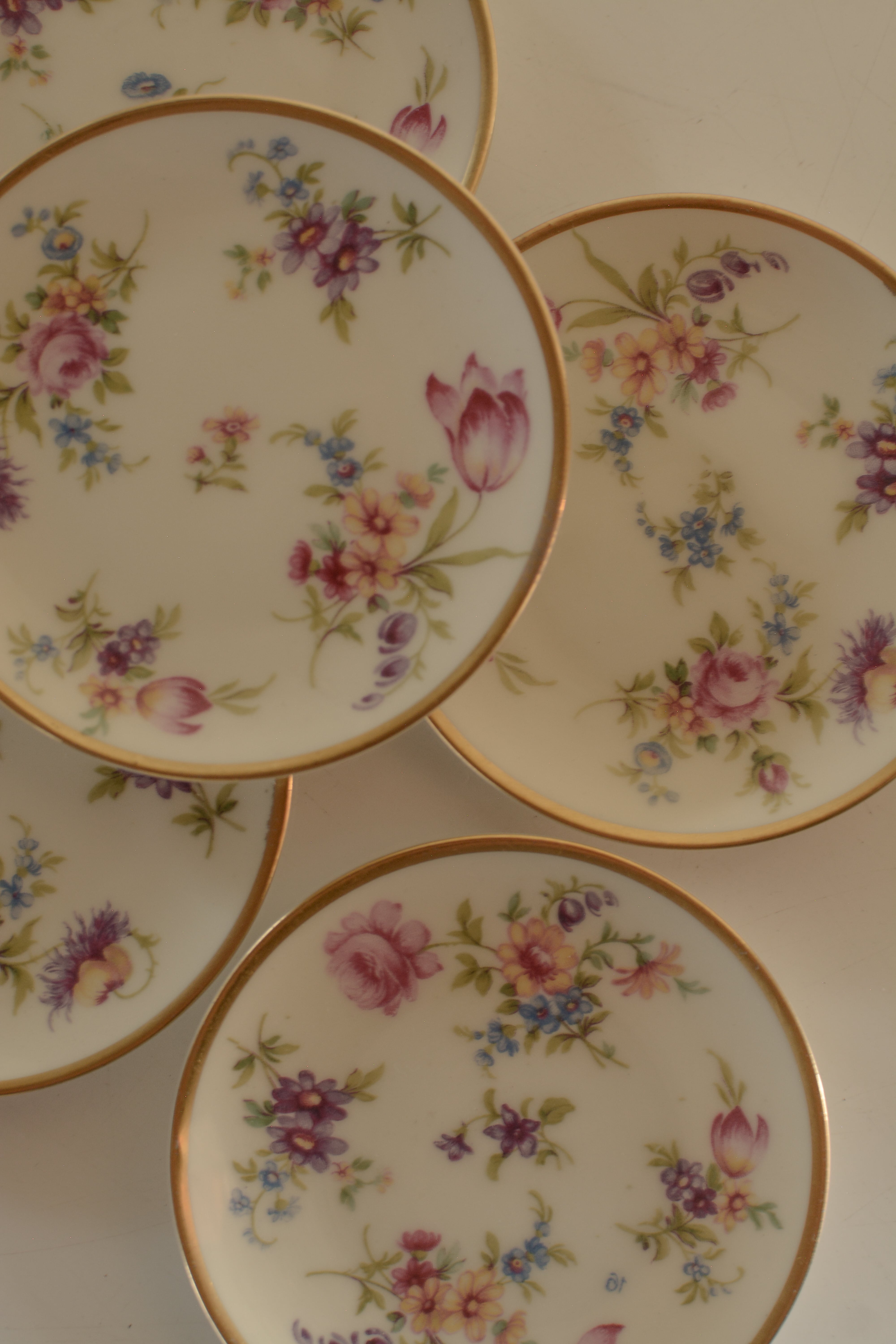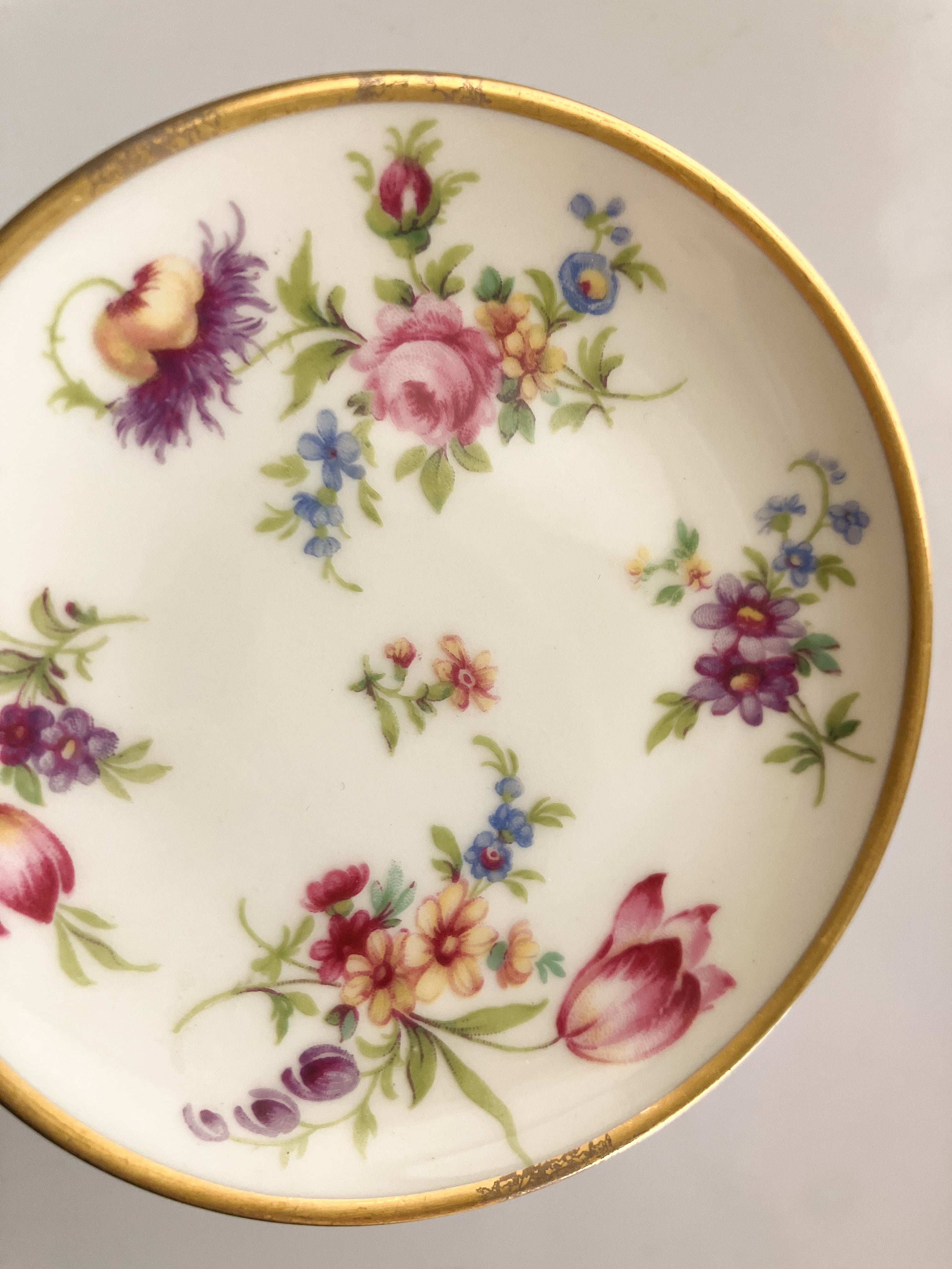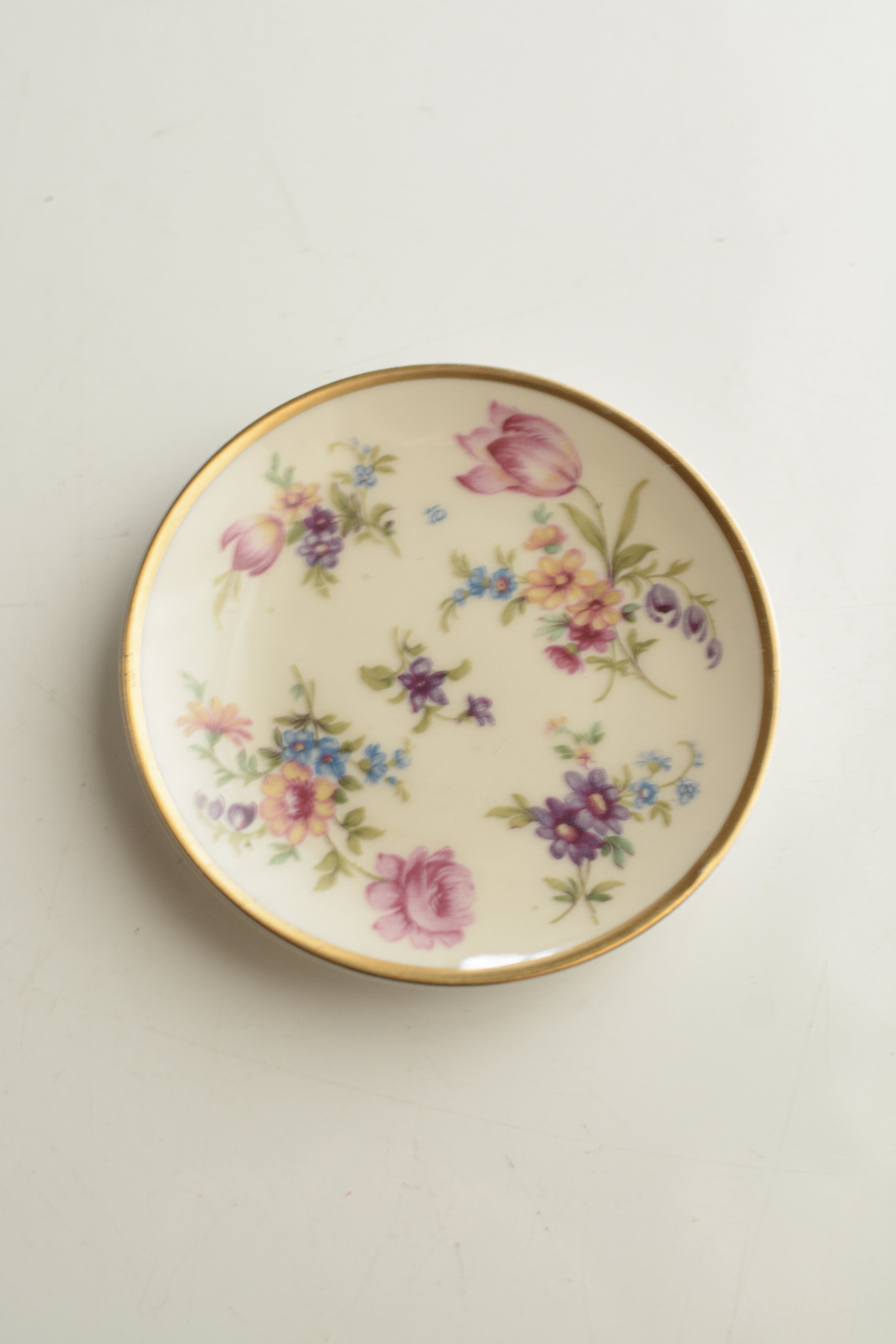 ドイツThomas Bavaria 1950年代の小さなプレートです。白磁に、バラやチューリップなど色とりどりの小花が散りばめられた可憐なデザイン。縁取りにはやわらかな金彩があしらわれ、華やかさの中にクラシカルな品の良さが漂います。小ぶりながら存在感があり、ティータイムにちょっとしたお菓子をのせたり、豆皿のようなサイズ感です。お茶の時ティーバックを取り出して置いておくのにも良さそうですね。アクセサリートレイとしても◎よく見ると一枚一枚絵柄が違うのも楽しいです。小傷等ございますがヴィンテージとしては比較的綺麗な状態です。こちらはお写真1枚目の絵柄となります。