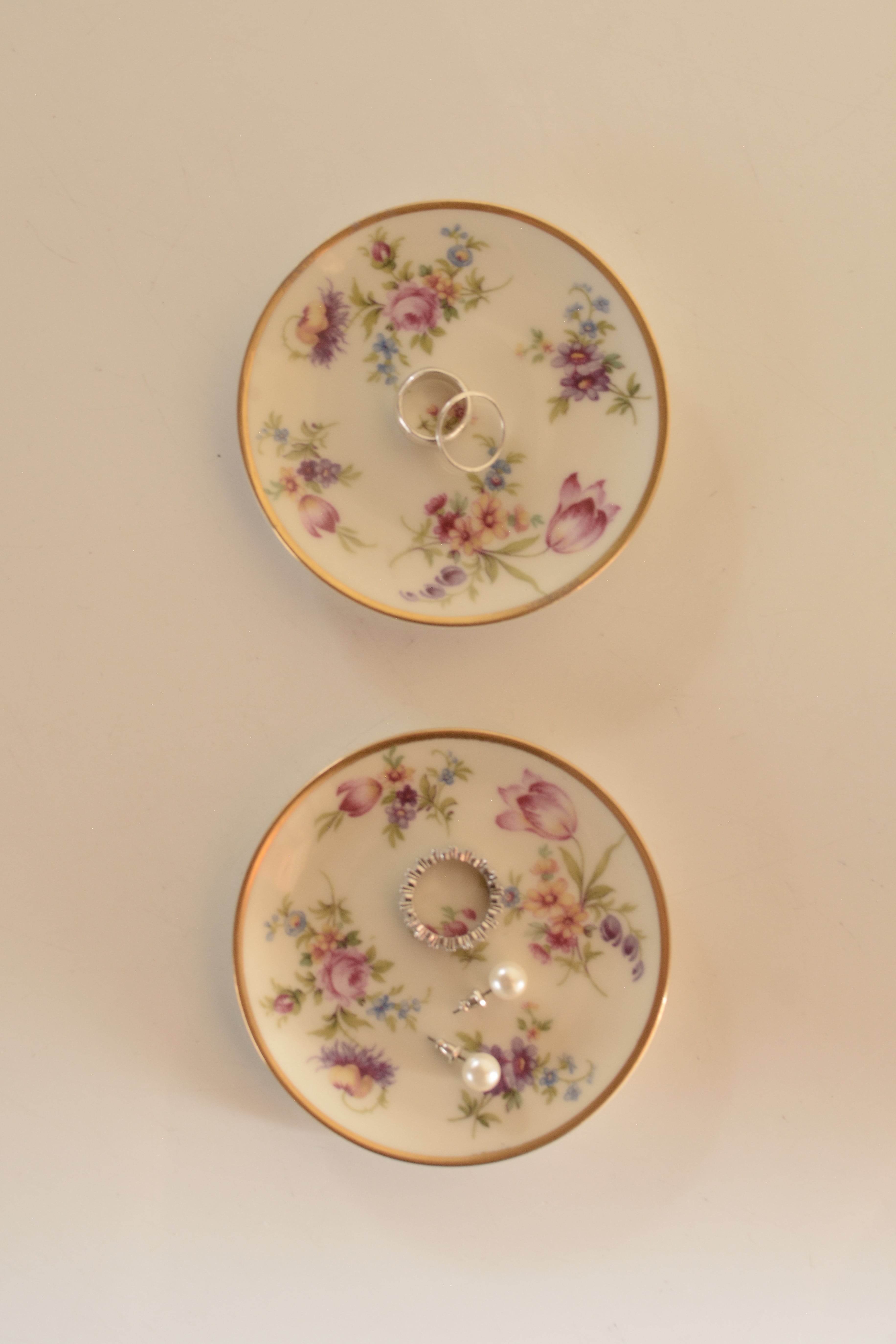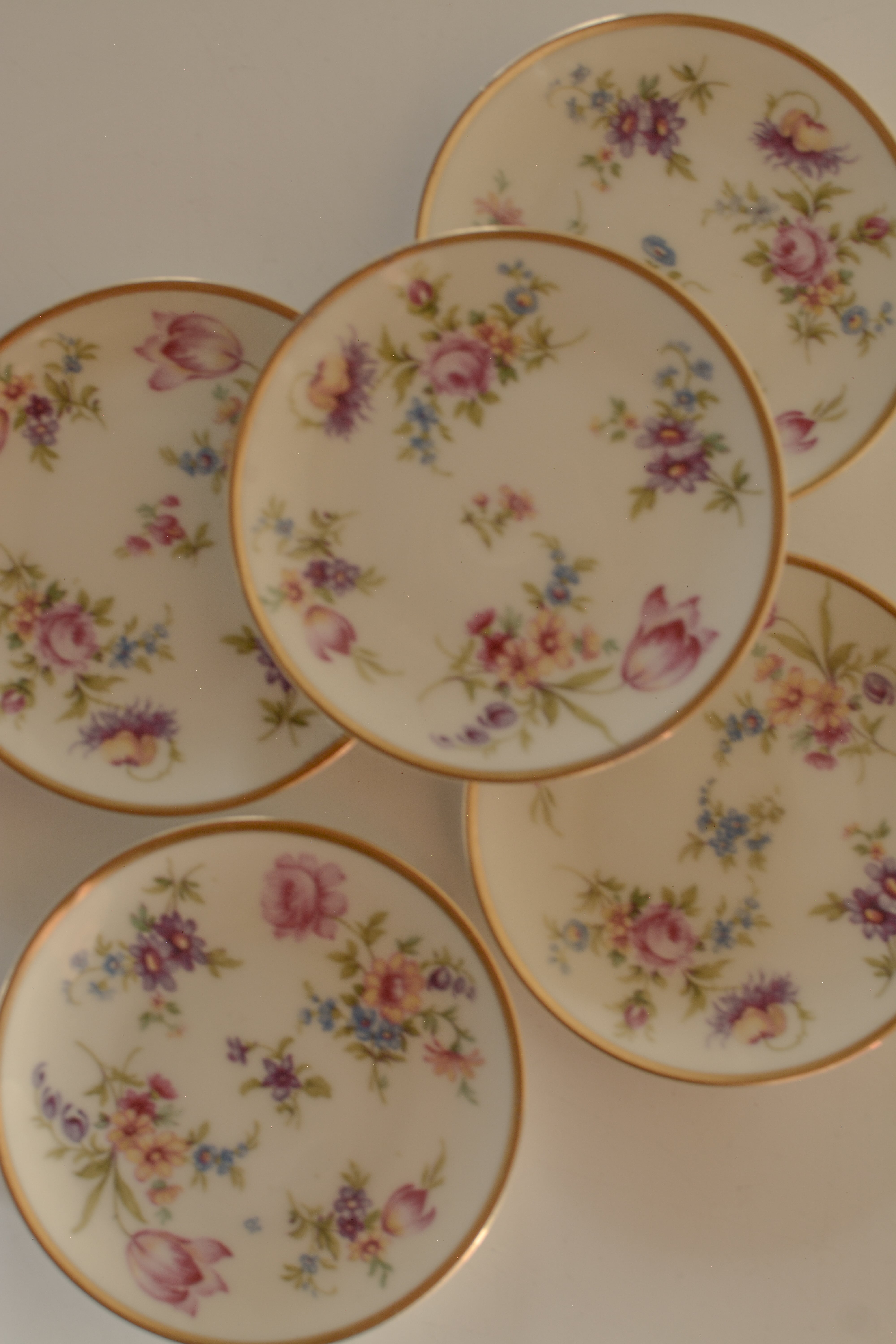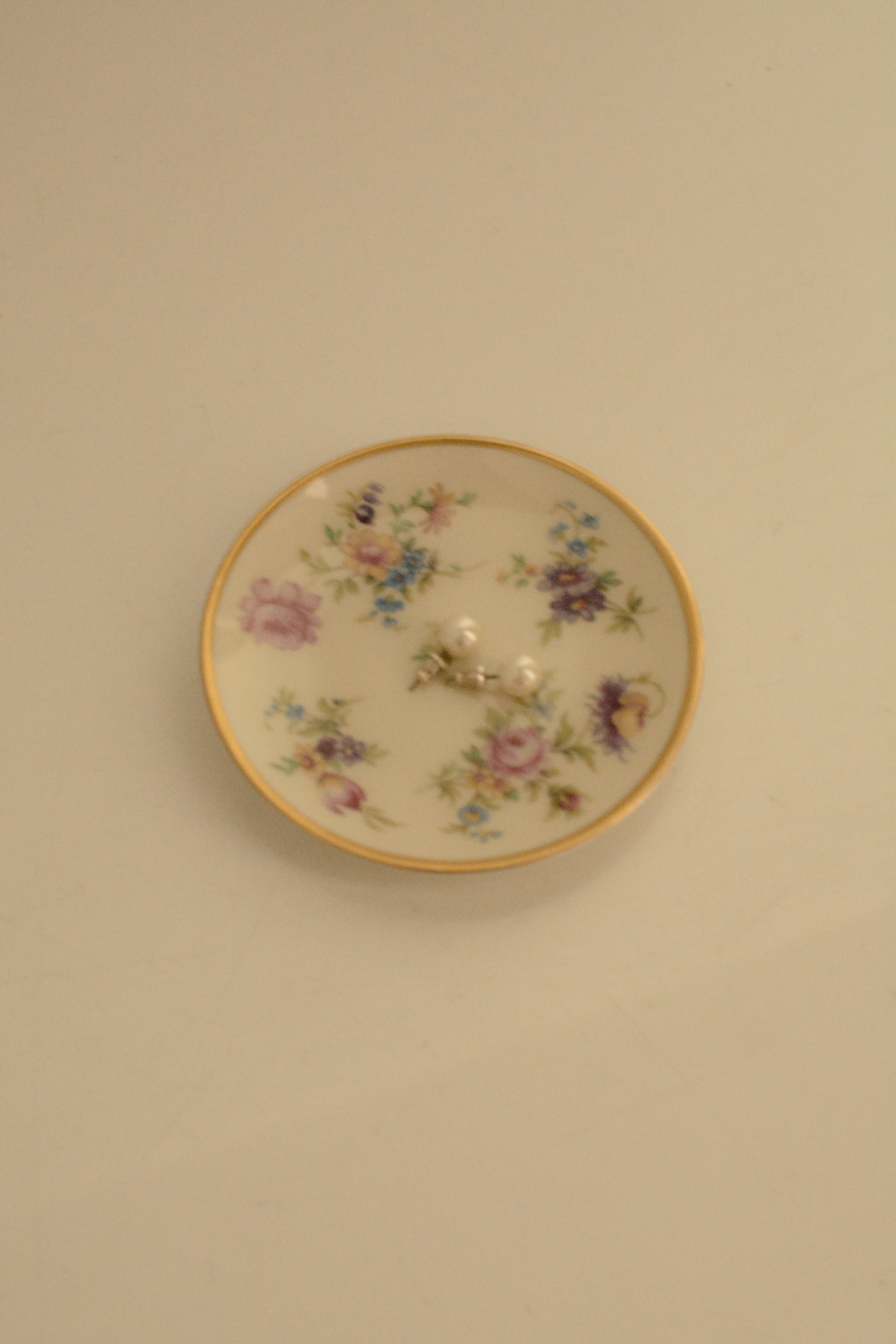 ドイツThomas Bavaria 1950年代の小さなプレートです。白磁に、バラやチューリップなど色とりどりの小花が散りばめられた可憐なデザイン。縁取りにはやわらかな金彩があしらわれ、華やかさの中にクラシカルな品の良さが漂います。小ぶりながら存在感があり、ティータイムにちょっとしたお菓子をのせたり、豆皿のようなサイズ感です。お茶の時ティーバックを取り出して置いておくのにも良さそうですね。アクセサリートレイとしても◎よく見ると一枚一枚絵柄が違うのも楽しいです。小傷等ございますがヴィンテージとしては比較的綺麗な状態です。こちらはお写真1枚目の絵柄となります。