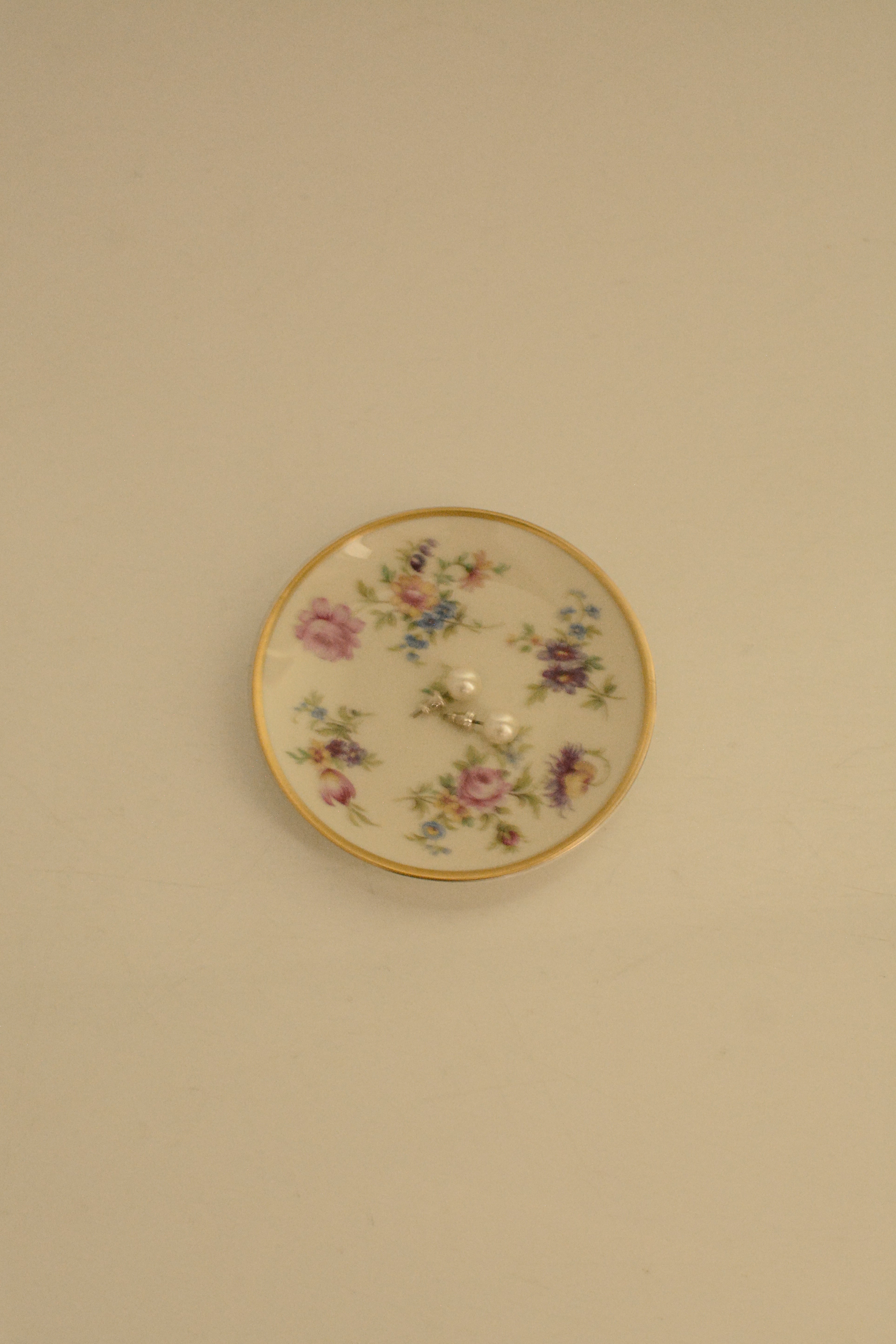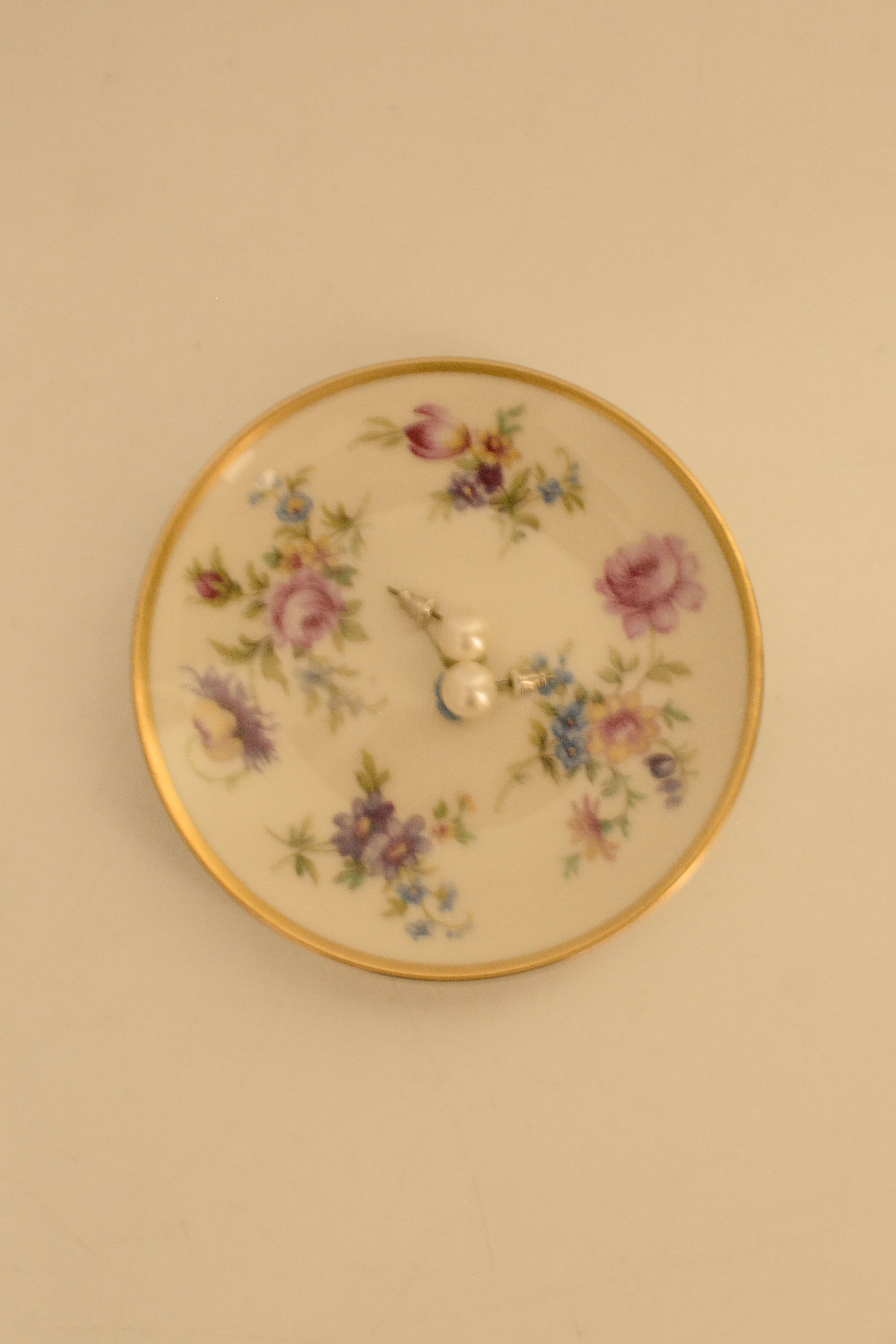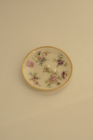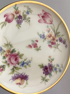 ドイツThomas Bavaria 1950年代の小さなプレートです。白磁に、バラやチューリップなど色とりどりの小花が散りばめられた可憐なデザイン。縁取りにはやわらかな金彩があしらわれ、華やかさの中にクラシカルな品の良さが漂います。小ぶりながら存在感があり、ティータイムにちょっとしたお菓子をのせたり、豆皿のようなサイズ感です。お茶の時ティーバックを取り出して置いておくのにも良さそうですね。アクセサリートレイとしても◎よく見ると一枚一枚絵柄が違うのも楽しいです。小傷等ございますがヴィンテージとしては比較的綺麗な状態です。こちらはお写真1枚目の絵柄となります。