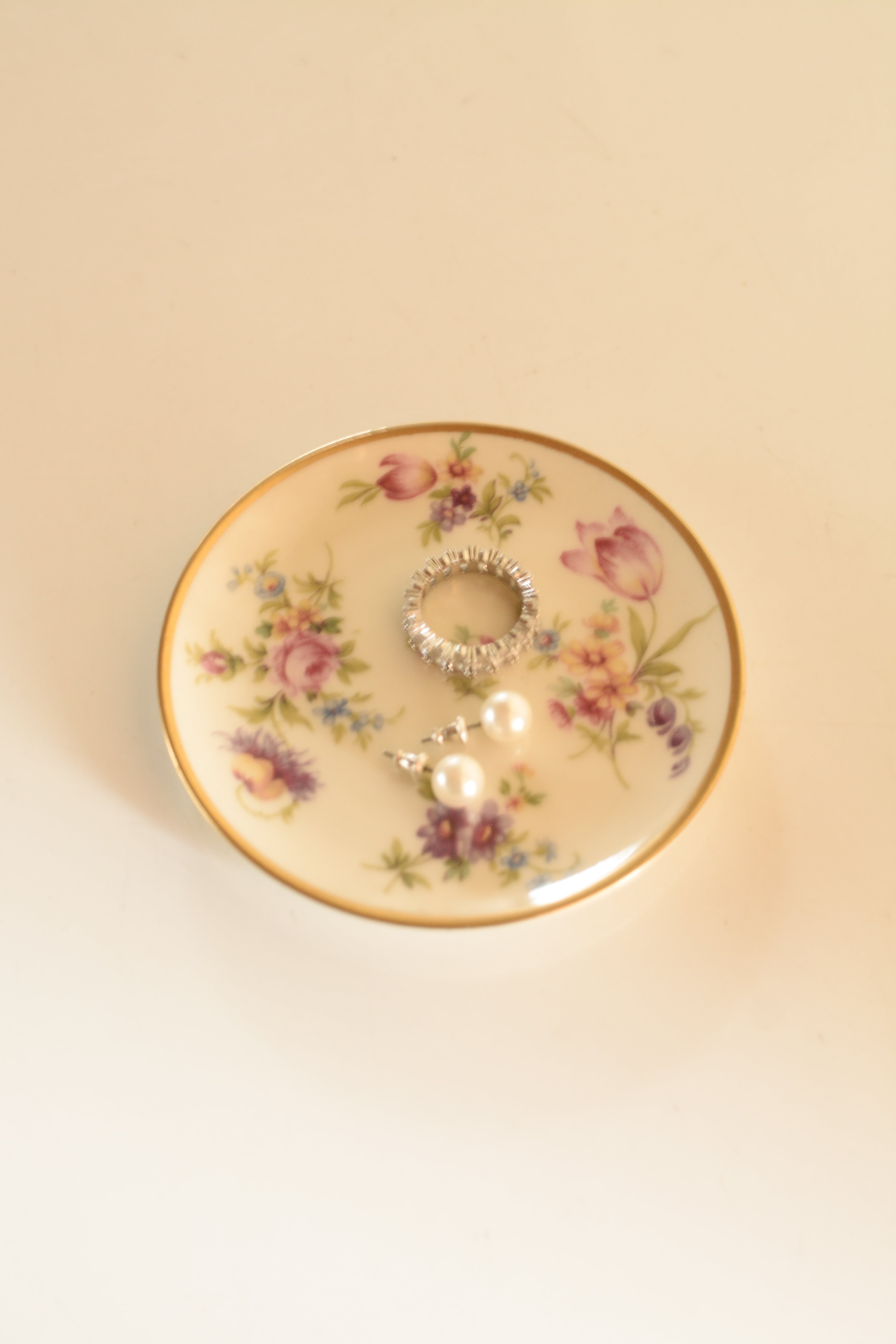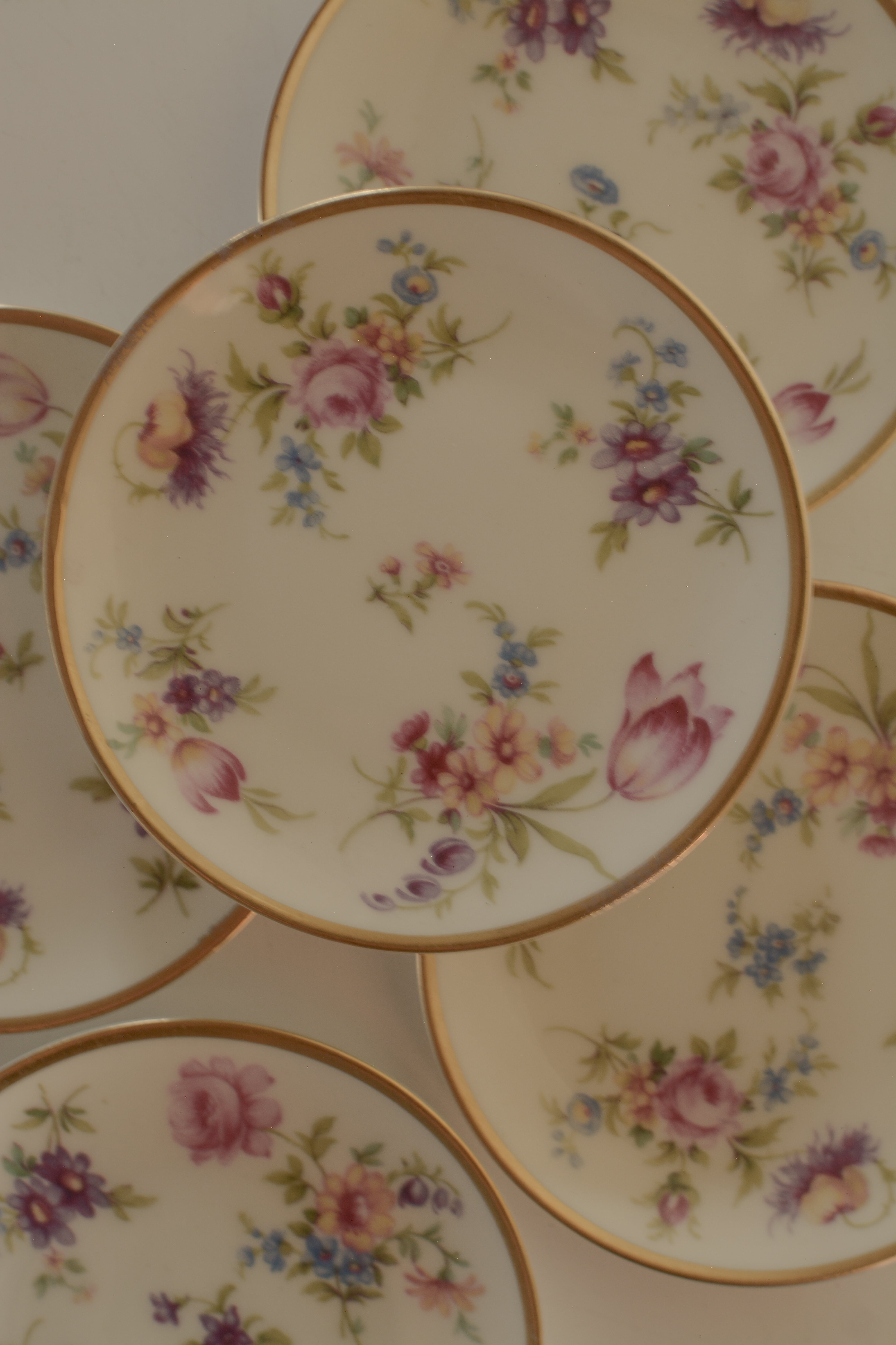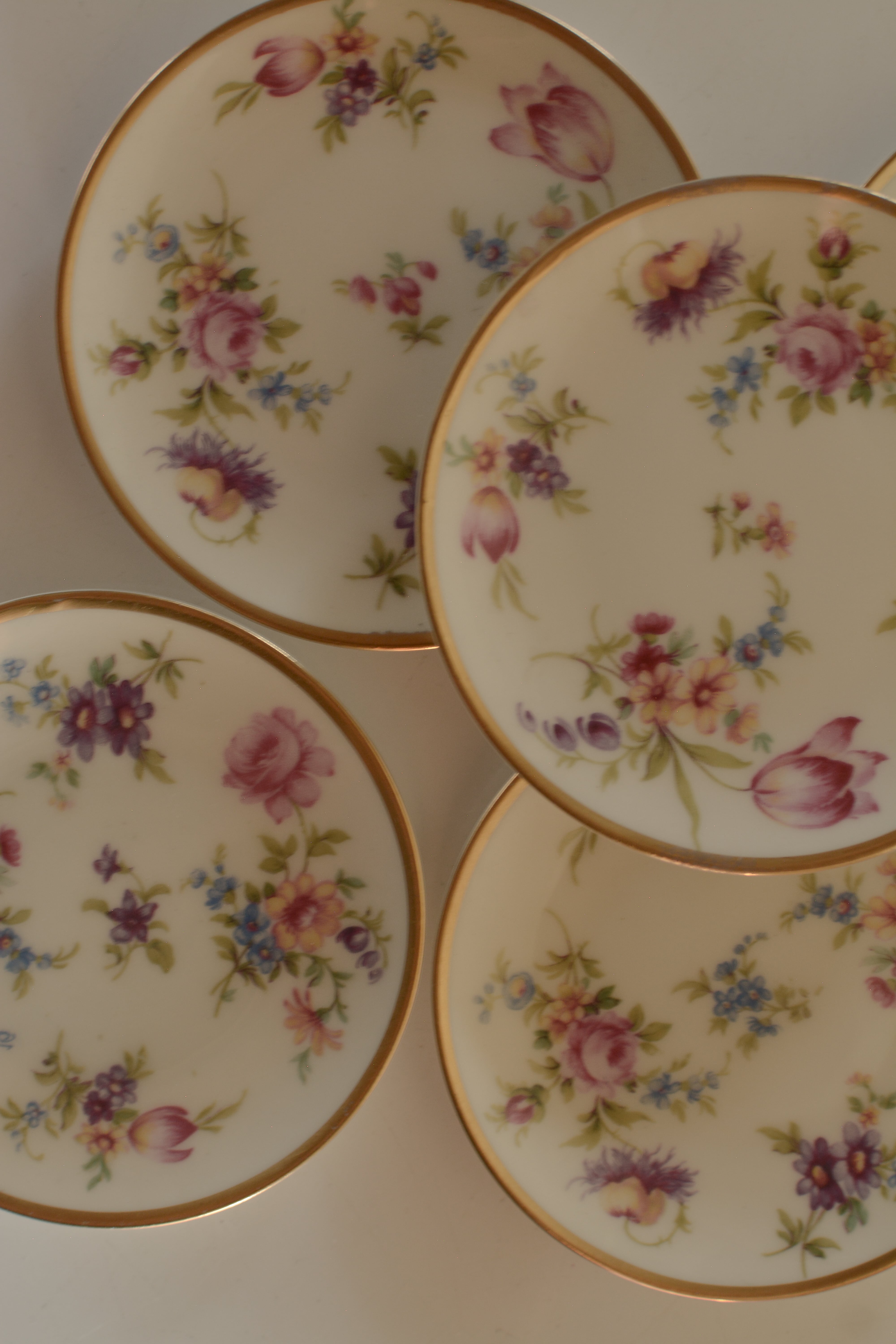 ドイツThomas Bavaria 1950年代の小さなプレートです。白磁に、バラやチューリップなど色とりどりの小花が散りばめられた可憐なデザイン。縁取りにはやわらかな金彩があしらわれ、華やかさの中にクラシカルな品の良さが漂います。小ぶりながら存在感があり、ティータイムにちょっとしたお菓子をのせたり、豆皿のようなサイズ感です。お茶の時ティーバックを取り出して置いておくのにも良さそうですね。アクセサリートレイとしても◎よく見ると一枚一枚絵柄が違うのも楽しいです。小傷等ございますがヴィンテージとしては比較的綺麗な状態です。こちらはお写真1枚目の絵柄となります。