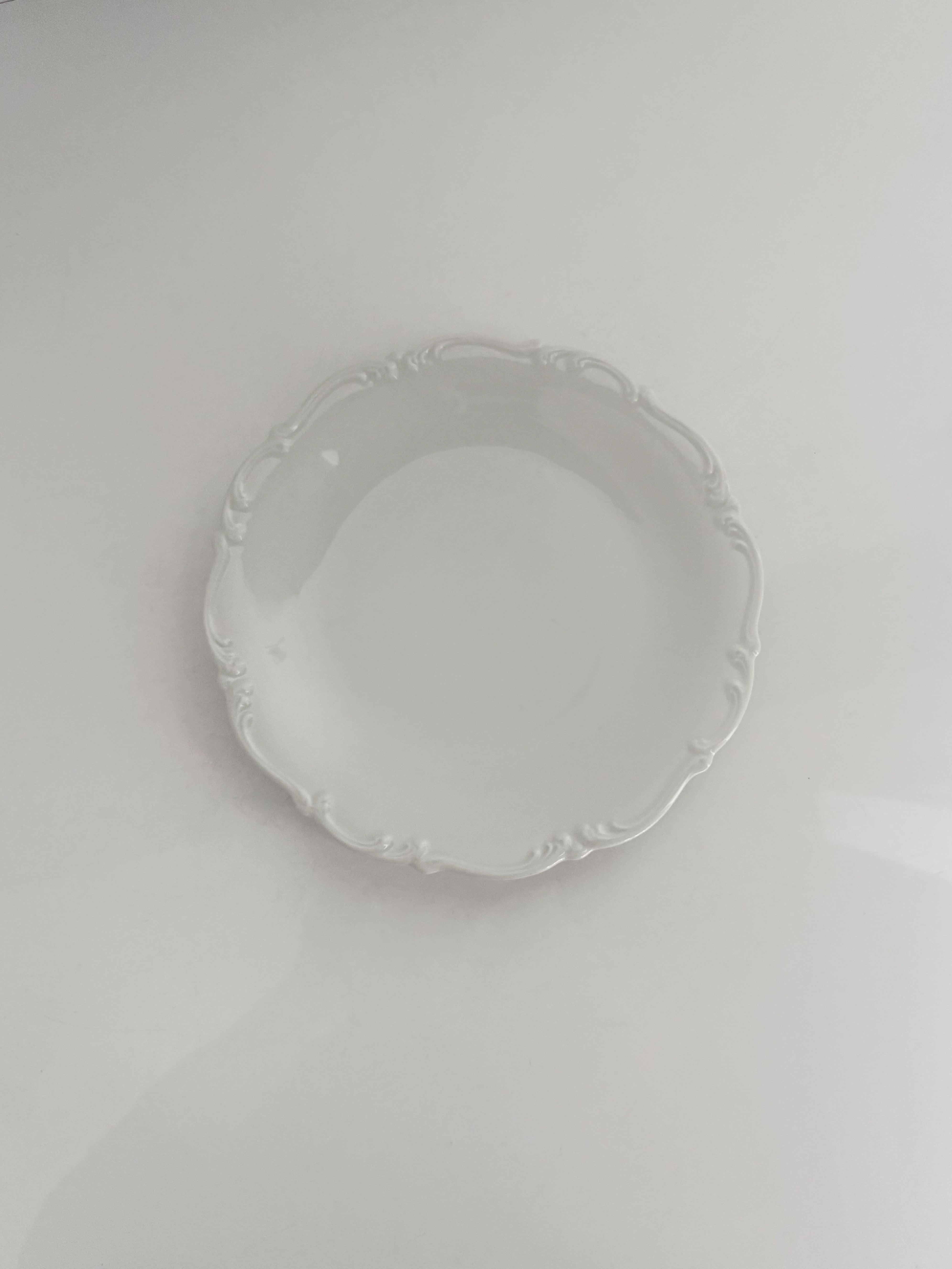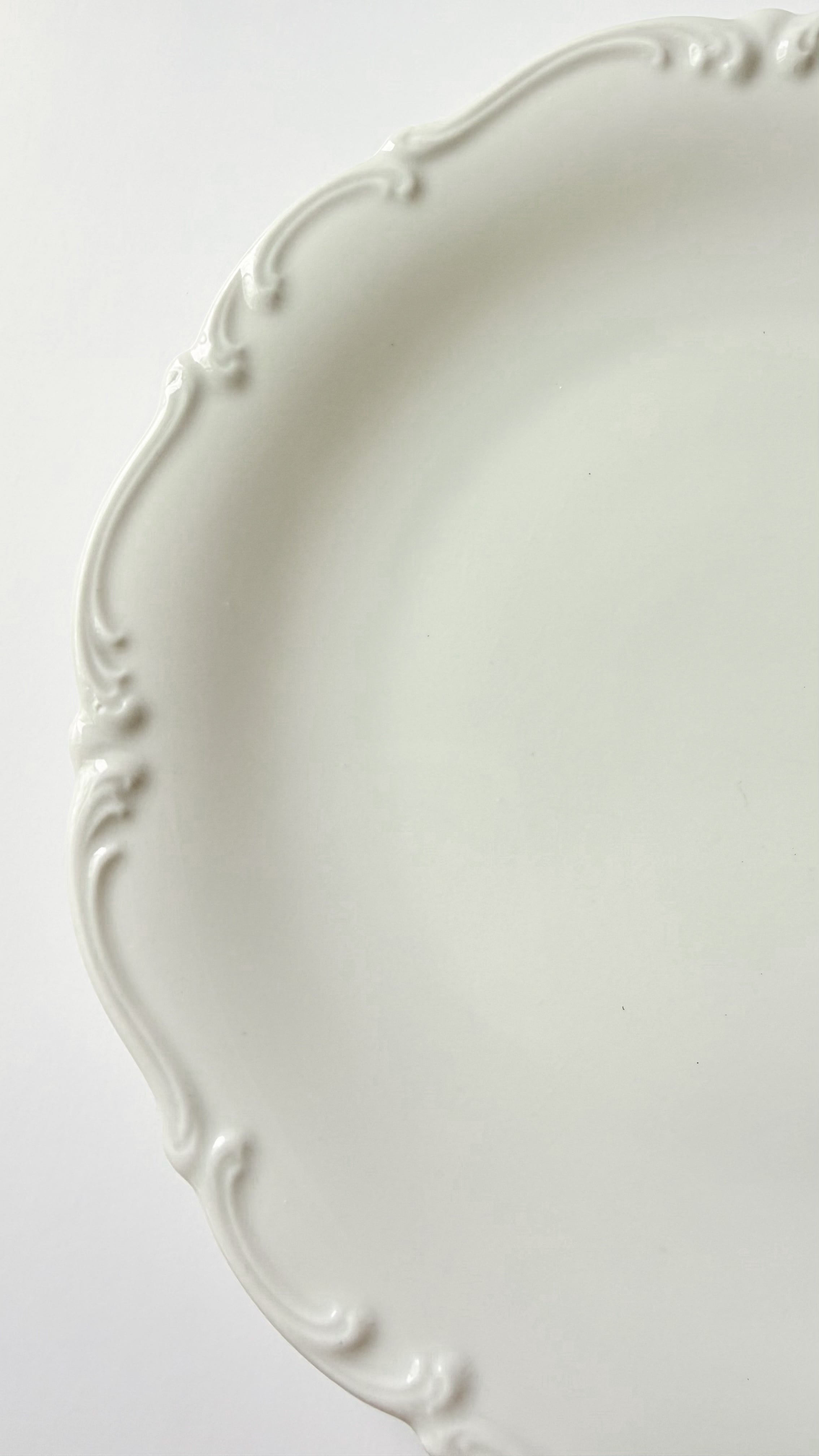 白磁に繊細な装飾をまとったTIRSCHENREUTHのヴィンテージプレート。無駄のない純白の輝きに、やわらかなレリーフの縁取りが映え、テーブルに凛とした気品を添えてくれます。シンプルでありながらクラシカルな表情で、ドイツ磁器の上質さを感じられる一枚。小傷等ございますがヴィンテージとしては比較的綺麗な状態です。複数枚在庫ございますが、ほとんど差異はございませんのでセレクトしてのお届けとなります。