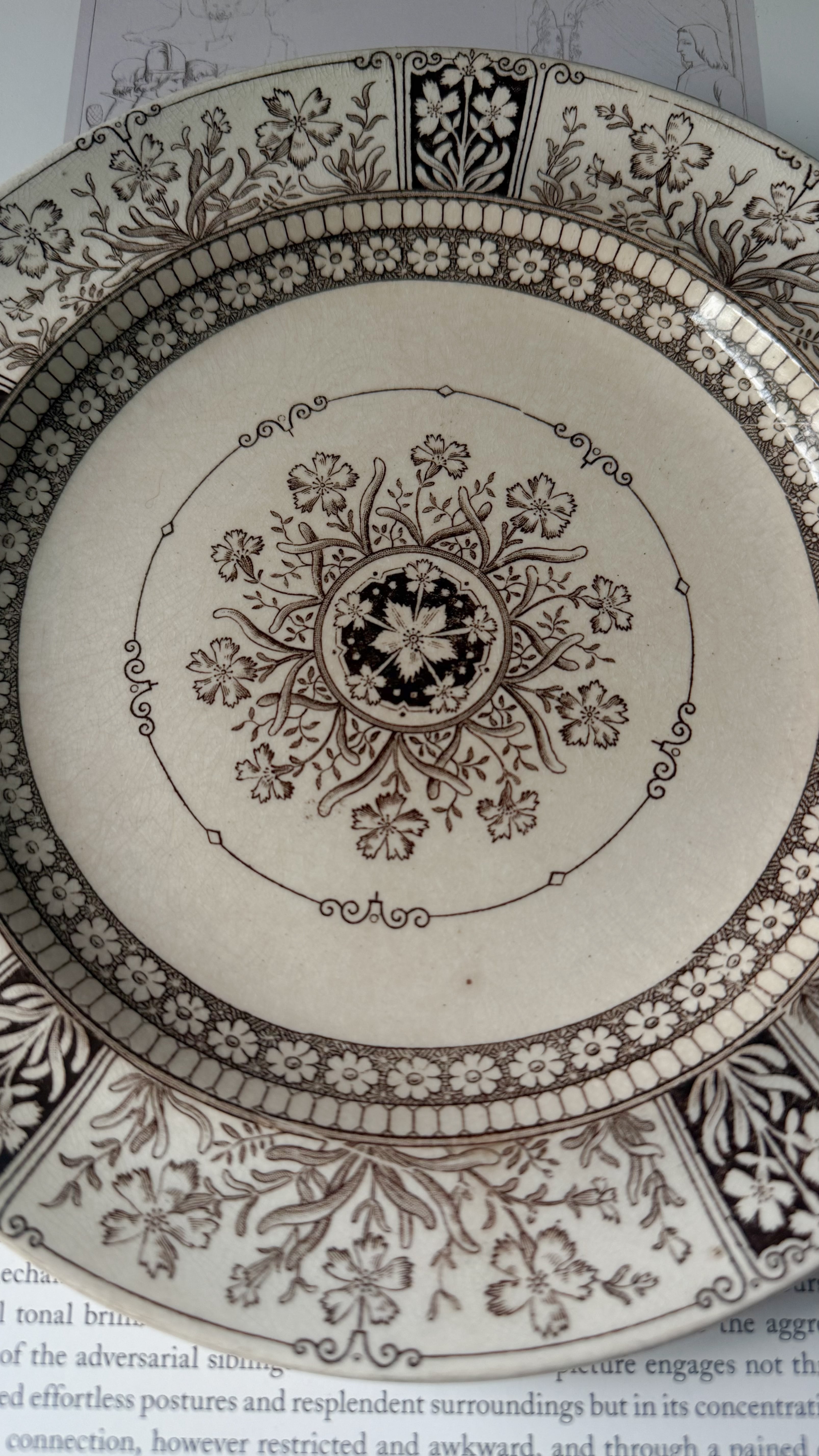 黒とセピアの間のような色合いで、草花が繊細に描かれたデザイン。静かな装飾の中に、時を重ねた器だけが持つ柔らかな深みがあります。