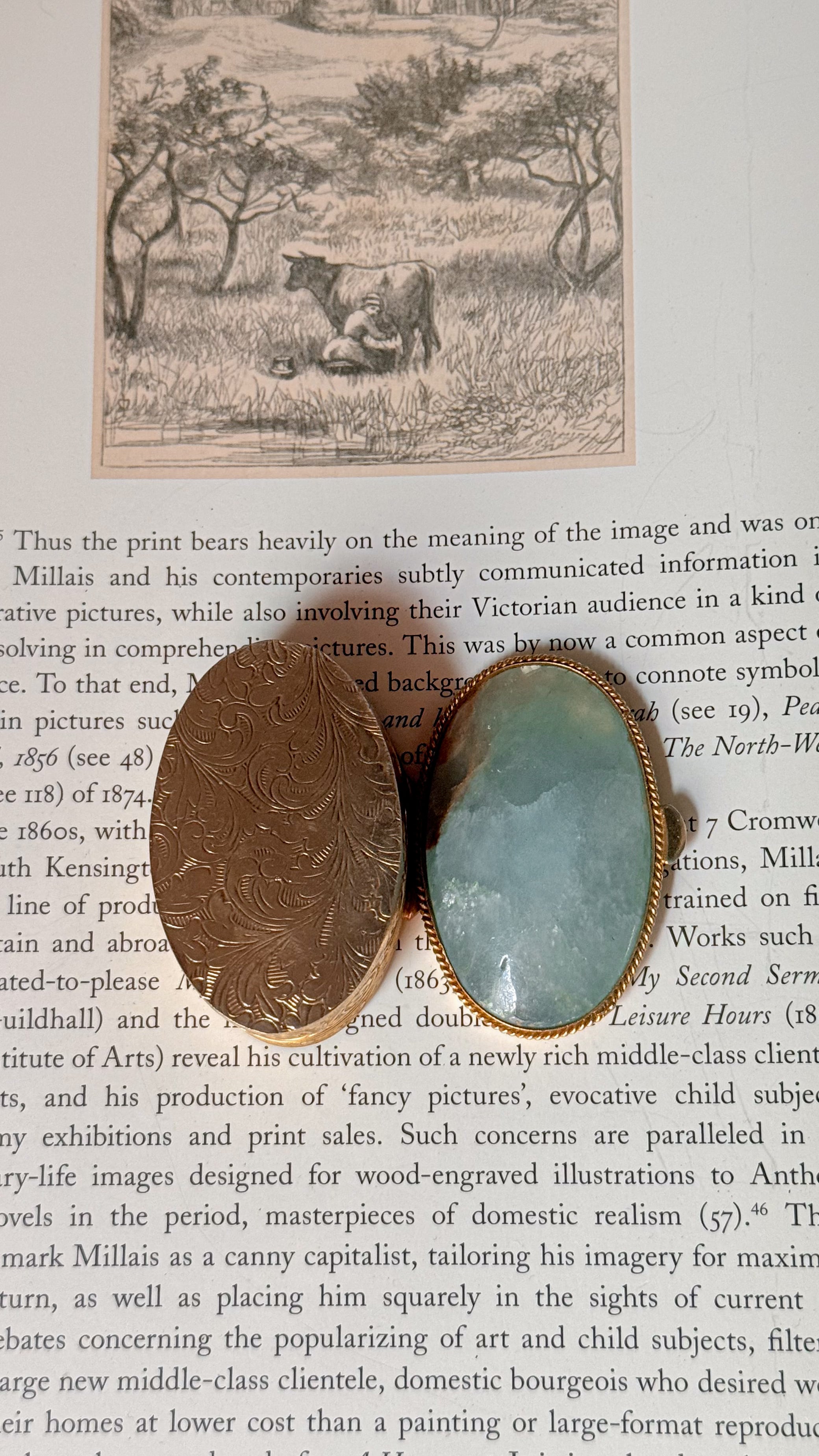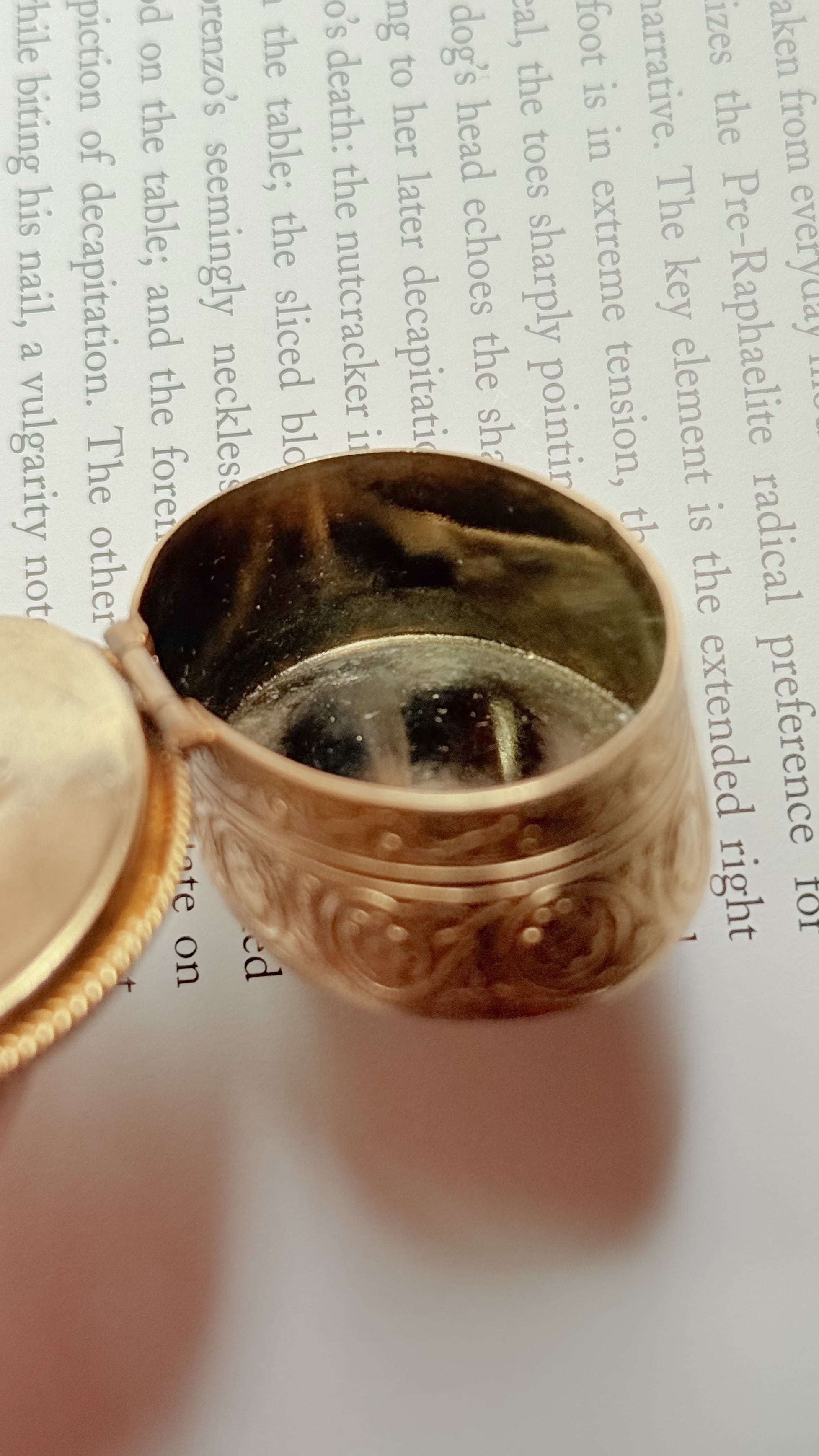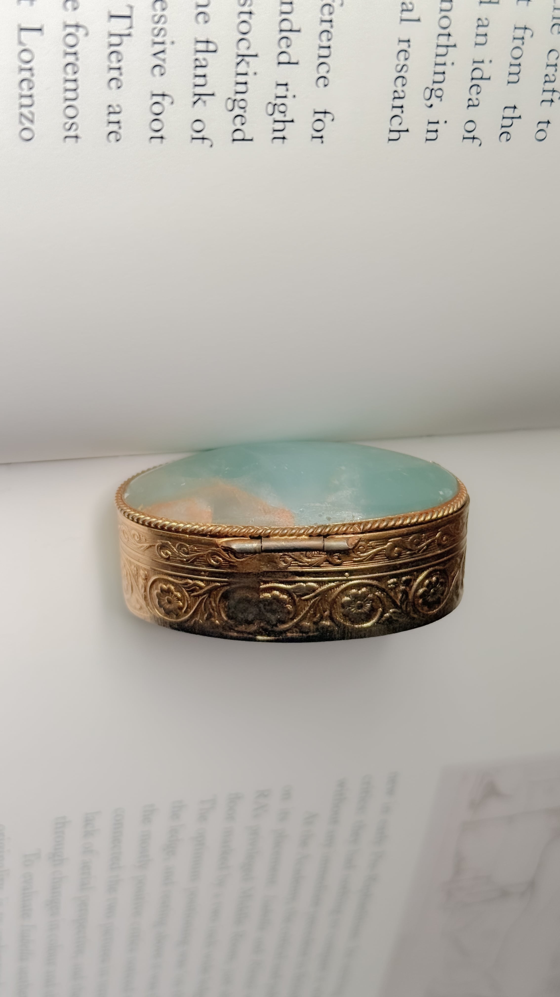 美しい水色の石が蓋にあしらわれた、ヴィンテージのピルケース。金色の縁には小さな花模様が連なり、手のひらに収まる小箱の中に、どこか静かな時間が閉じ込められています。石の部分には、天然クオーツ特有の色むらや細かな模様が見られ光を受けるたび、わずかに表情を変える柔らかなカラーがとても魅力的です。思い出の小物やアクセサリーの収納、鏡台の上に置いてジュエリーボックスのように楽しんだり。インテリアの一部として飾るだけでも空間を華やかにしてくれる存在感です。他の商品と合わせて購入される際は送料が重複する可能性がございますが、訂正させていただきますのでお申し付け下さい。