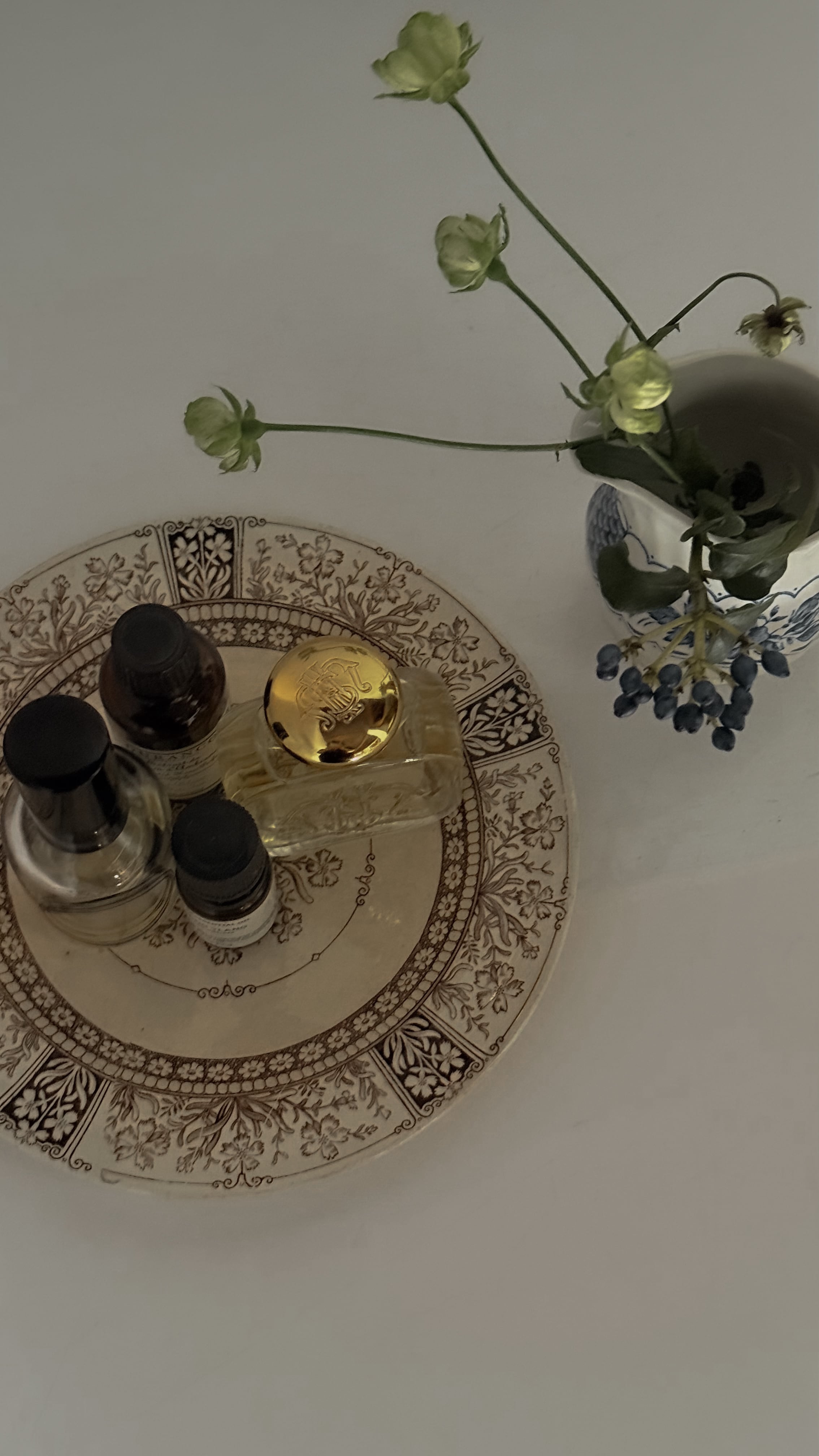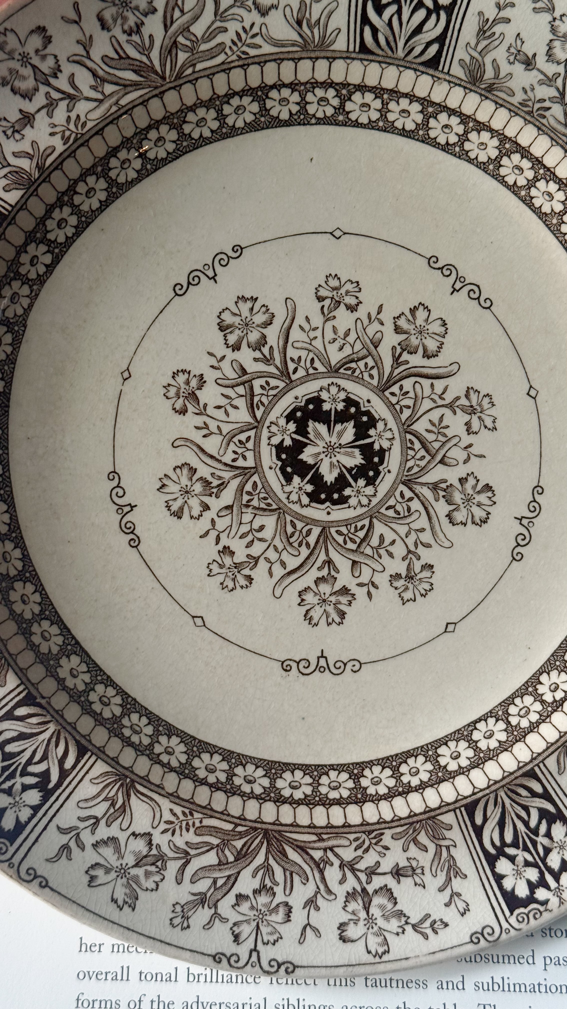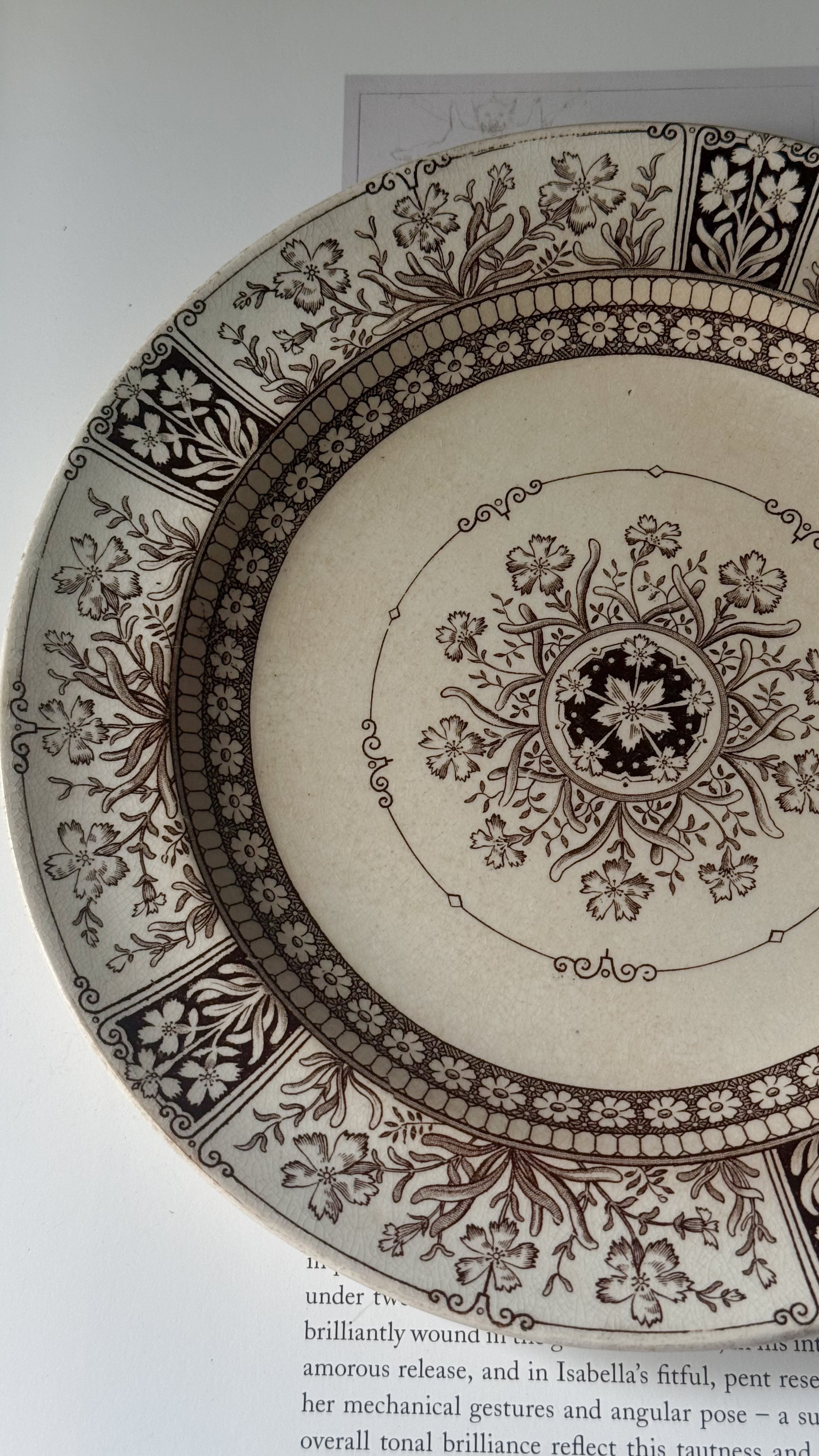 黒とセピアの間のような色合いで、草花が繊細に描かれたデザイン。静かな装飾の中に、時を重ねた器だけが持つ柔らかな深みがあります。