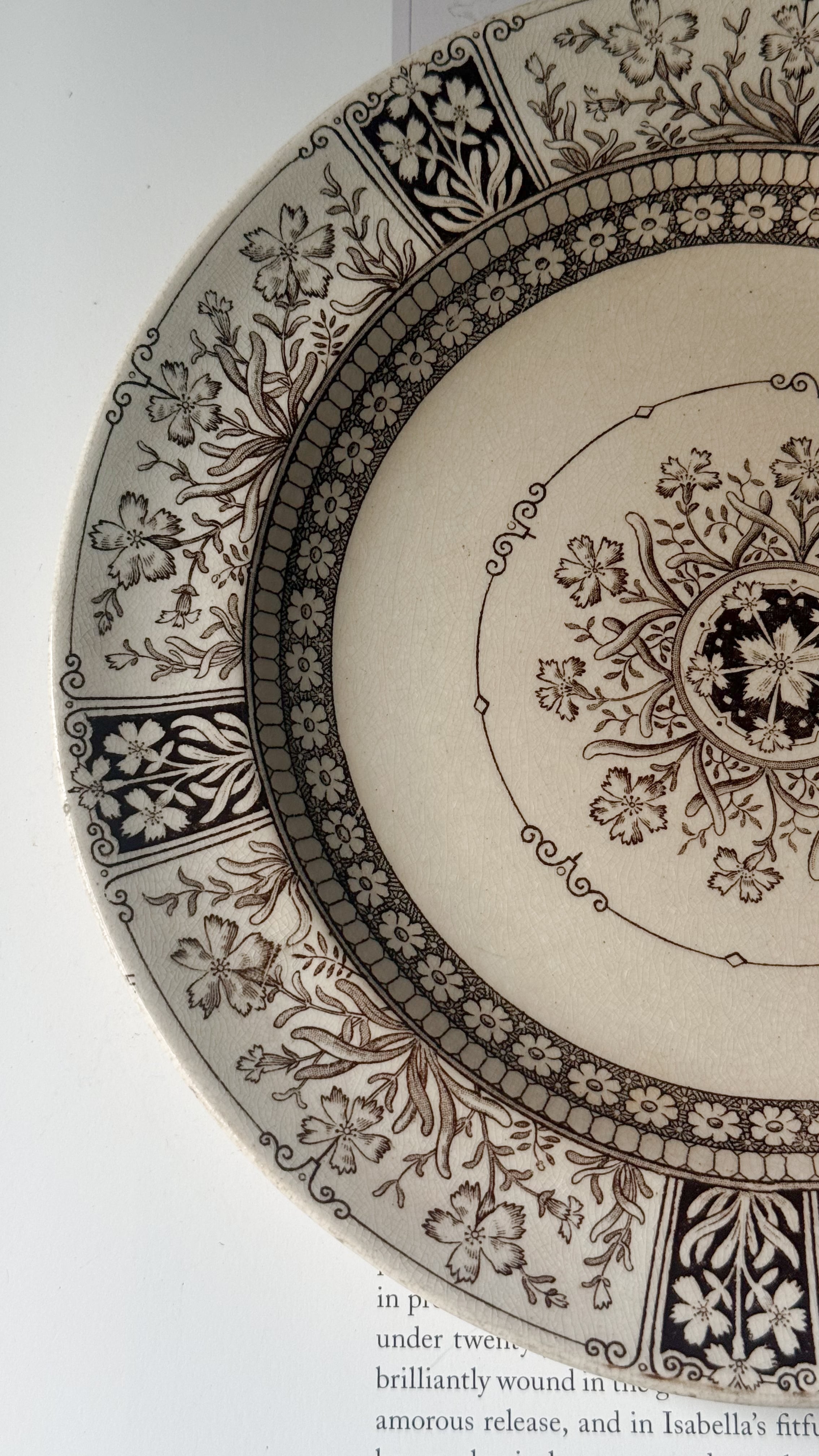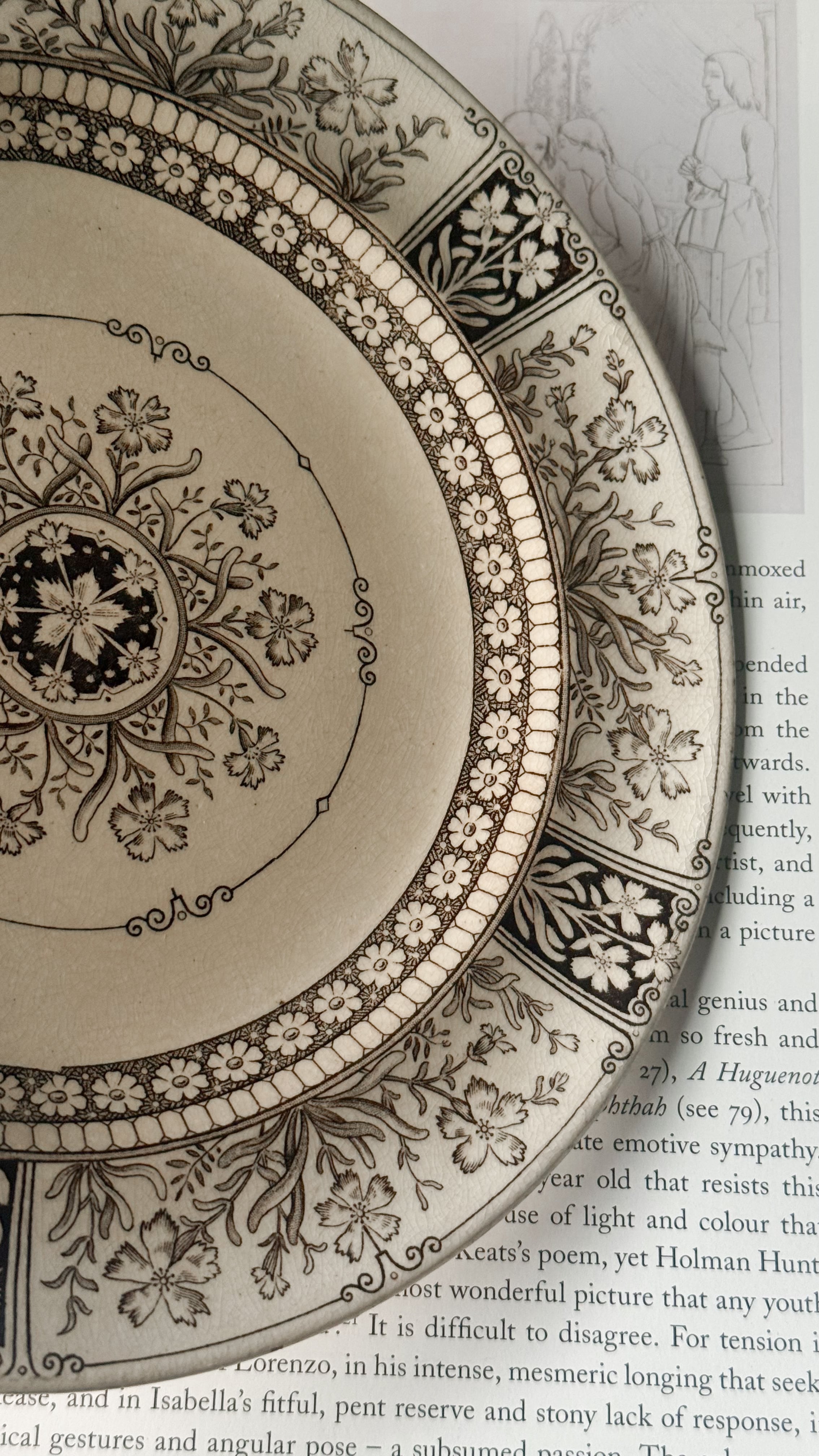 黒とセピアの間のような色合いで、草花が繊細に描かれたデザイン。静かな装飾の中に、時を重ねた器だけが持つ柔らかな深みがあります。