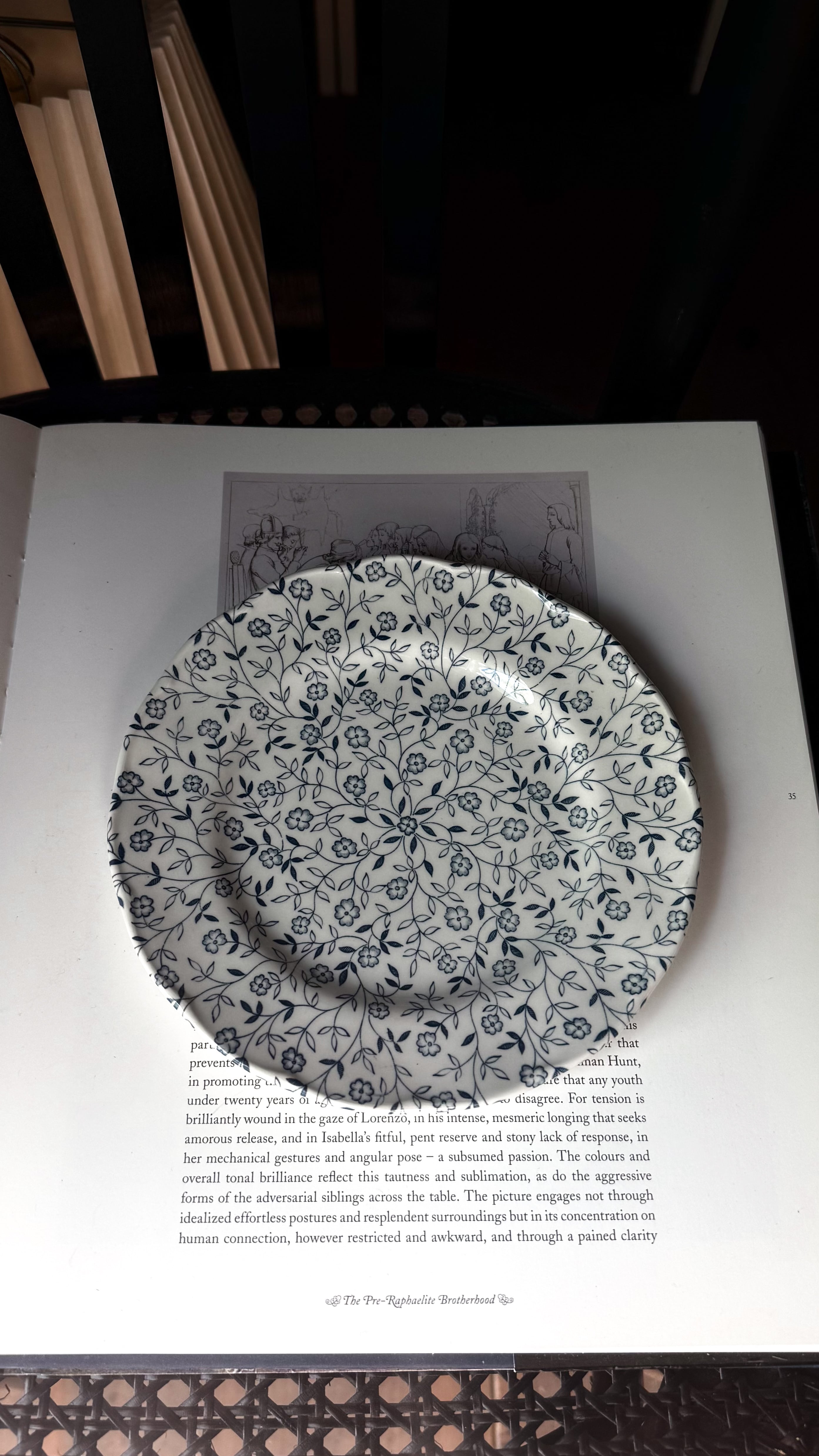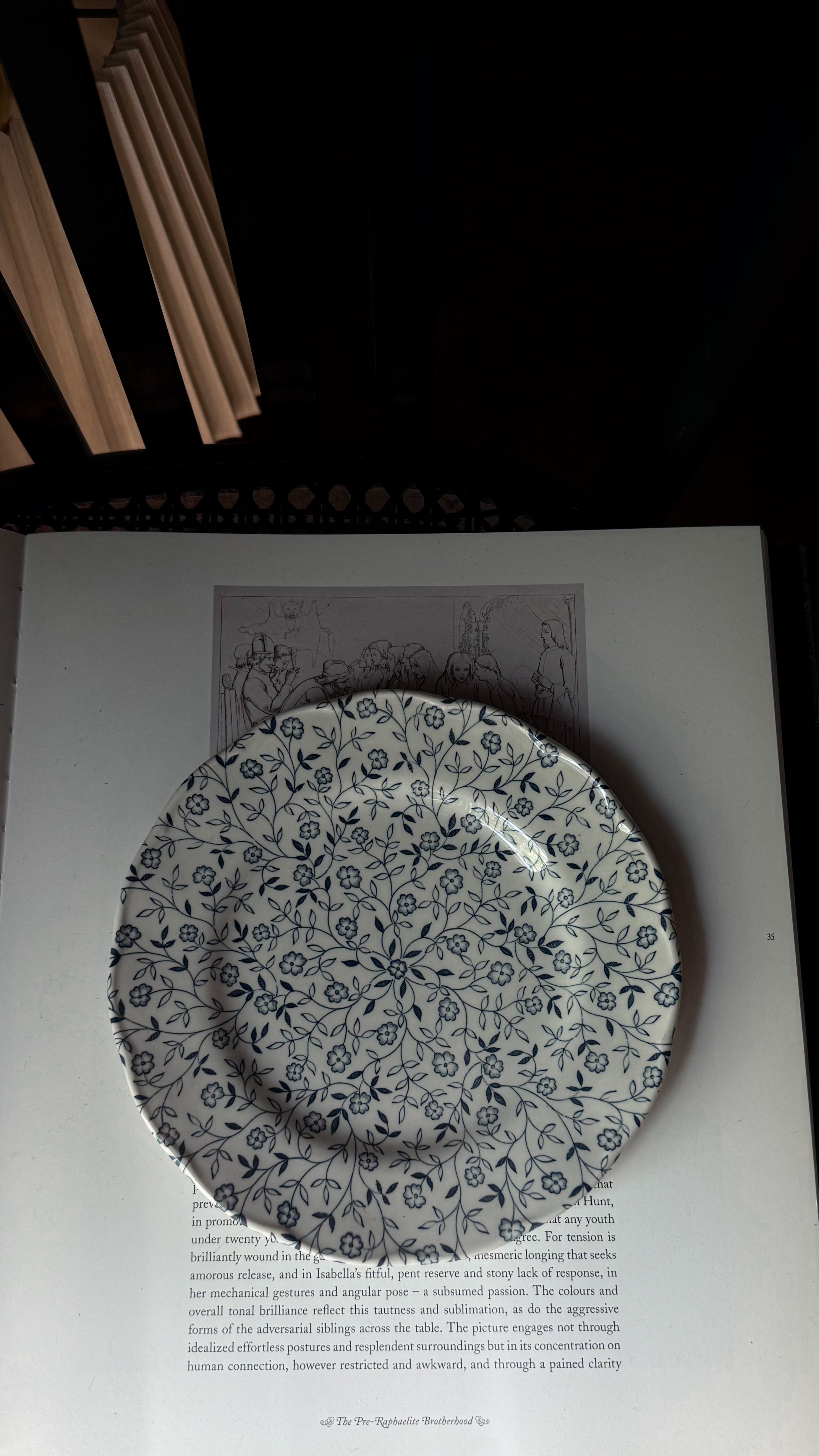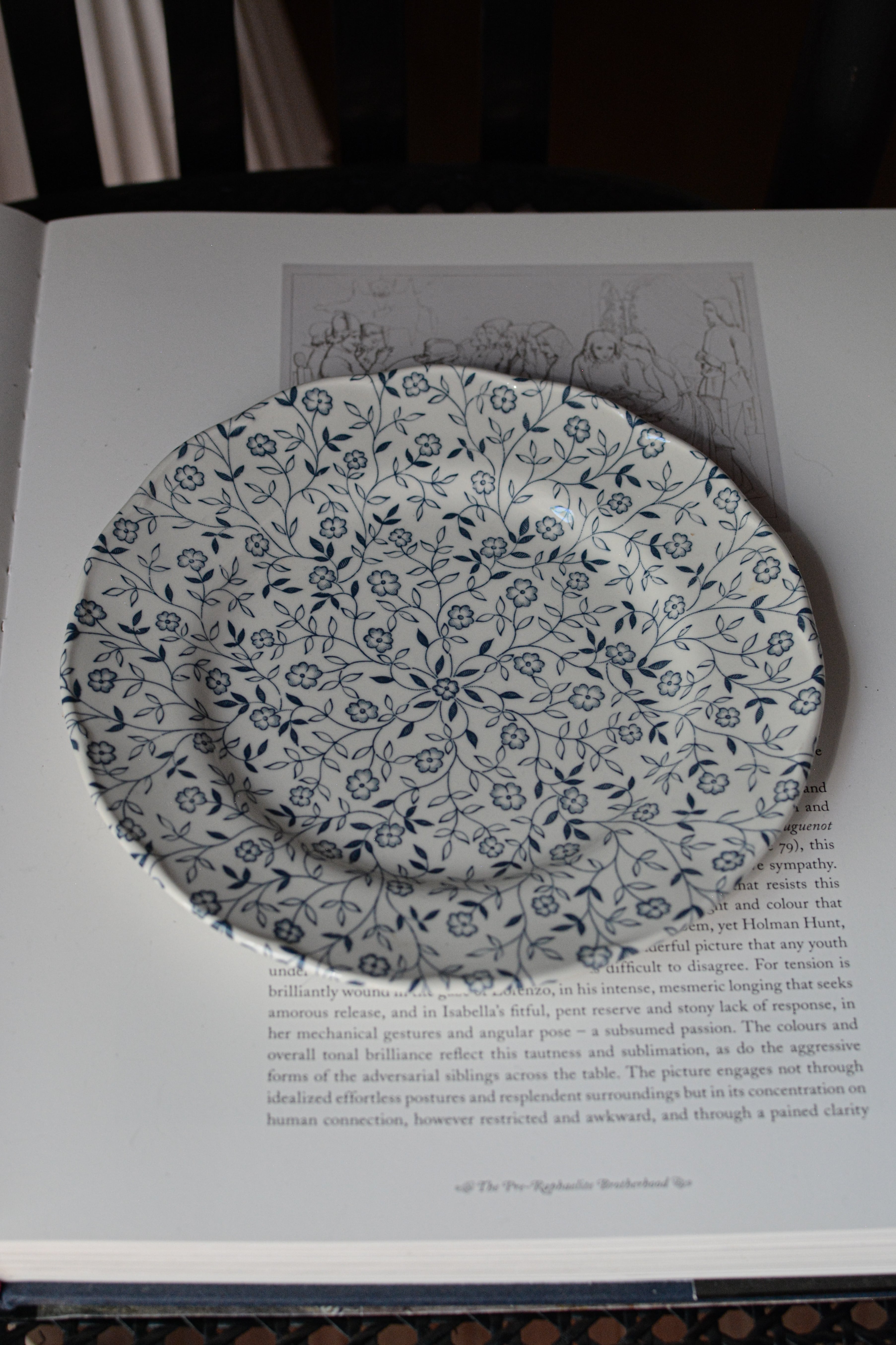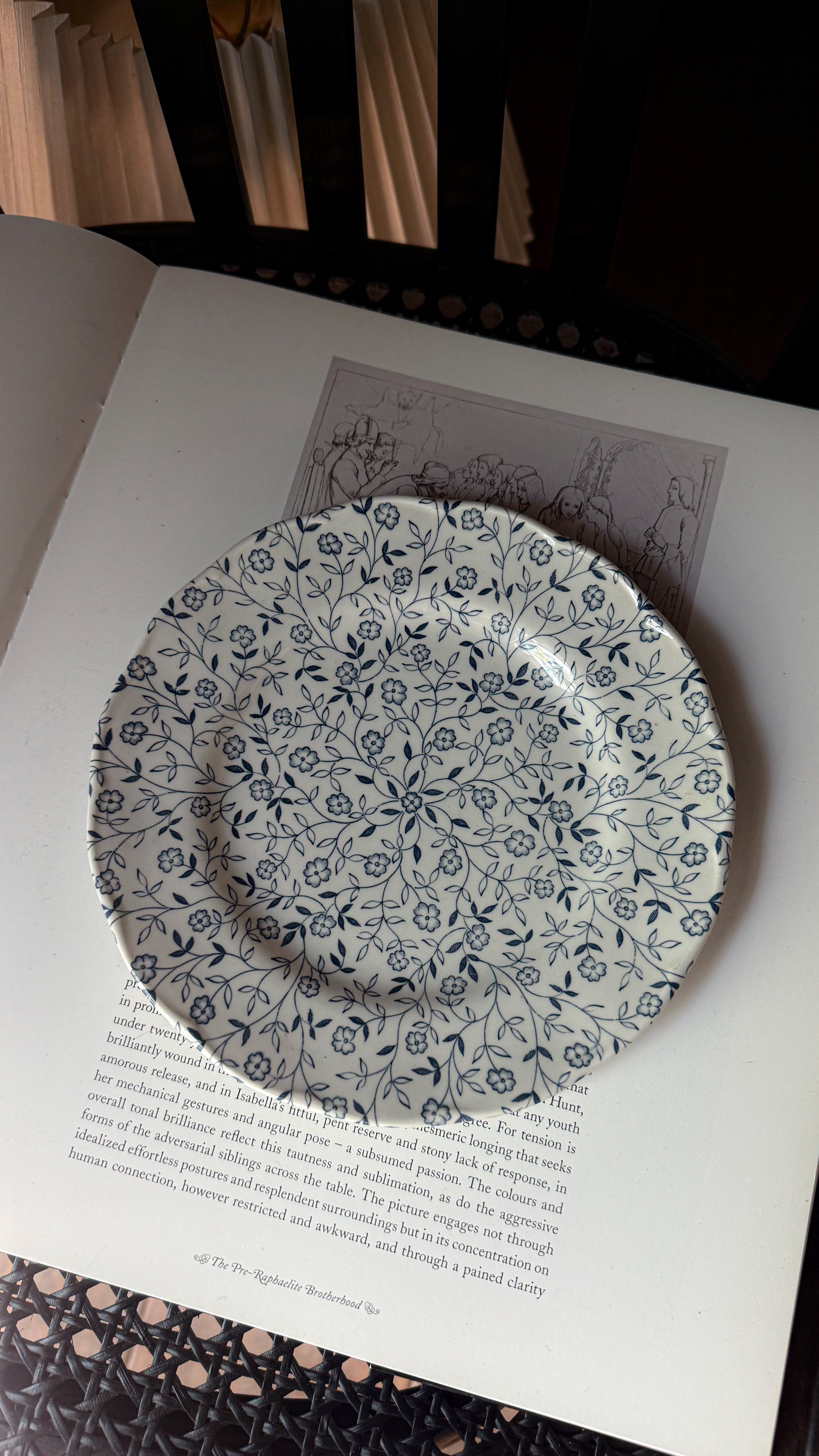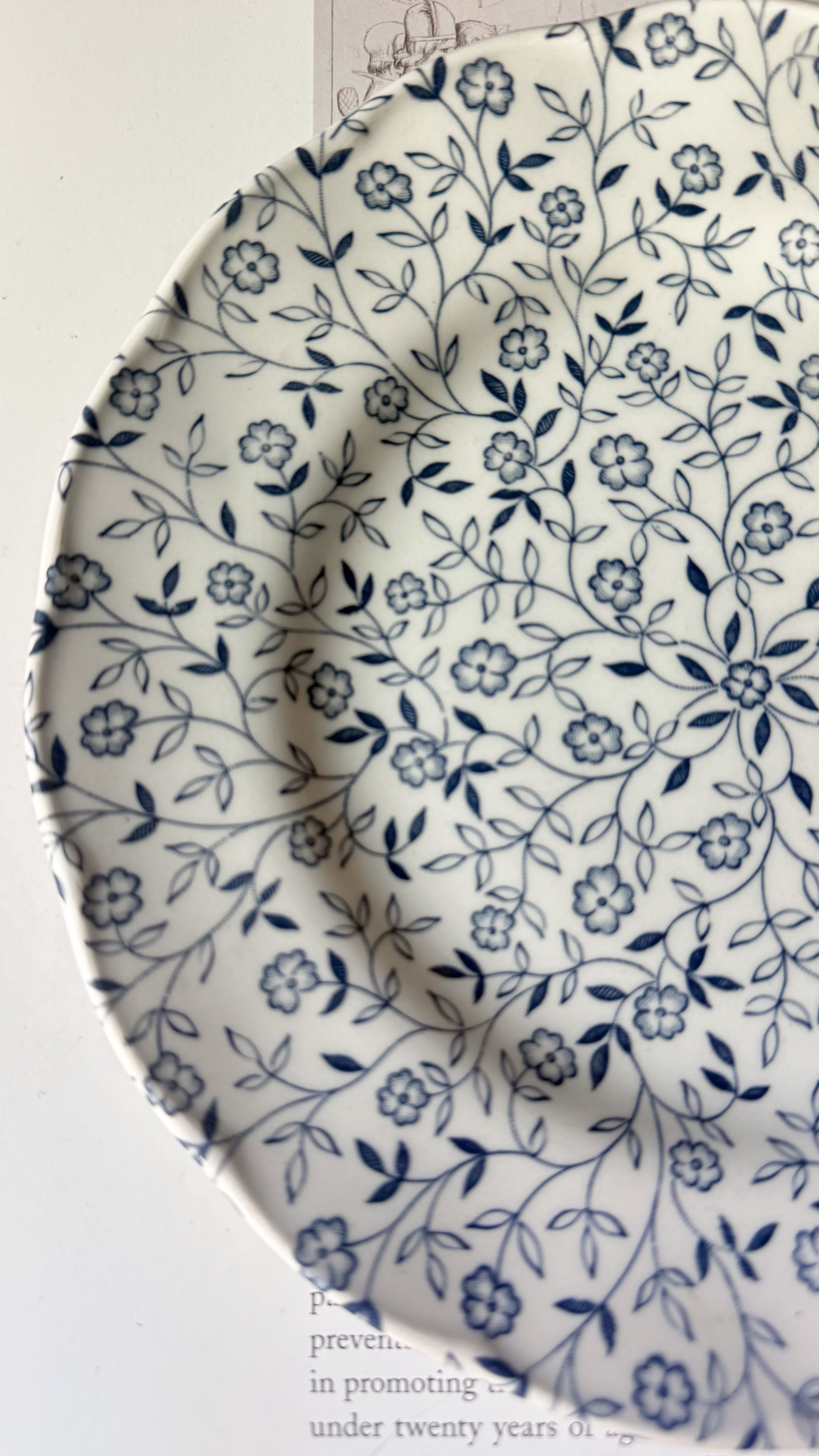 英国 Royal Tudor 深いネイビーの小さな花々が、まるで時間の記憶を繋ぐように並んだ一枚。花模様の下には、日常のぬくもりや穏やかな時間が息づいているようです。光の中で浮かび上がる青の陰影が美しく、飾っておくだけでも優しい存在感。小傷等ございますが、ヴィンテージとしては比較的綺麗な状態です。
