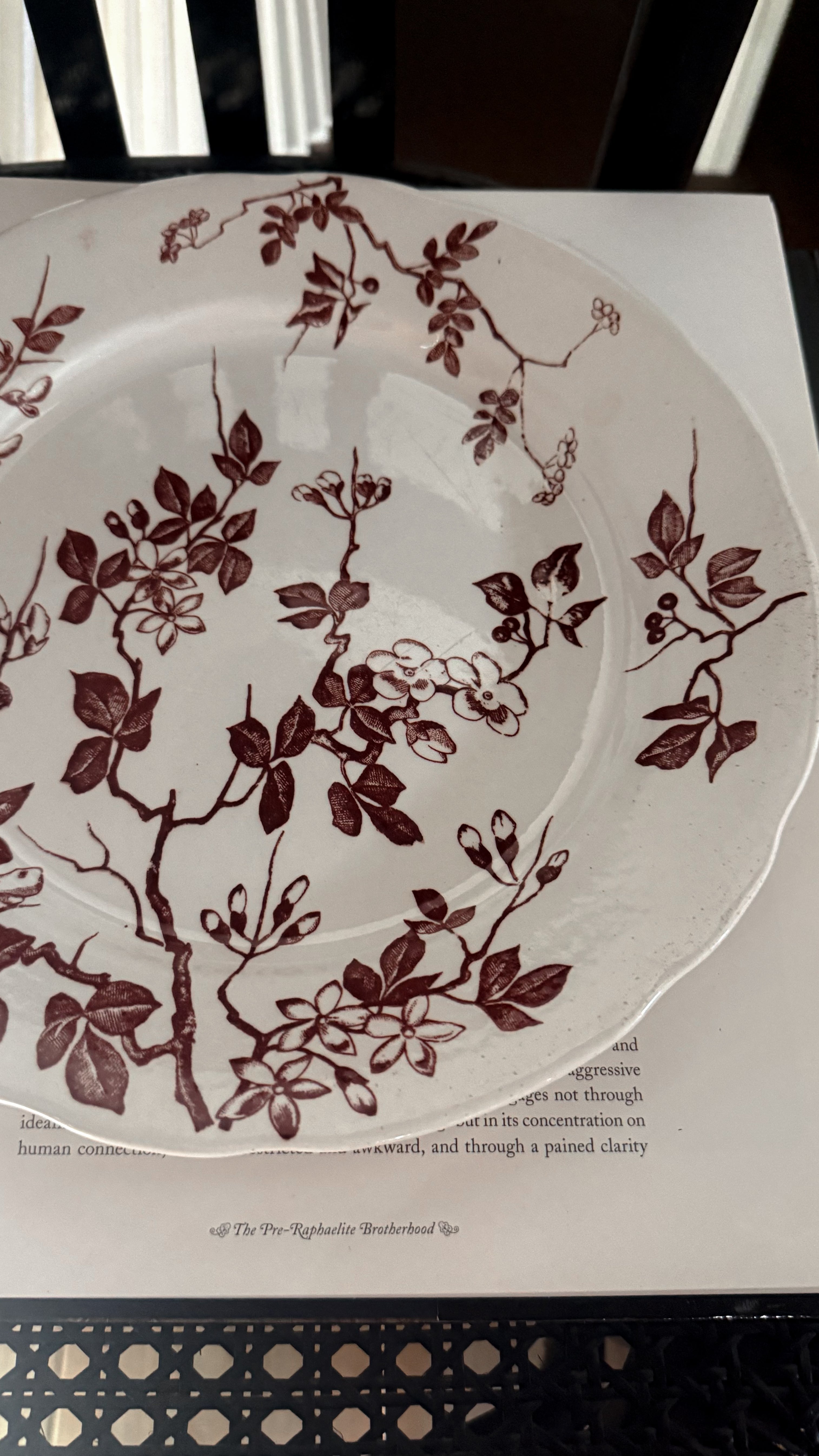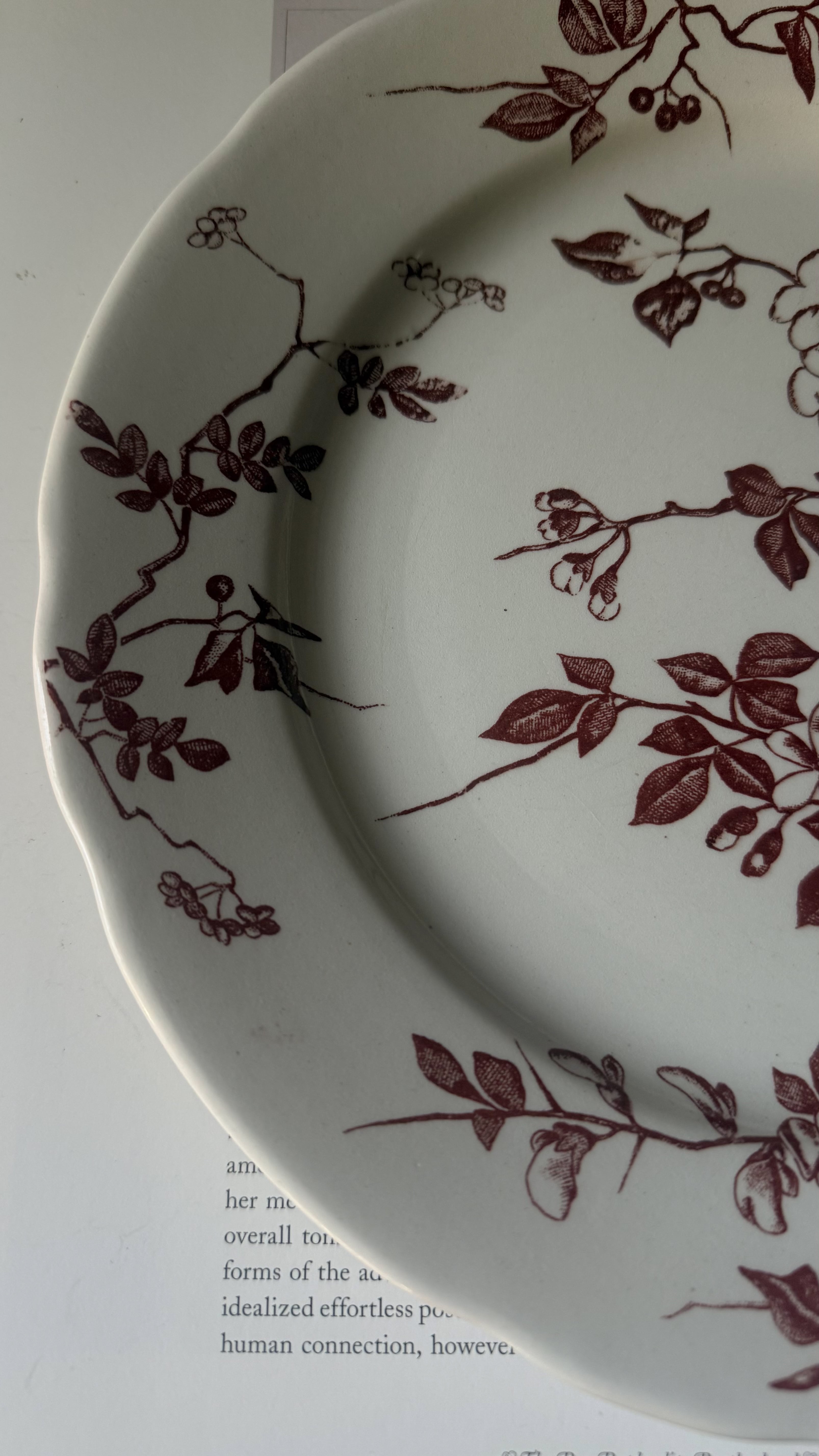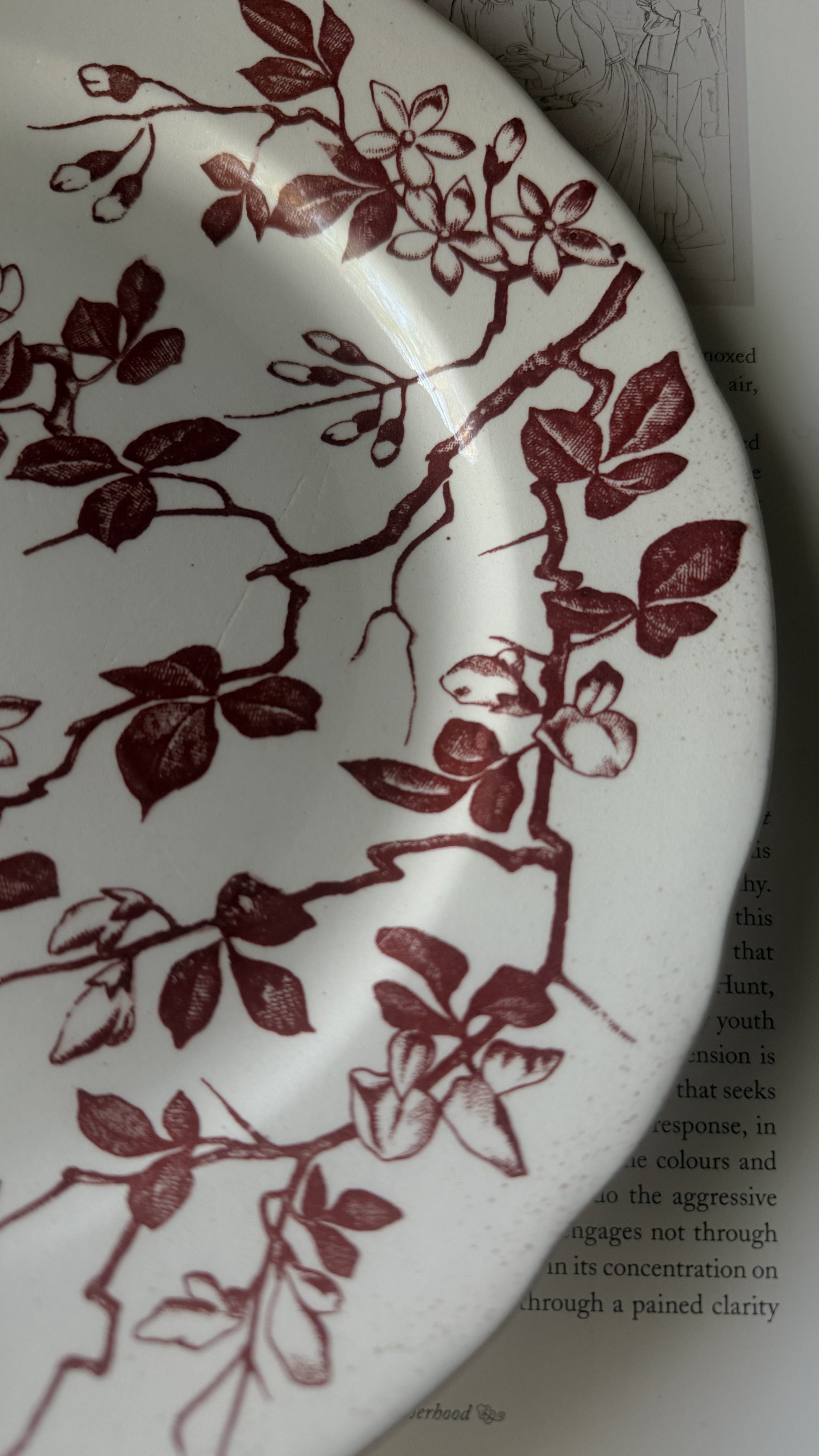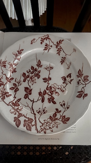やわらかな白に、深みのあるチョコレートブラウンの花模様が静かに咲いています。少し厚みのある陶肌には、日々のぬくもりを受け止めてきた時間の跡があり、その重みはどこか安心感をくれますね。一枚には小さなヘアラインが見られますが、それもまた、長く愛されてきた器だけが持つ穏やかな表情です。テーブル置くだけで、秋冬の暖かな家の中にピッタリなやさしい空気が流れ、