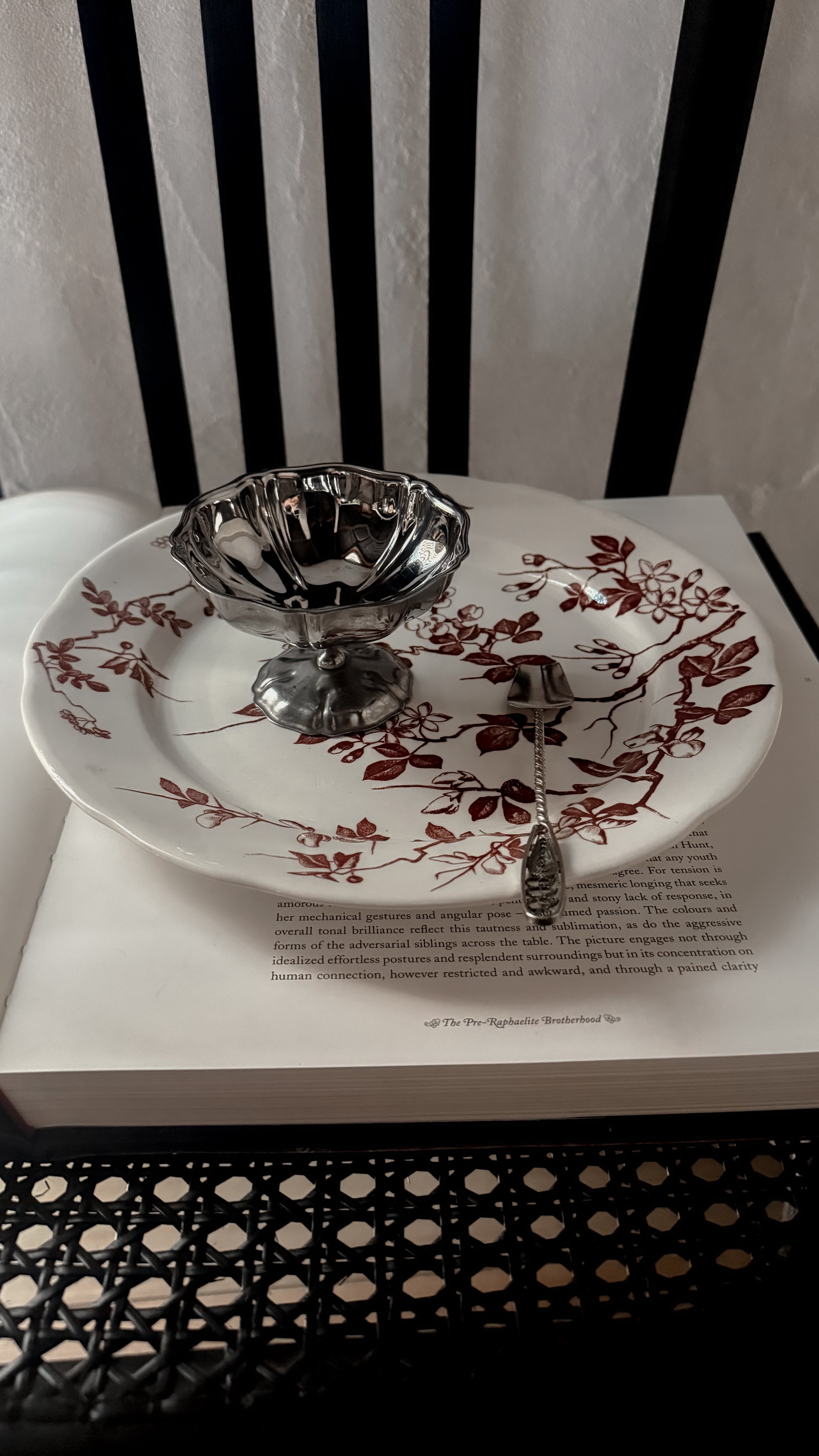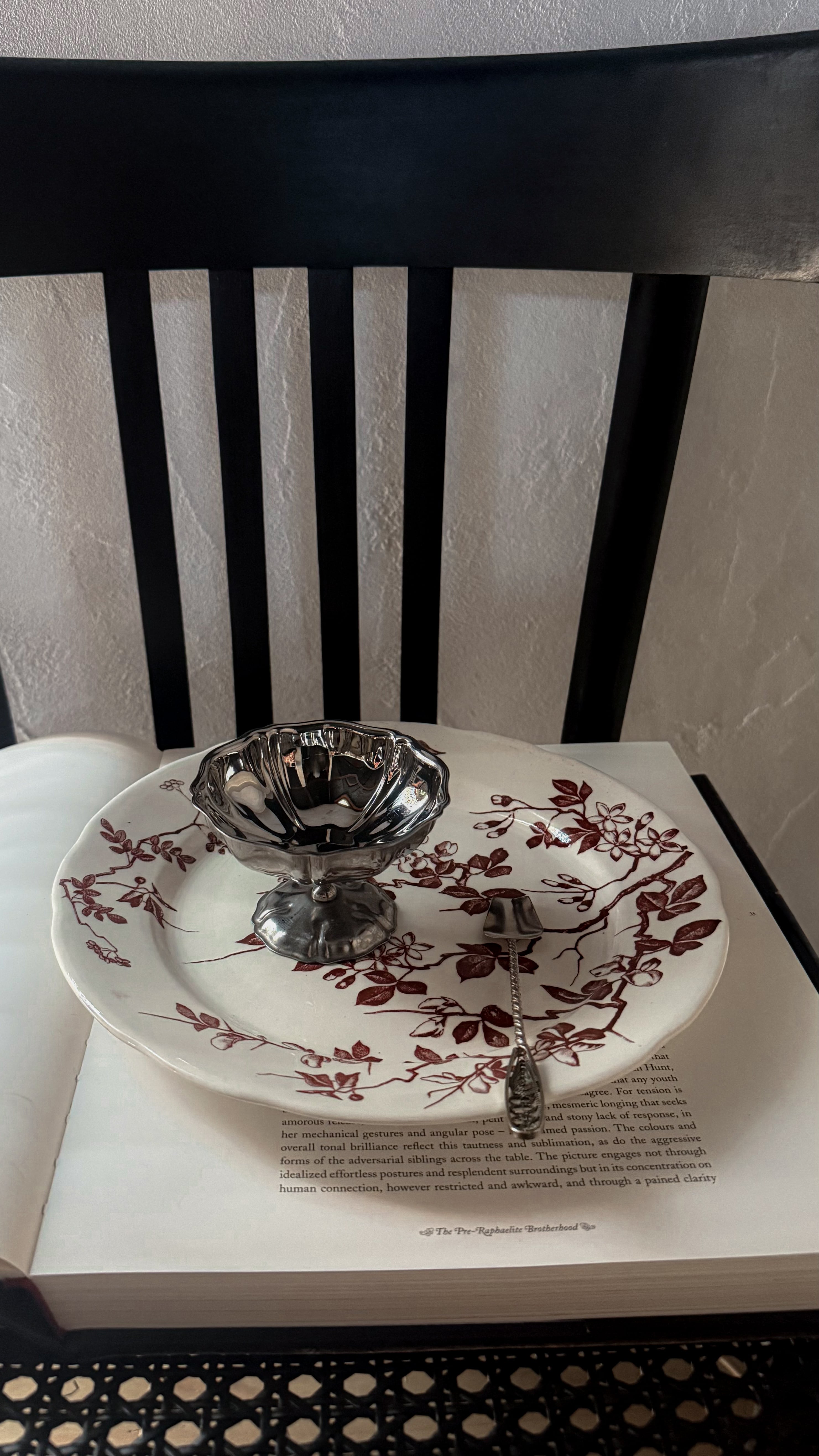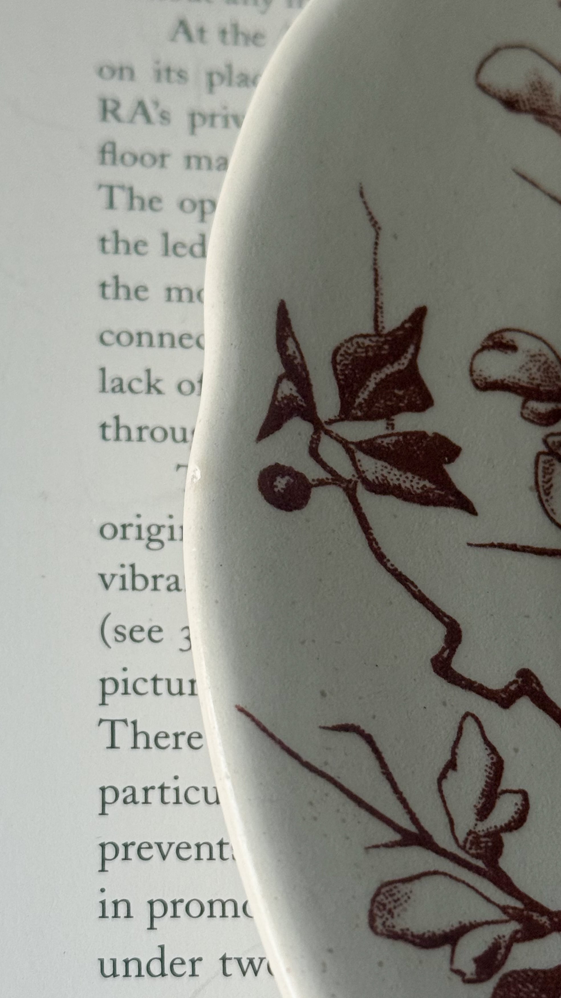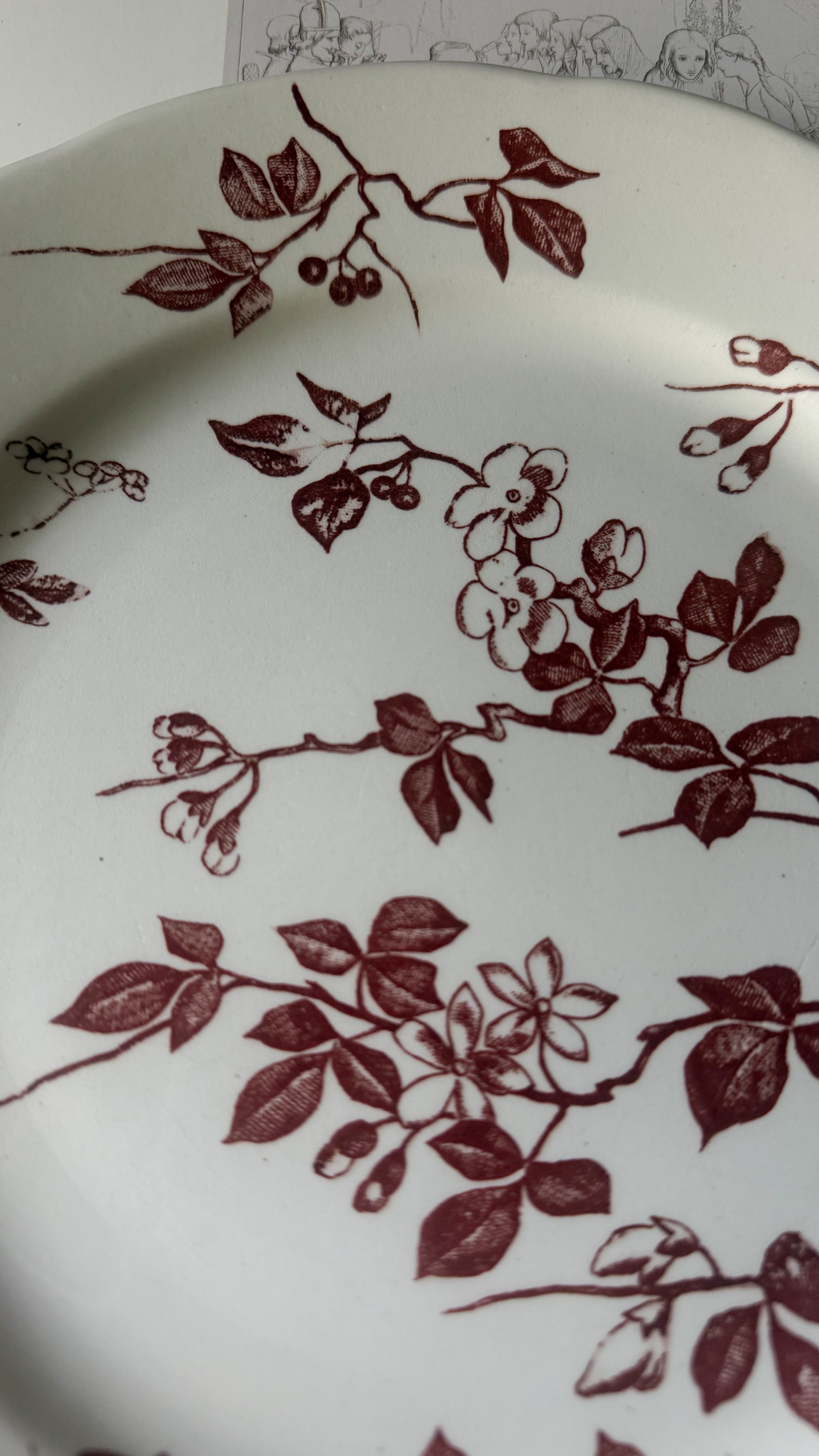 やわらかな白に、深みのあるチョコレートブラウンの花模様が静かに咲いています。少し厚みのある陶肌には、日々のぬくもりを受け止めてきた時間の跡があり、その重みはどこか安心感をくれますね。一枚には小さなヘアラインが見られますが、それもまた、長く愛されてきた器だけが持つ穏やかな表情です。テーブル置くだけで、秋冬の暖かな家の中にピッタリなやさしい空気が流れ、