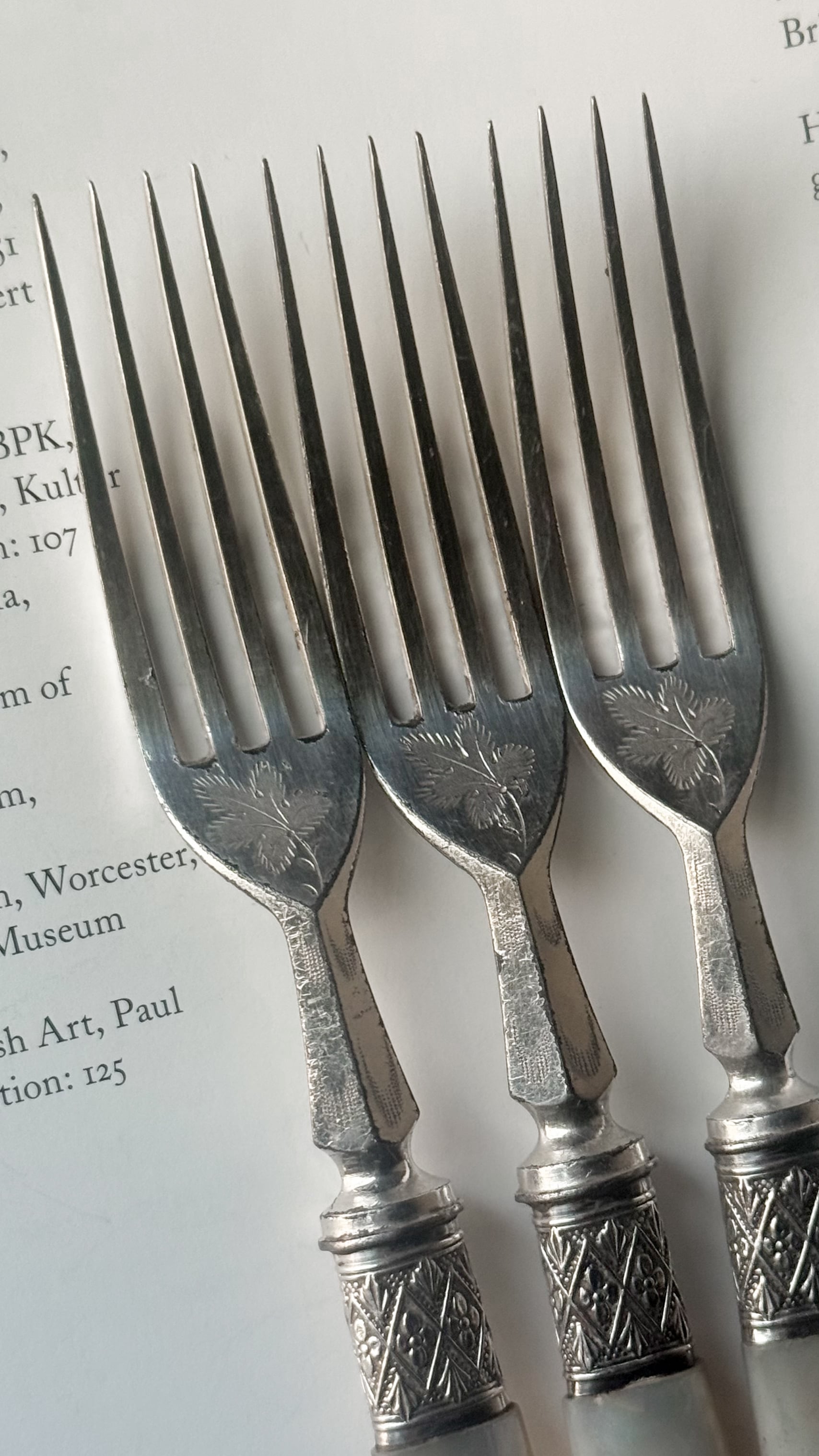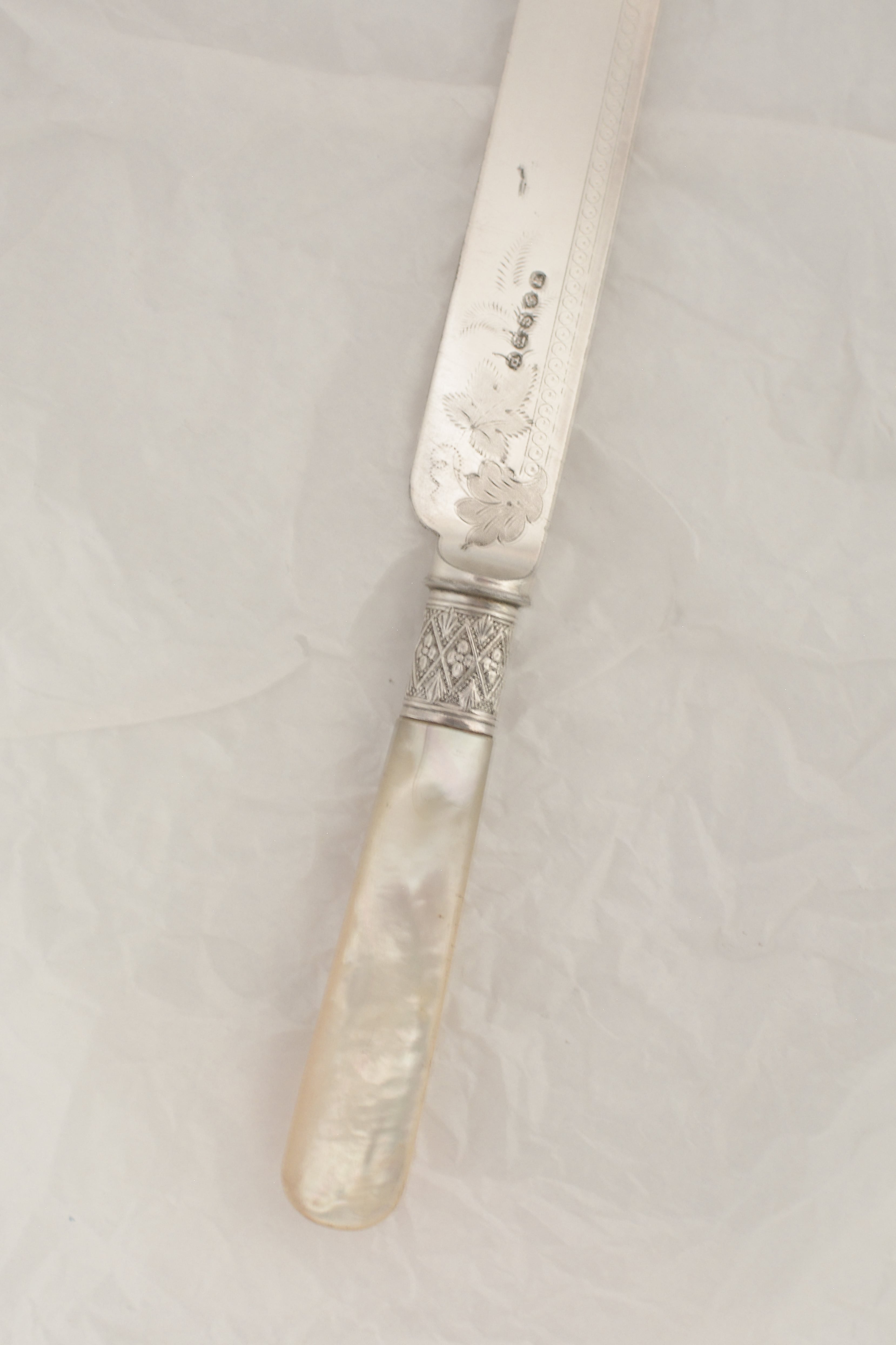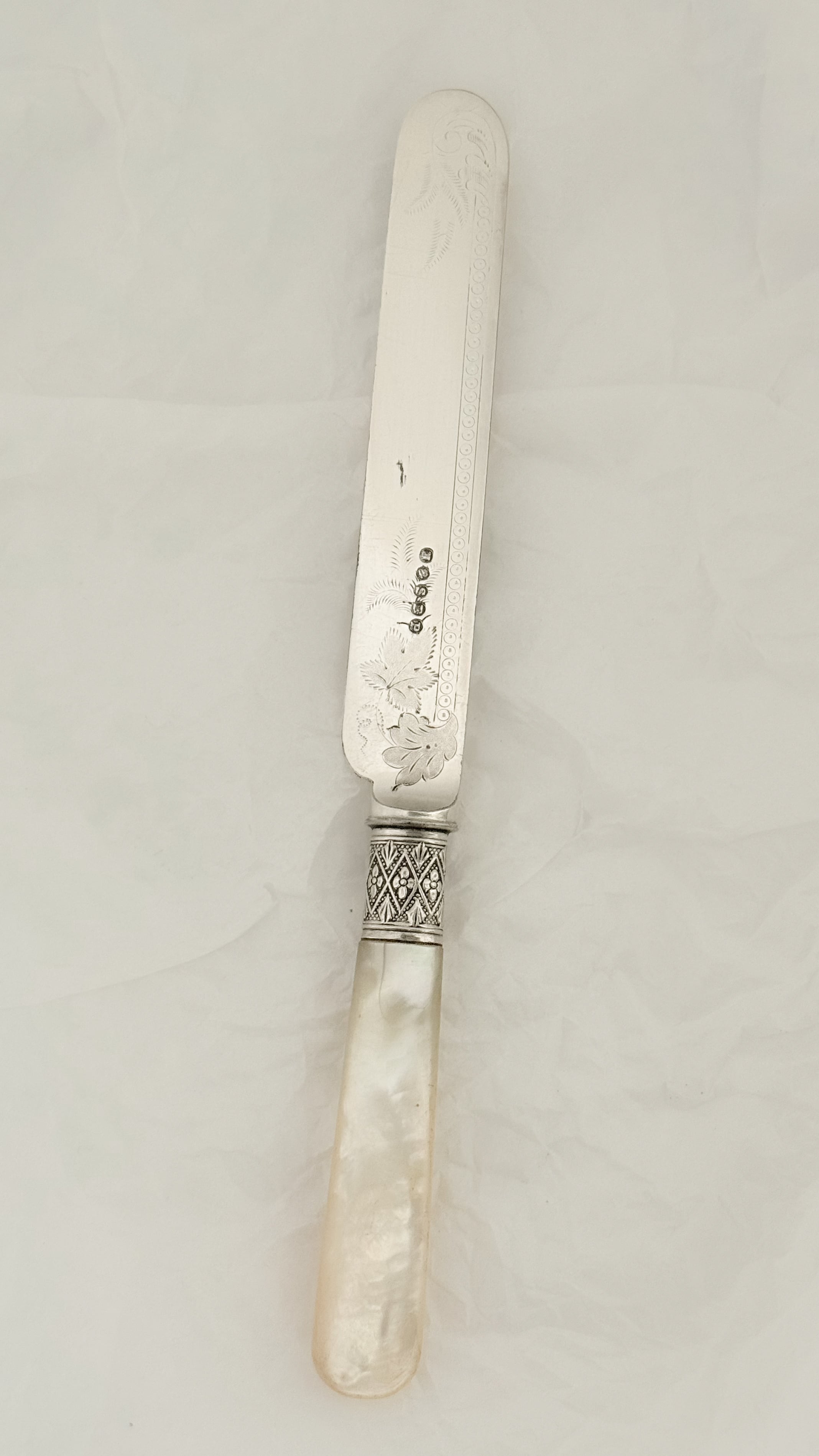 柔らかな光を宿すマザーオブパールのハンドルと、繊細なエングレービングが施されたシルバープレートの組み合わせが美しいお品です。