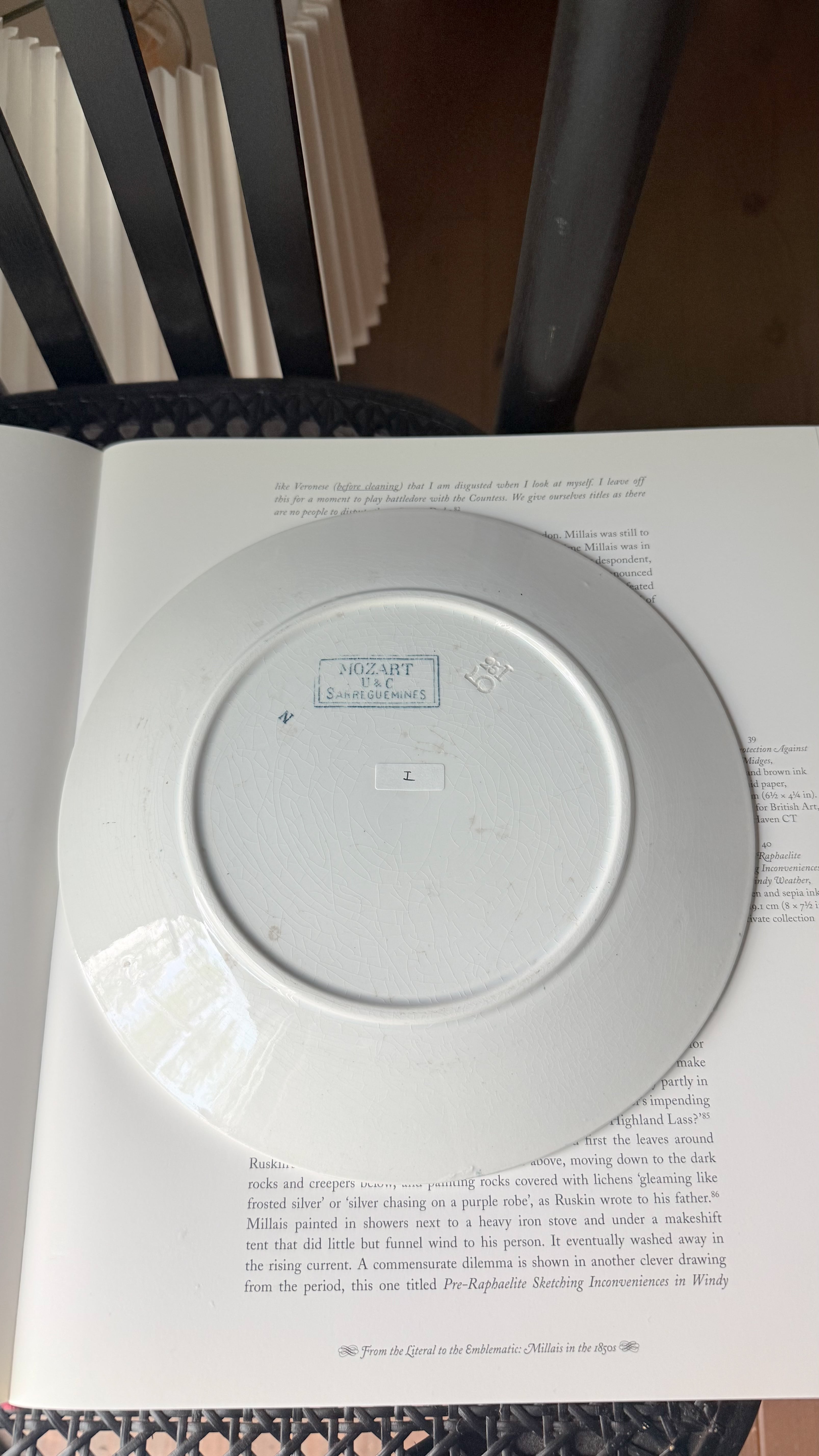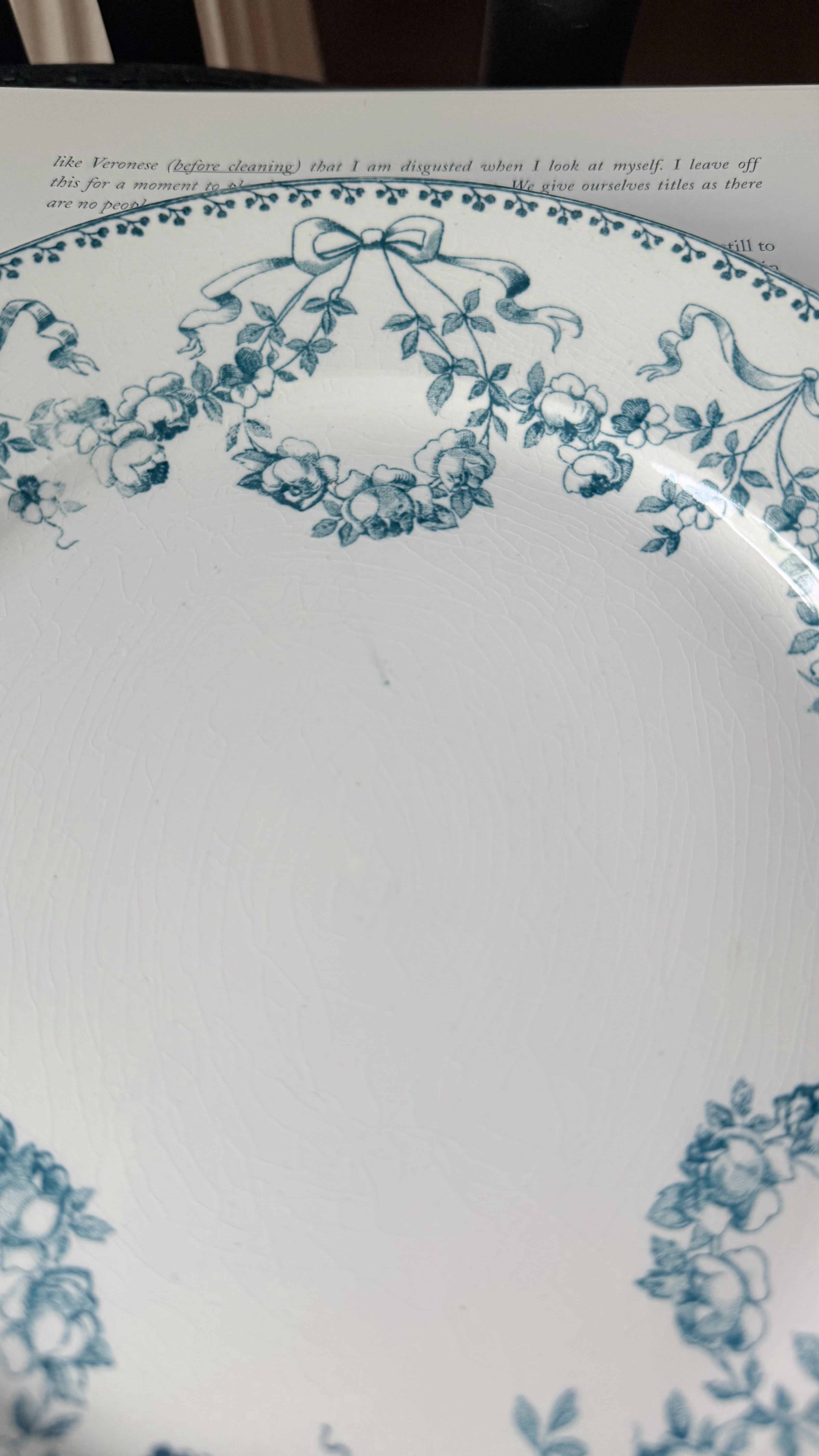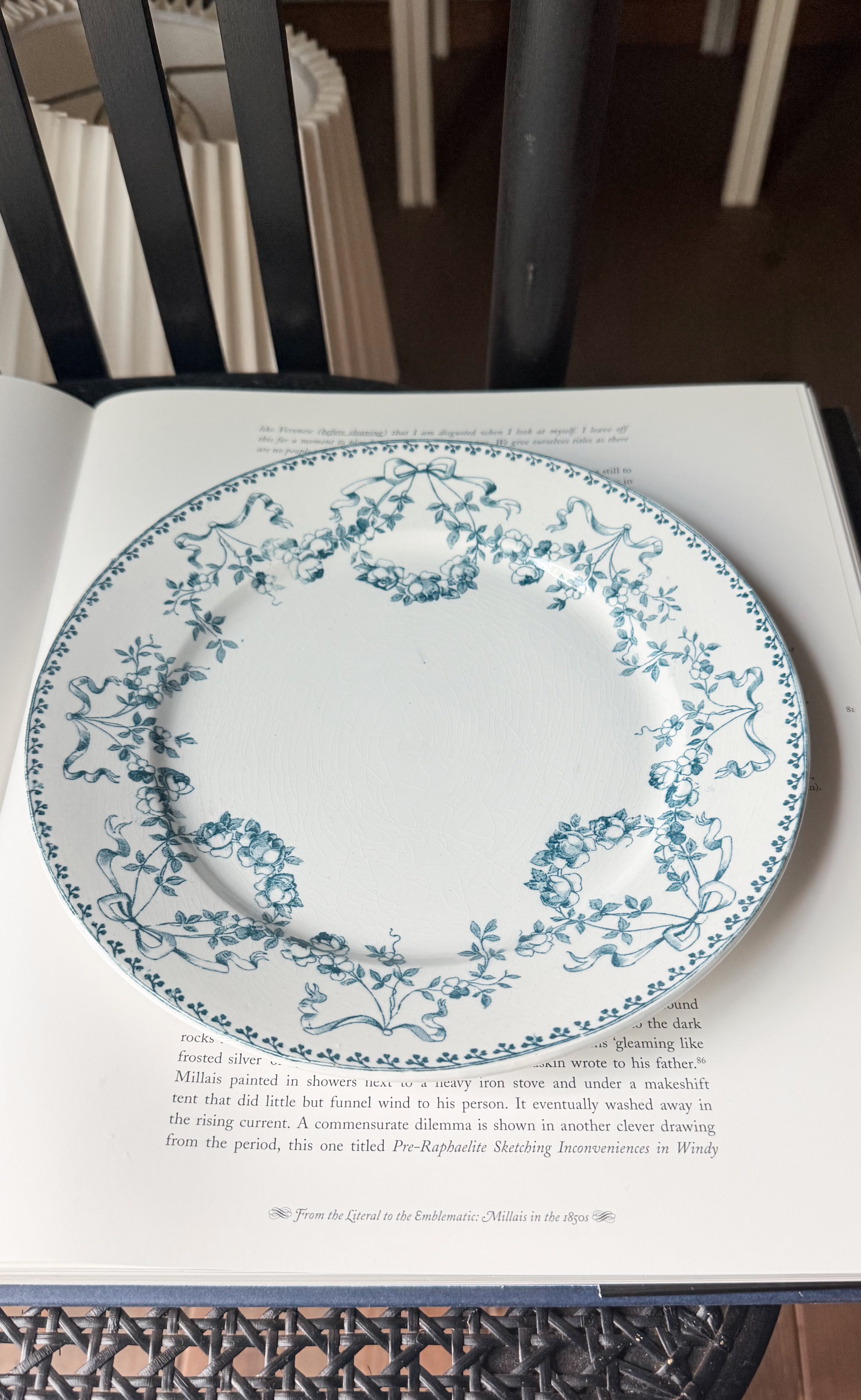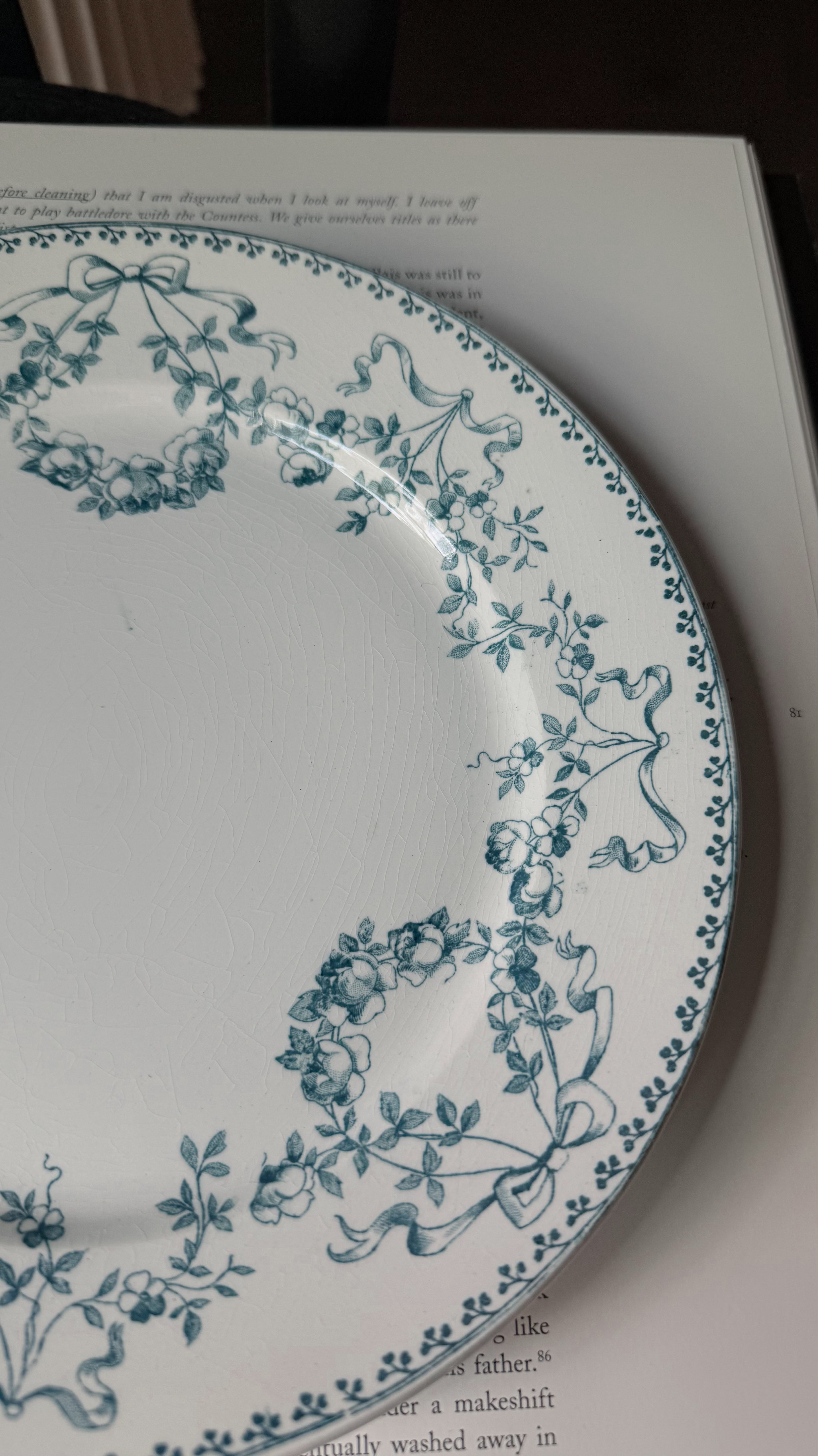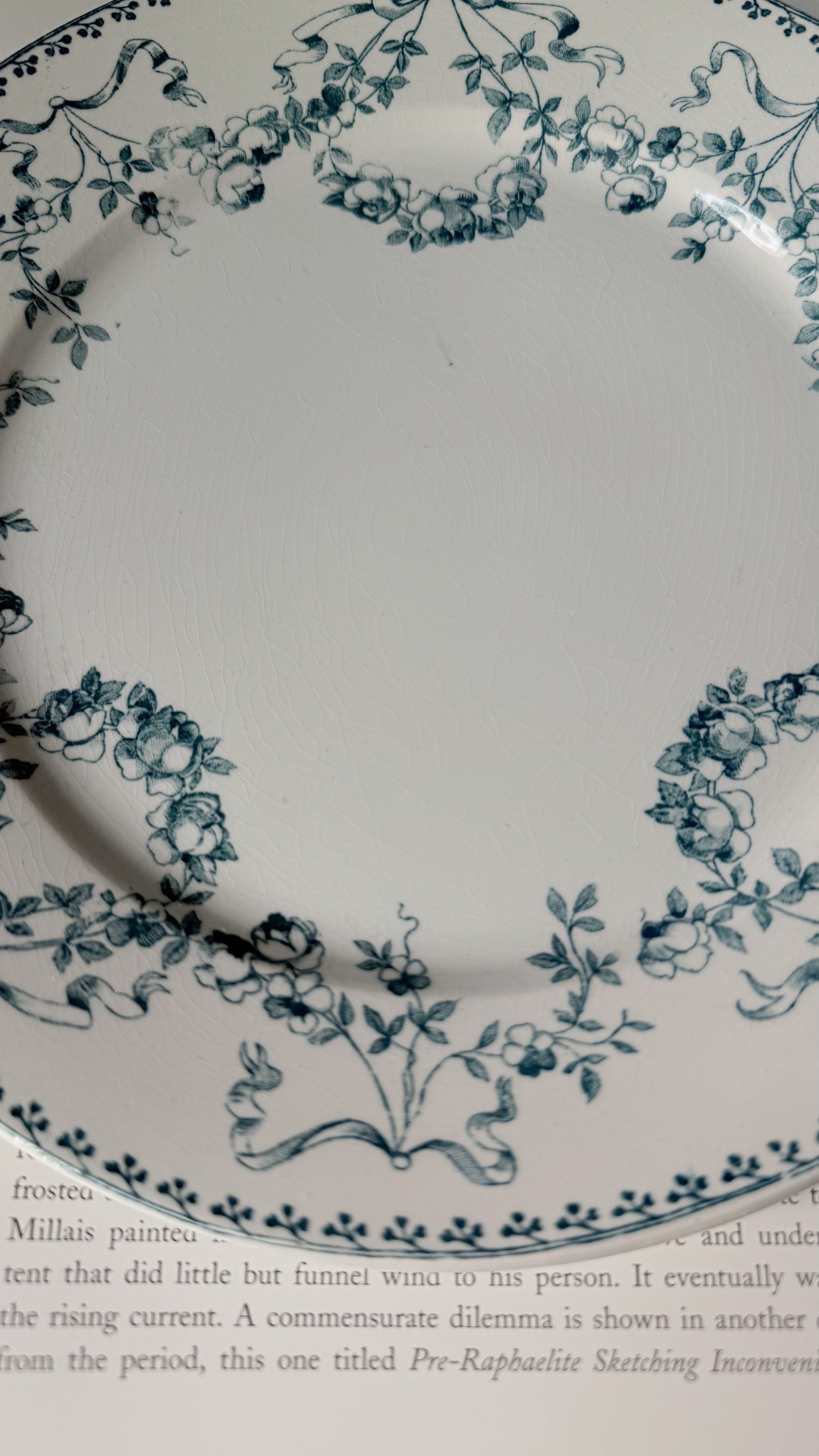 細やかな蔦と、ひらりと結ばれたリボン。小さな花が、ぐるりと輪になって踊るように縁をめぐるSarregueminesのMozartシリーズ。光があたると、うっすらと入った貫入が静かな時間のひびきをそっと浮かび上がらせます。