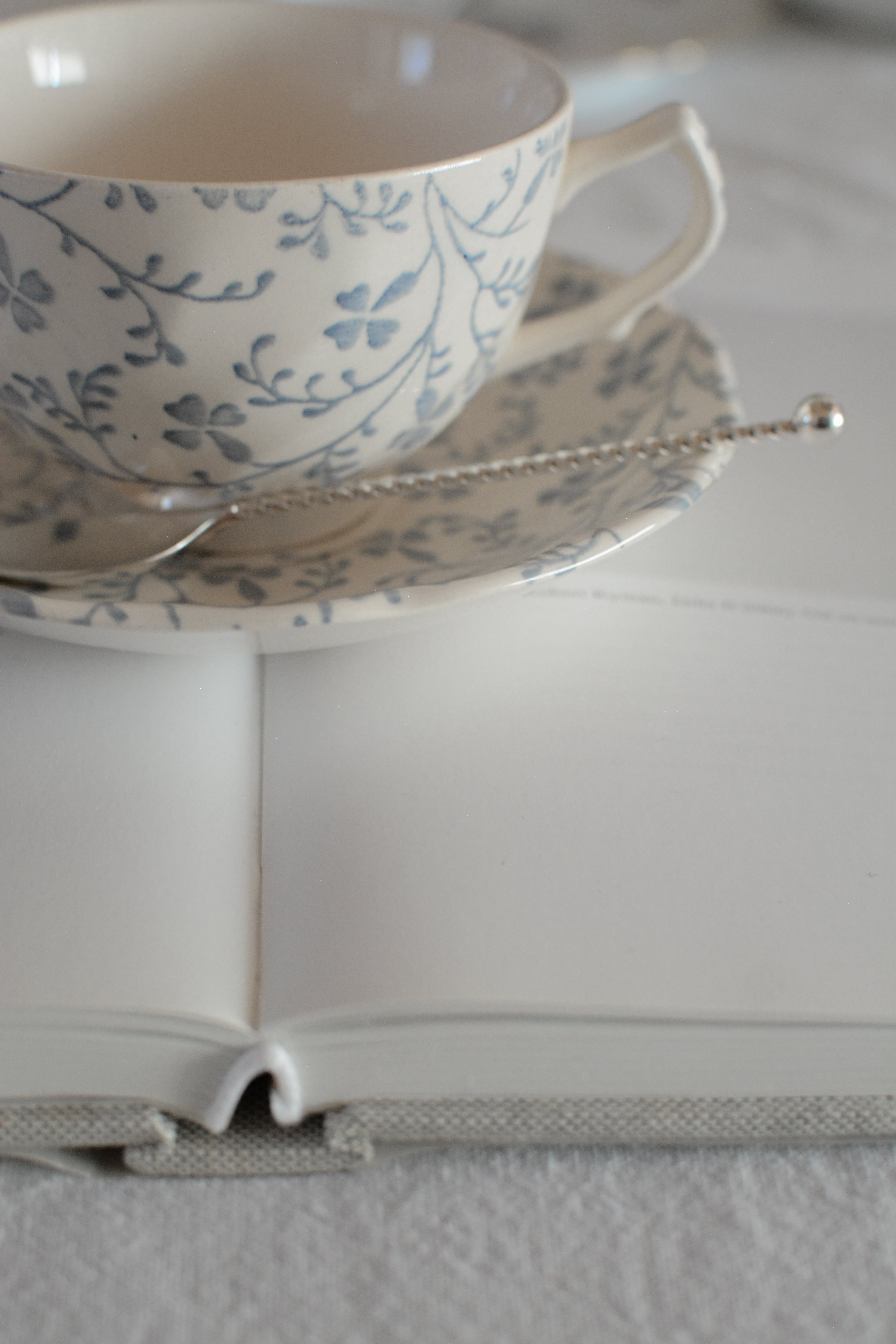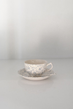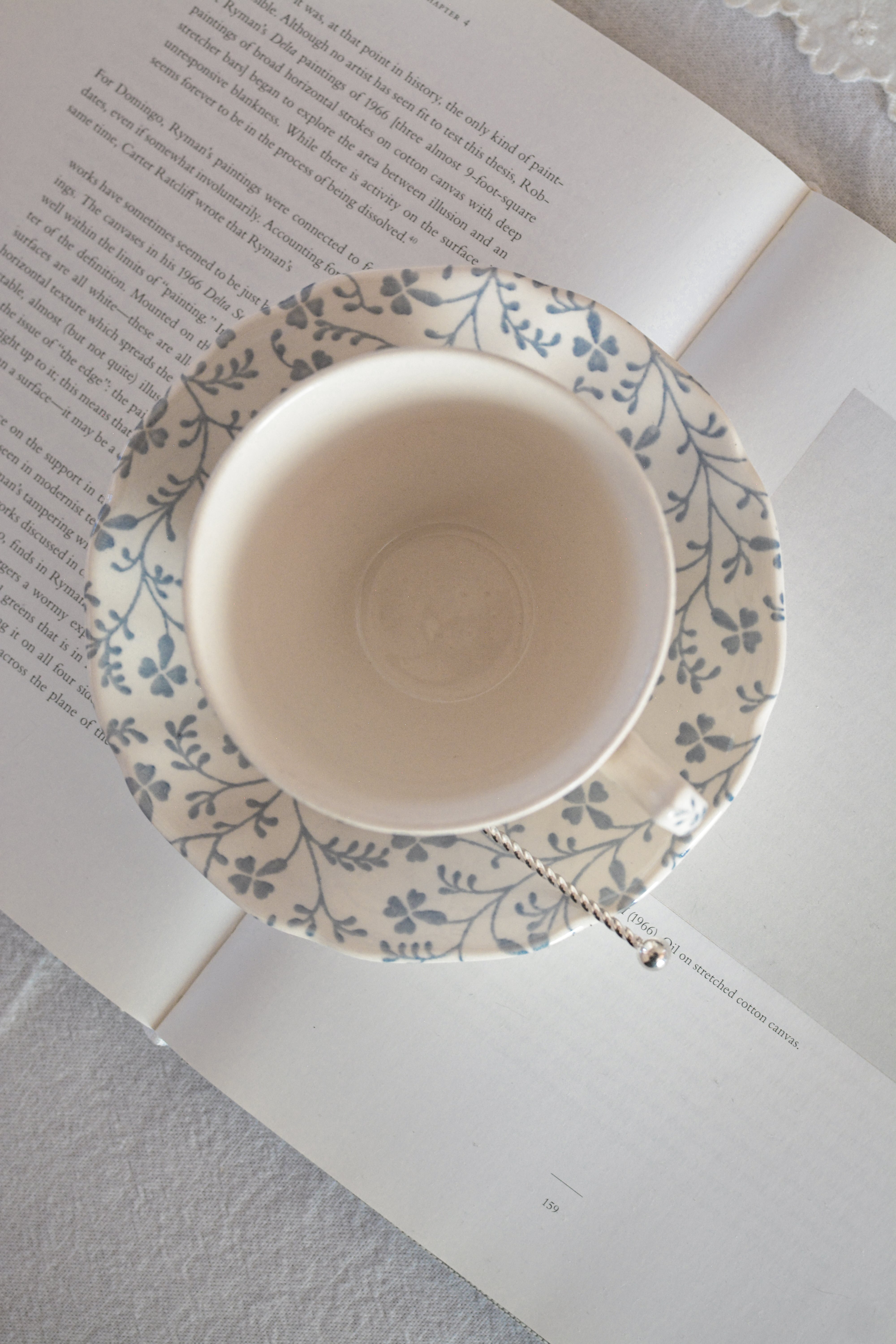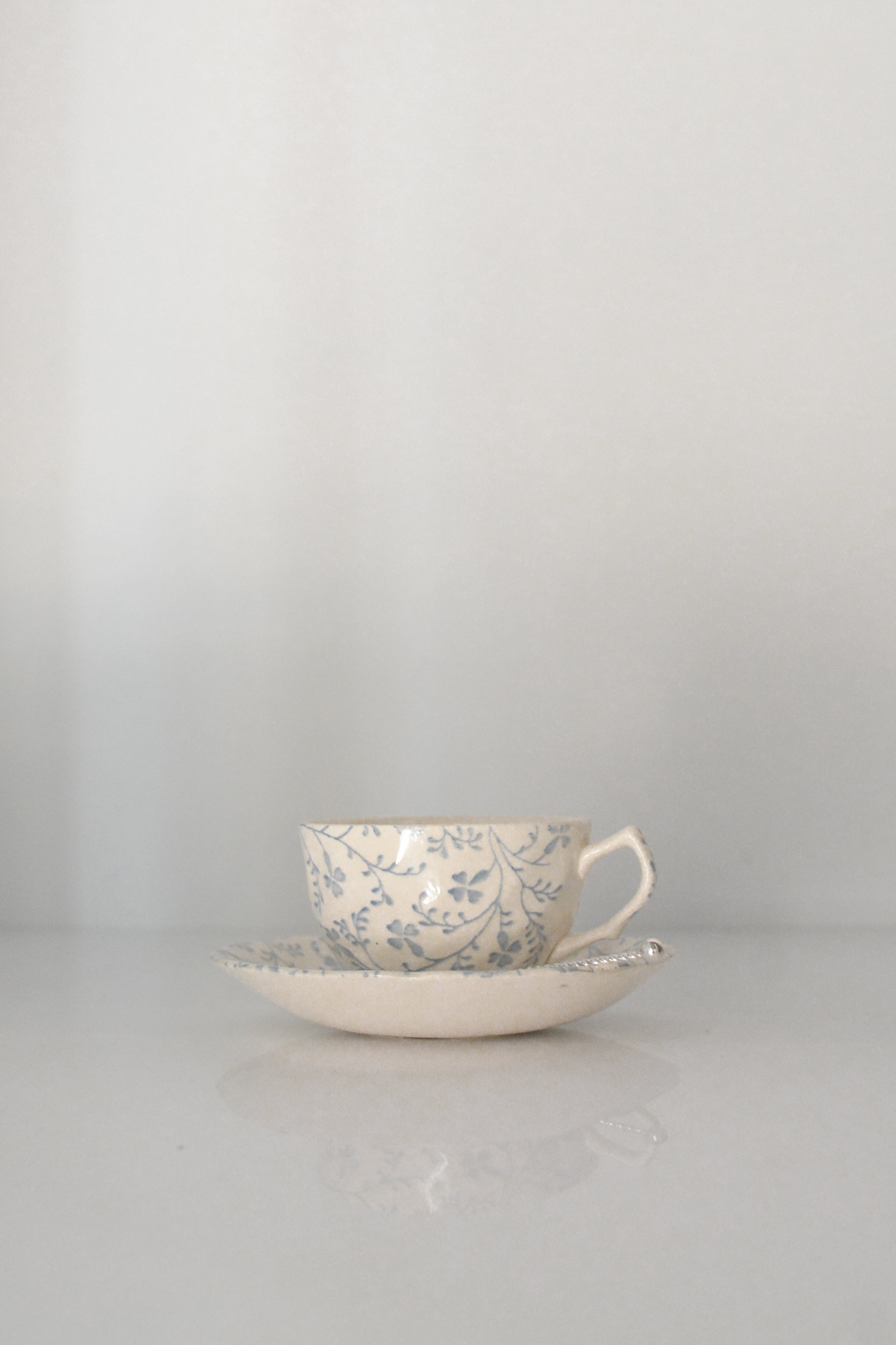 クリームがかった白をベースに、そっとなぞるように描かれた淡いブルーの小花模様。華やかさというより、しずかなやさしさを感じる佇まいで、朝の光や午後の薄曇りの柔らかい時間によく似合います。ソーサーにも同じ模様が広がり、トレイにのせた時のまとまりや調和がとても美しい一品です。こちらの個体は釉薬に入った貫入に沿って、うっすらと黒く色が入った部分が見られます。長い時間過ごしたことで生まれたもので、全体の印象を損なわずむしろ、まるで記憶のように器の中に溶け込んでやさしく現れるその影は”景色”ともいえる表情。一点ものの味わいとしてお楽しみくださいませ。