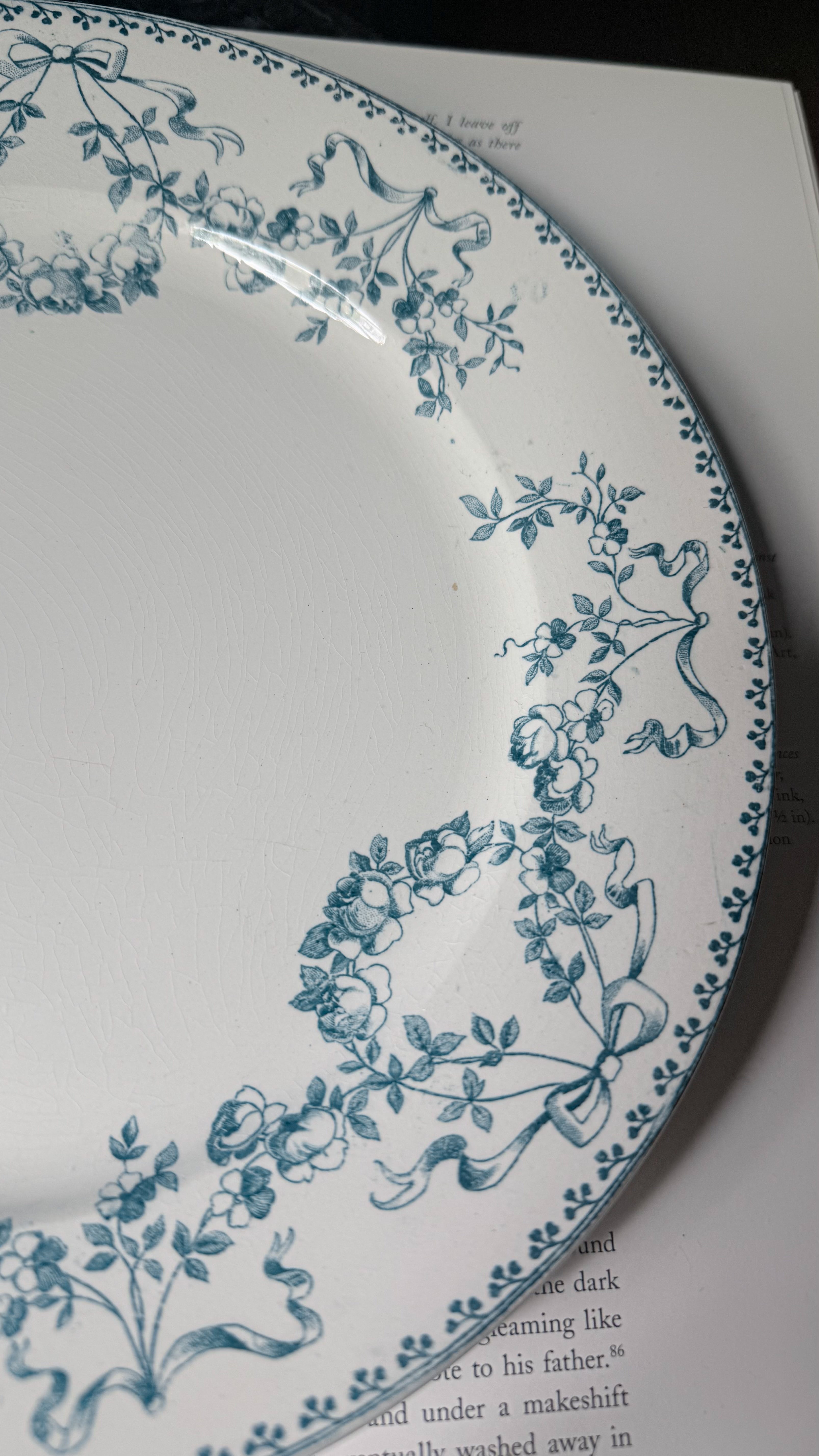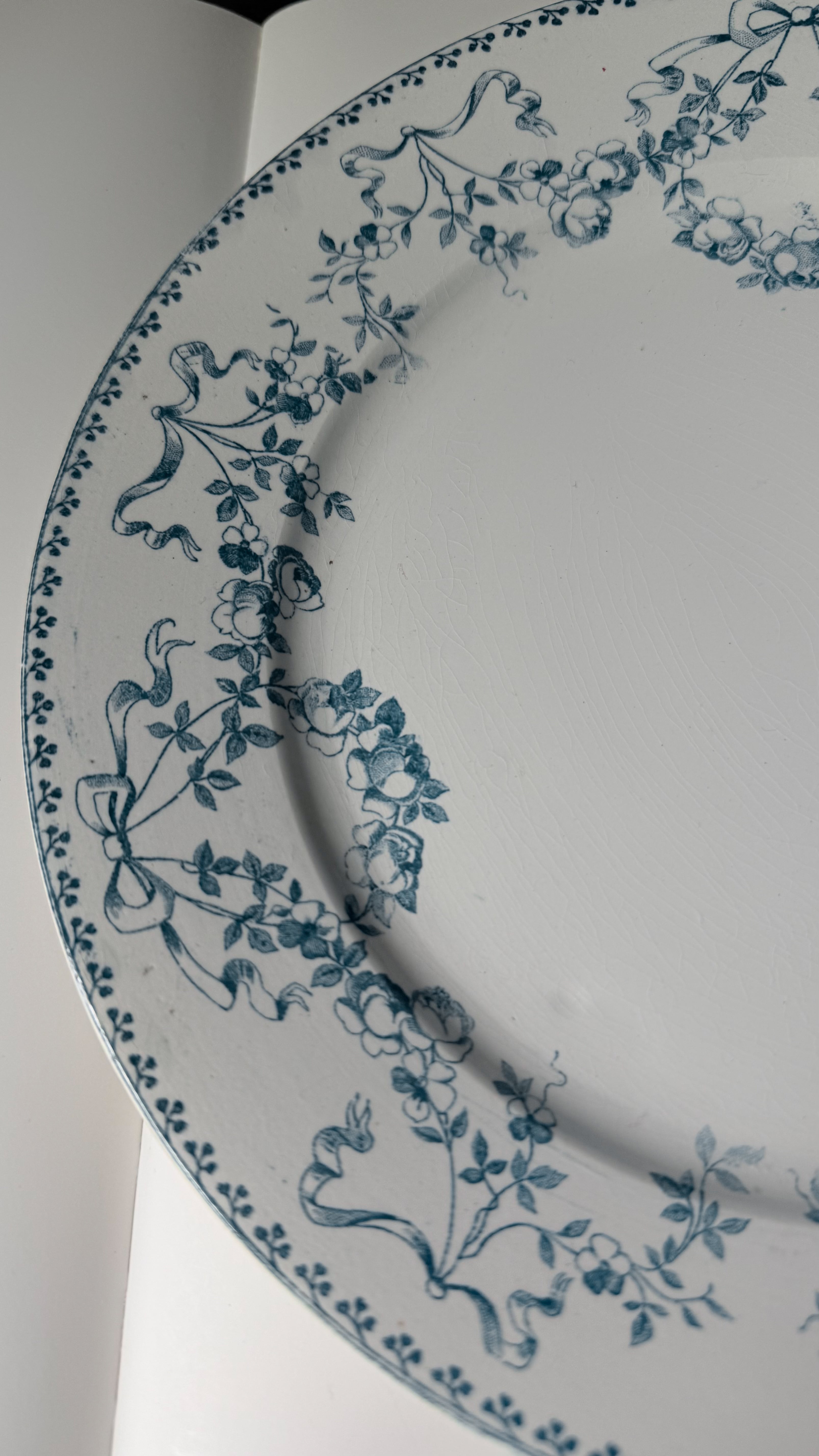 細やかな蔦と、ひらりと結ばれたリボン。小さな花が、ぐるりと輪になって踊るように縁をめぐるSarregueminesのMozartシリーズ。光があたると、うっすらと入った貫入が静かな時間のひびきをそっと浮かび上がらせます。