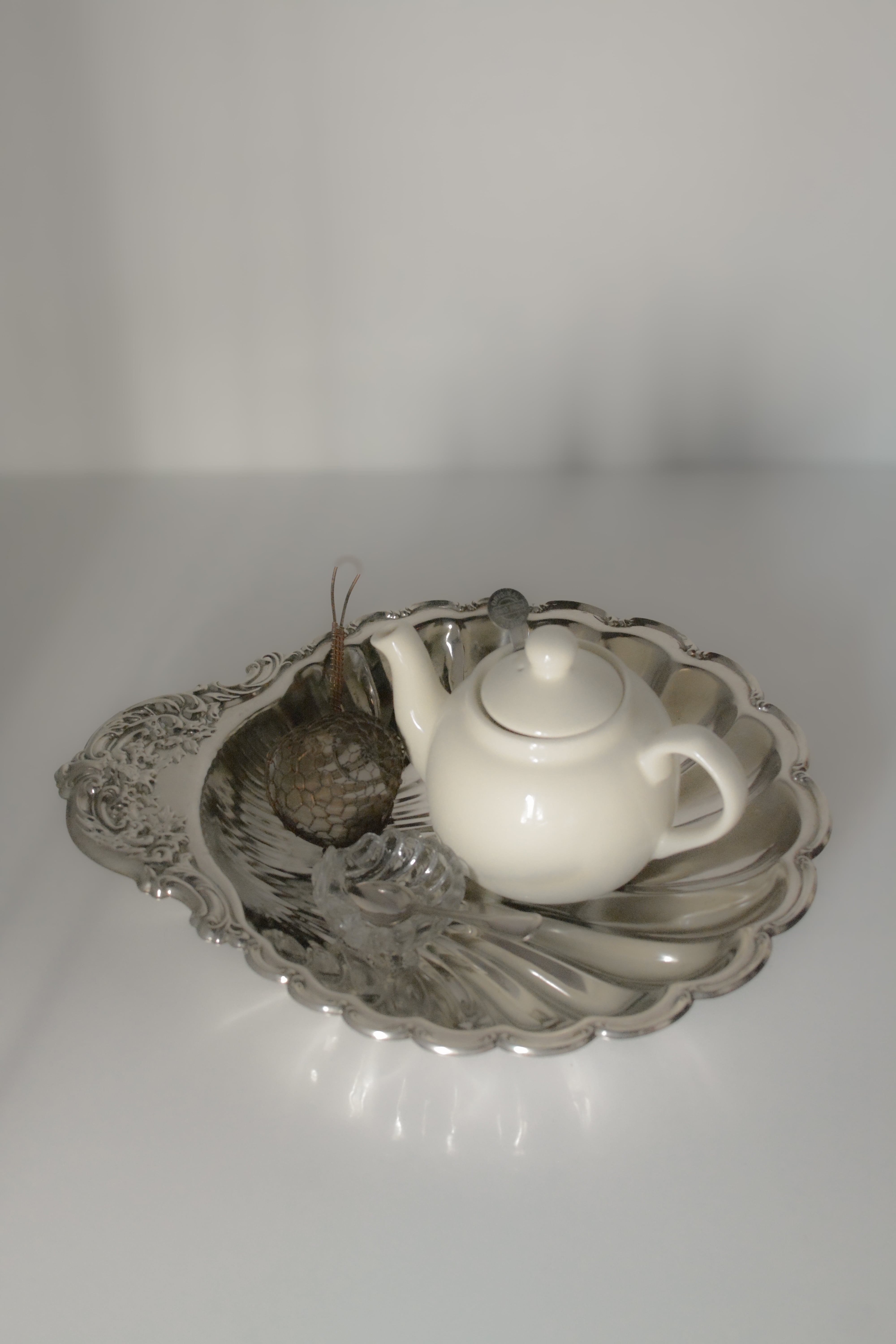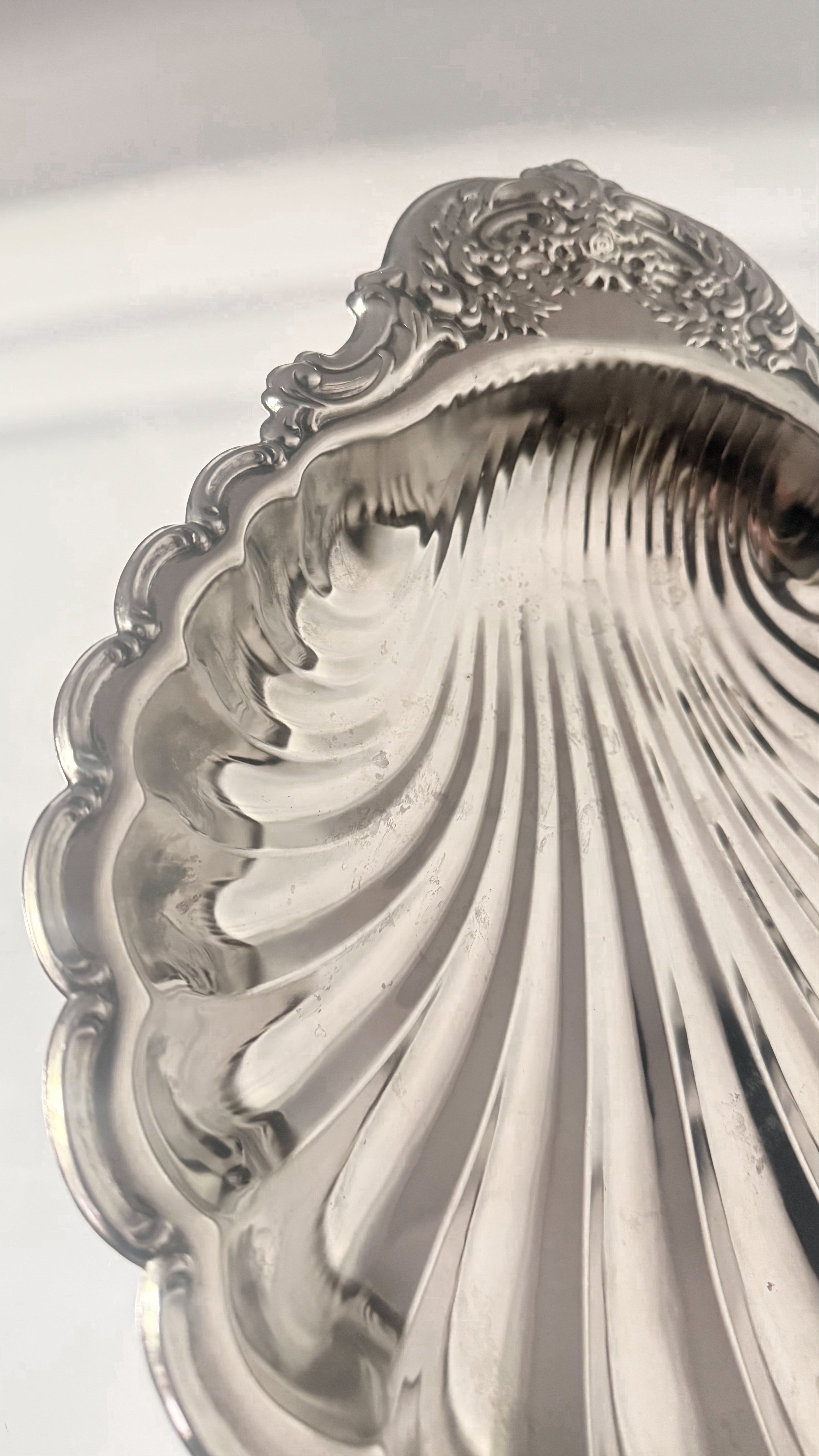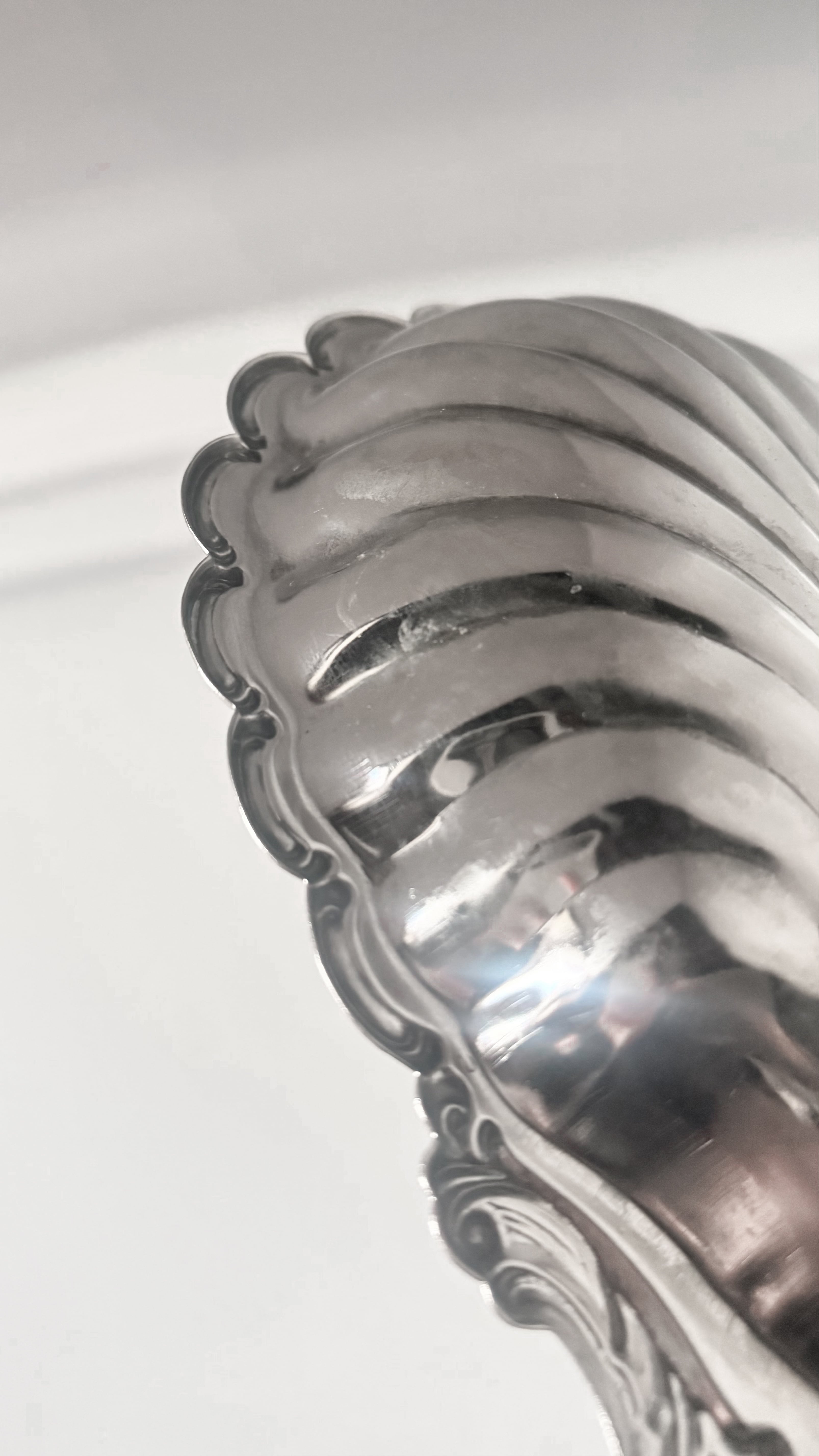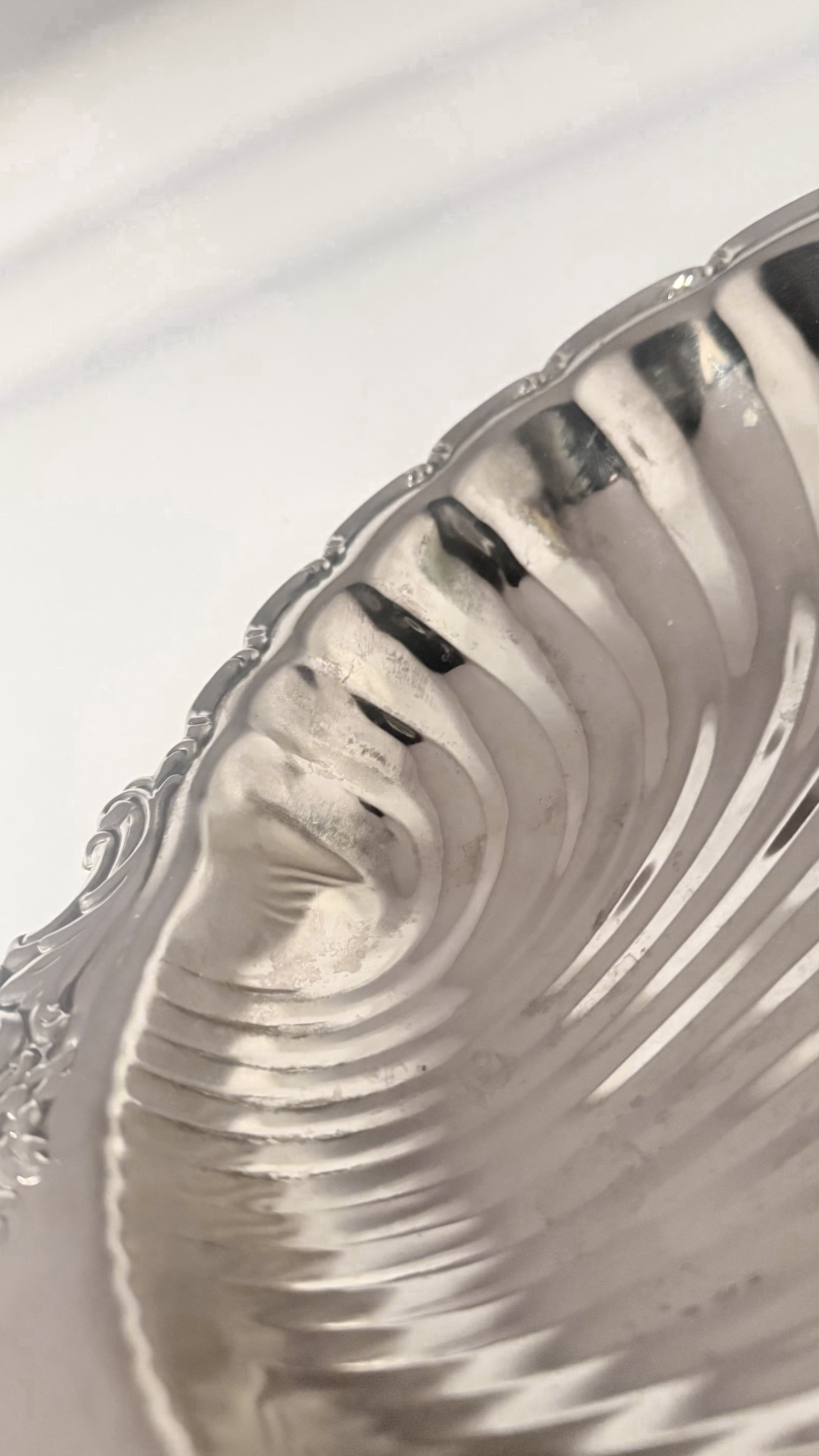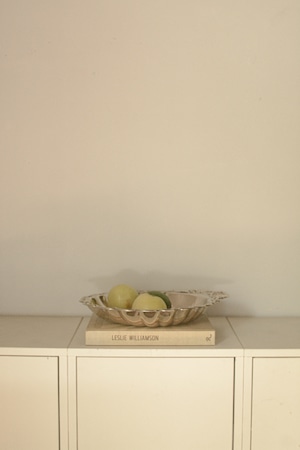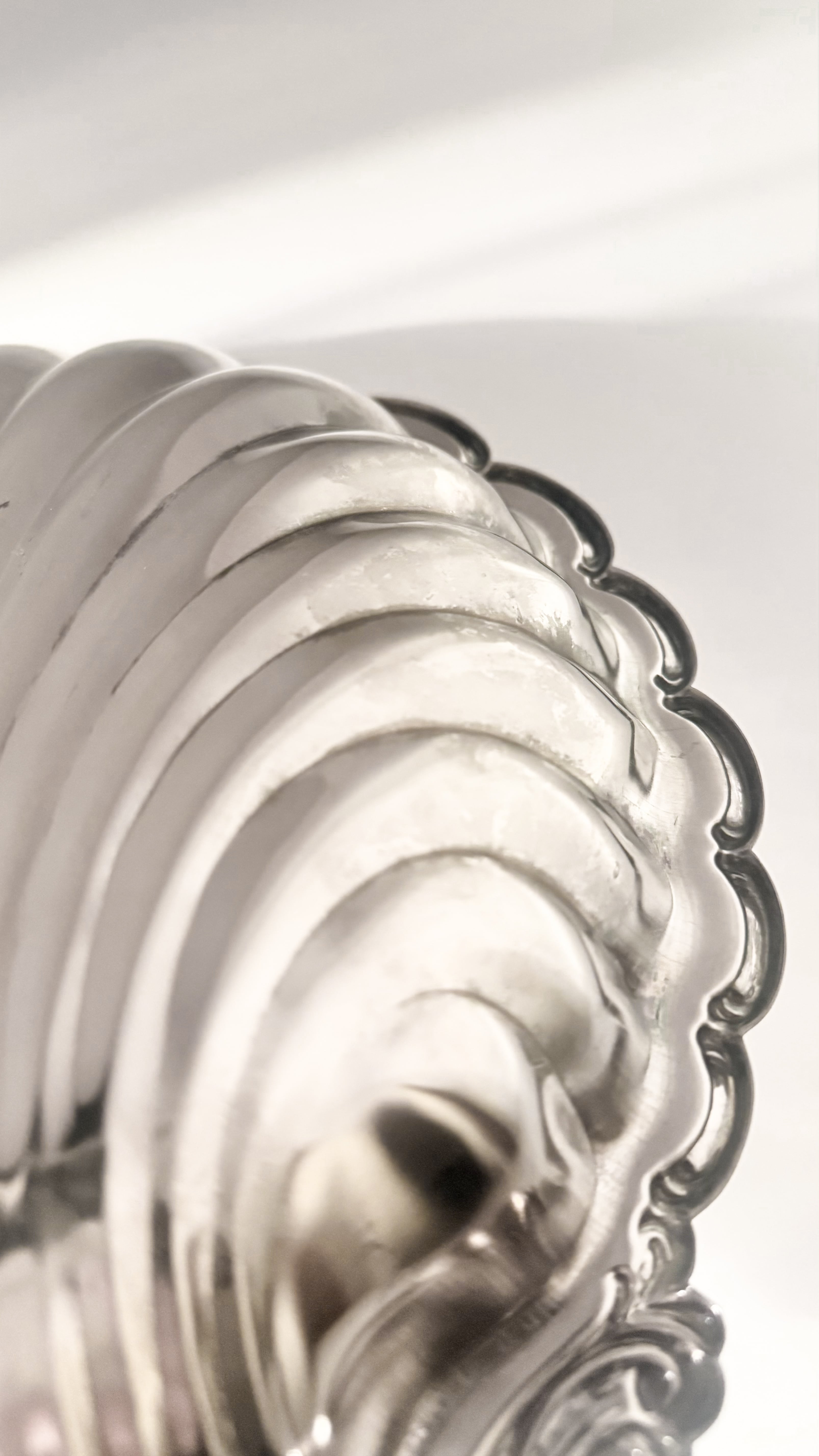 やさしく光を受ける、シルバープレートのサービングディッシュ。波のようなリブ模様と縁を囲む繊細な装飾が美しいお品です。果物をのせたり、テーブルのアクセントとしても存在感のあるアイテムです。小物入れとしても小物をまとめるのにさりげなく美しい景色へ変えてくれますね。 使用にともなうわずかな擦れや風合いも、長く大切にされてきた時間の跡としてお楽しみください。