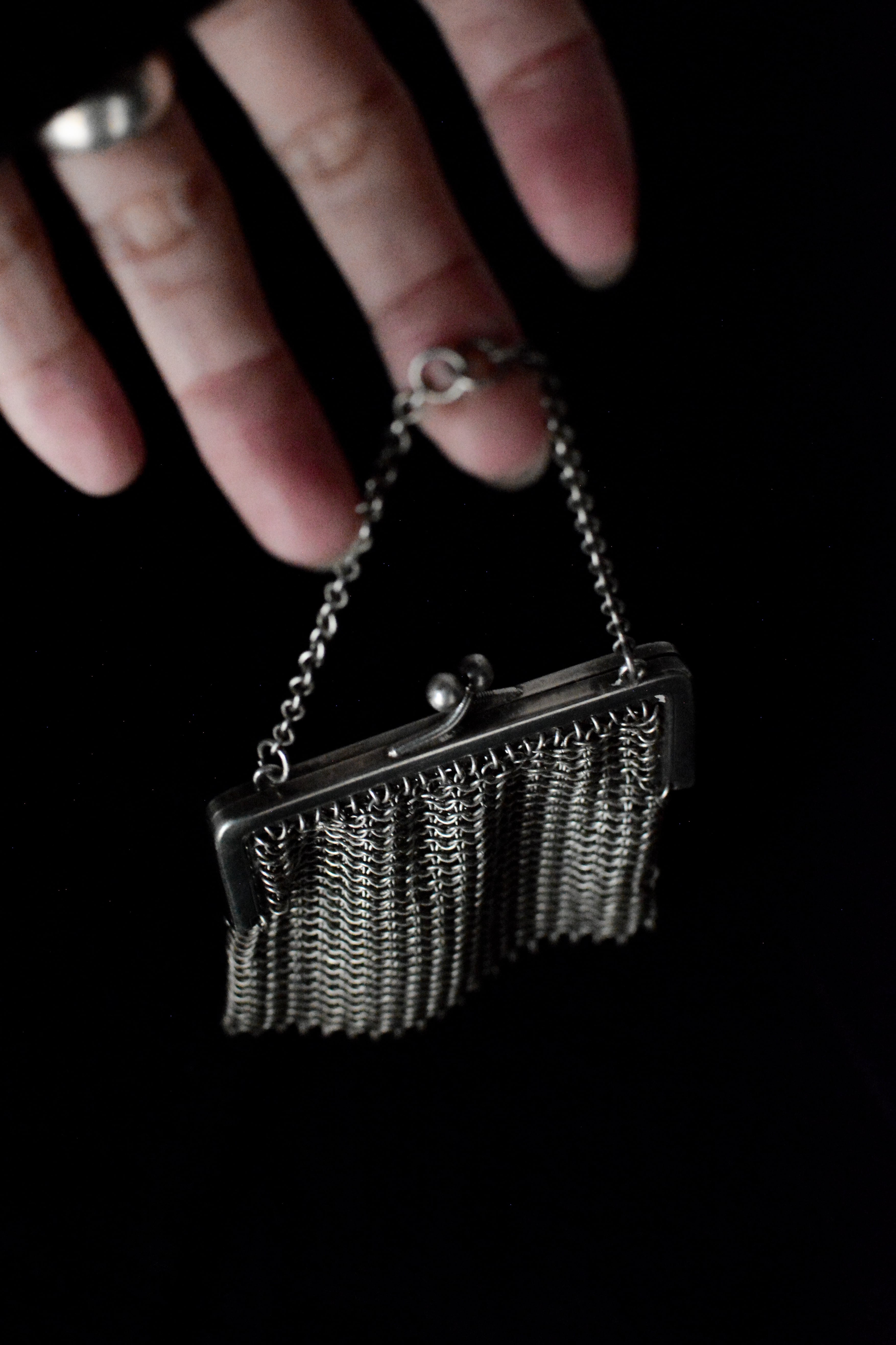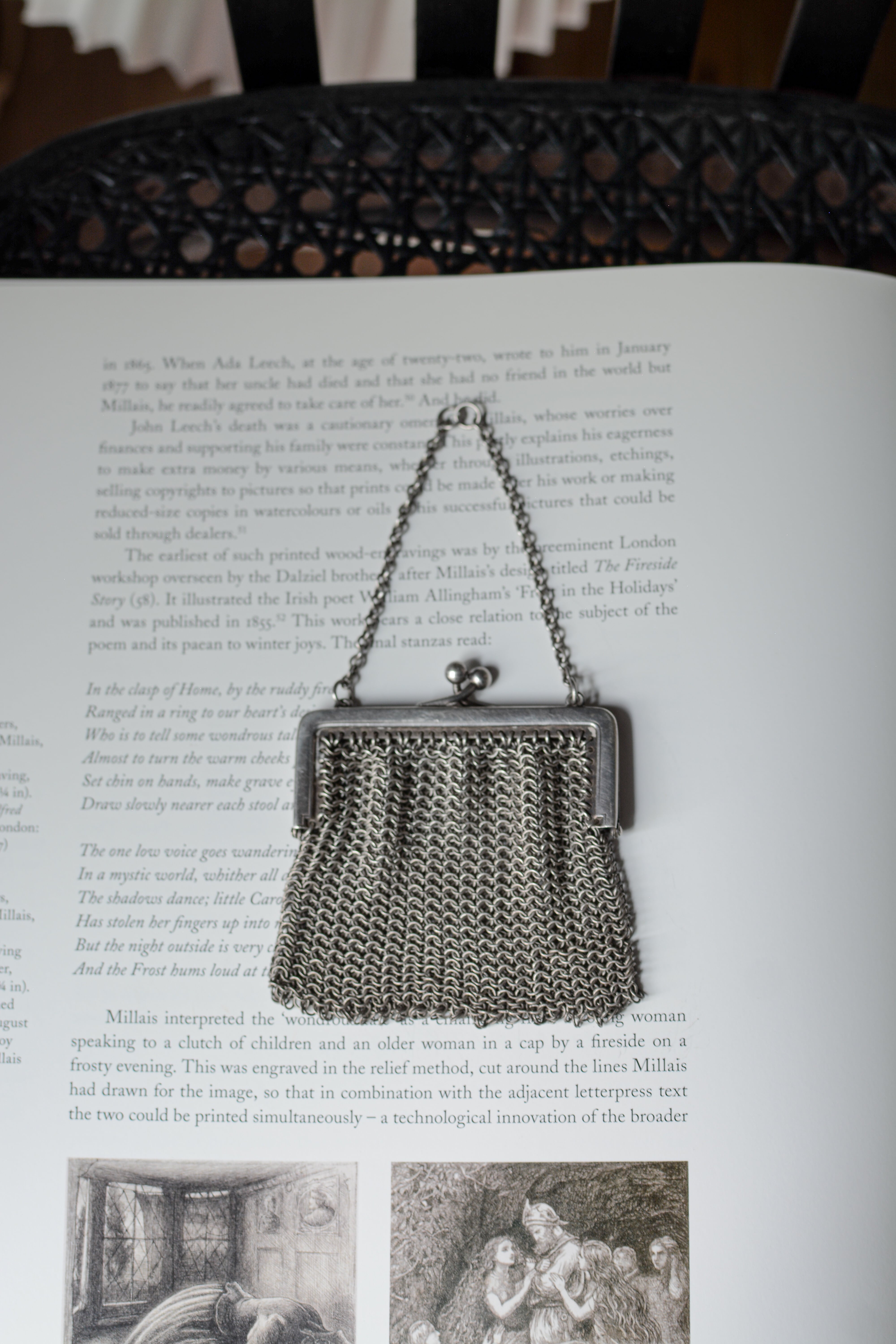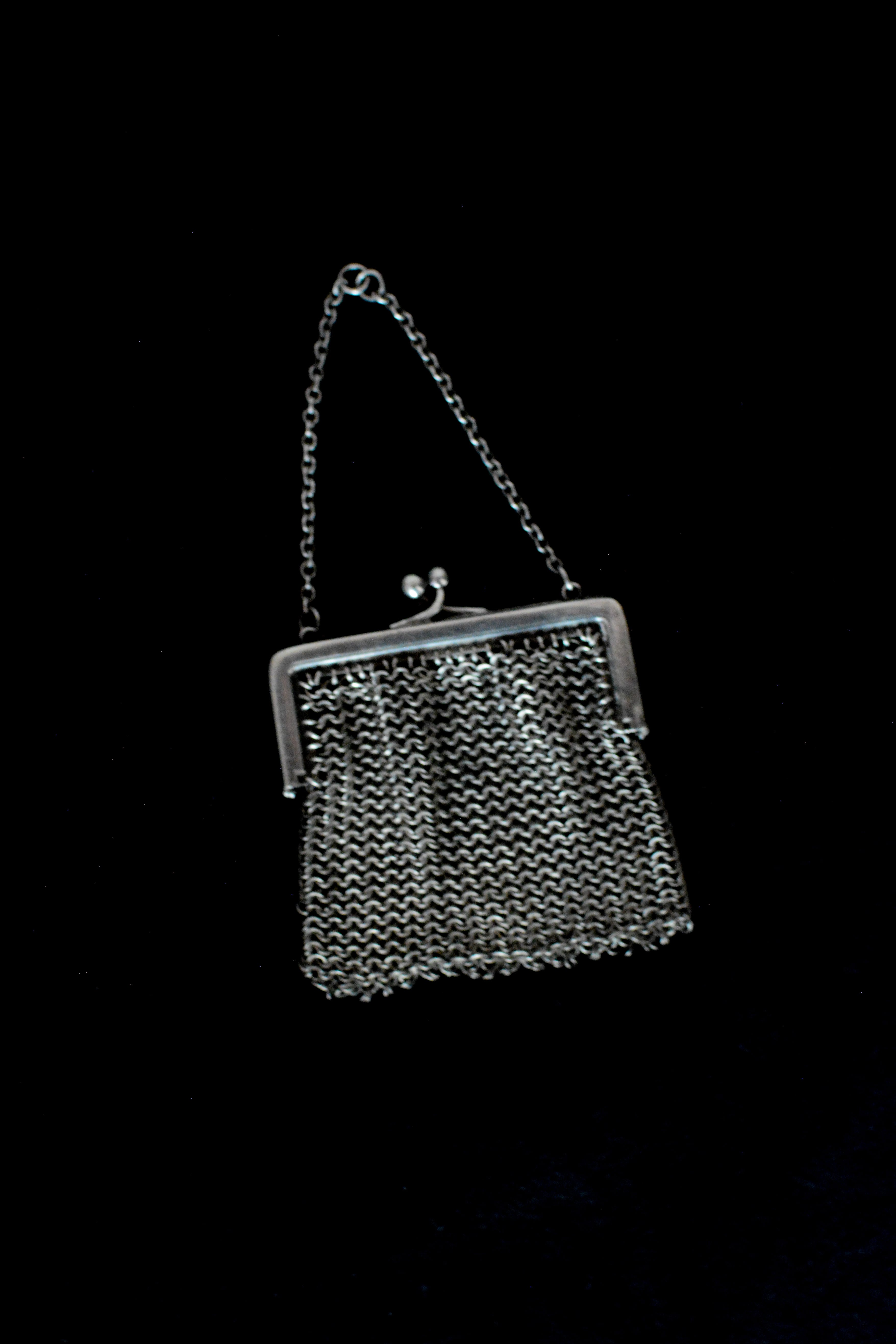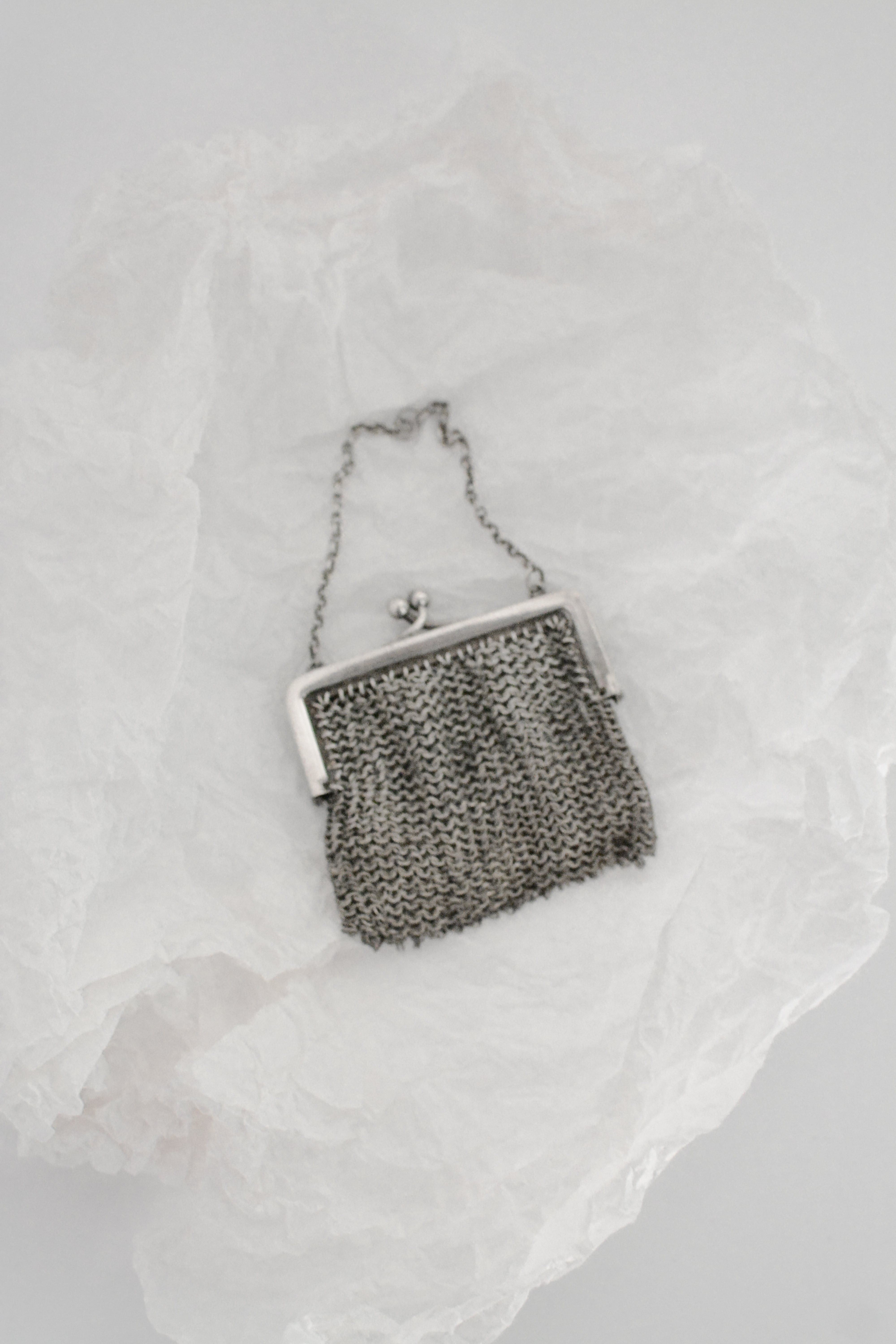 繊細な銀の糸を編むようにしてつくられた、1920年代頃の小さなイブニングパース。細やかなメッシュの編み目は、まるで金属のレースのよう。