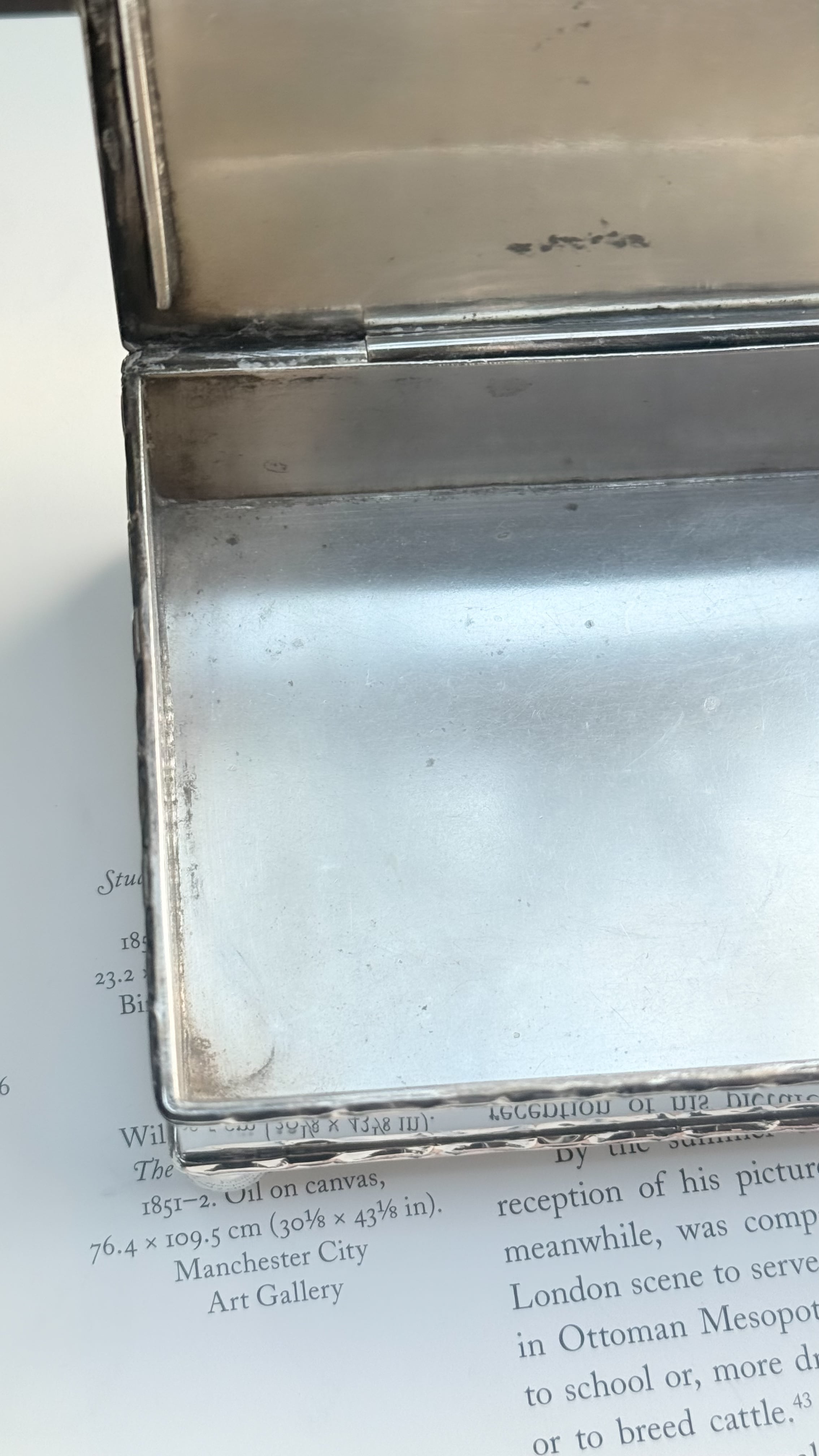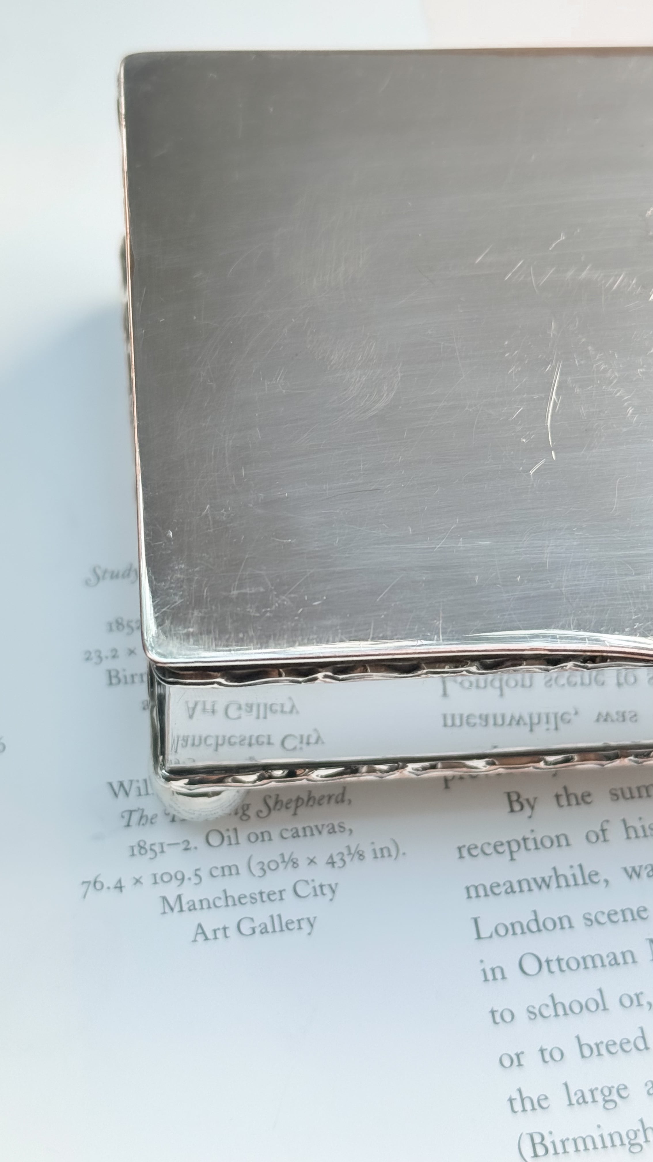 静かな佇まいの中に、ひっそりと時間を閉じ込めたような小さなボックス。1910年代頃イギリスで作られた、シルバープレートのアンティークケースです。四隅にはころんと丸いボールフット。この脚のデザインが印象的でとても可愛いです。