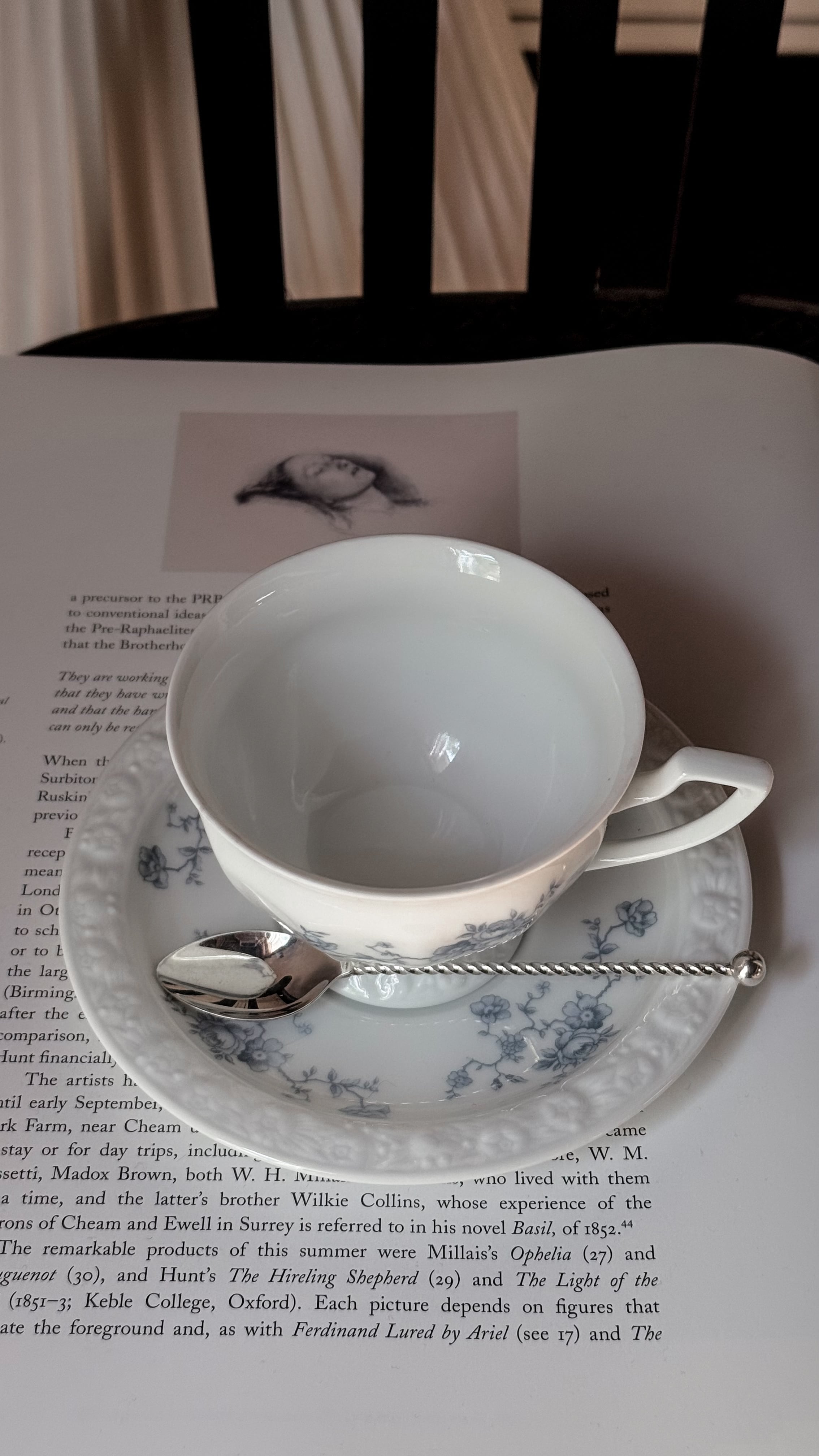 ブルーのお花が清らかな印象の白磁のティーカップ&ソーサー。ドイツの名窯 RosenthalのMariaシリーズ、クラシカルな多角形フォルムと、繊細な装飾を併せ持つデザイン。このシリーズ象徴するのは、縁をぐるりと囲むザクロのレリーフ。豊穣の象徴でもあるザクロが、控えめでありながら凛とした存在感で、器全体にやさしい陰影を添えています。汚れ等はほとんど無く綺麗な状態です。複数在庫ございますのでセレクトしてのお届けとなります。