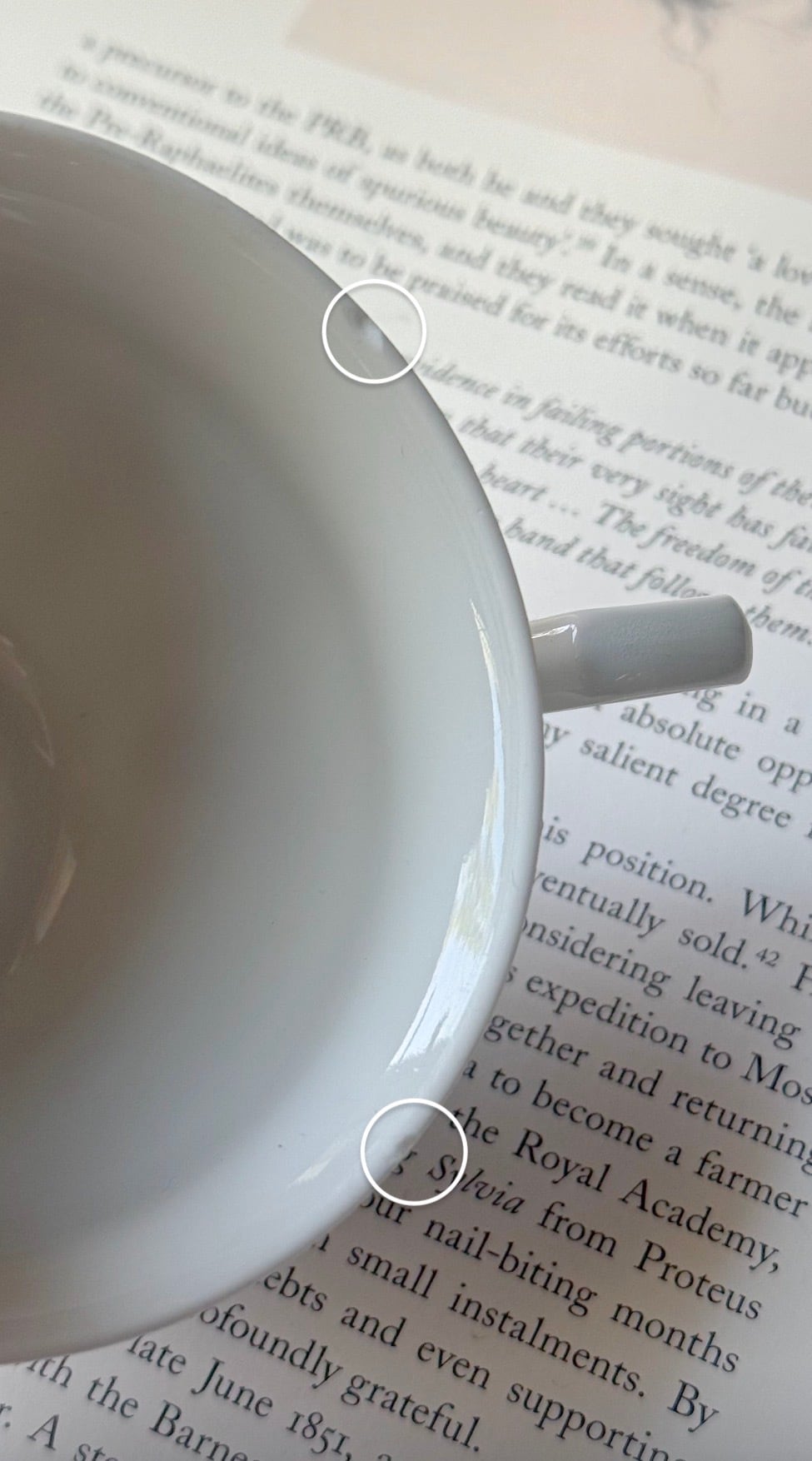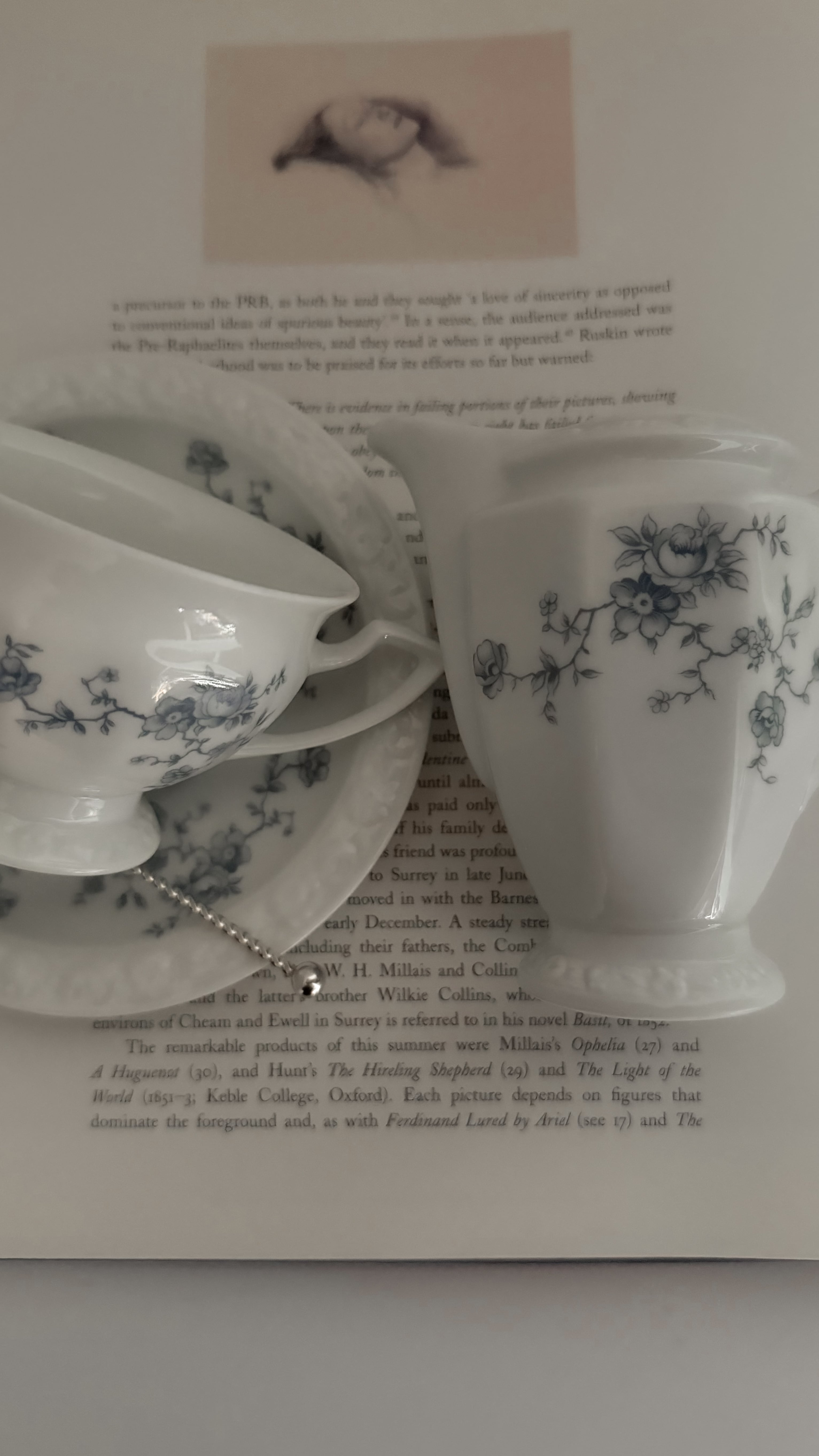 ブルーのお花が清らかな印象の白磁のティーカップ&ソーサー。ドイツの名窯 RosenthalのMariaシリーズ、クラシカルな多角形フォルムと、繊細な装飾を併せ持つデザイン。このシリーズ象徴するのは、縁をぐるりと囲むザクロのレリーフ。豊穣の象徴でもあるザクロが、控えめでありながら凛とした存在感で、器全体にやさしい陰影を添えています。口を付ける位置からは外れているのであまり問題はなさそうですが、こちらの個体はフチに小さなカケが見られます。誰かの元で過ごしてきた、その物語のひとかけらのような痕跡です。ヴィンテージの器が持つ静かな風合いと落ち着きを深めているようなポイントとして感じ、紡いできた時間をそのまま受け継いでいただける方へ。