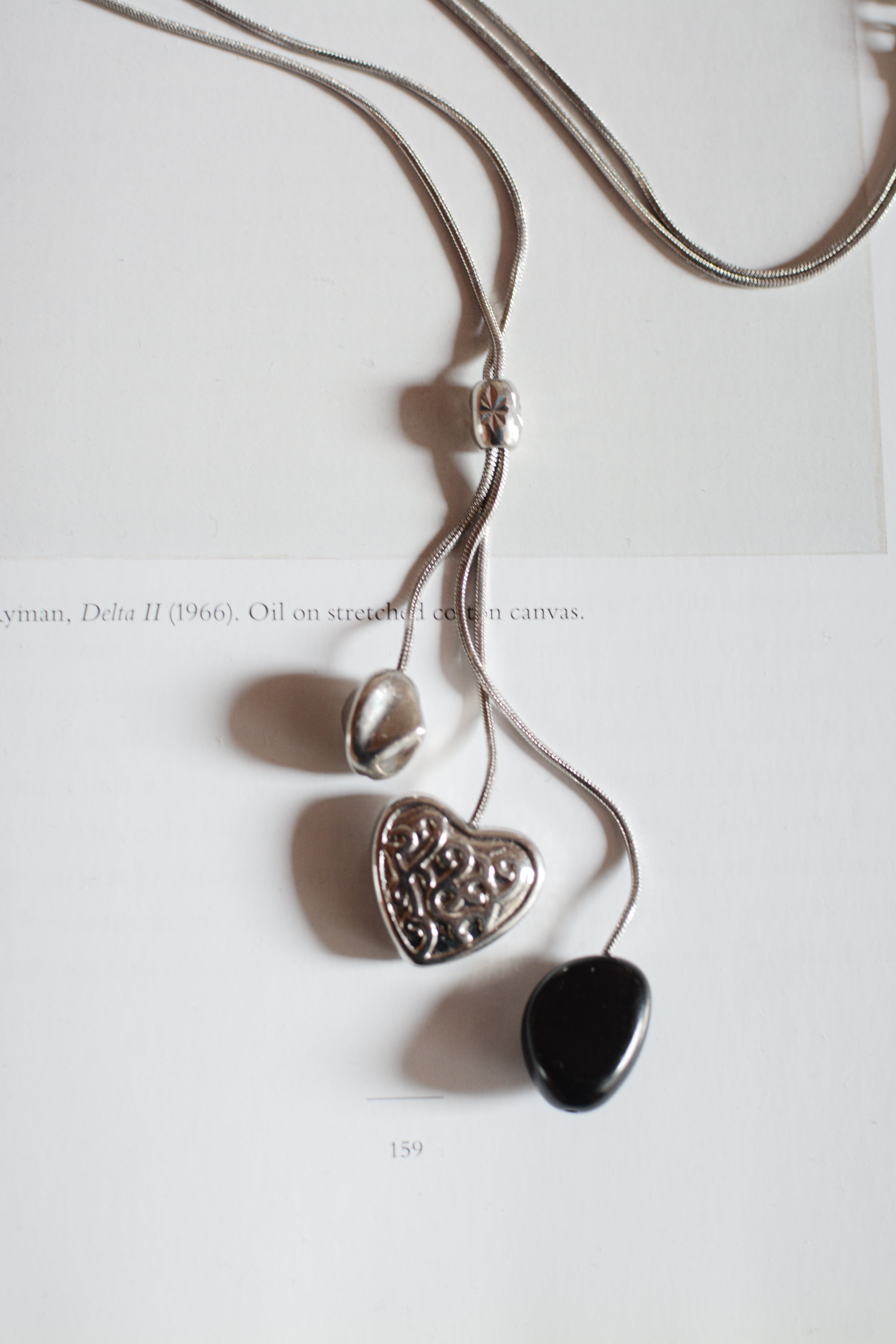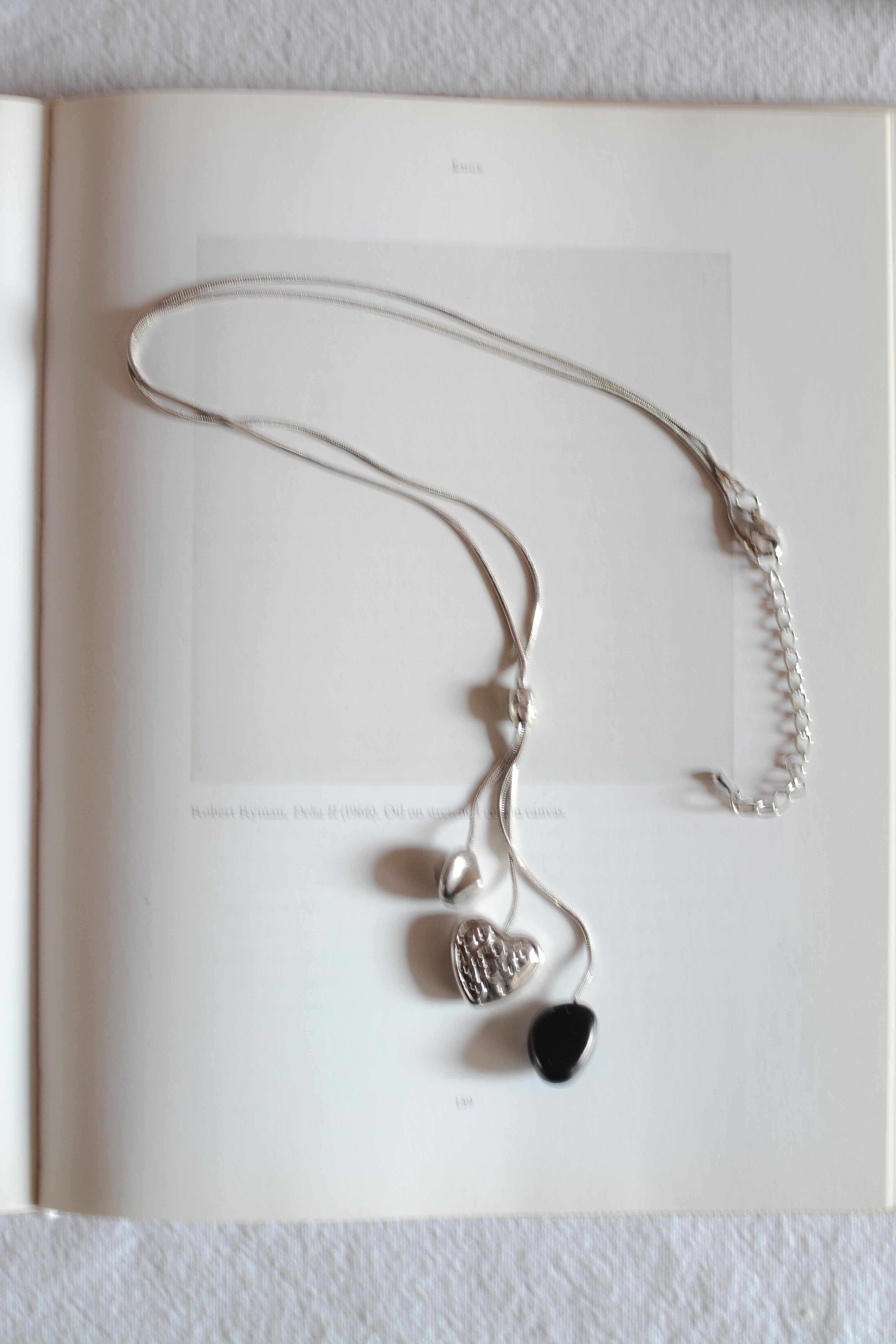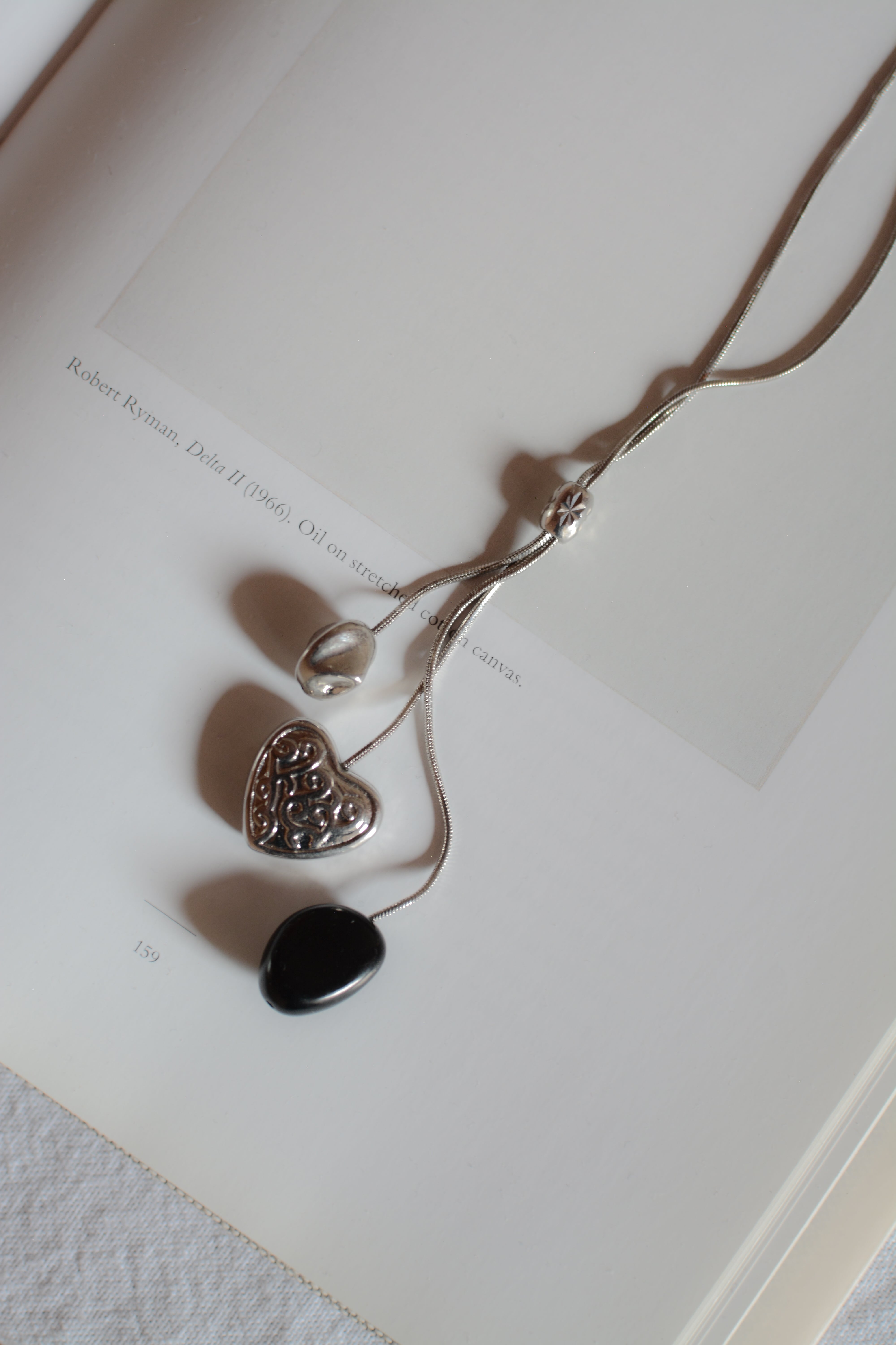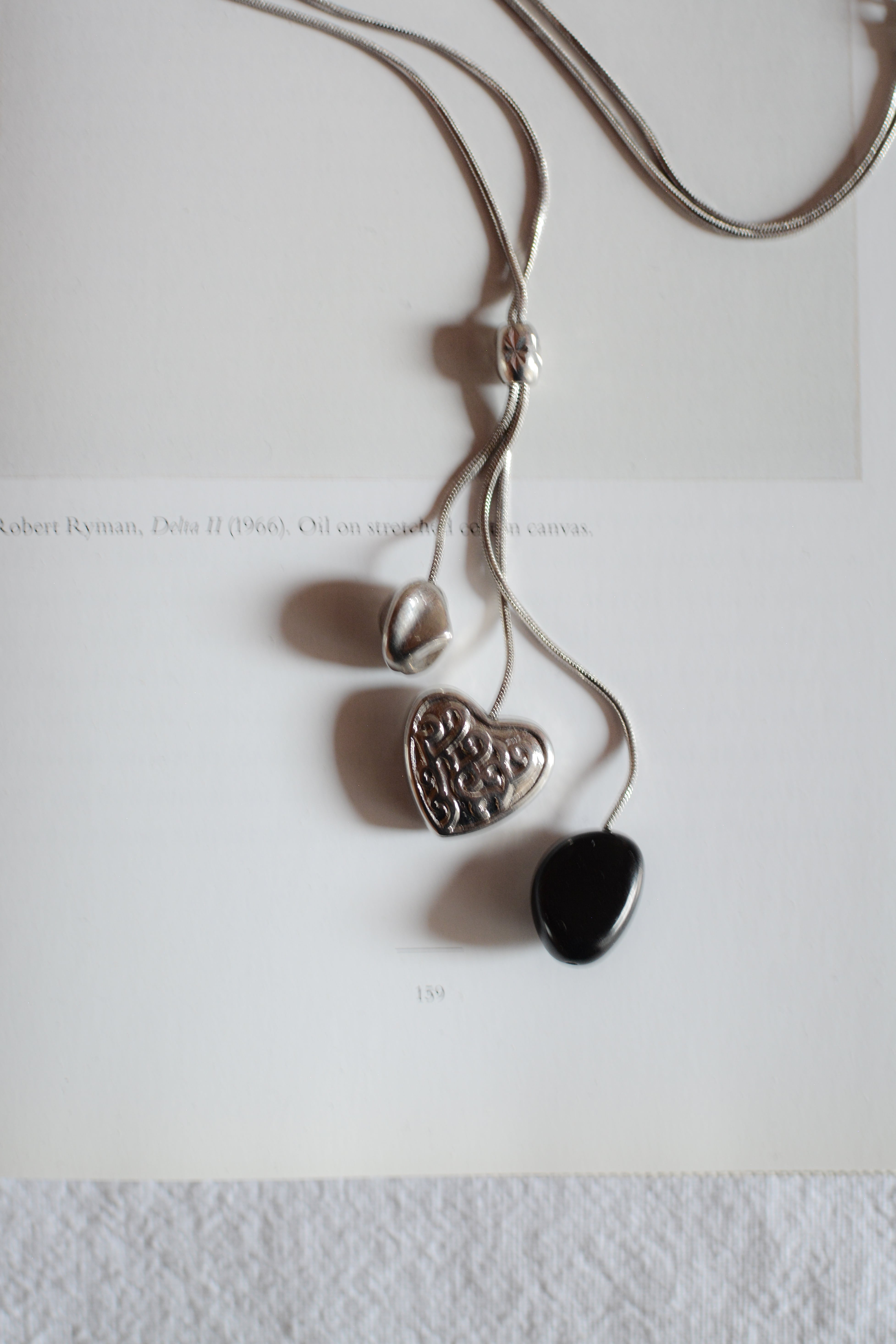 繊細なシルバートーンのラインに、小さなハート、ゆらぐメタルビーズ、深い黒のビーズが寄り添うネックレス。ハートには柔らかな曲線が刻まれ、ニュアンスのあるデザイン。チェーンに揺れるパーツが胸元にさりげない立体感をつくり、シンプルな装いにもひとつ余白を与えてくれます。