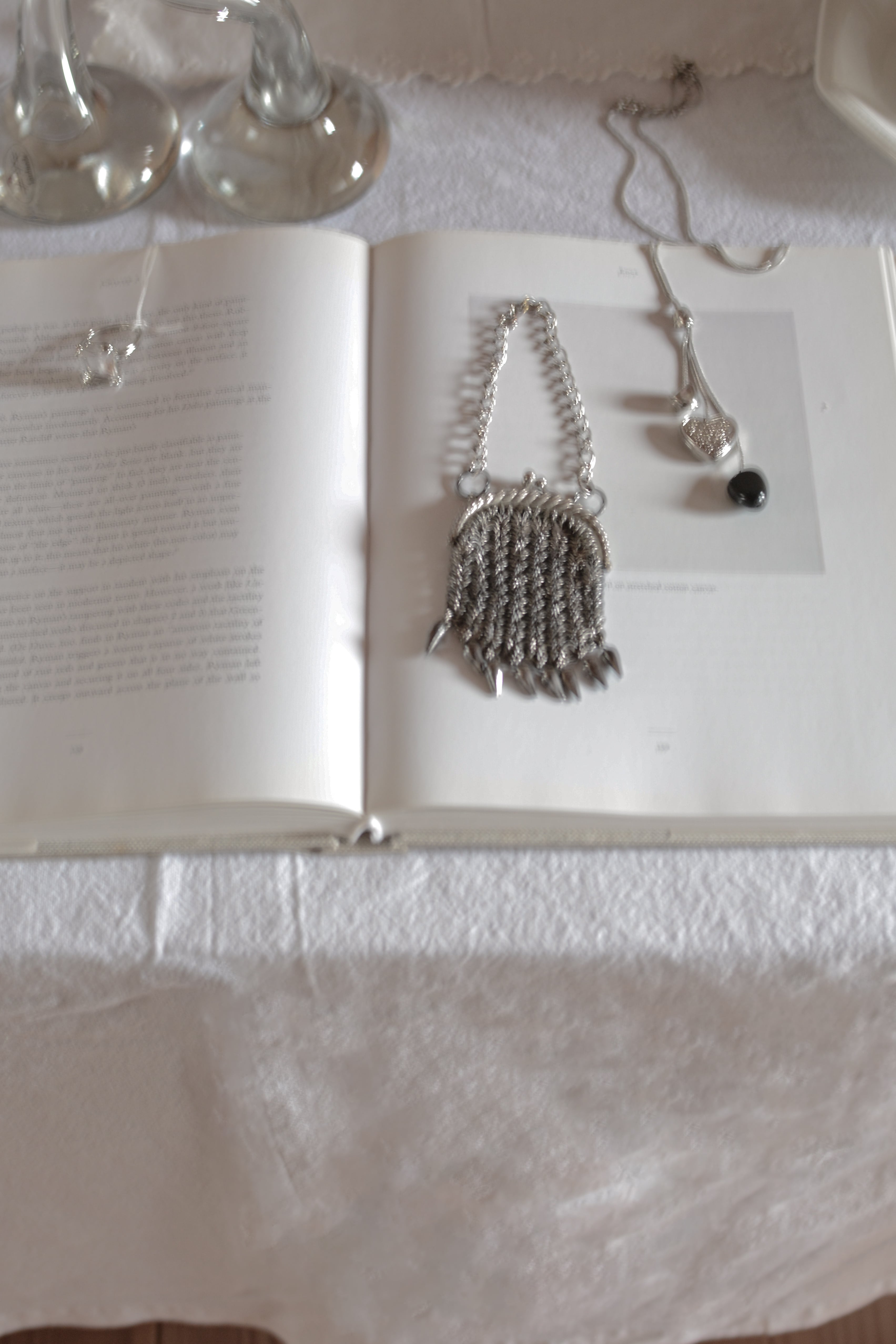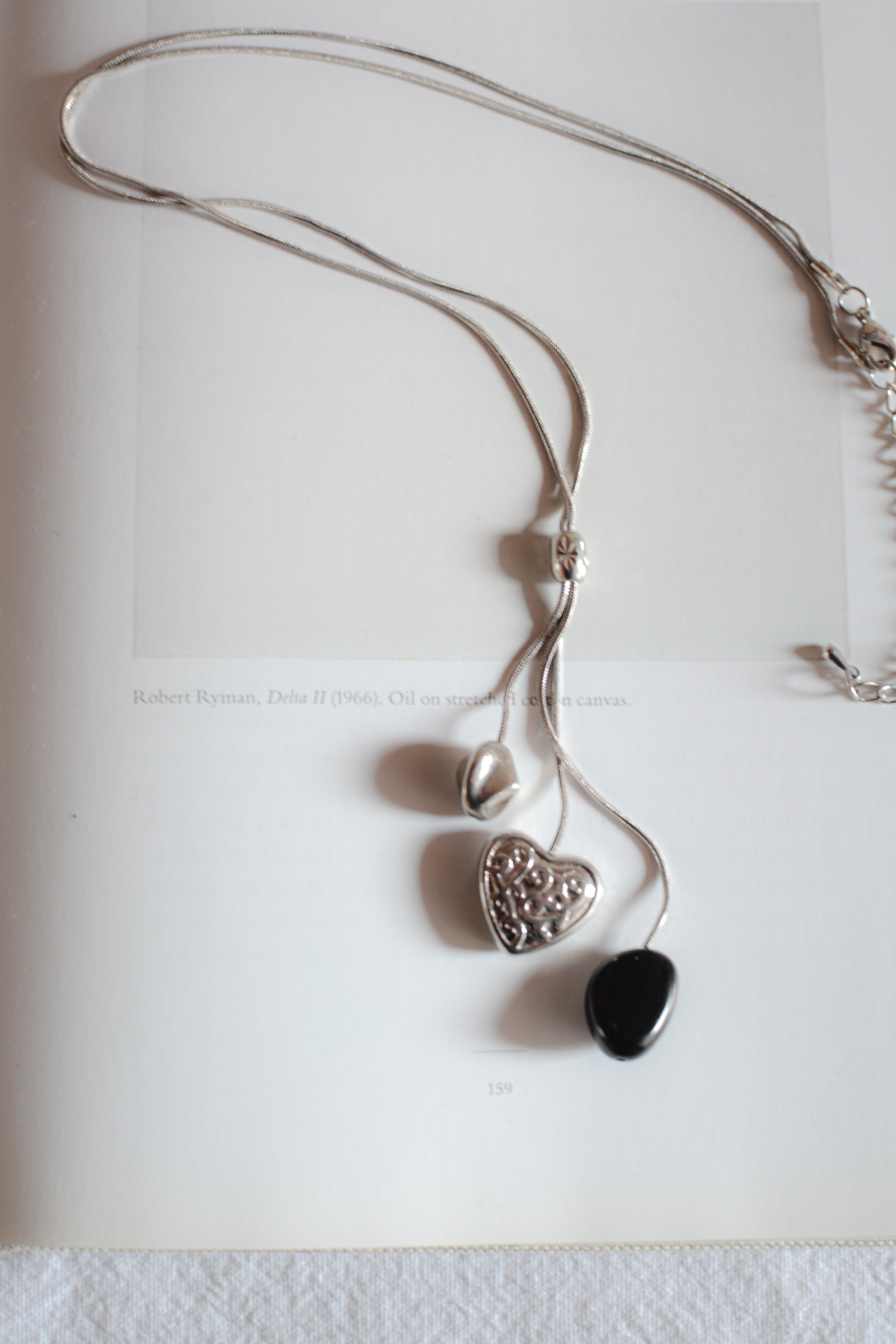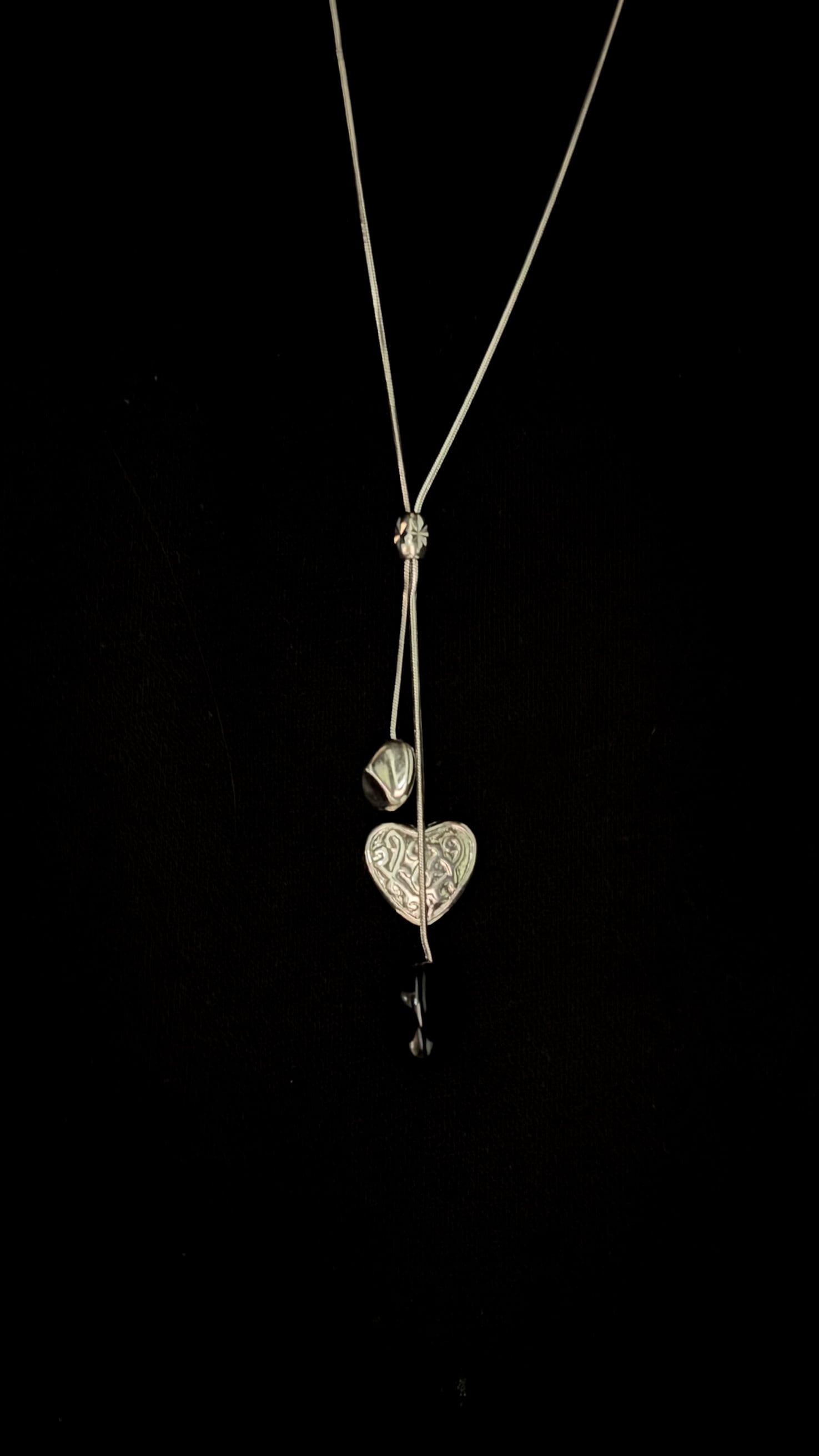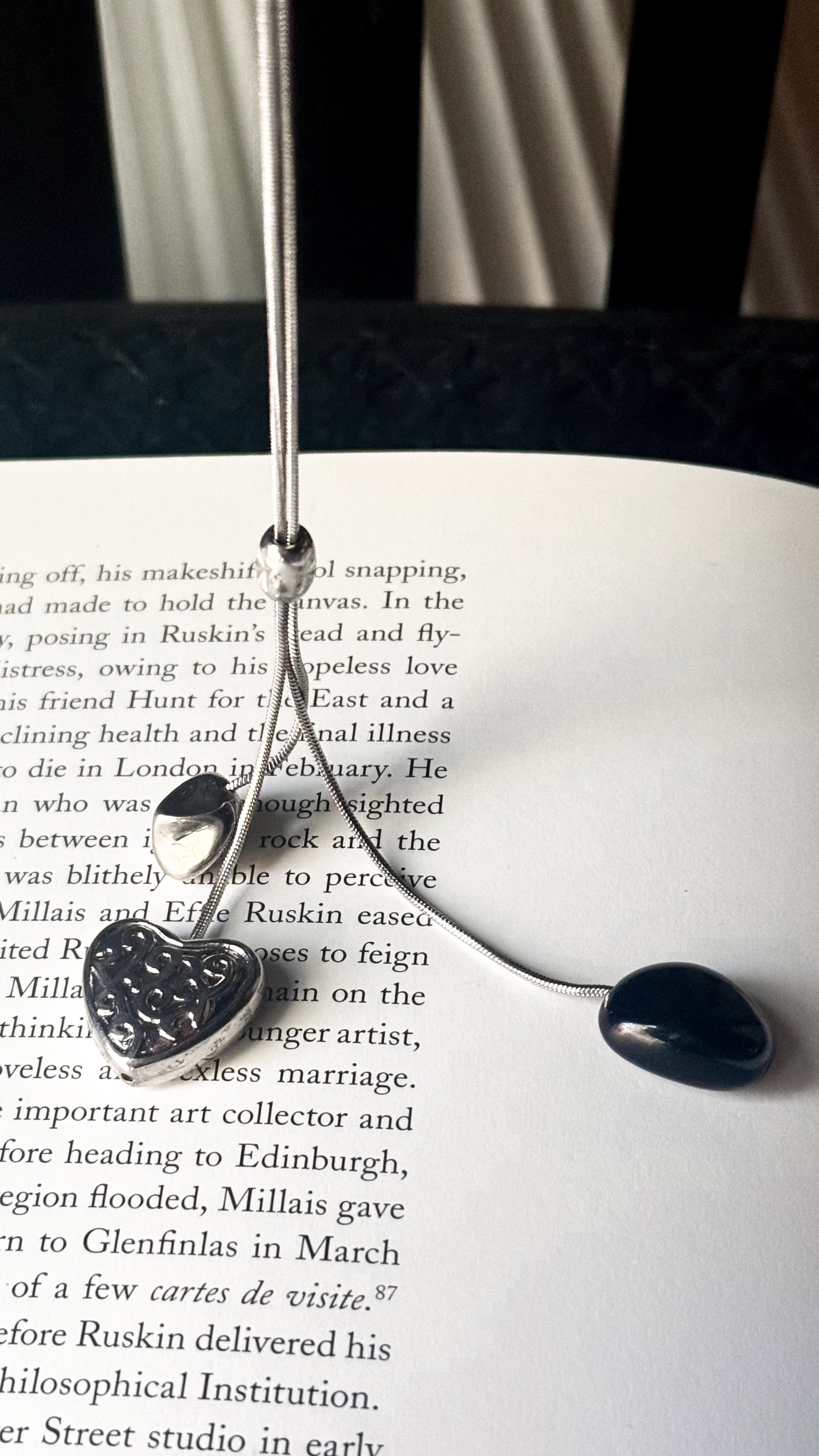 繊細なシルバートーンのラインに、小さなハート、ゆらぐメタルビーズ、深い黒のビーズが寄り添うネックレス。ハートには柔らかな曲線が刻まれ、ニュアンスのあるデザイン。チェーンに揺れるパーツが胸元にさりげない立体感をつくり、シンプルな装いにもひとつ余白を与えてくれます。
