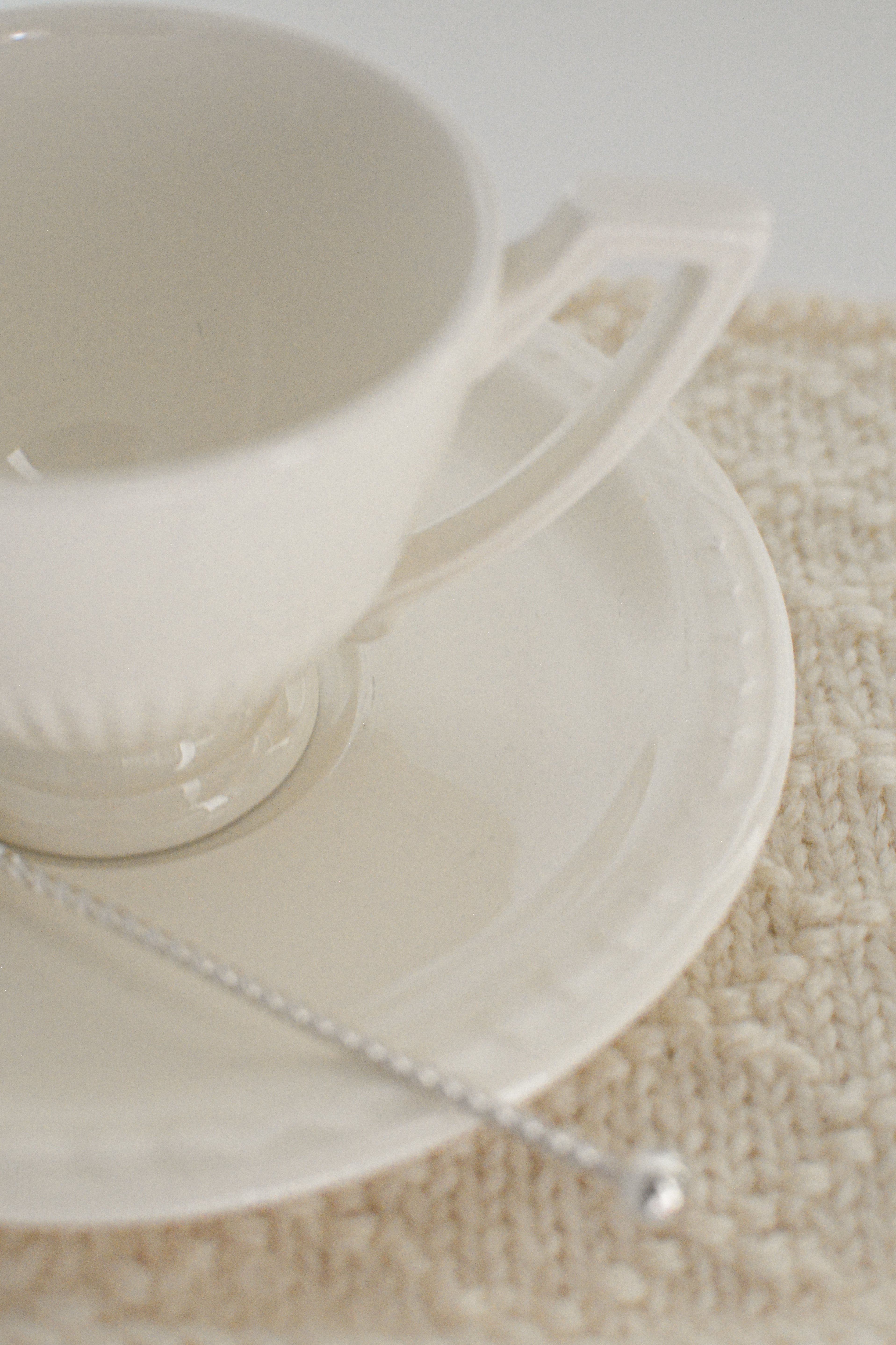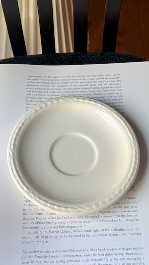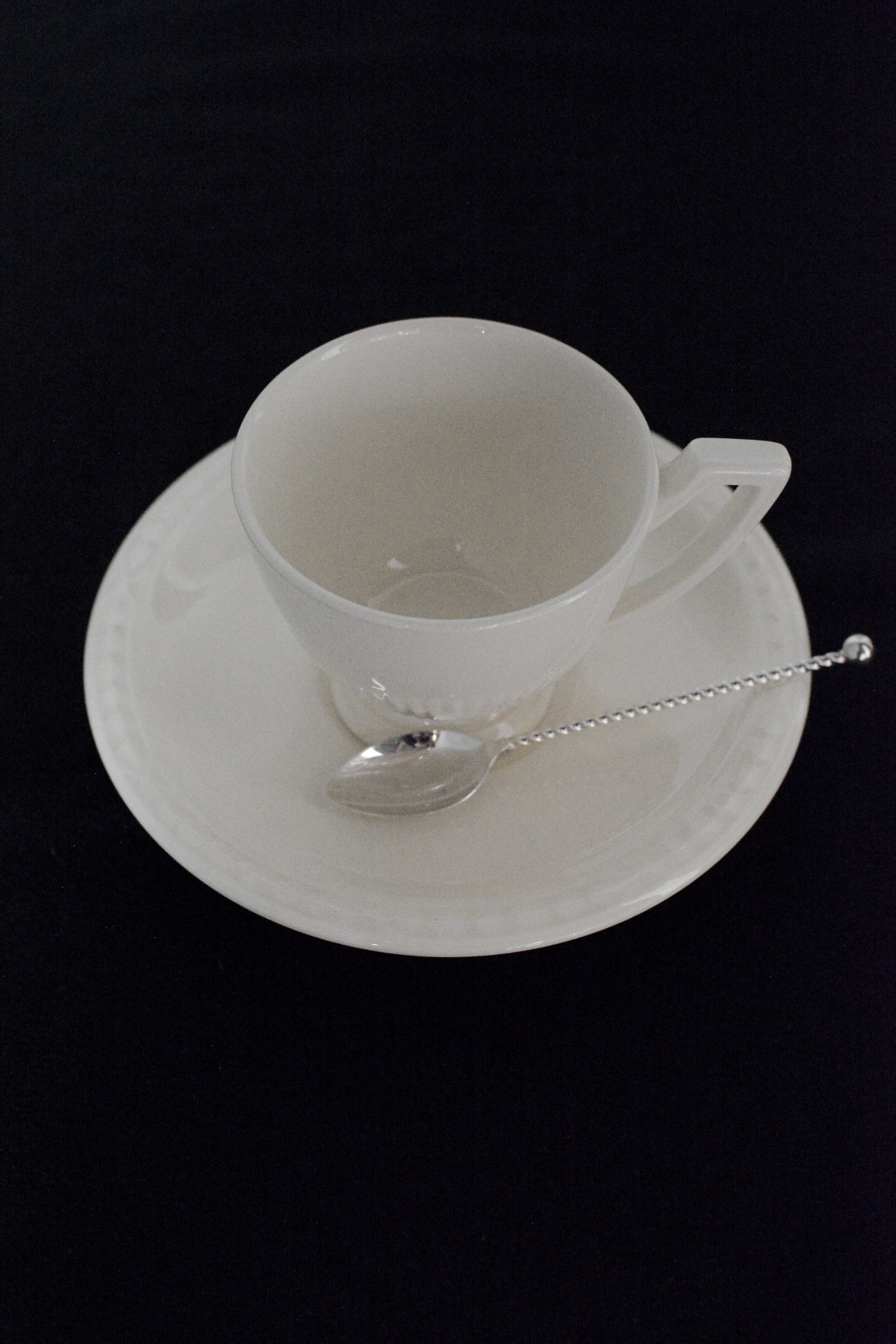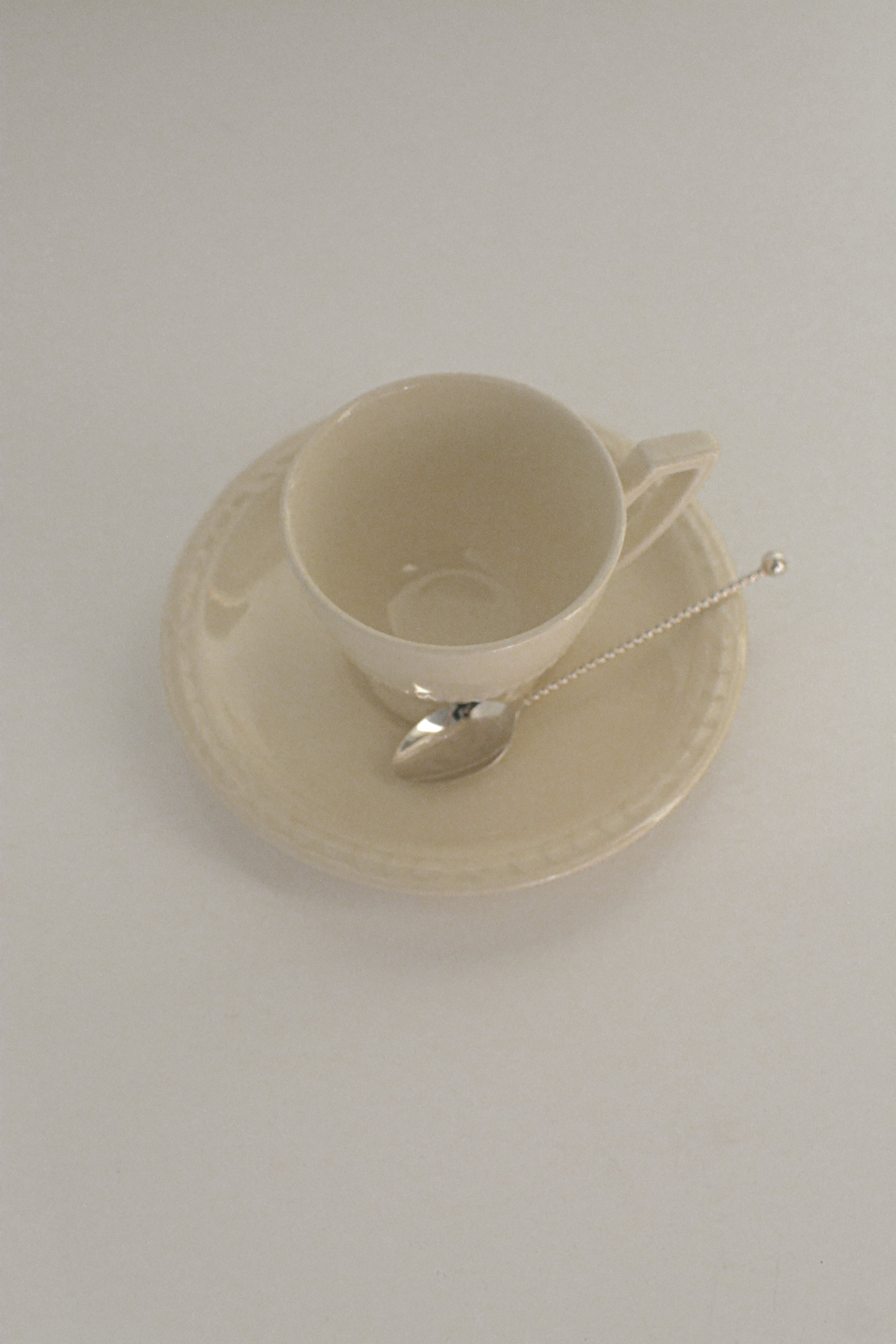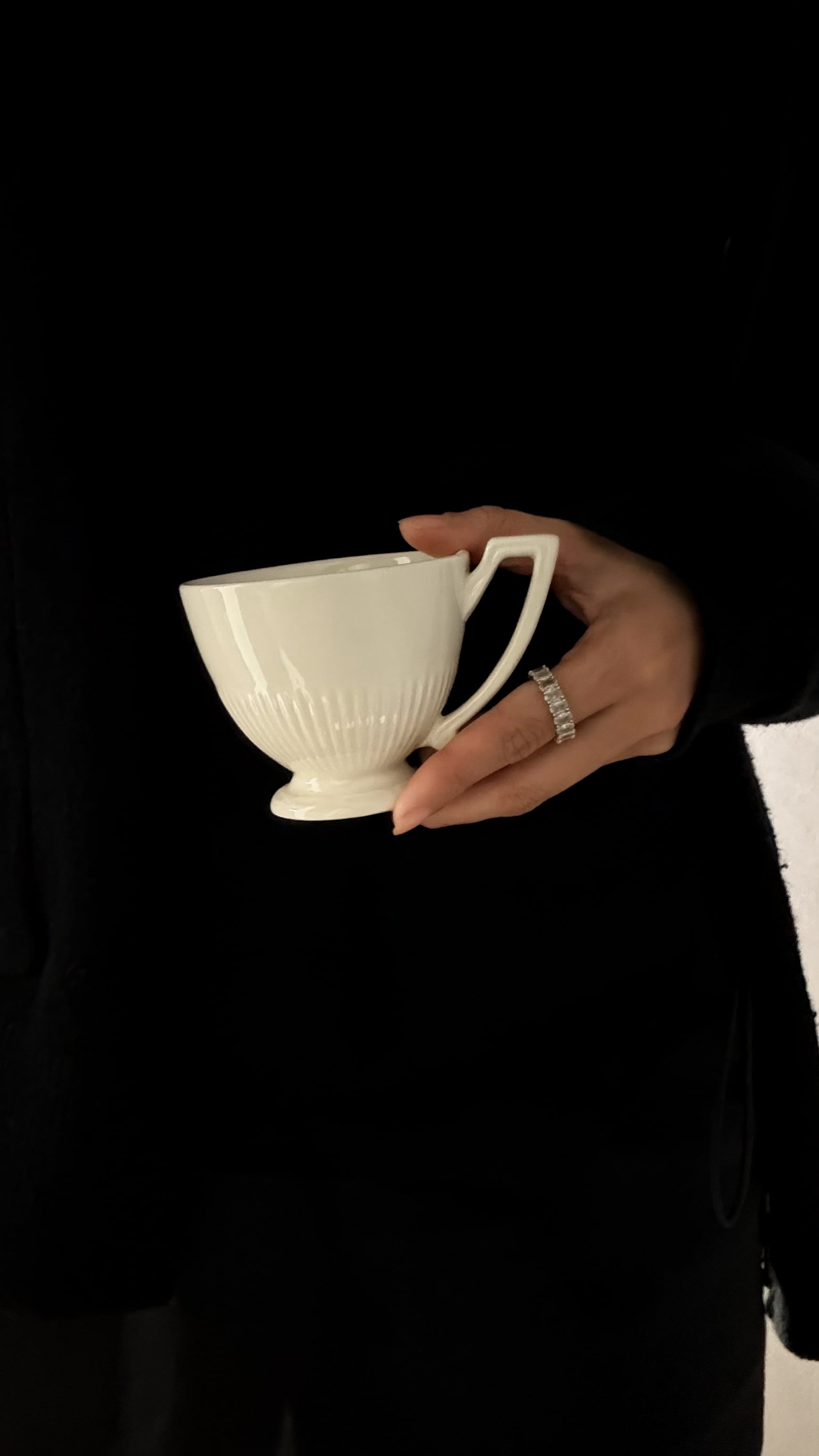 柔らかなアイボリーカラー、端正なラインが美しいヴィンテージのカップ&ソーサー。持ち手のクラシカルなデザインもとても素敵です。小傷等ございますがヴィンテージとしては比較的綺麗な状態です。薄いカケがございますが底面ですので、ほとんど目立ちません(お写真12枚目)