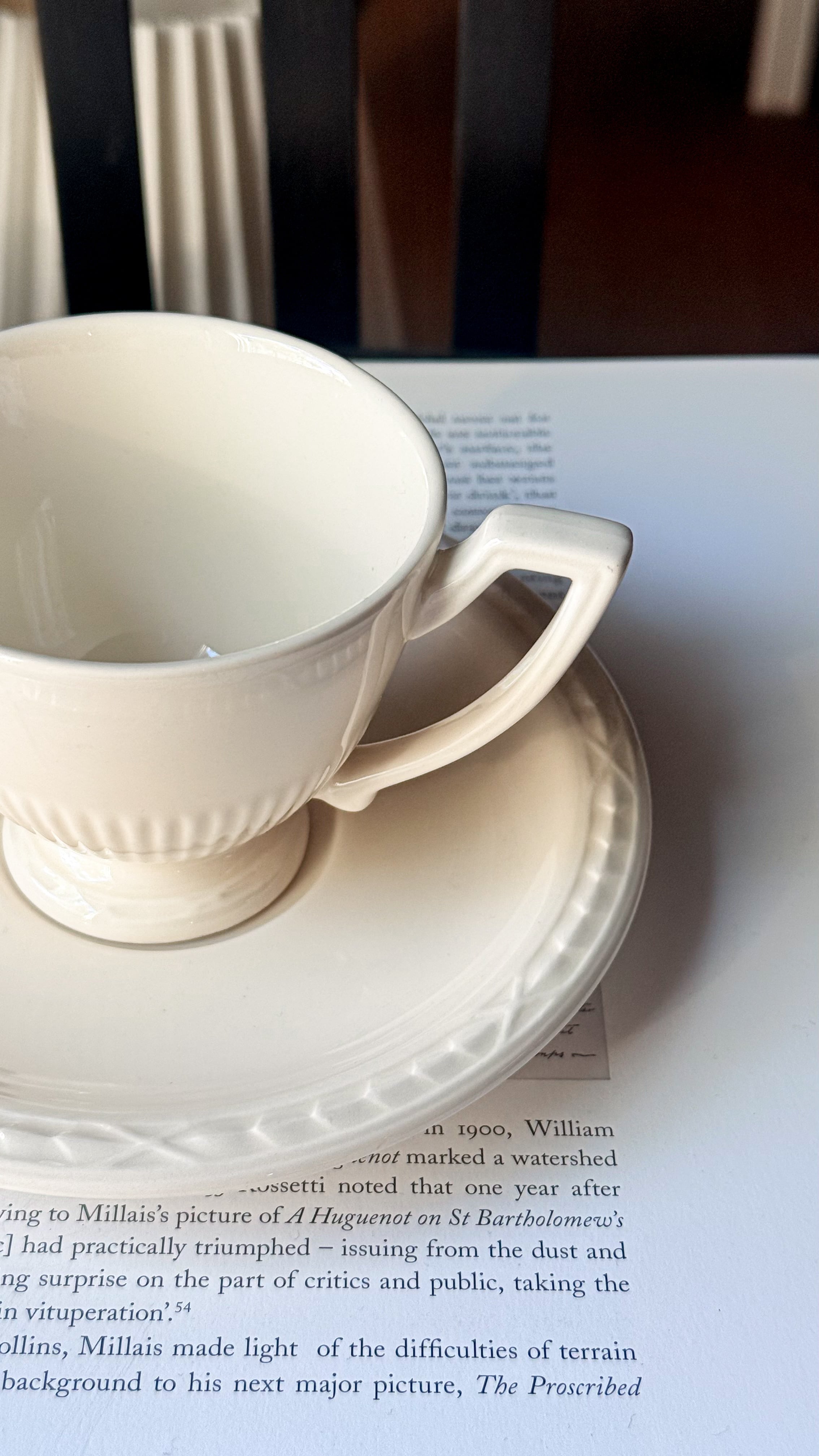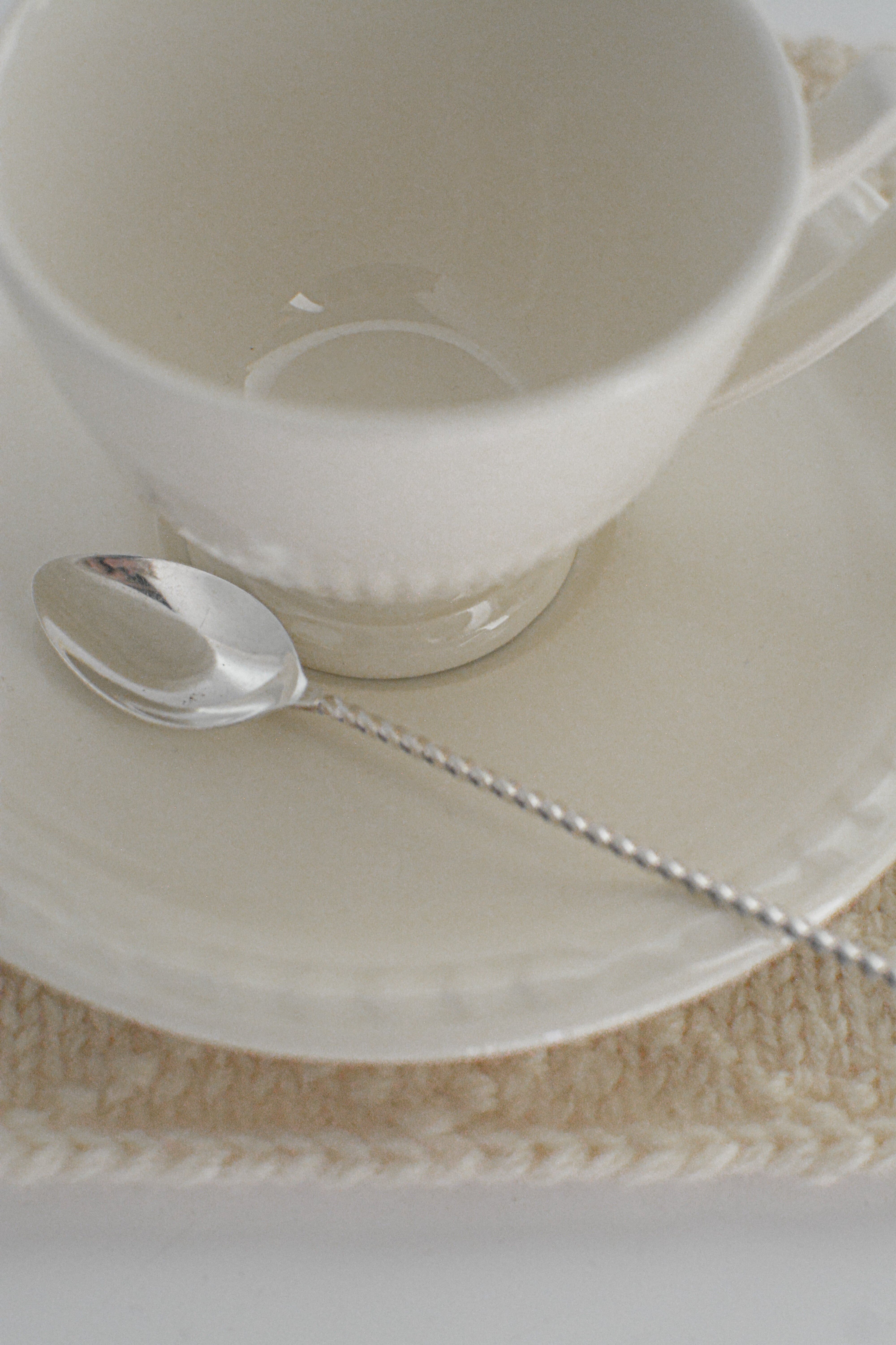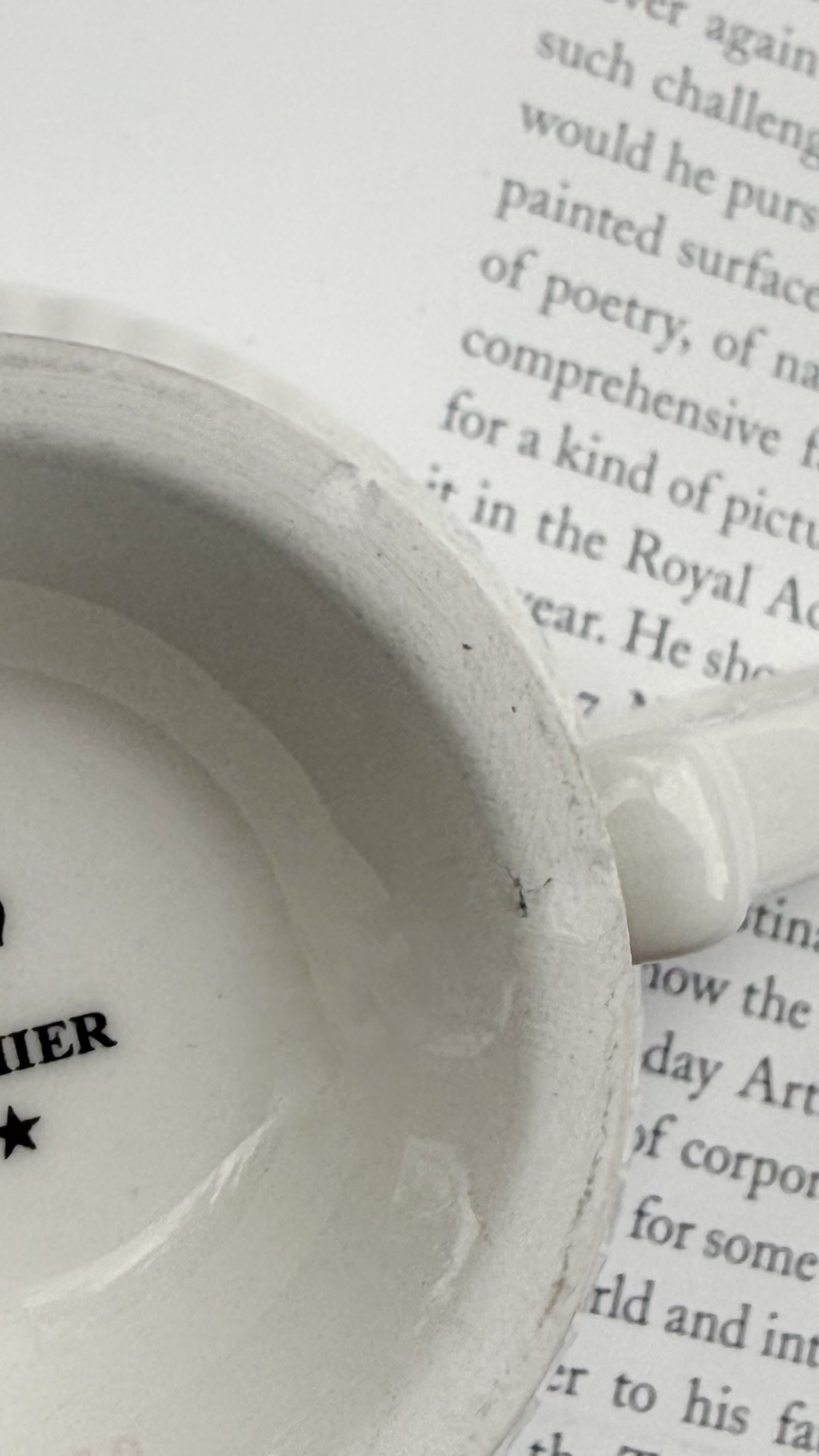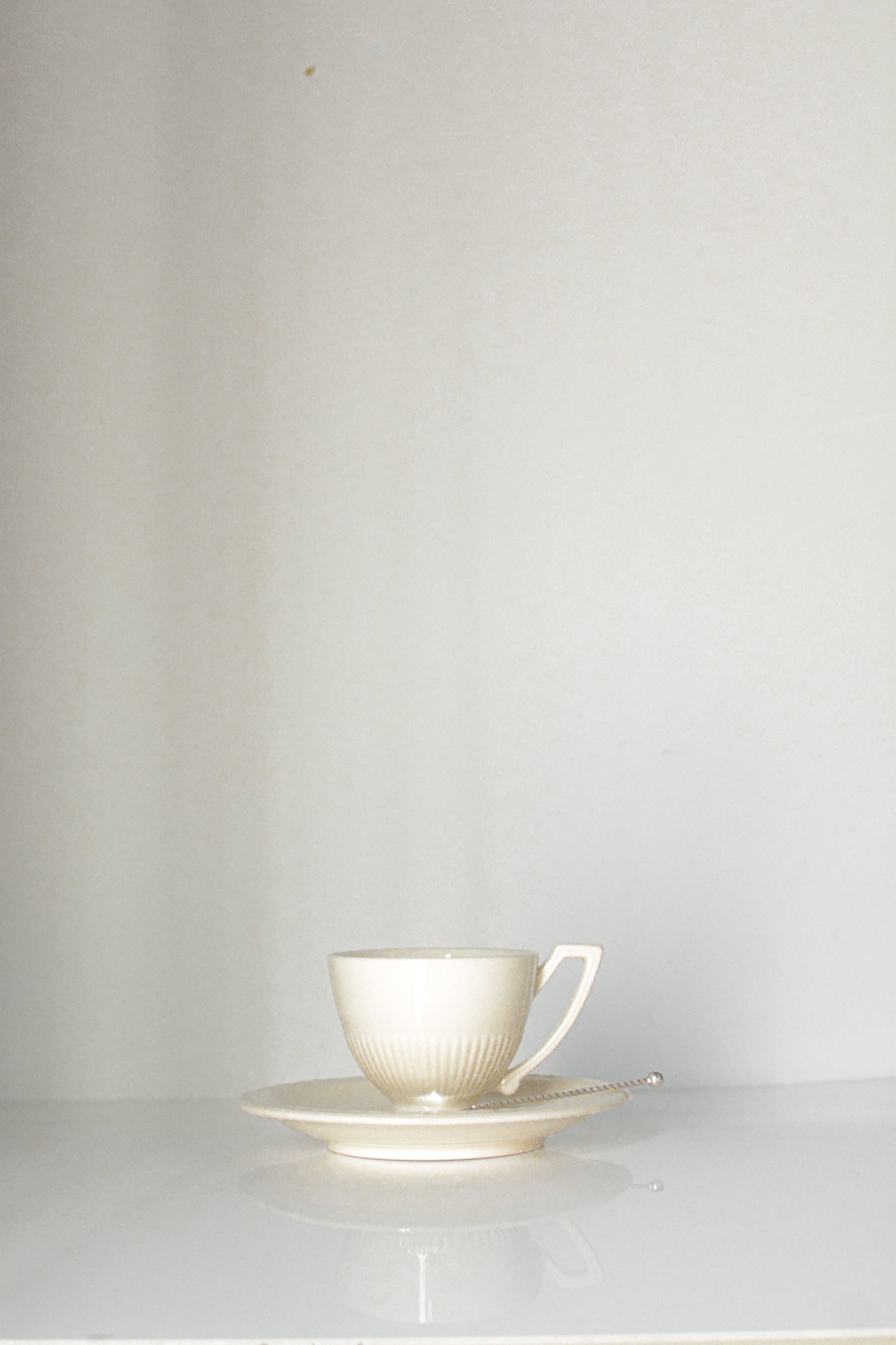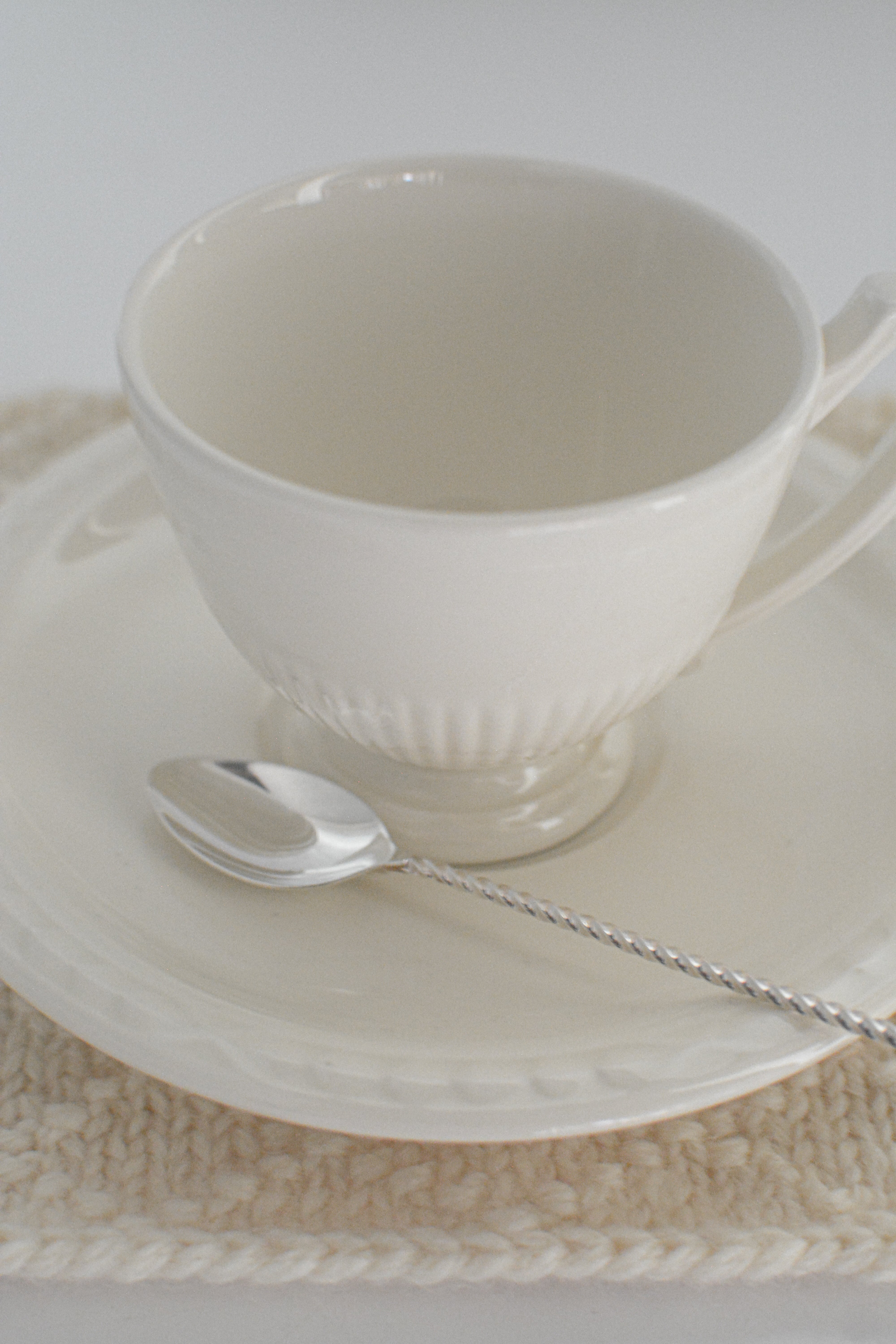 柔らかなアイボリーカラー、端正なラインが美しいヴィンテージのカップ&ソーサー。持ち手のクラシカルなデザインもとても素敵です。小傷等ございますがヴィンテージとしては比較的綺麗な状態です。薄いカケがございますが底面ですので、ほとんど目立ちません(お写真12枚目)