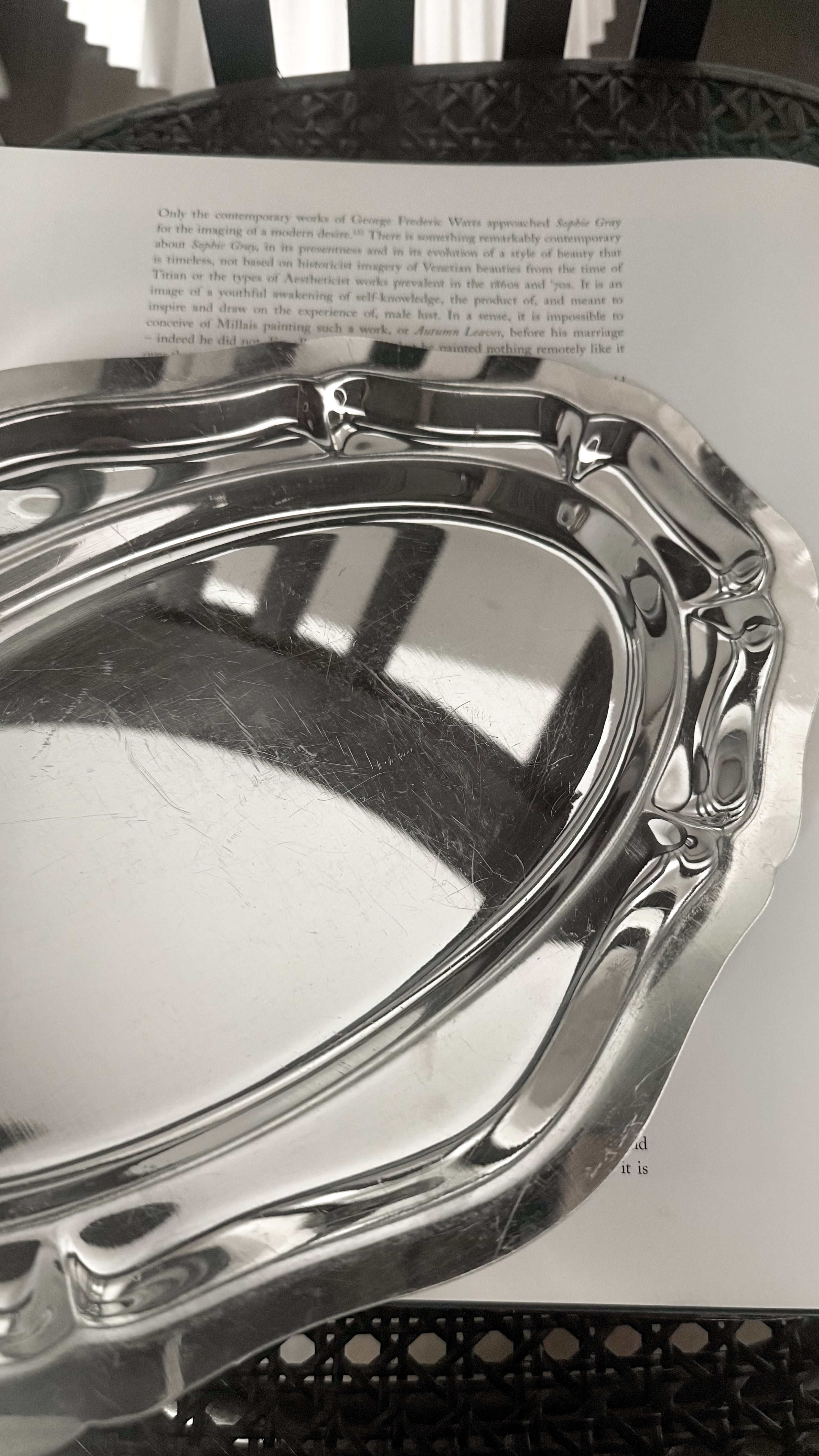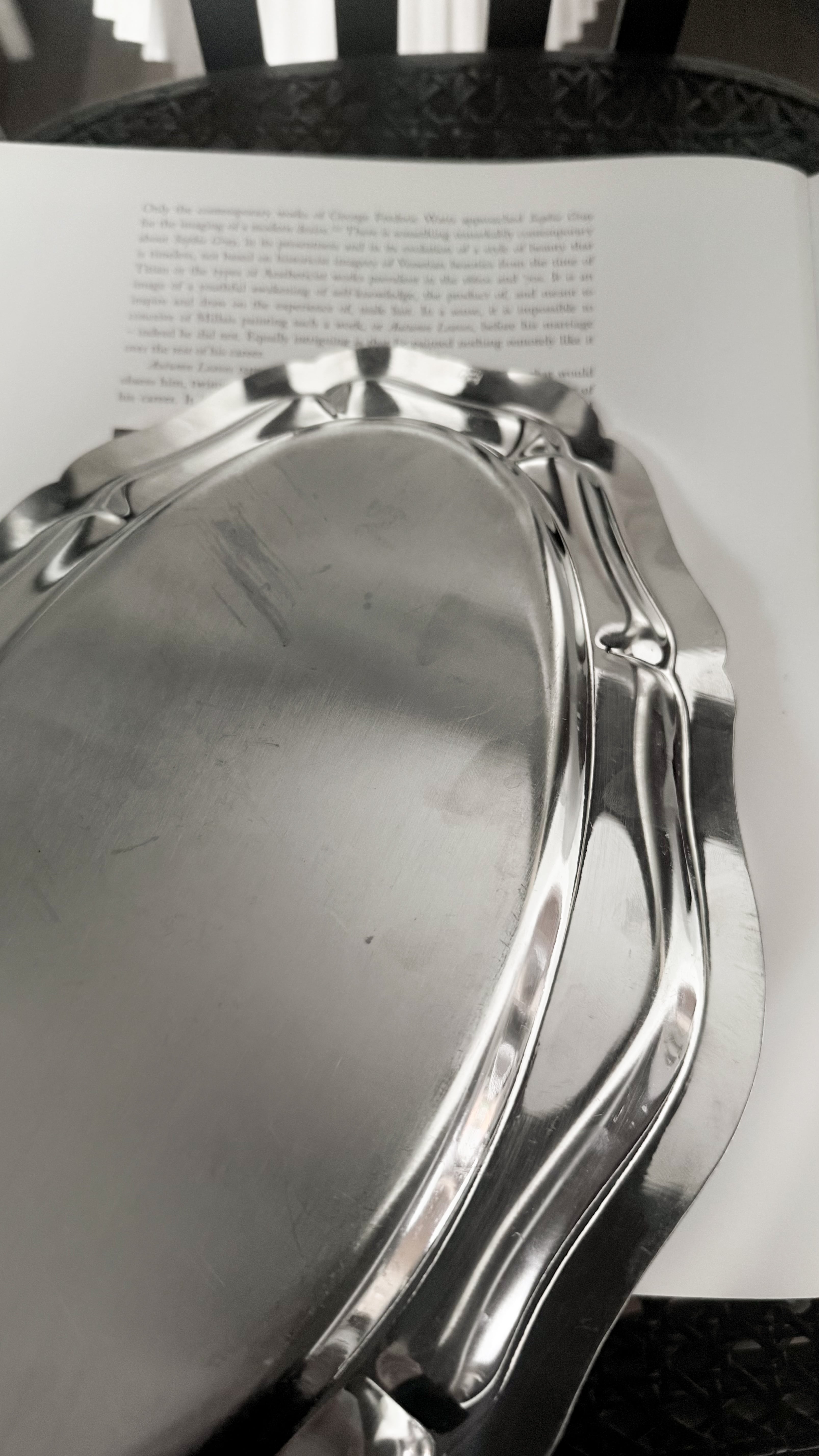 やわらかな輪郭を描くオーバルシルエットに、穏やかな光をたたえたフランスヴィンテージのステンレストレイ。ふちに施されたささやかな装飾が、控えめながらも上品な存在感を添えています。ステンレスならではの軽やかさと扱いやすさがありつつ、ヴィンテージならではの質感と深みがほどよく残る一枚。お茶やアクセサリーをのせたり、お気に入りの香水を置く見せる収納にも◎