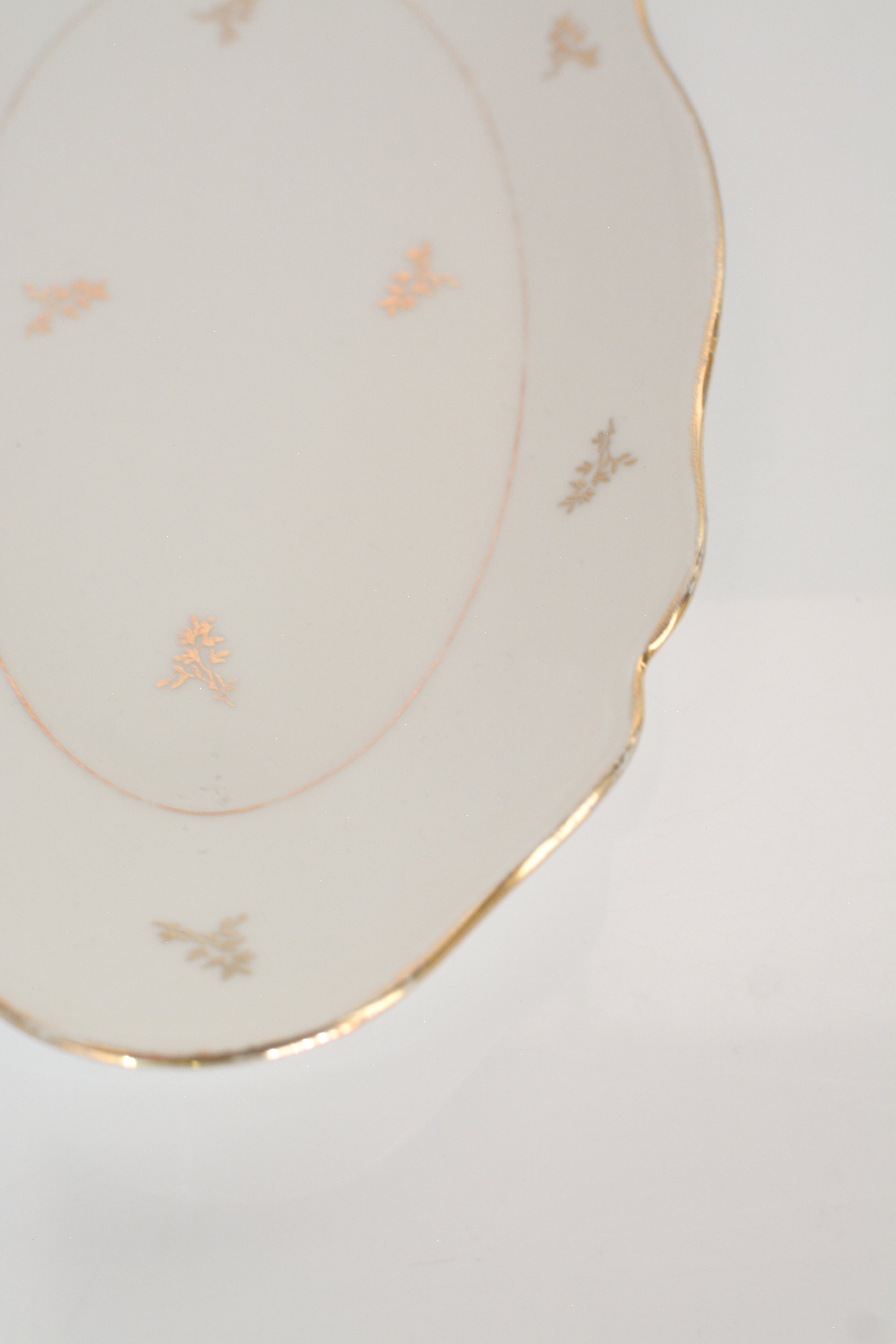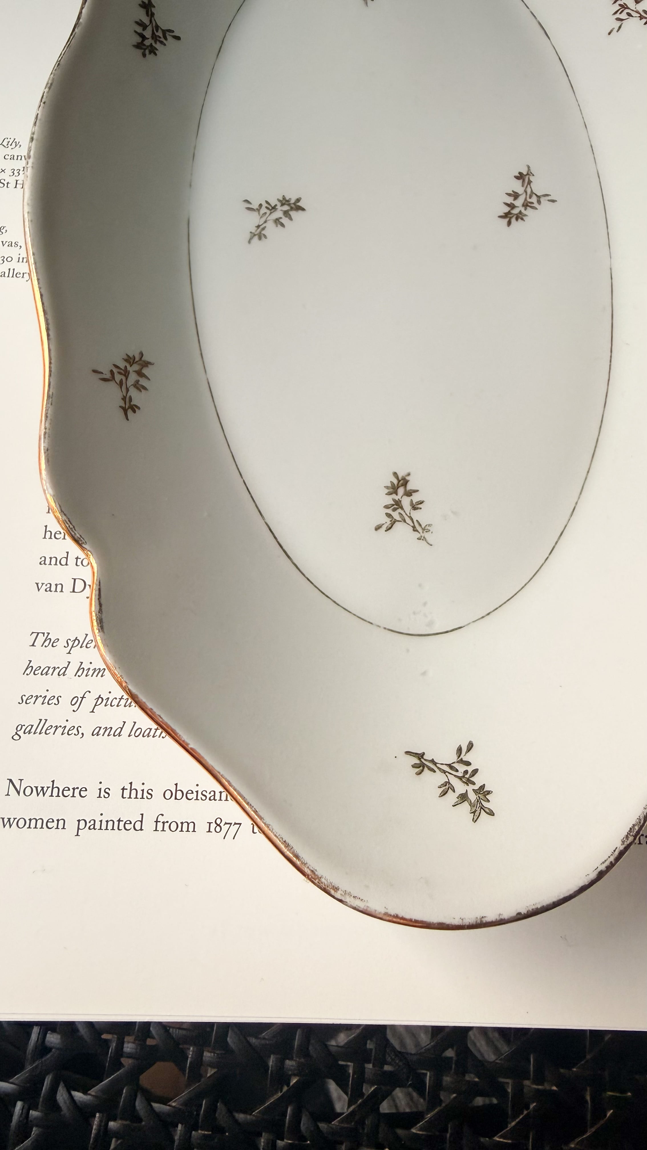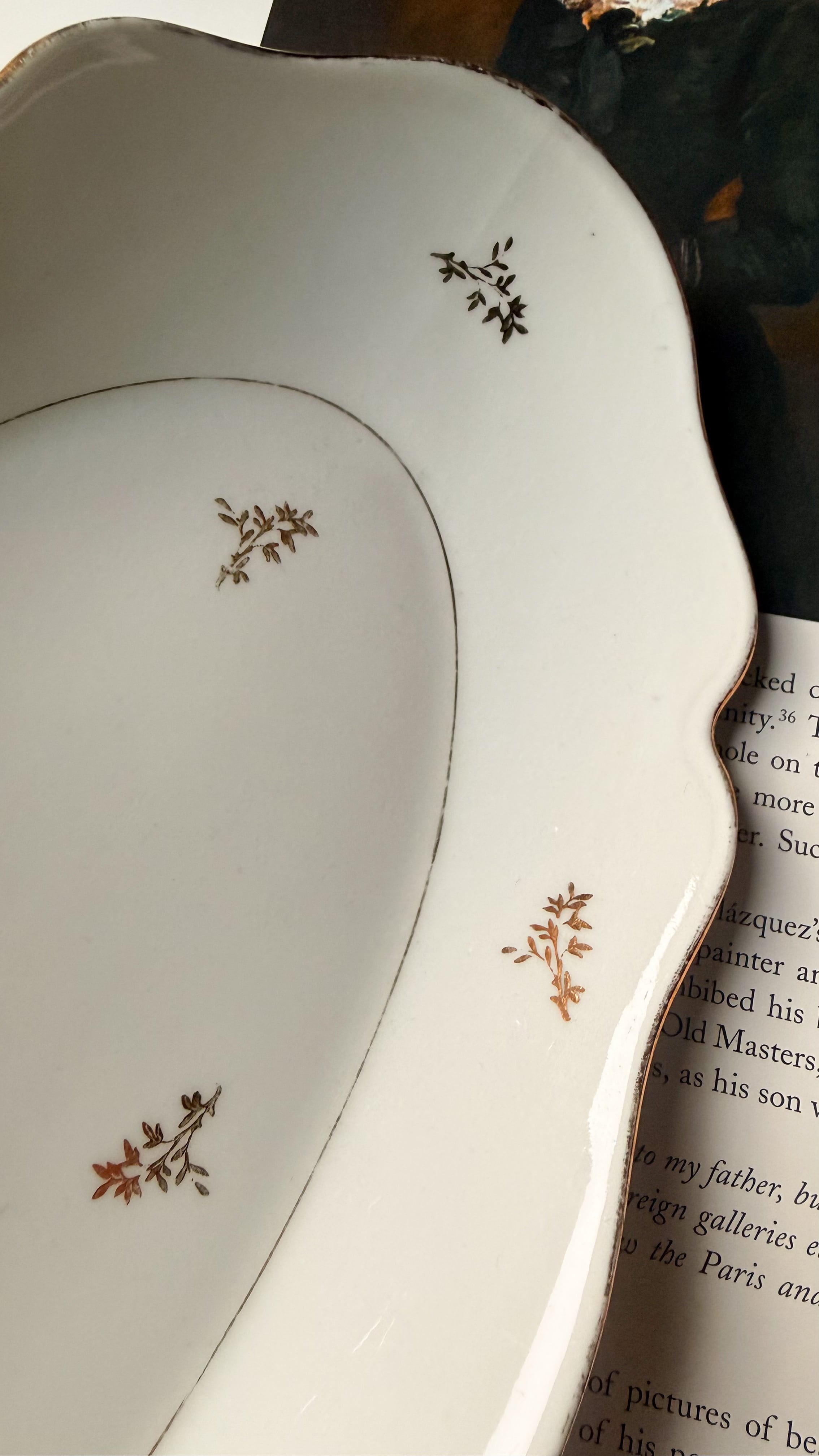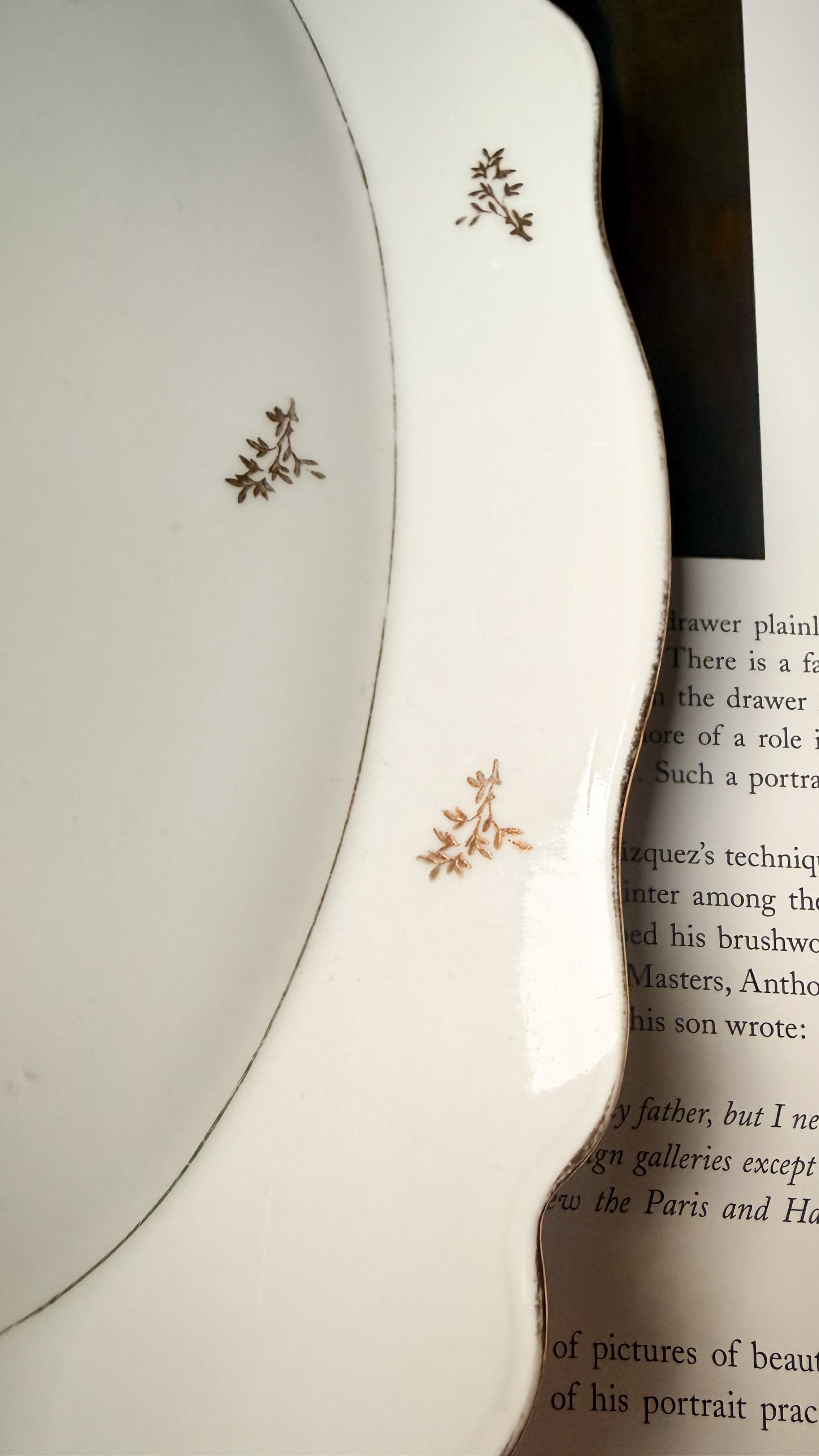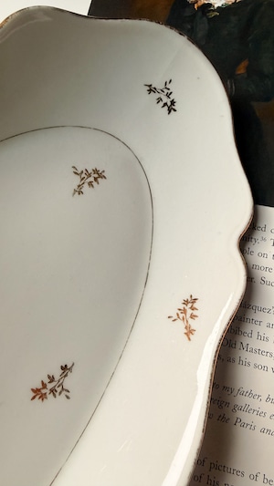 静かな佇まいのなかに、まるで呼吸するようにやわらかな動きを感じるラヴィエ。フランス、ベリー地方 Louis Louriouxの一枚です。ふっくらと立ち上がる縁は、スカラップのように波打つ優雅なライン。その輪郭に沿って細く引かれた金彩が、光を受けるたびにふわりと輝きます。中央と縁に散らされた、小さな金の花束。控えめでありながら、角度を変えるとそっと微笑みを返してくれるような、温かな煌めきが美しいですね。小傷等ございますが、比較的綺麗な状態です。