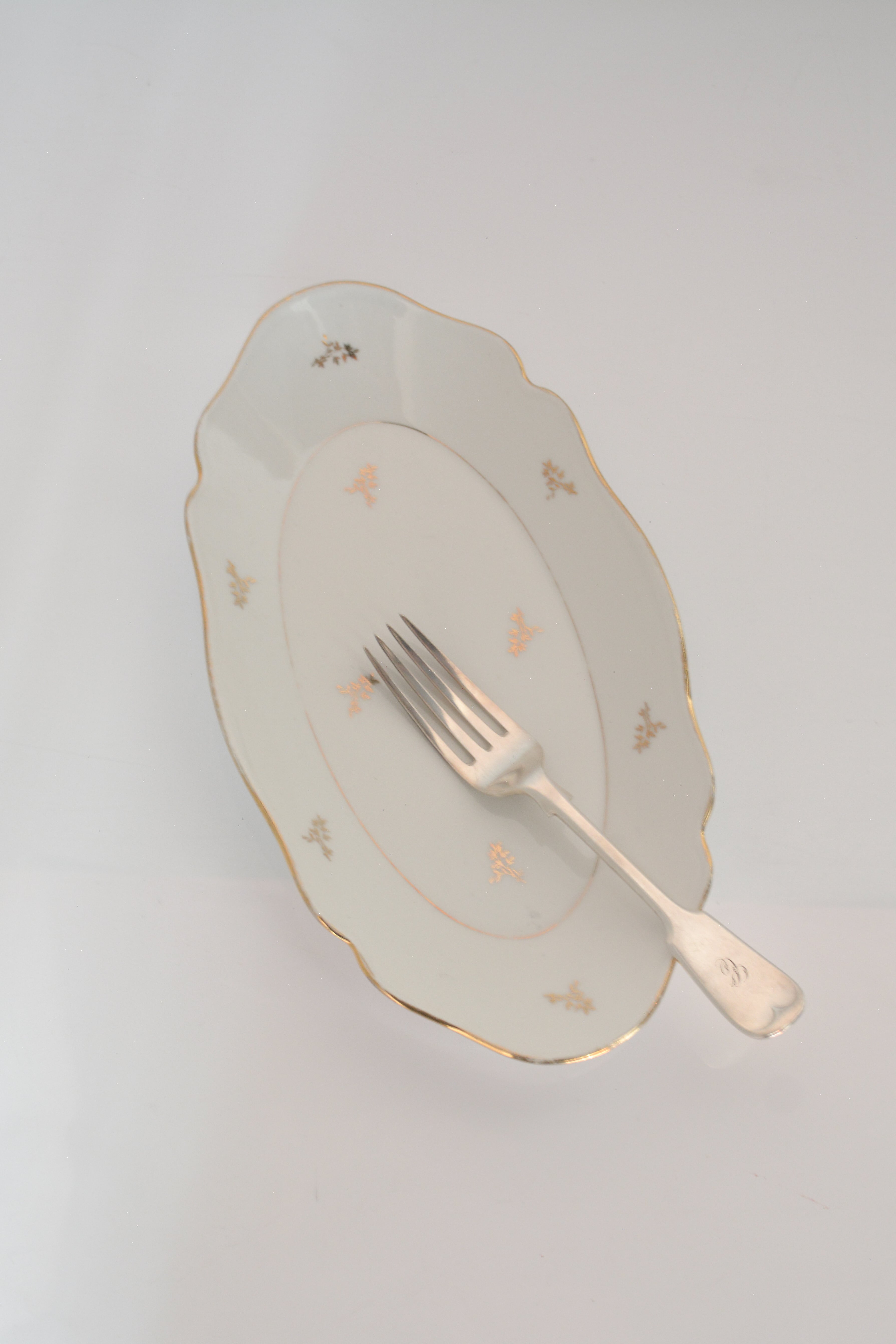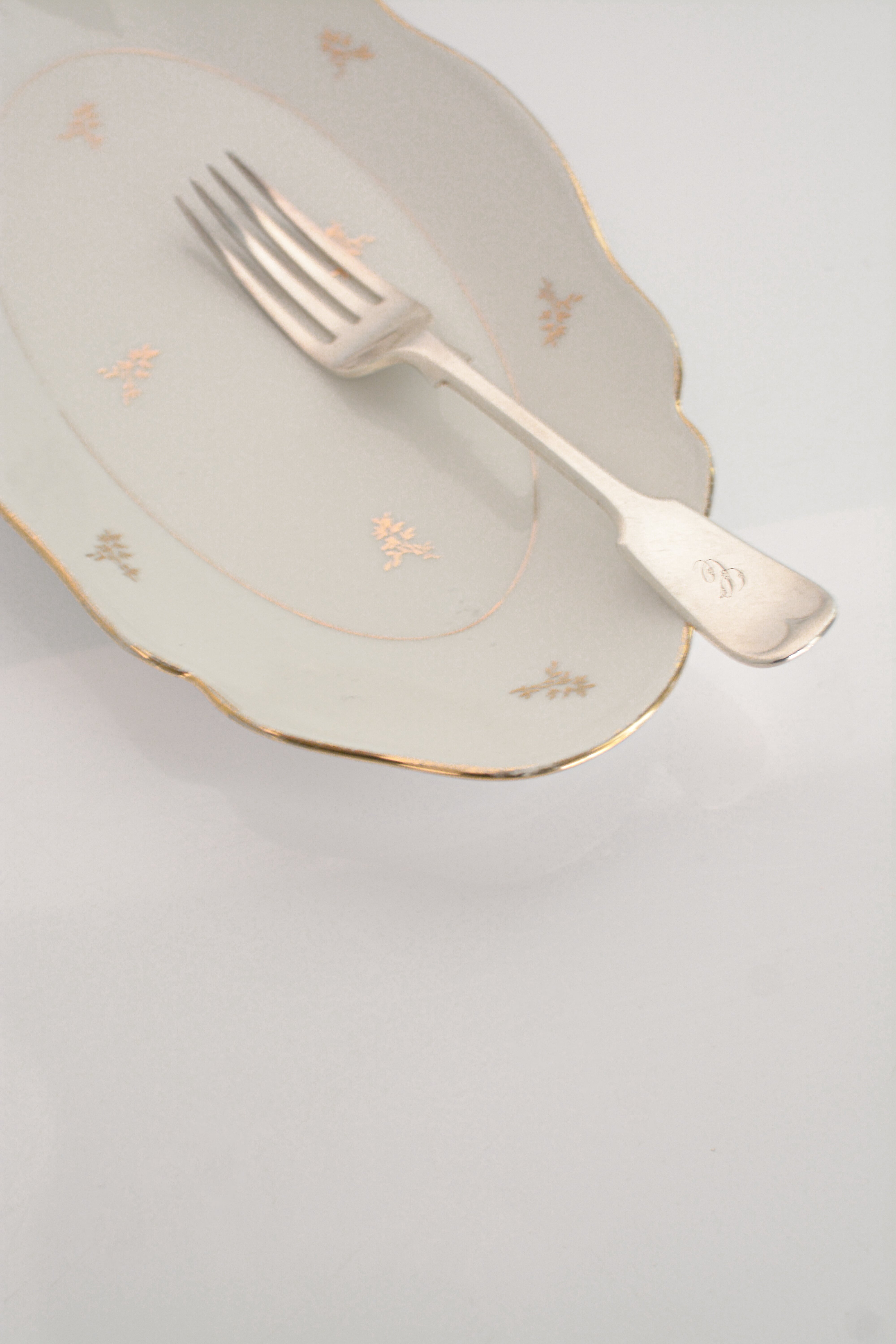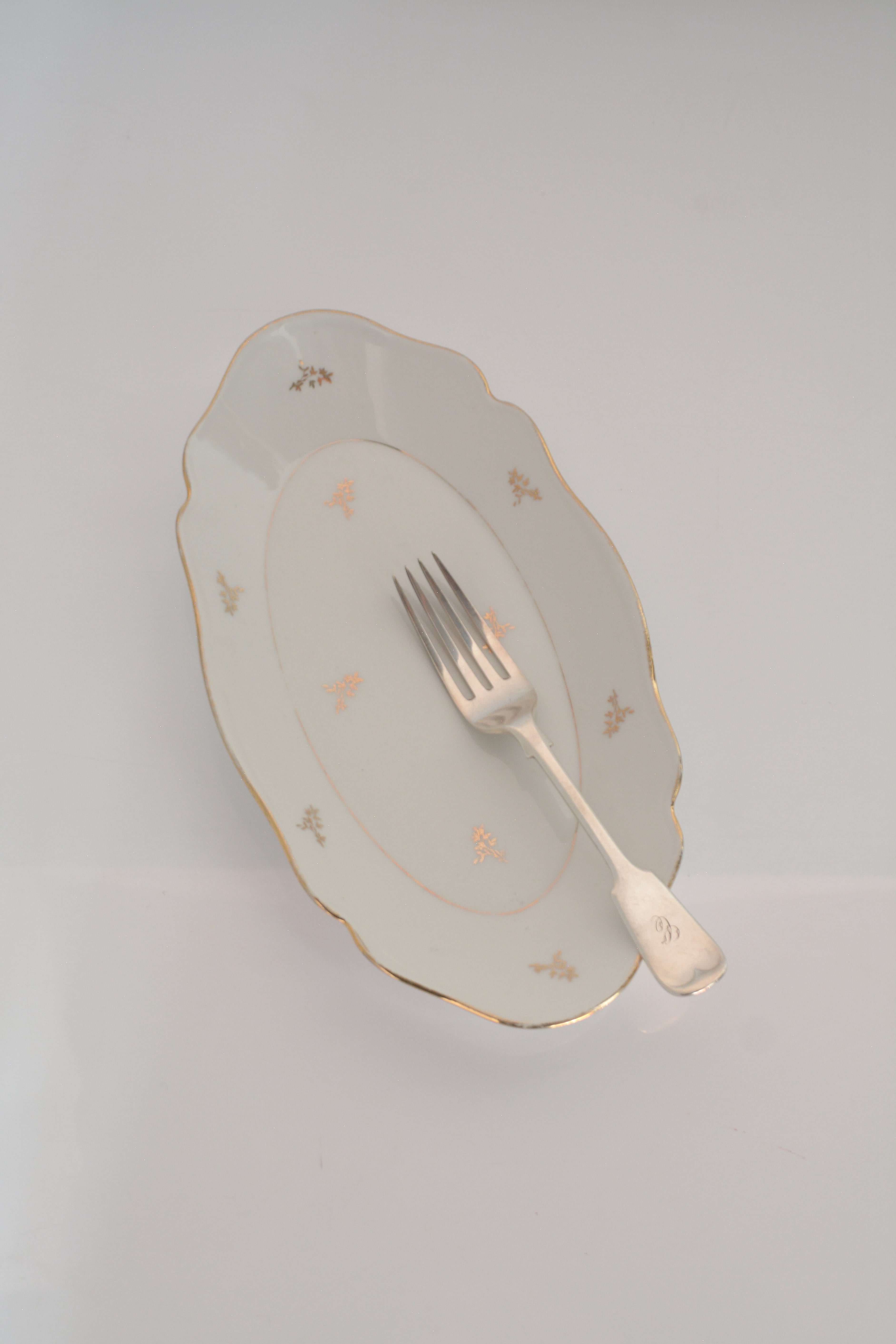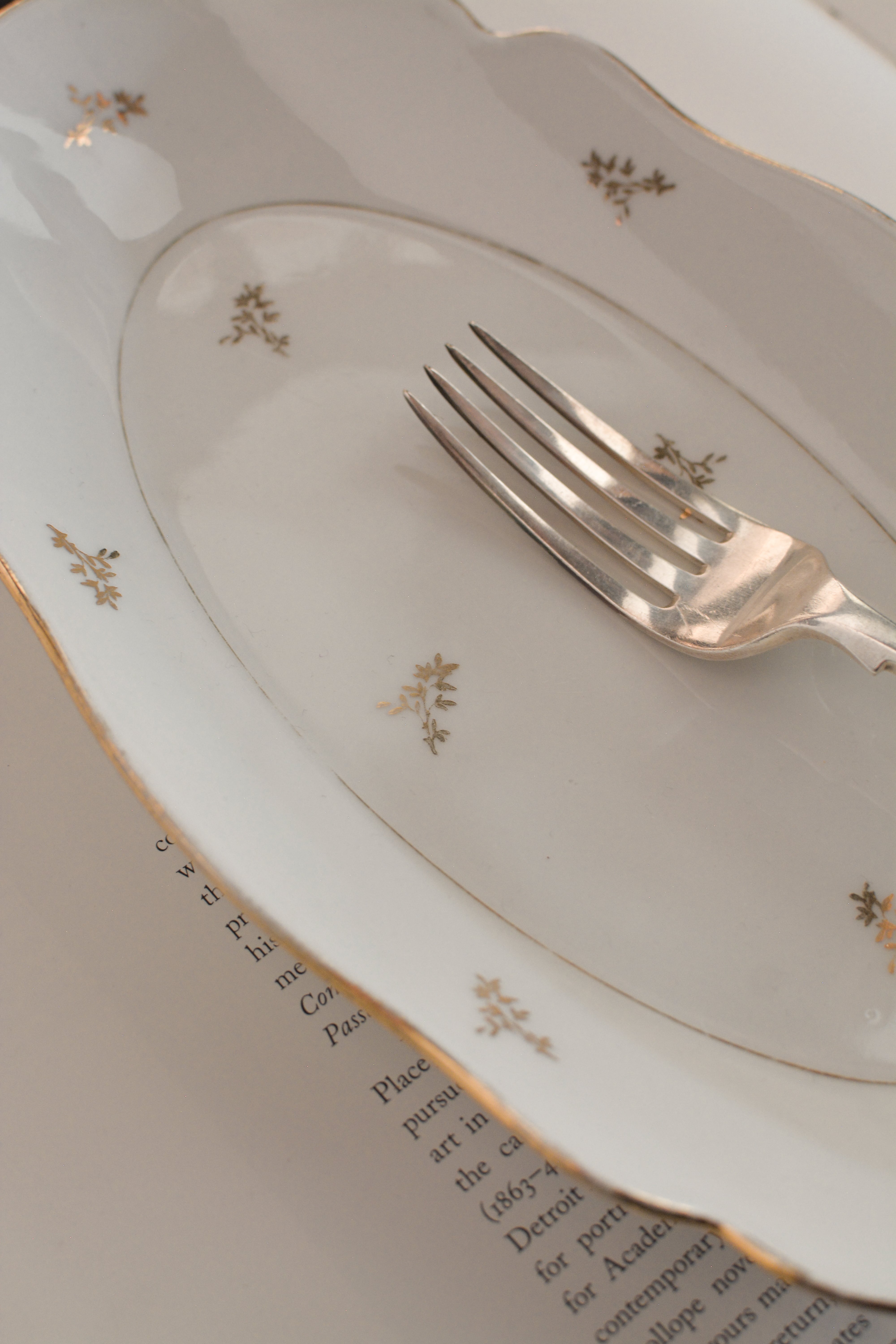 静かな佇まいのなかに、まるで呼吸するようにやわらかな動きを感じるラヴィエ。フランス、ベリー地方 Louis Louriouxの一枚です。ふっくらと立ち上がる縁は、スカラップのように波打つ優雅なライン。その輪郭に沿って細く引かれた金彩が、光を受けるたびにふわりと輝きます。中央と縁に散らされた、小さな金の花束。控えめでありながら、角度を変えるとそっと微笑みを返してくれるような、温かな煌めきが美しいですね。小傷等ございますが、比較的綺麗な状態です。