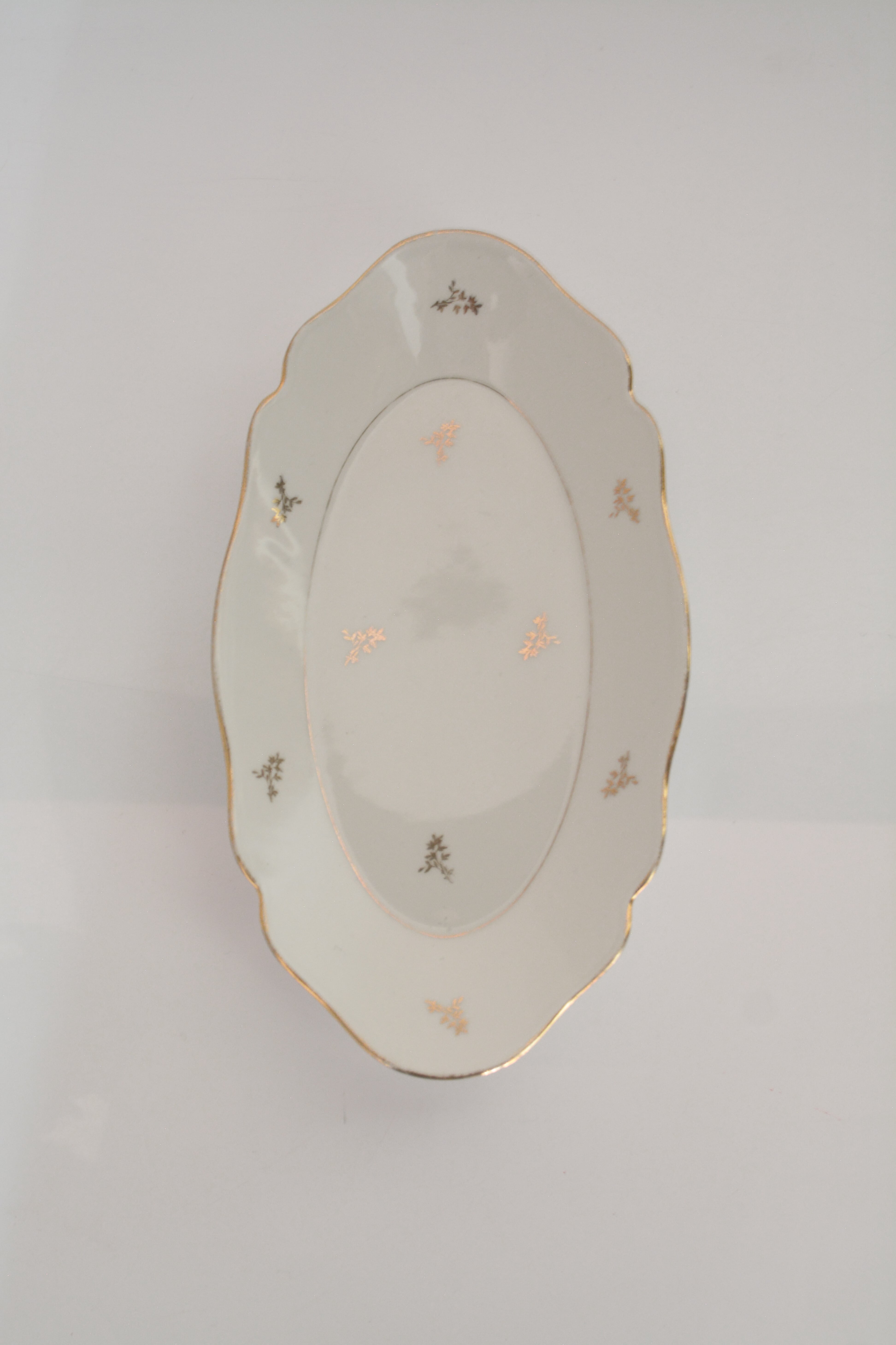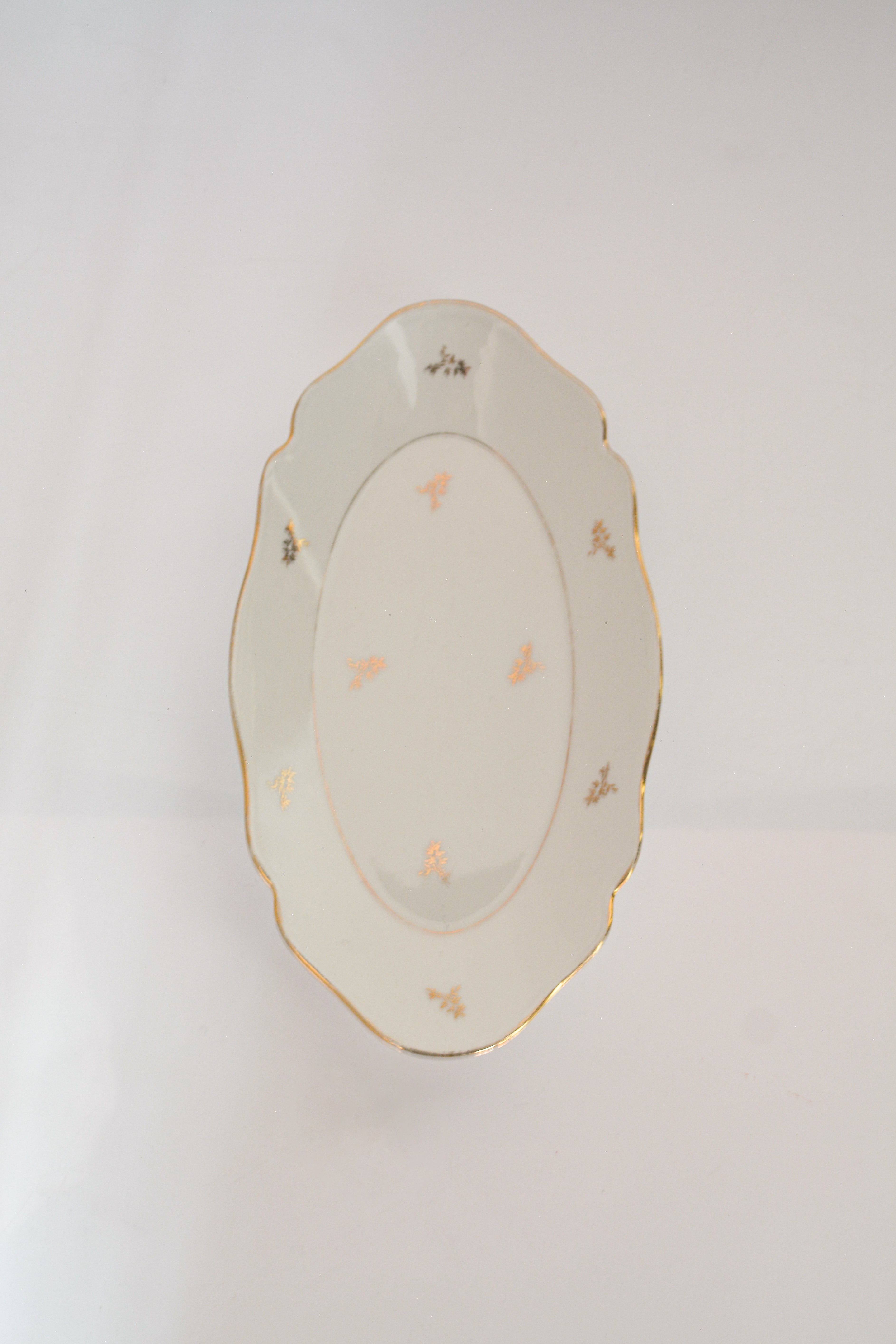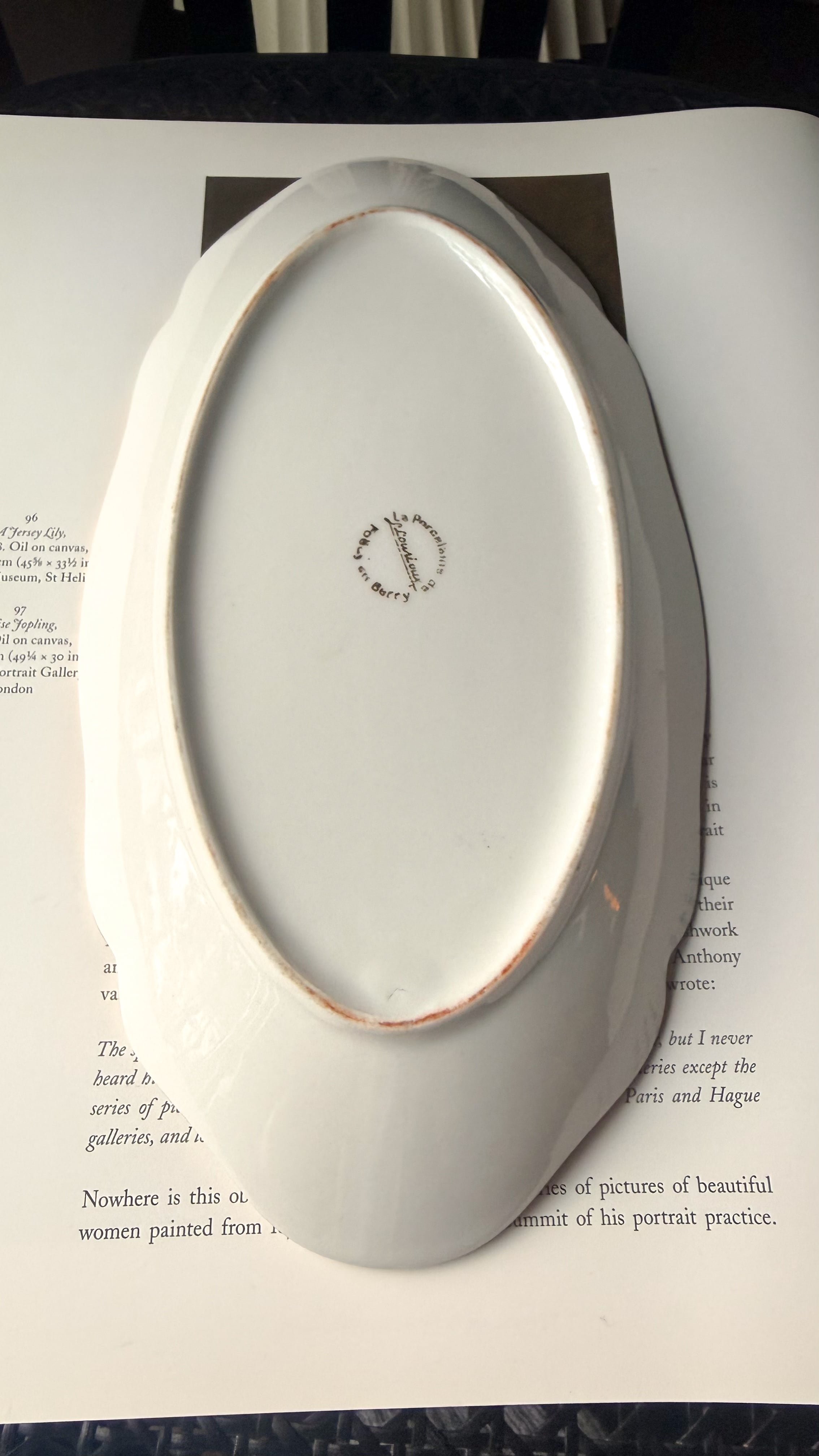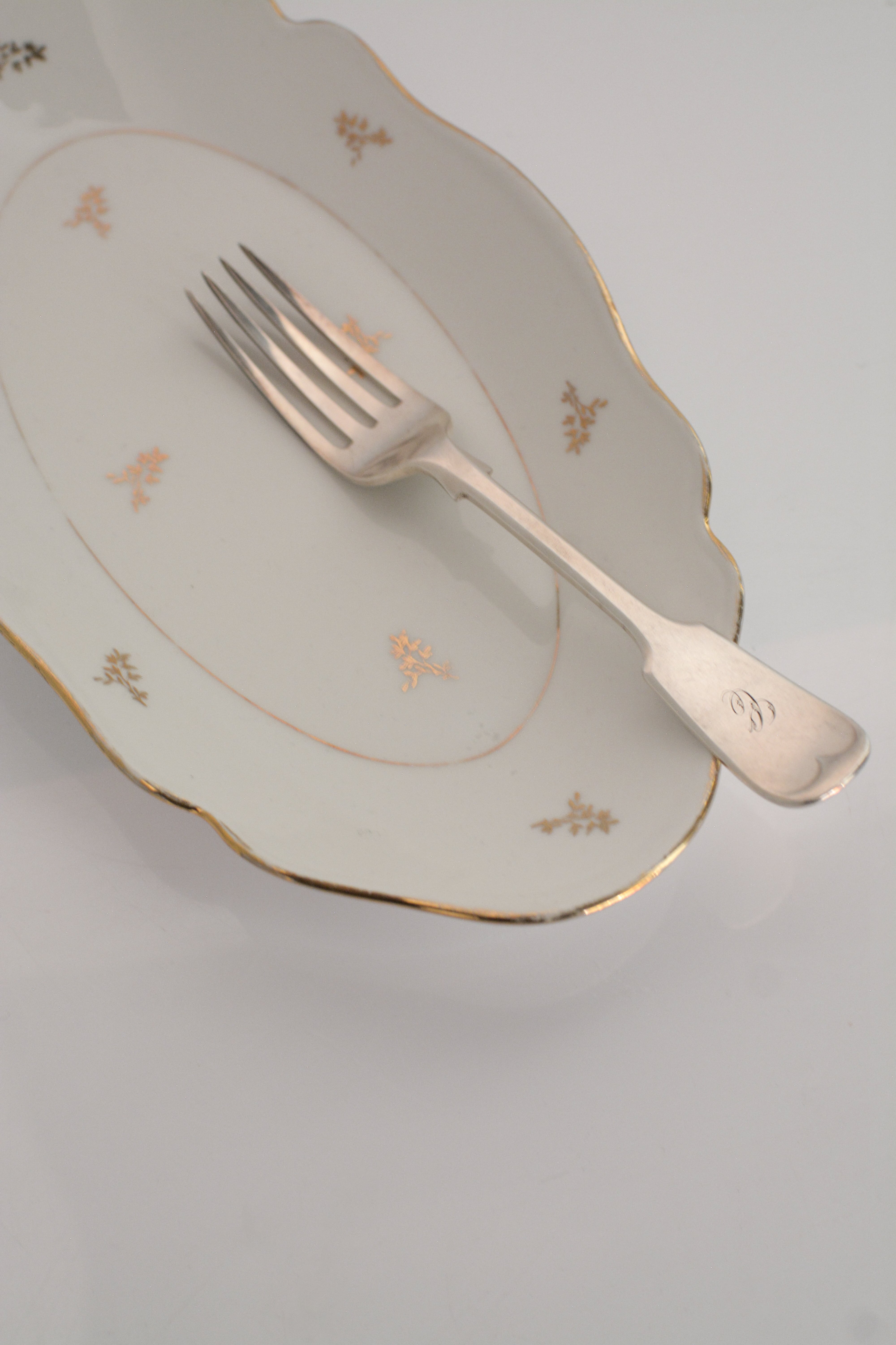 静かな佇まいのなかに、まるで呼吸するようにやわらかな動きを感じるラヴィエ。フランス、ベリー地方 Louis Louriouxの一枚です。ふっくらと立ち上がる縁は、スカラップのように波打つ優雅なライン。その輪郭に沿って細く引かれた金彩が、光を受けるたびにふわりと輝きます。中央と縁に散らされた、小さな金の花束。控えめでありながら、角度を変えるとそっと微笑みを返してくれるような、温かな煌めきが美しいですね。小傷等ございますが、比較的綺麗な状態です。