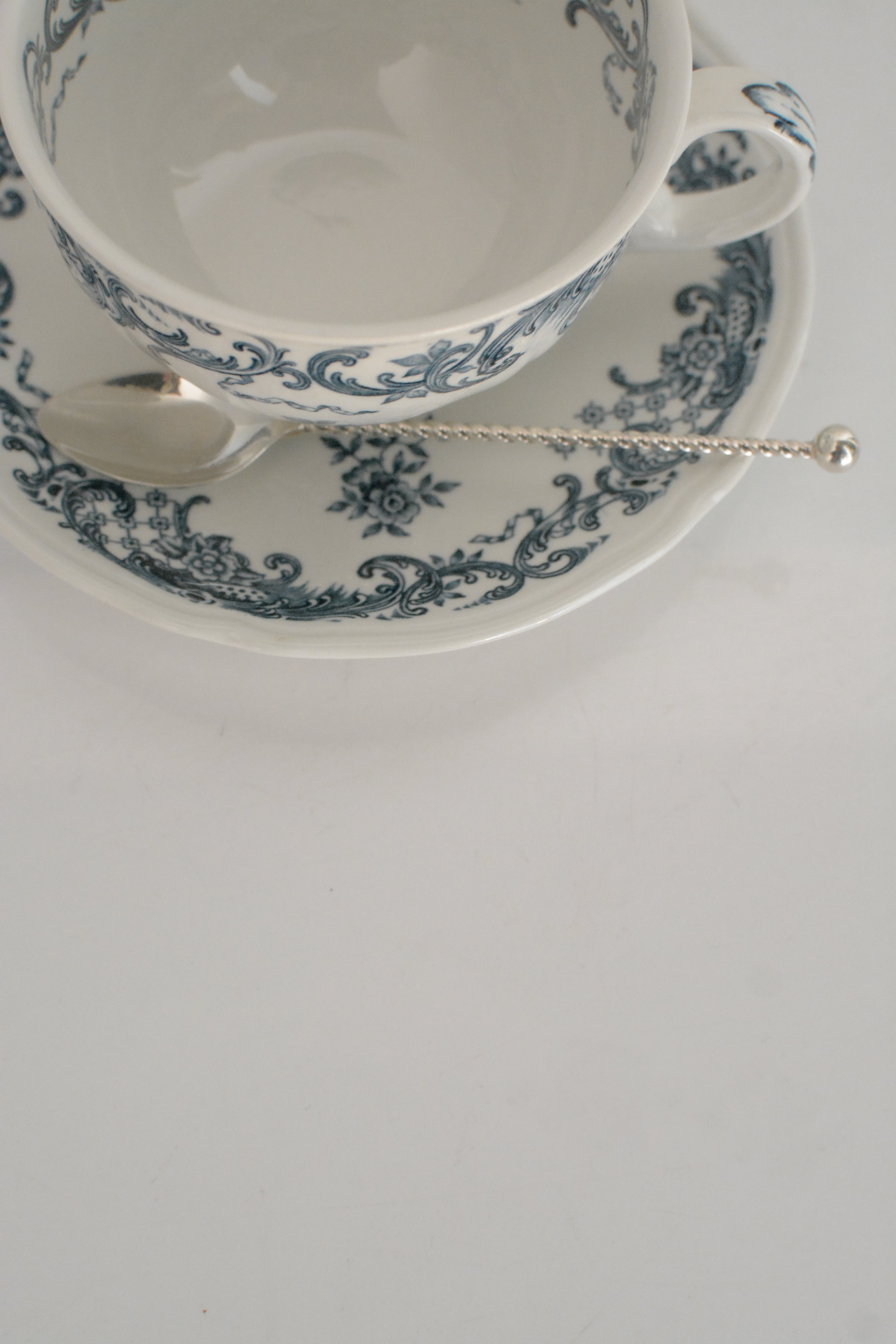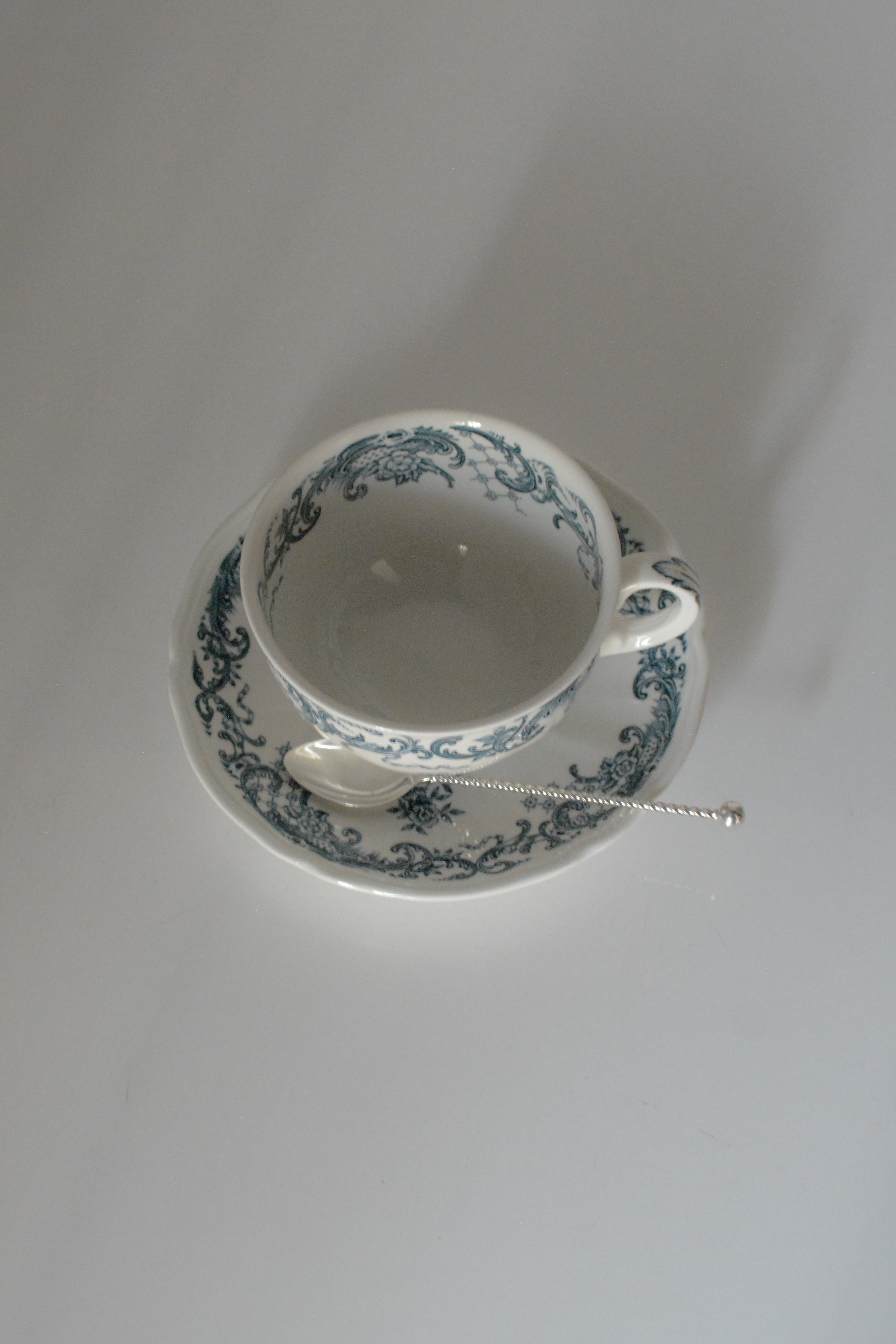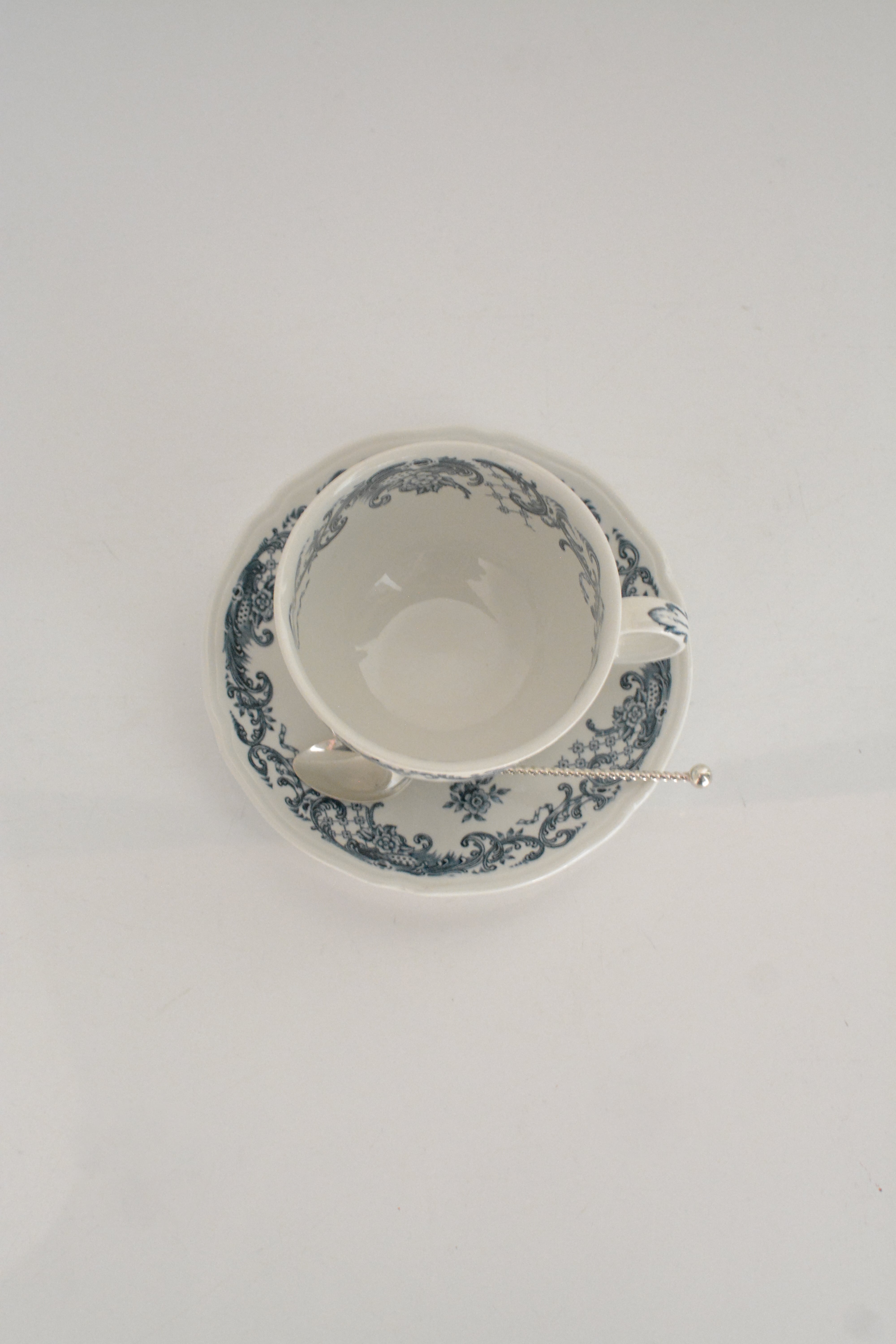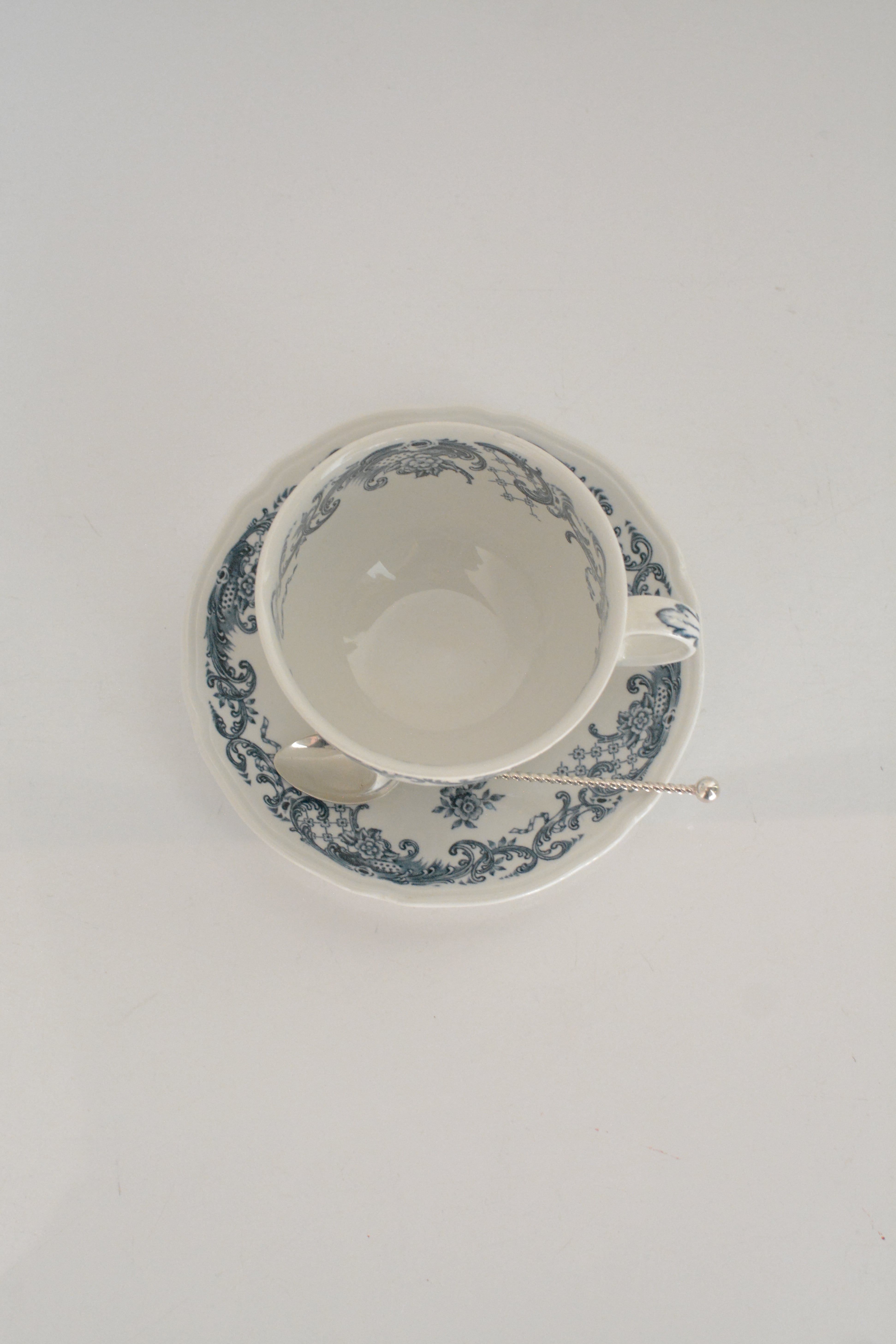 深いブルーで描かれた草花模様が印象的な、Villeroy & BochのValeriaシリーズのティーカップ&ソーサー。繊細な曲線のレリーフや、白磁の表情、引き込まれる様な雰囲気のある佇まい。カップの内側にも美しい装飾が施されており、ソーサーも同じくブルーの装飾がぐるりと巡り、絵本の1ページのような美しい一客です。小傷等ございますがヴィンテージとしては比較的綺麗な状態です。こちらの個体はバックスタンプ違いです。