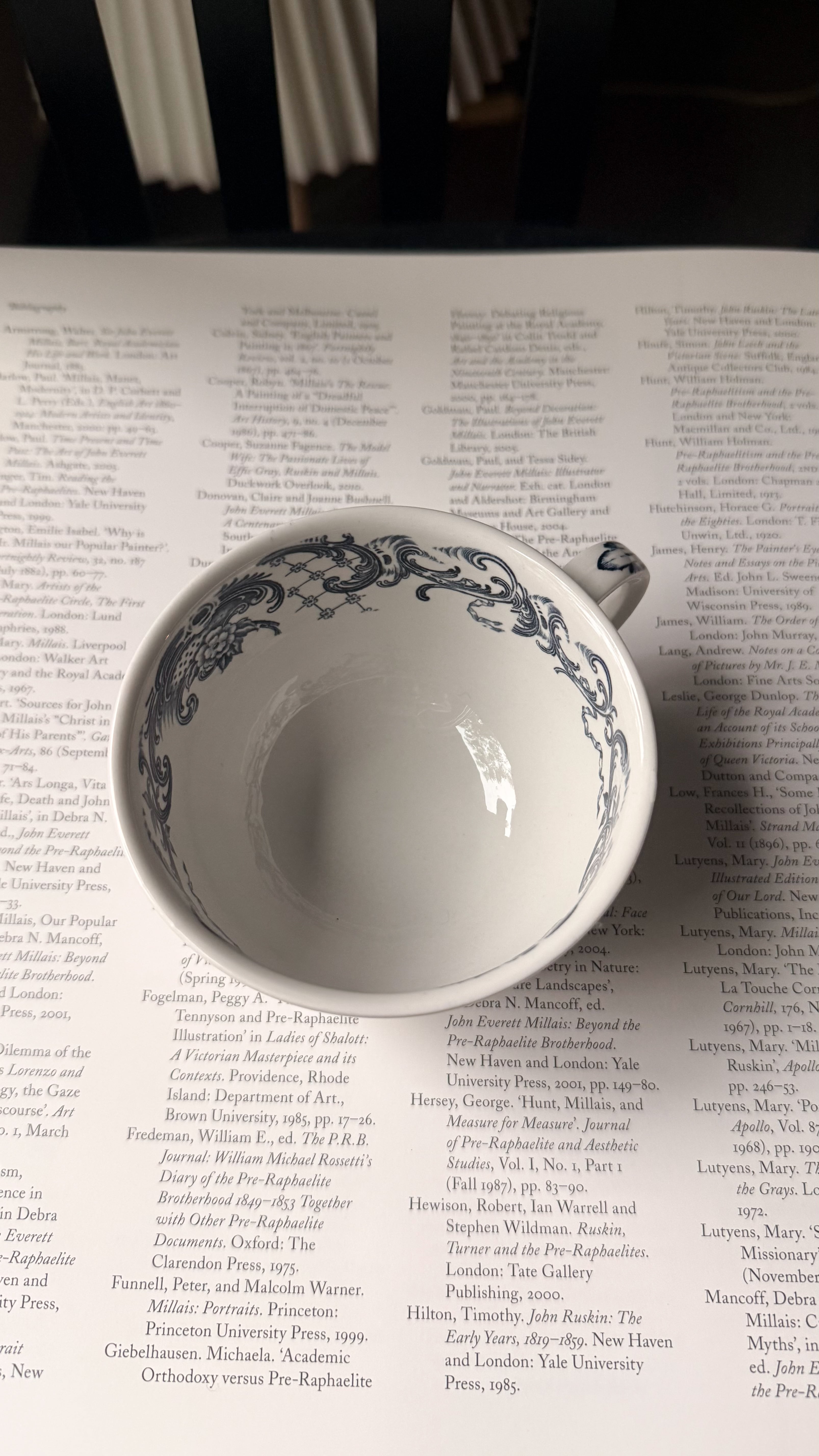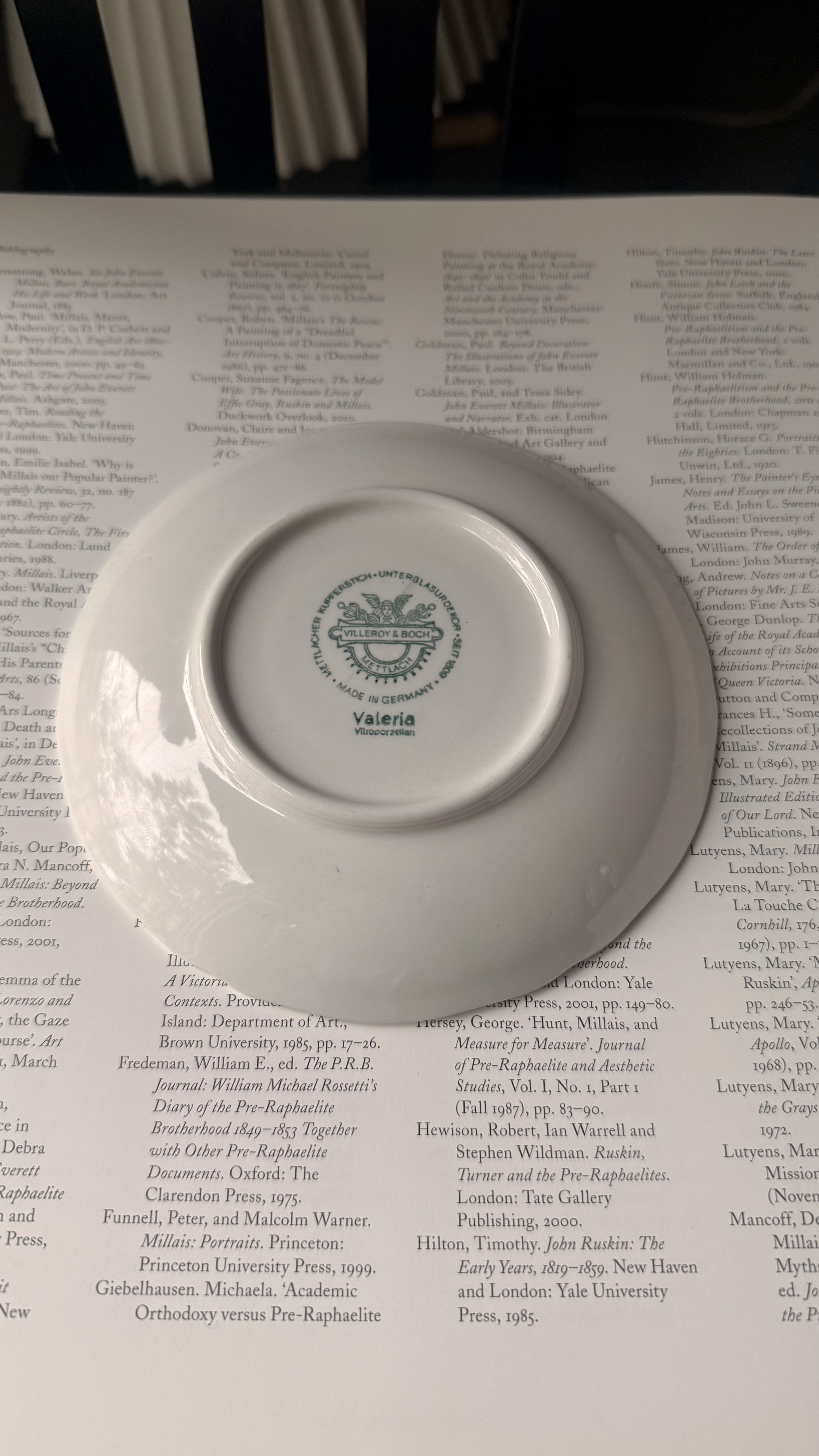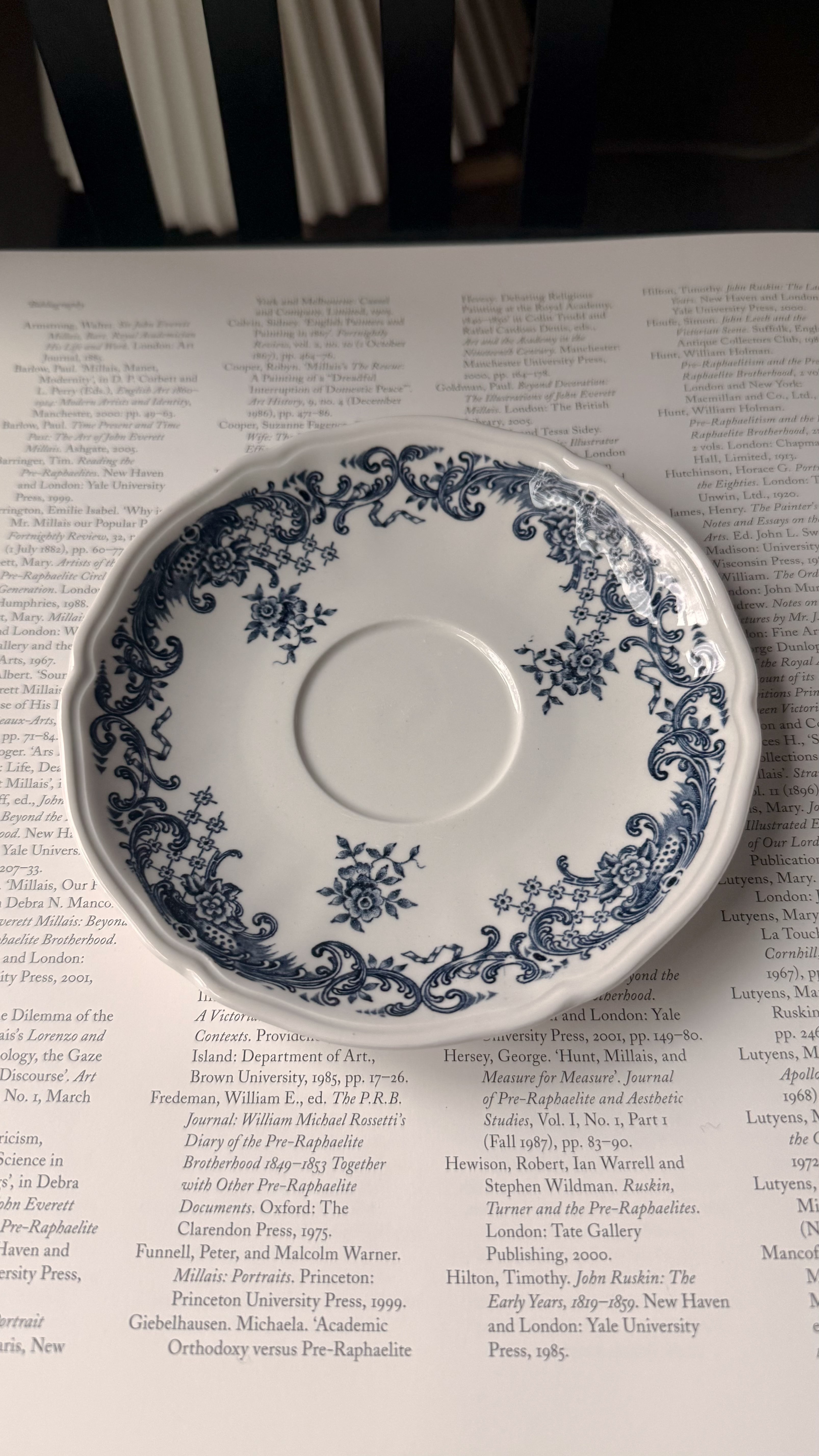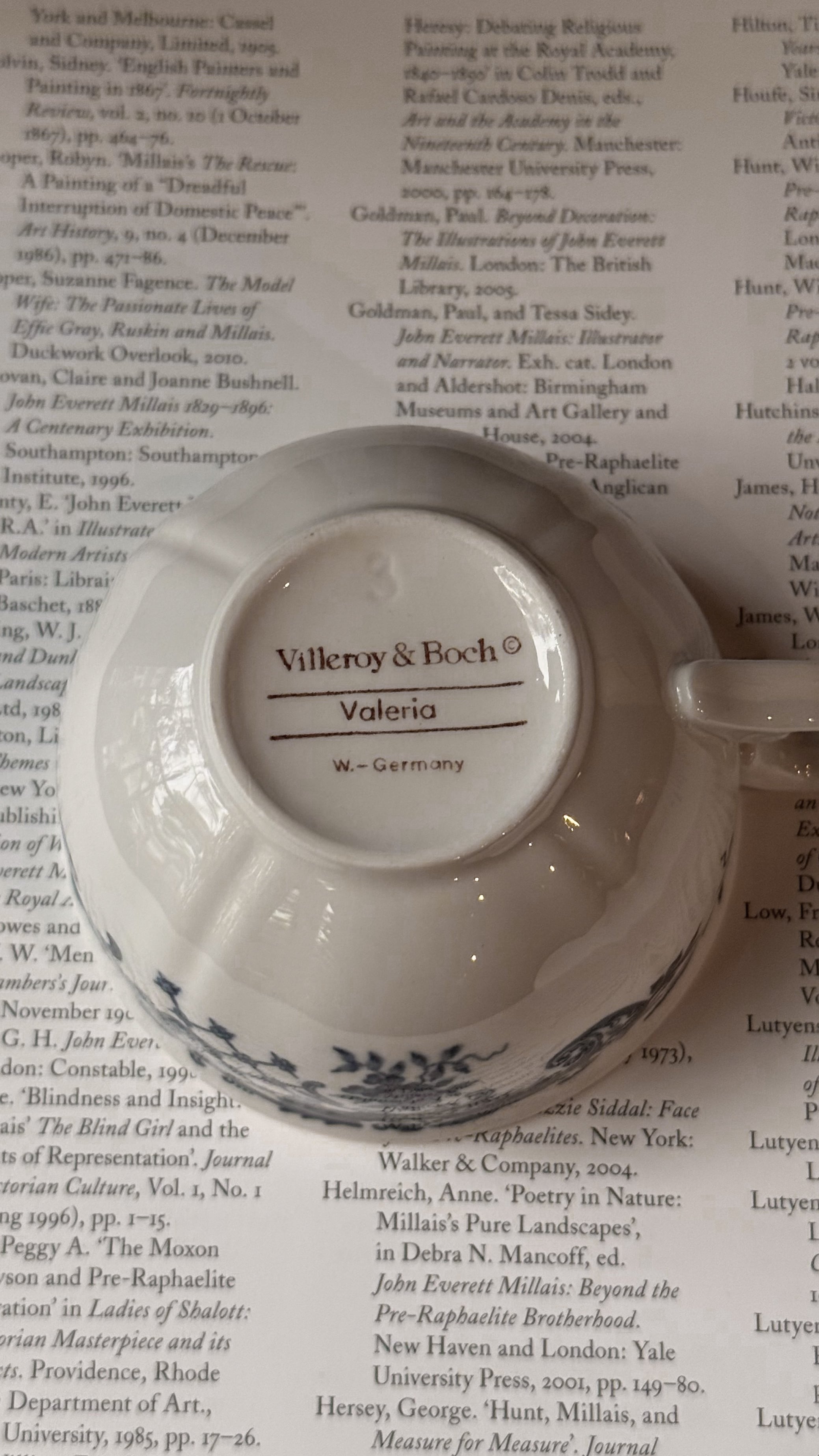 深いブルーで描かれた草花模様が印象的な、Villeroy & BochのValeriaシリーズのティーカップ&ソーサー。繊細な曲線のレリーフや、白磁の表情、引き込まれる様な雰囲気のある佇まい。カップの内側にも美しい装飾が施されており、ソーサーも同じくブルーの装飾がぐるりと巡り、絵本の1ページのような美しい一客です。小傷等ございますがヴィンテージとしては比較的綺麗な状態です。こちらの個体はバックスタンプ違いです。