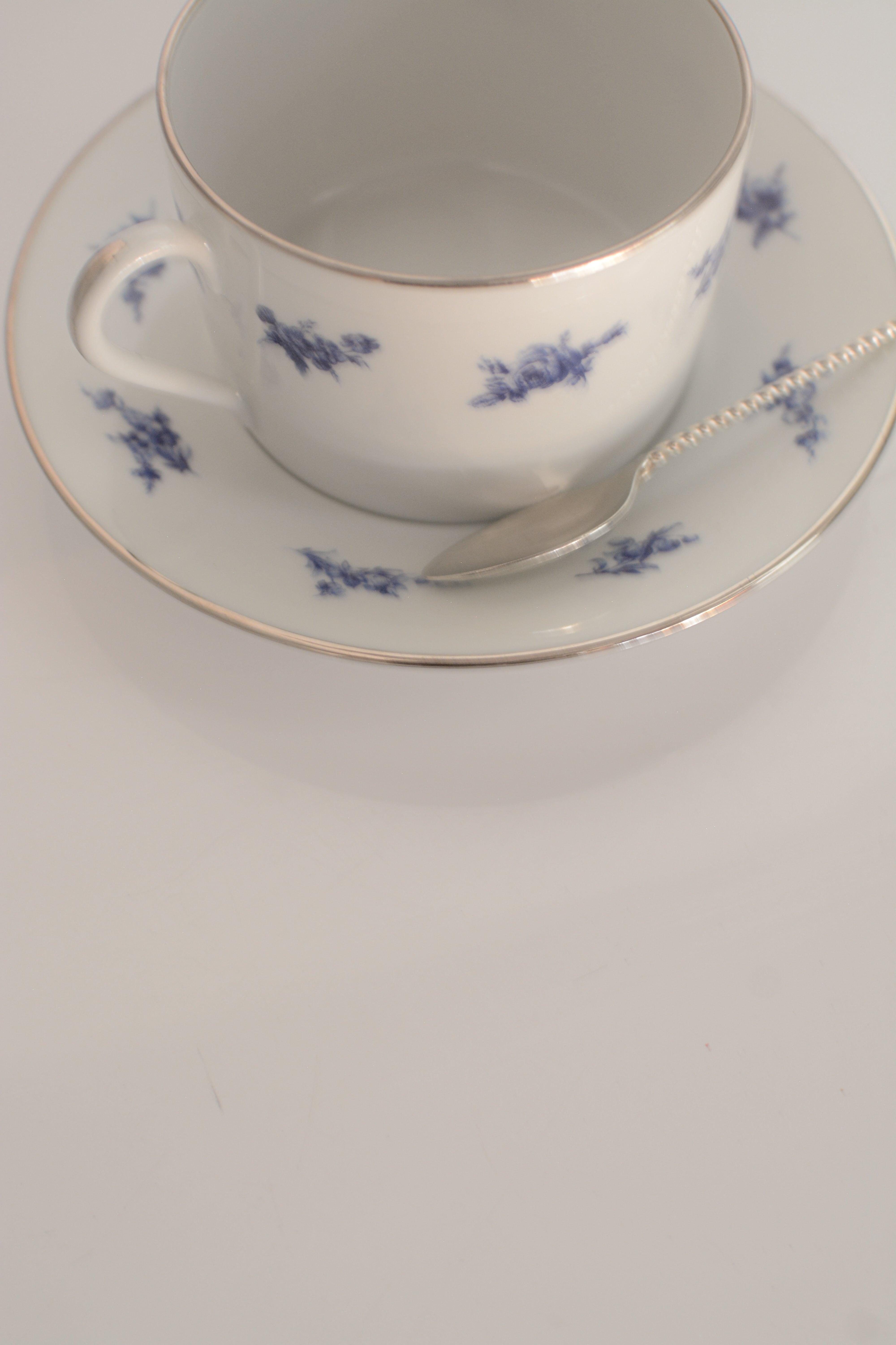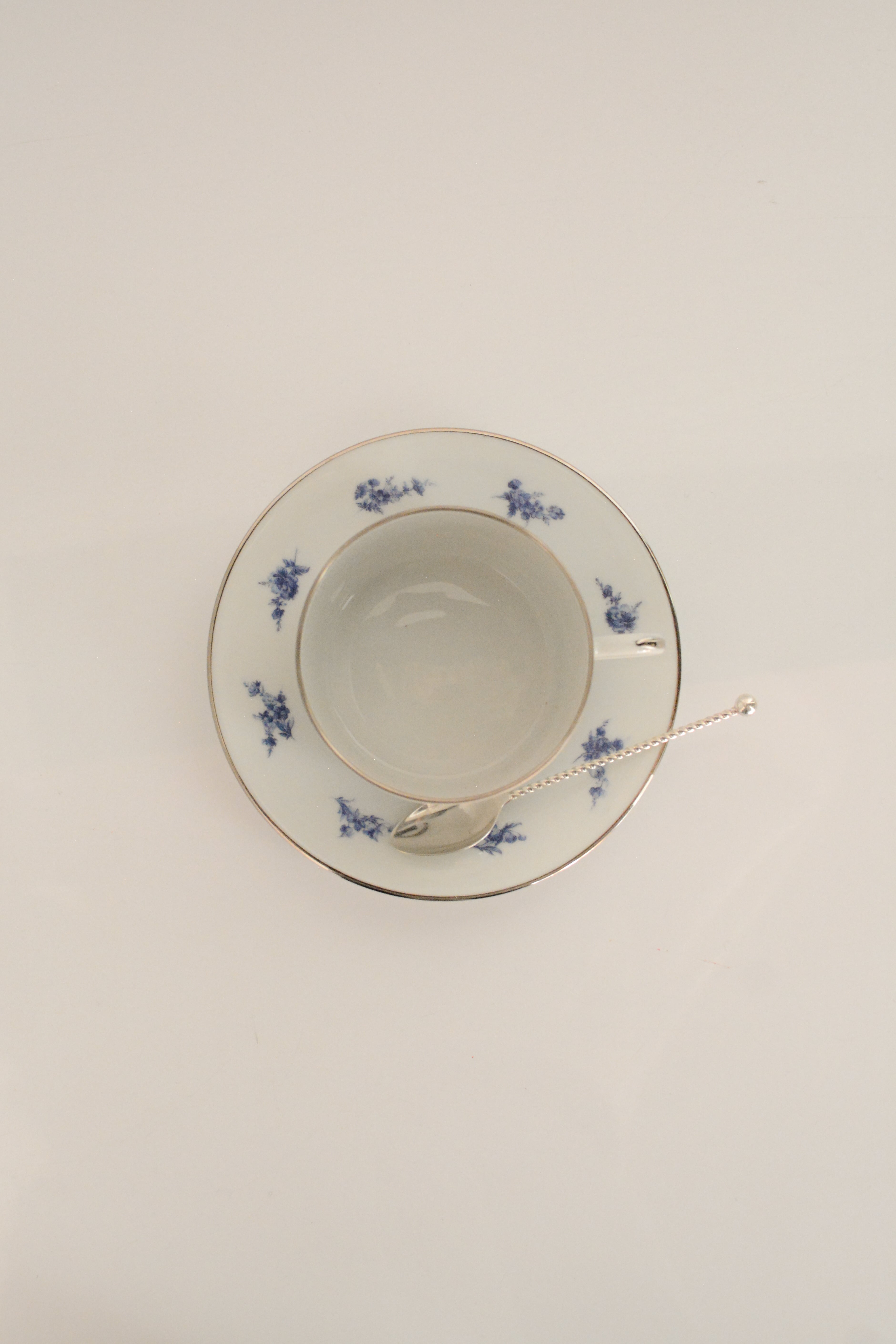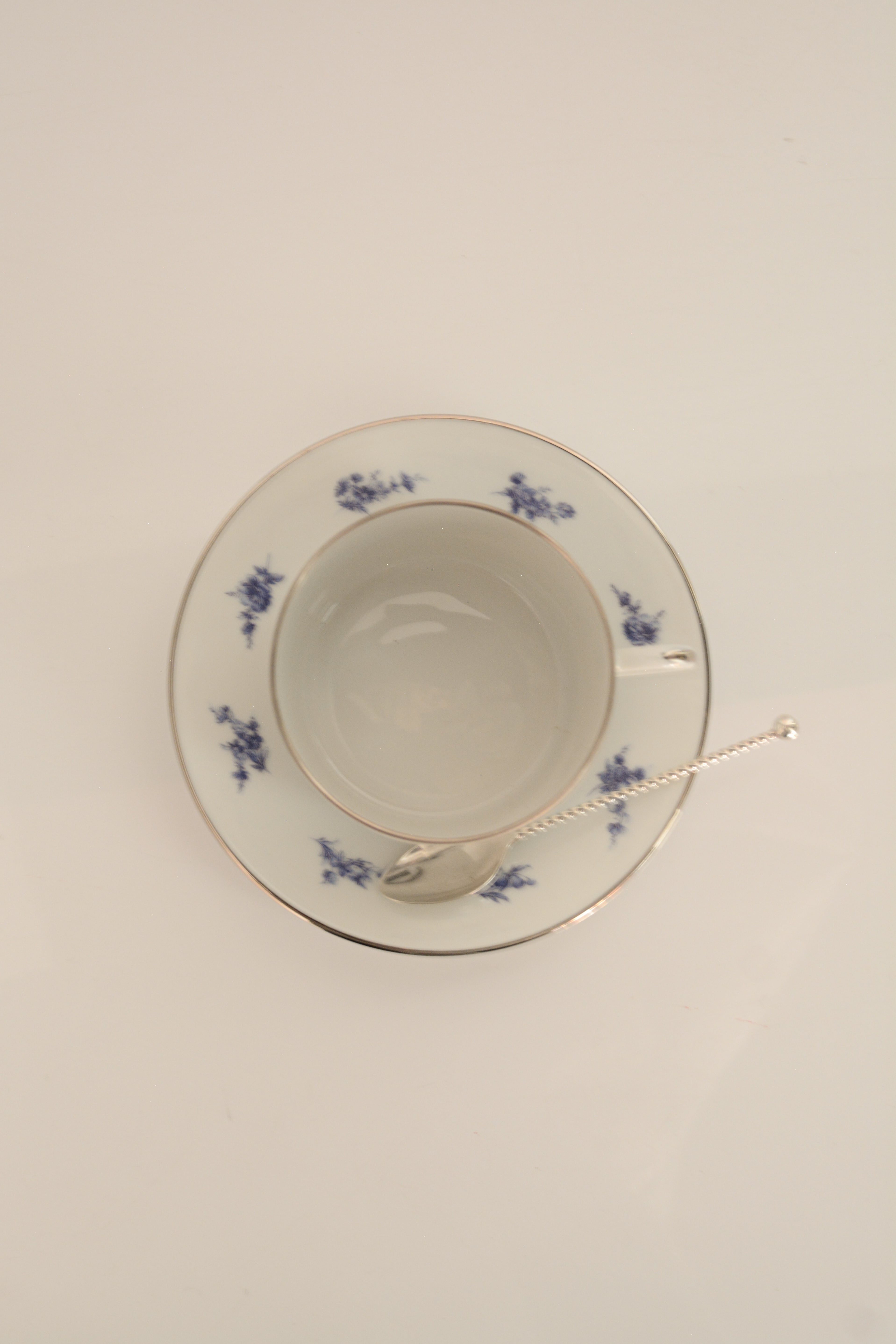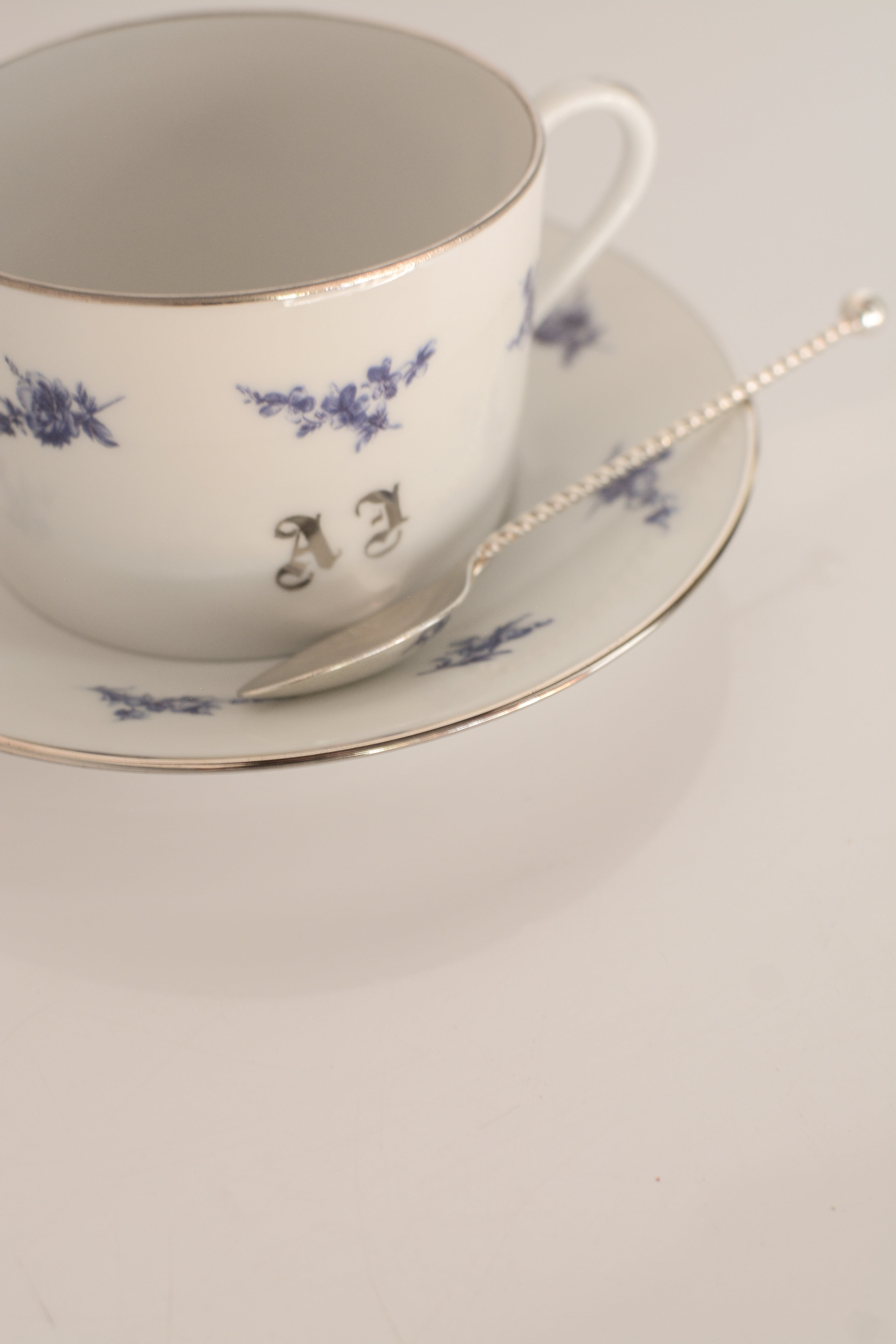 クラシックでありながら凛とした佇まいが魅力のフランス・Limogesのカップ&ソーサー。白磁の上には、小さな青い花が風に揺れるように描かれ、縁の細いラインと “A.J.”というイニシャルがシルバーの静かな輝きを宿しています。手に取ると少し背筋が伸びるような、品の良い佇まいです。小傷等ございますが、ヴィンテージとしては比較的良い状態です。複数在庫ございますのでセレクトしてのお届けとなります。
