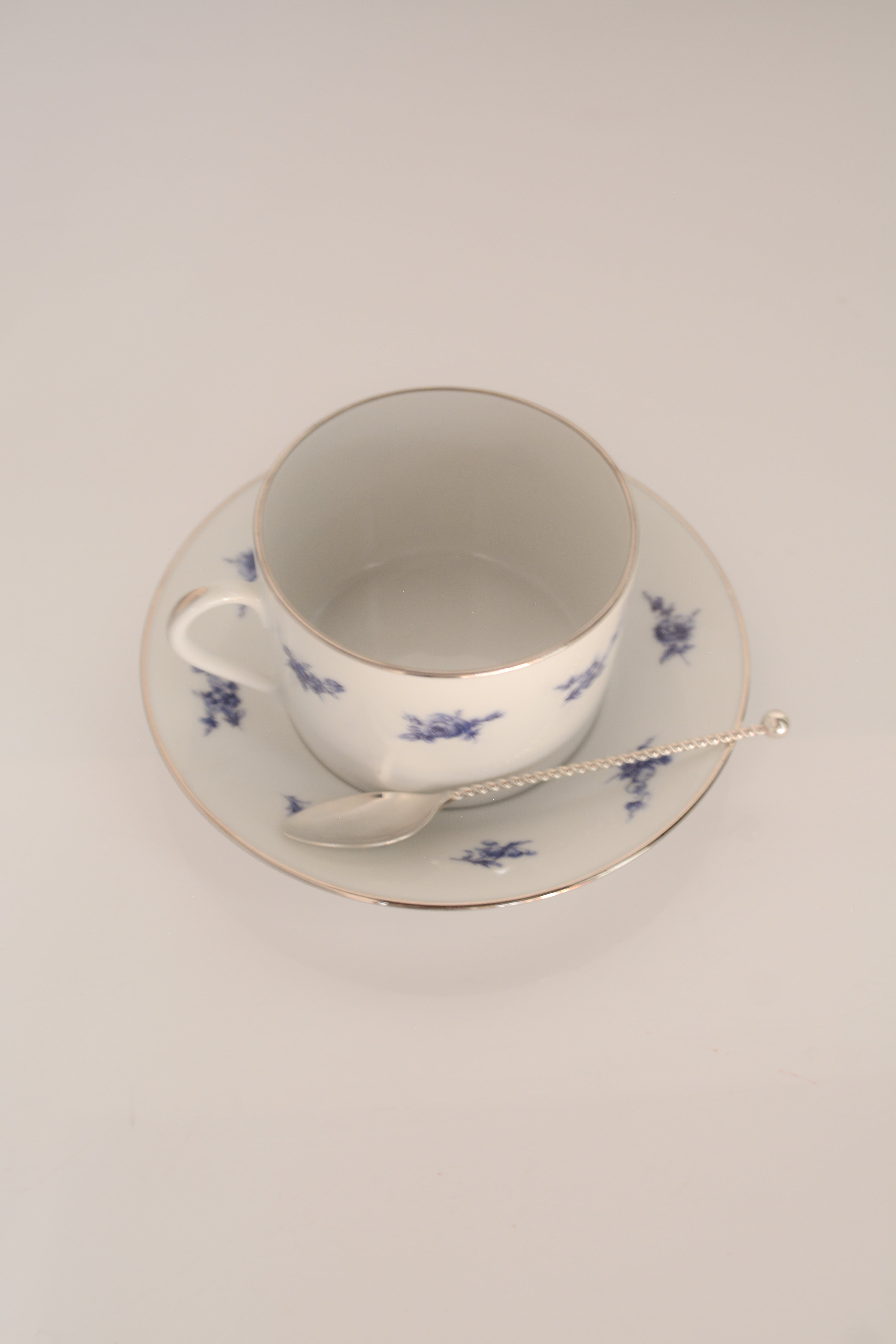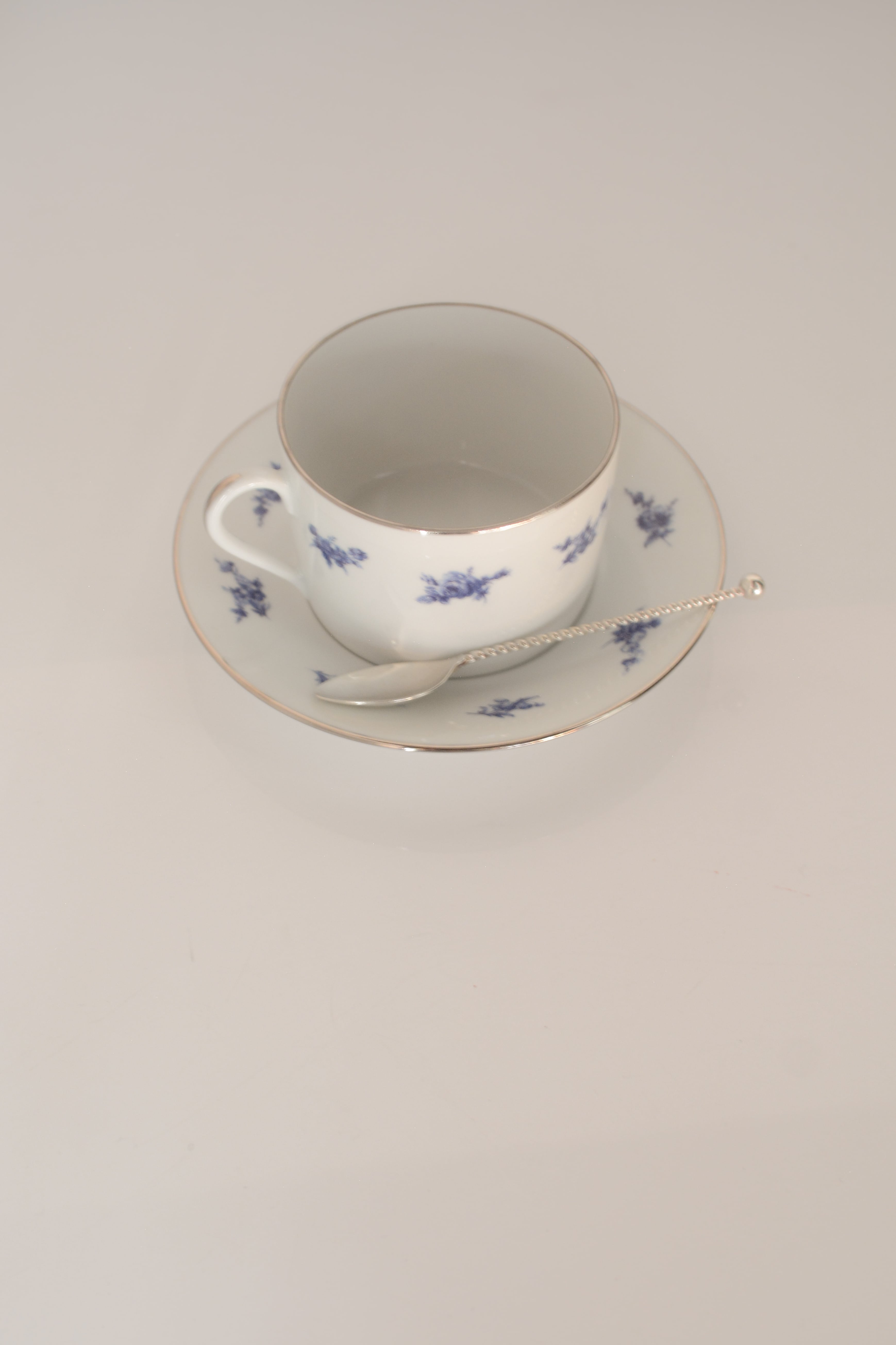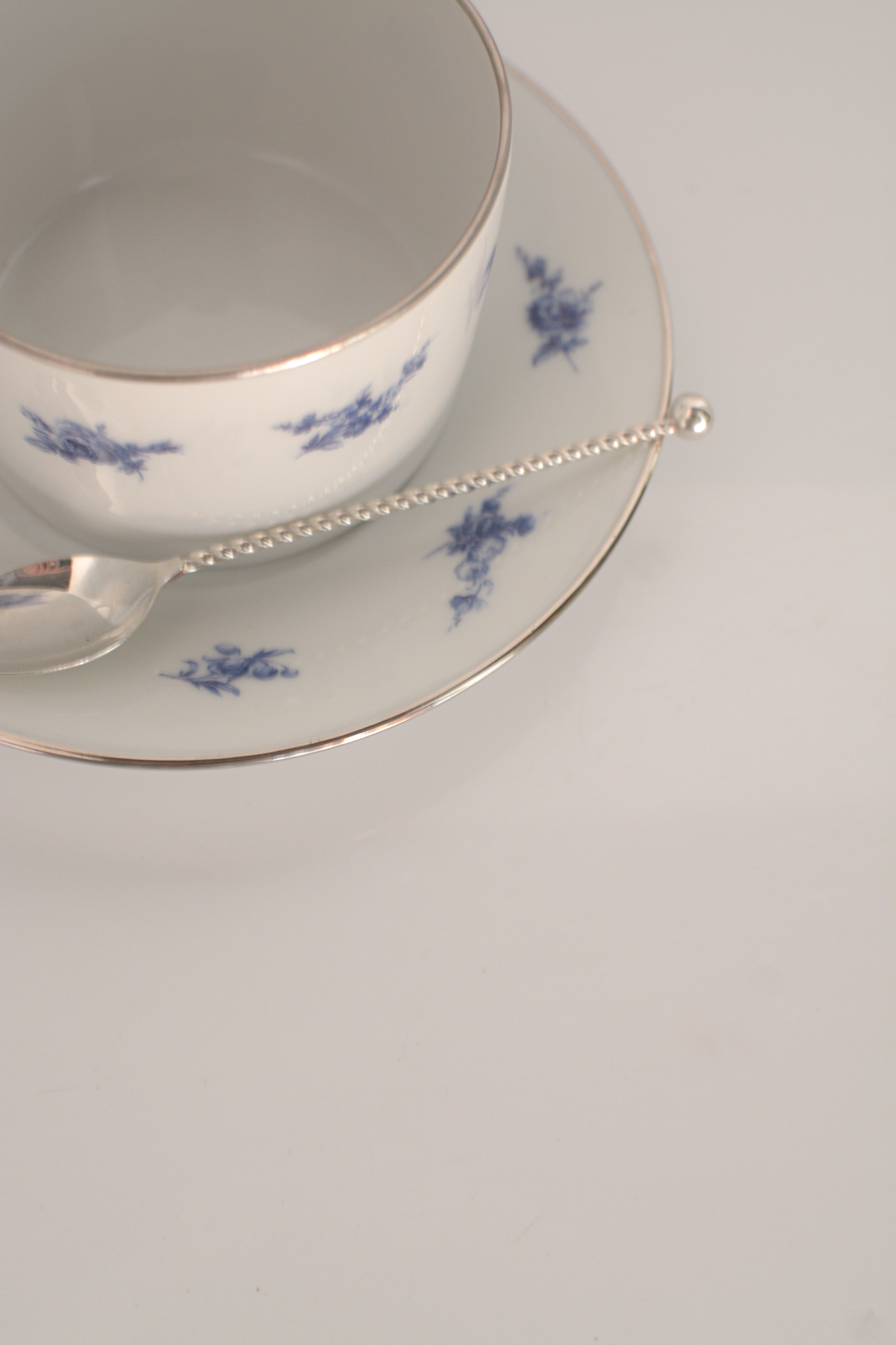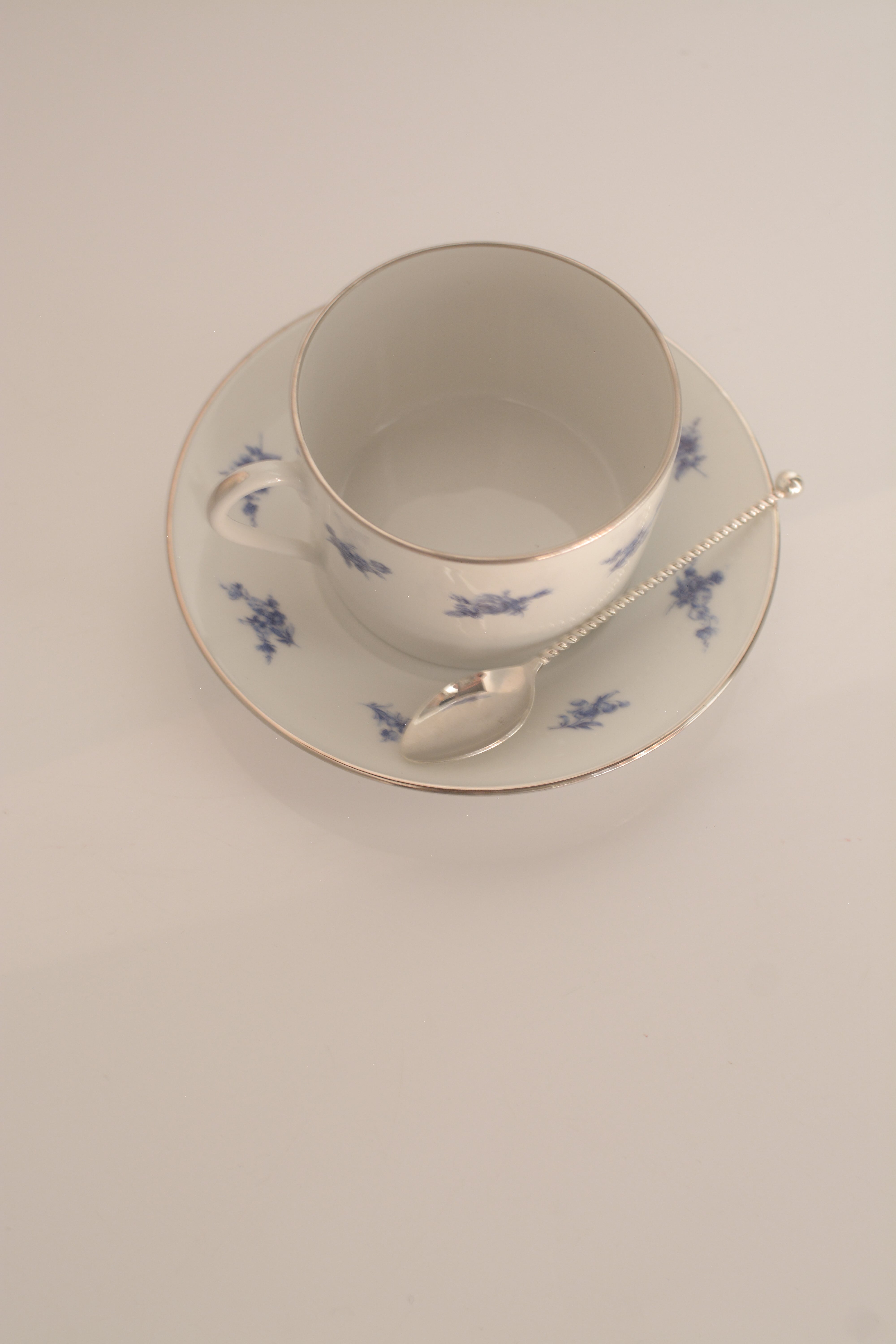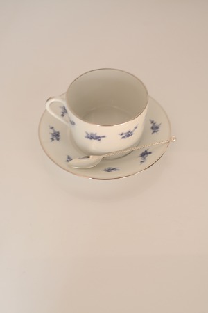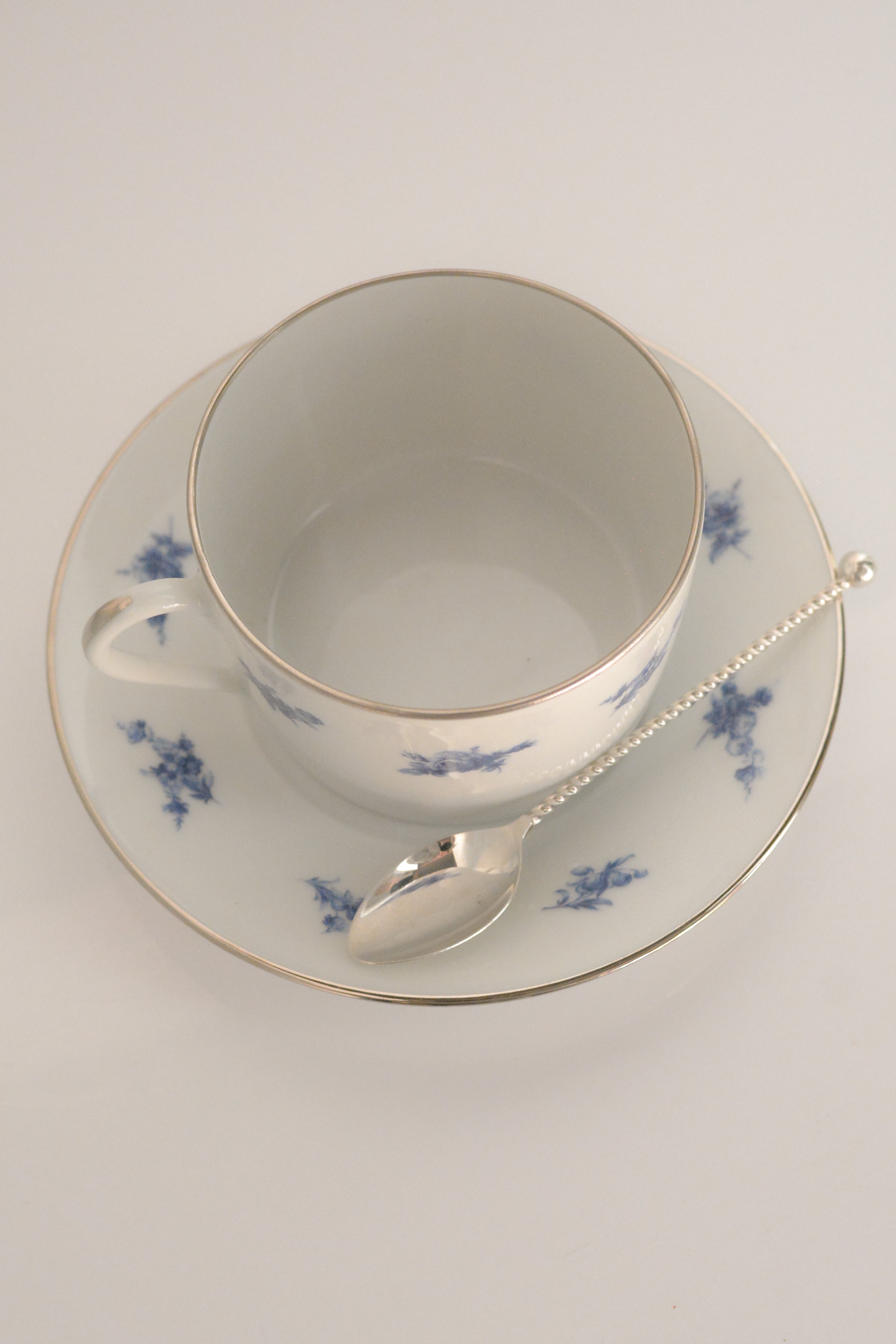 クラシックでありながら凛とした佇まいが魅力のフランス・Limogesのカップ&ソーサー。白磁の上には、小さな青い花が風に揺れるように描かれ、縁の細いラインと “A.J.”というイニシャルがシルバーの静かな輝きを宿しています。手に取ると少し背筋が伸びるような、品の良い佇まいです。小傷等ございますが、ヴィンテージとしては比較的良い状態です。複数在庫ございますのでセレクトしてのお届けとなります。