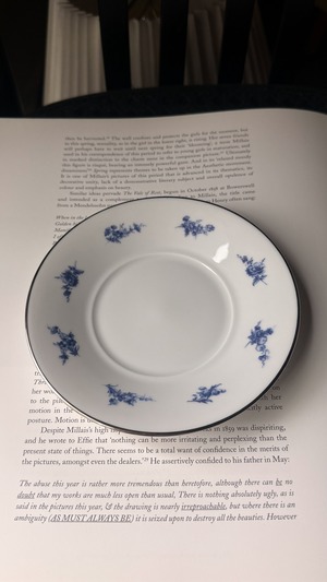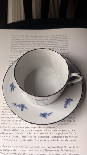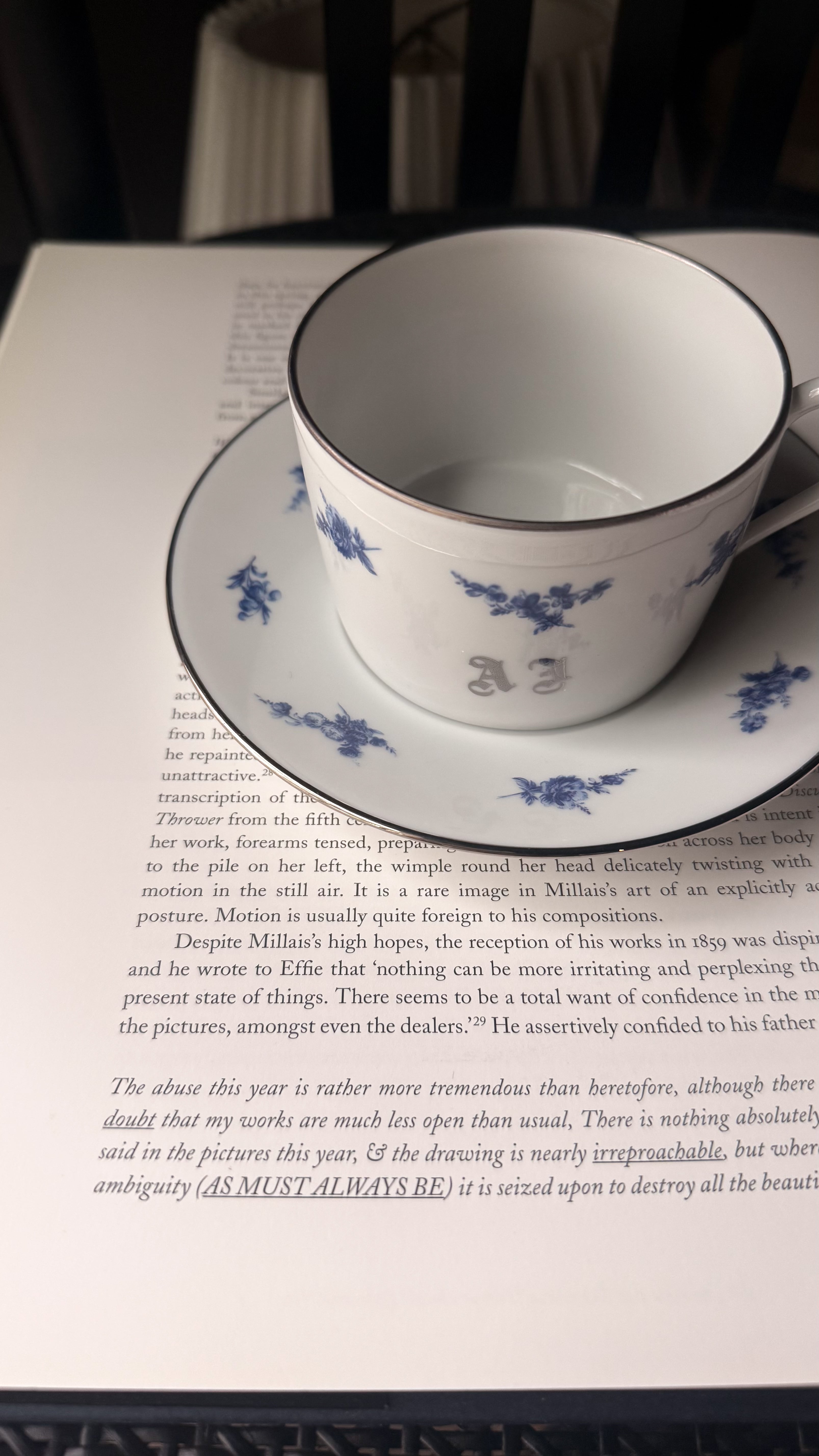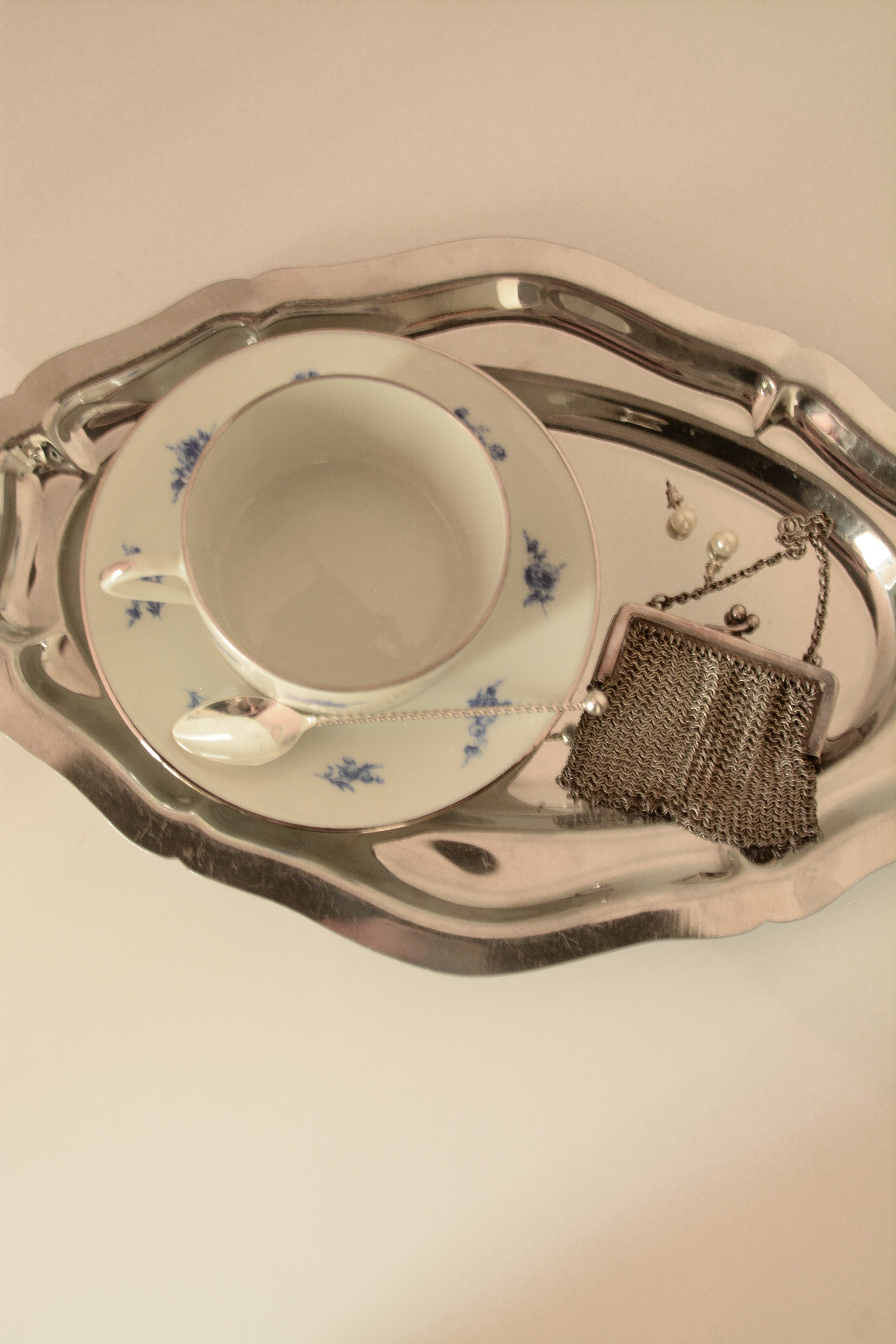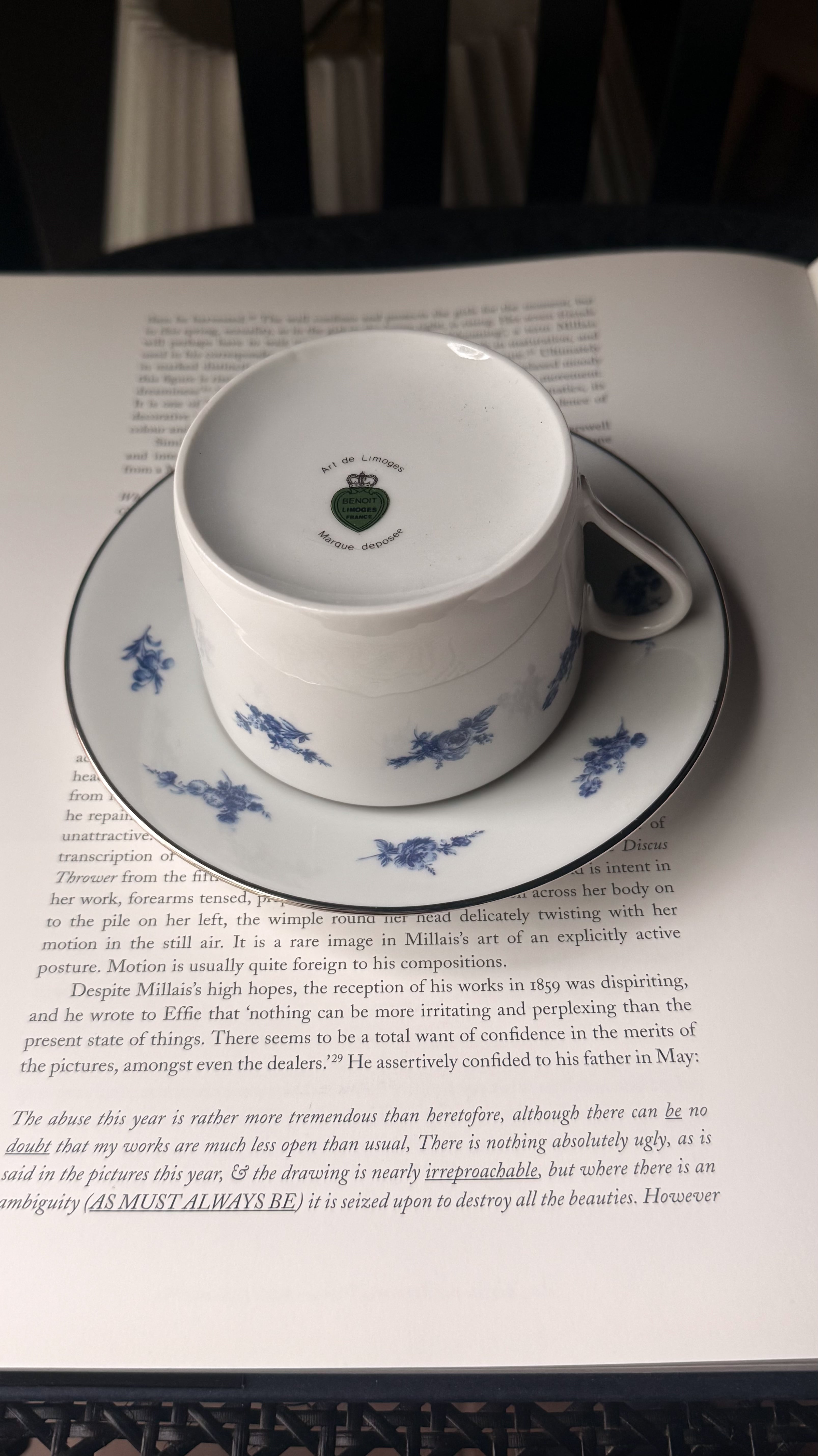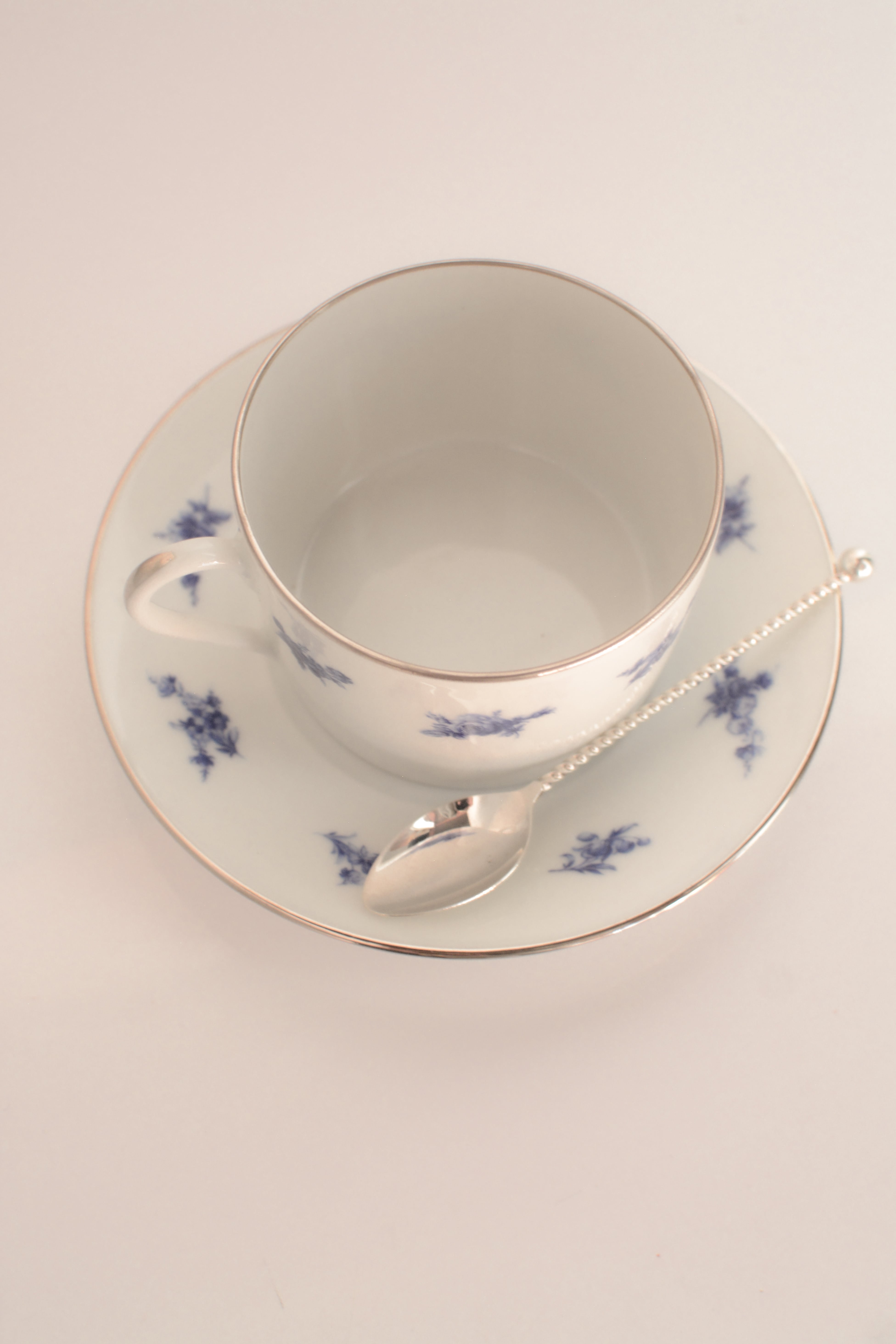 クラシックでありながら凛とした佇まいが魅力のフランス・Limogesのカップ&ソーサー。白磁の上には、小さな青い花が風に揺れるように描かれ、縁の細いラインと “A.J.”というイニシャルがシルバーの静かな輝きを宿しています。手に取ると少し背筋が伸びるような、品の良い佇まいです。小傷等ございますが、ヴィンテージとしては比較的良い状態です。複数在庫ございますのでセレクトしてのお届けとなります。