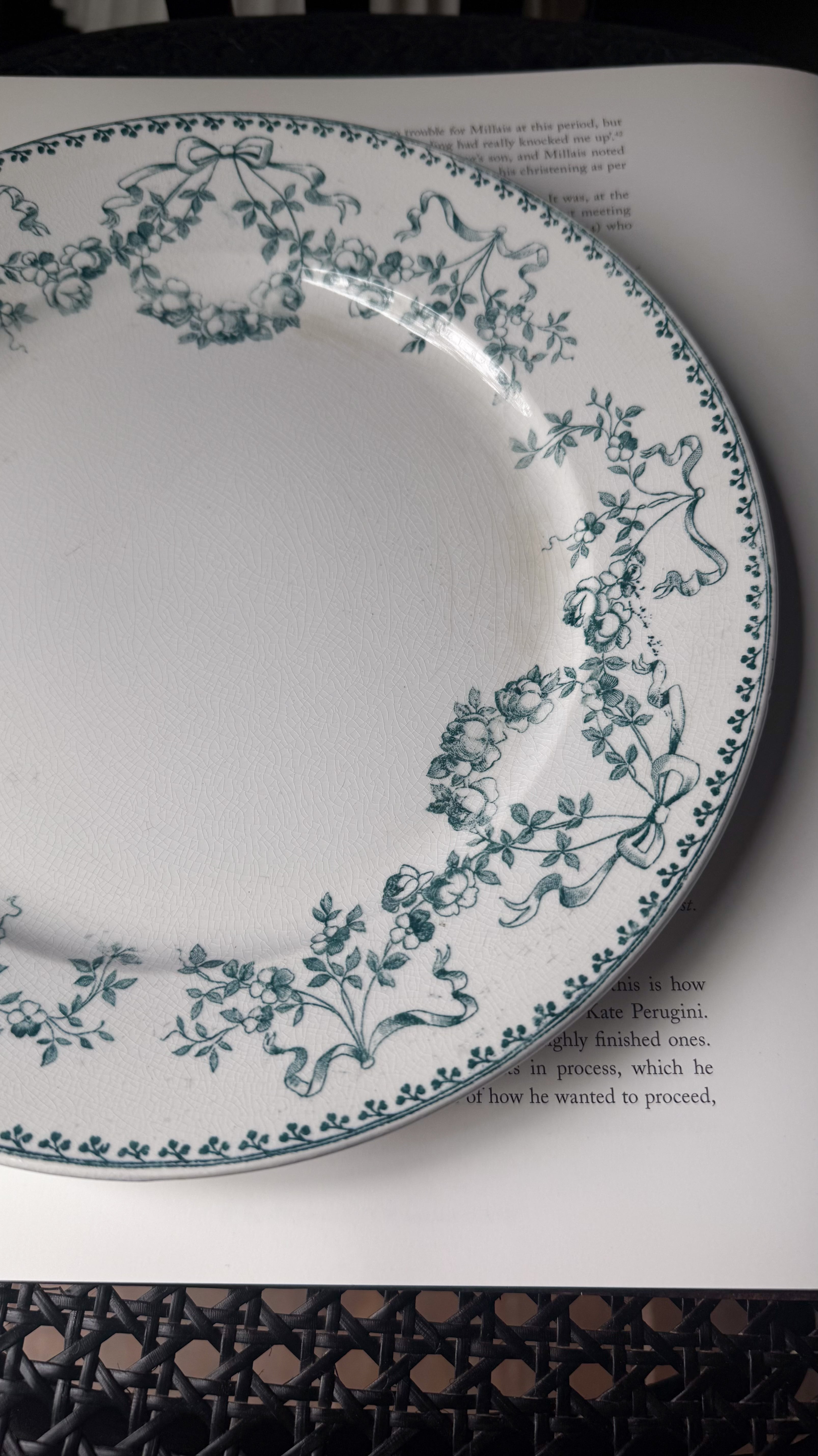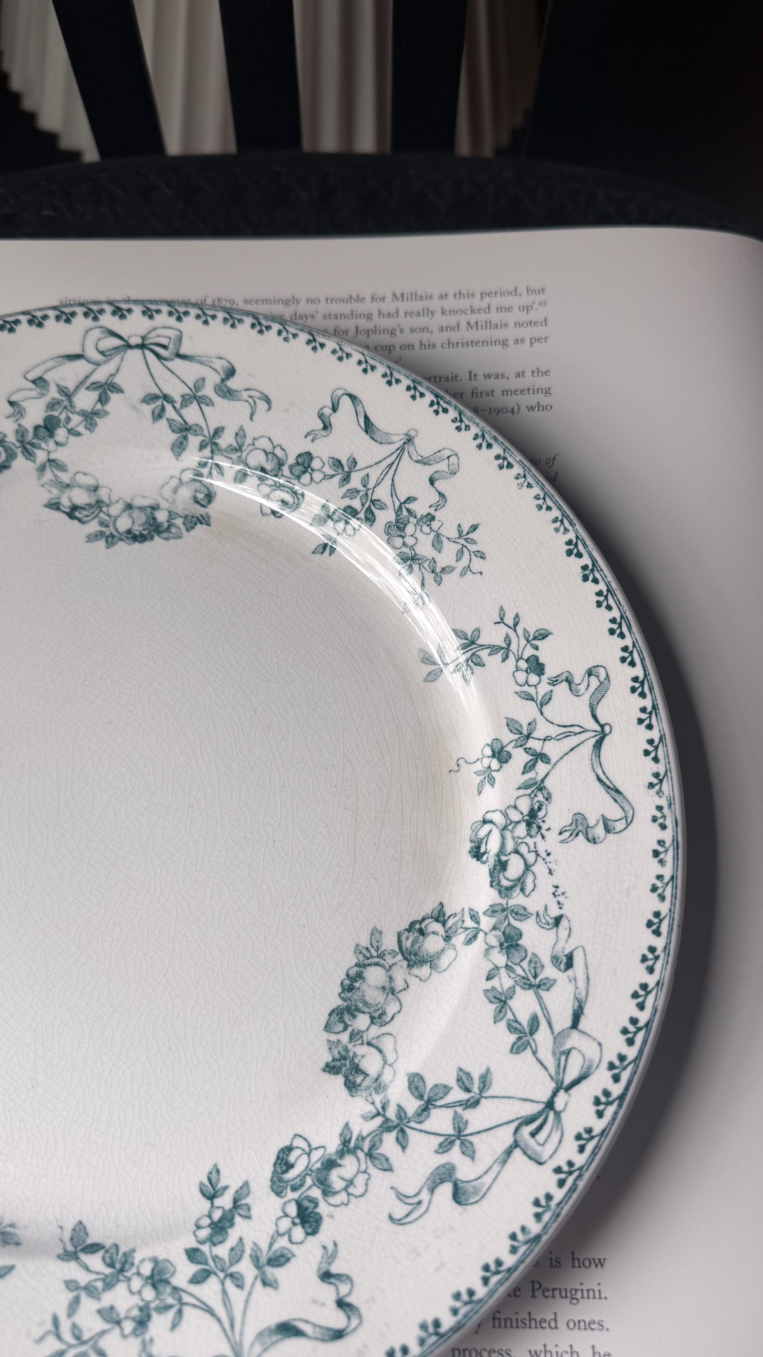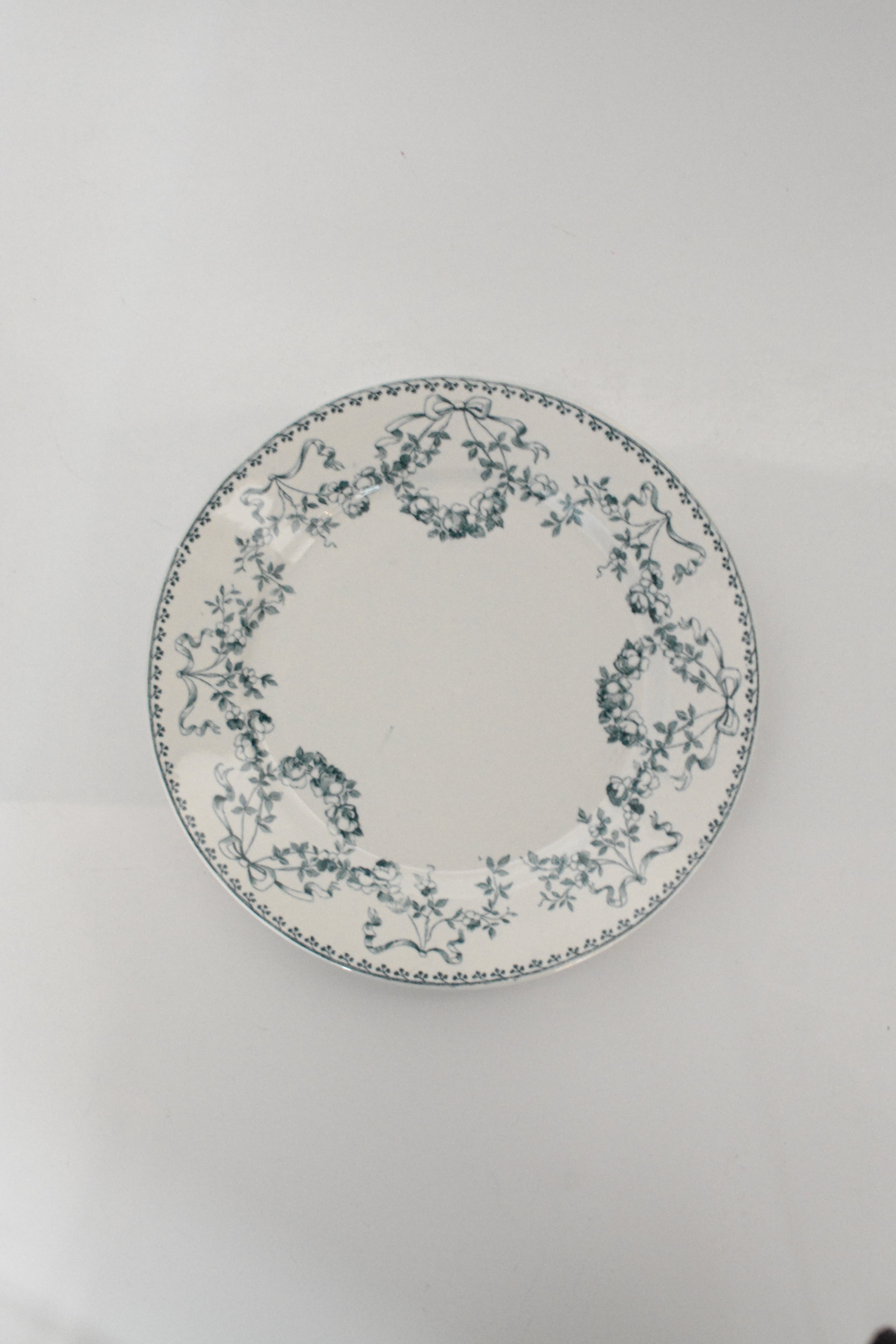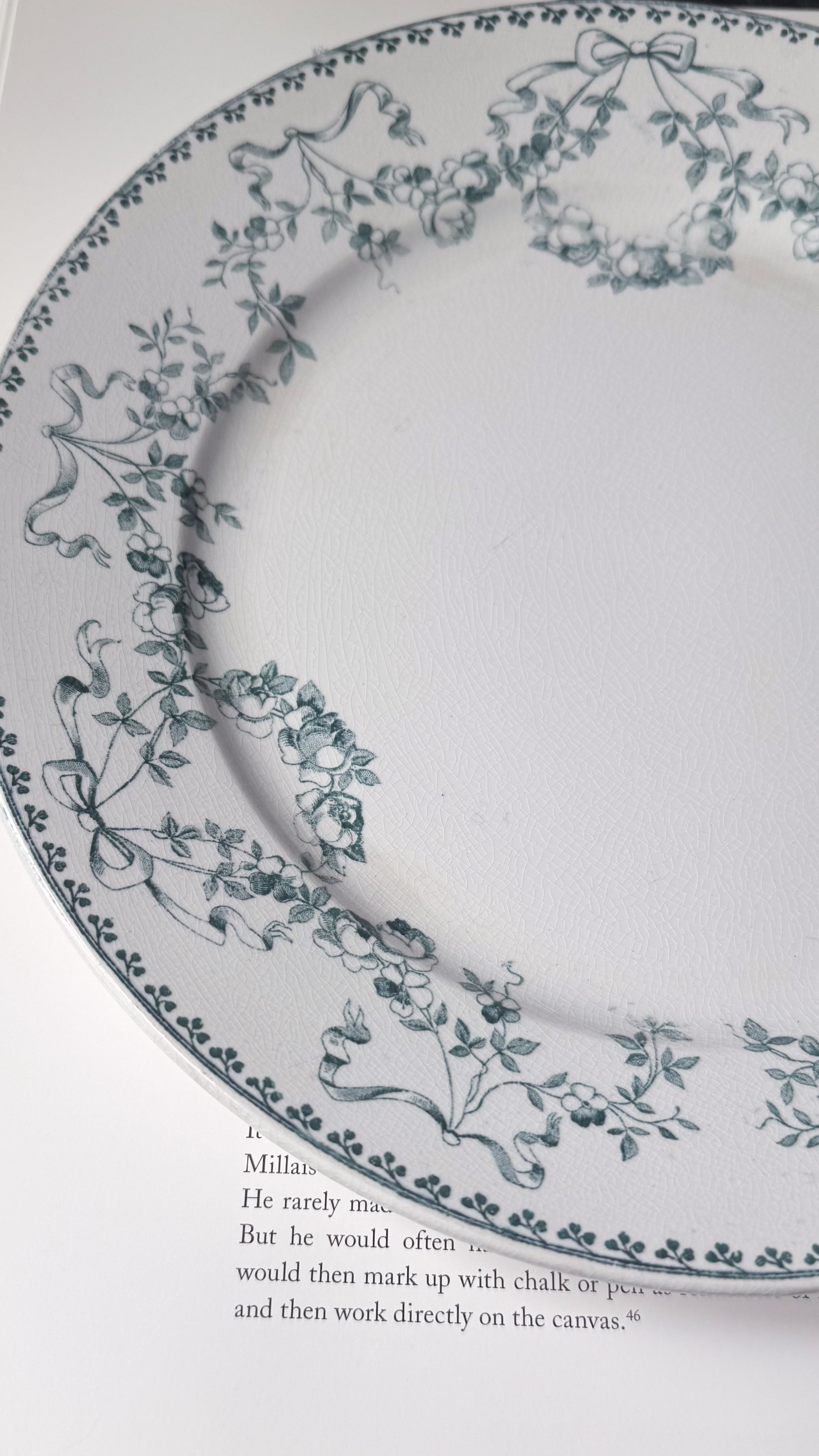 細やかな蔦と、ひらりと結ばれたリボン。小さな花が、ぐるりと輪になって踊るように縁をめぐるSarregueminesのMozartシリーズ。光があたると、うっすらと入った貫入が静かな時間のひびきをそっと浮かび上がらせます。年月を経て生まれた、釉薬表面の細やかな貫入や、ところどころに見られる淡い古色、このプレートが辿ってきた時間の証。ヴィンテージならではの柔らかな表情としてお楽しみください。