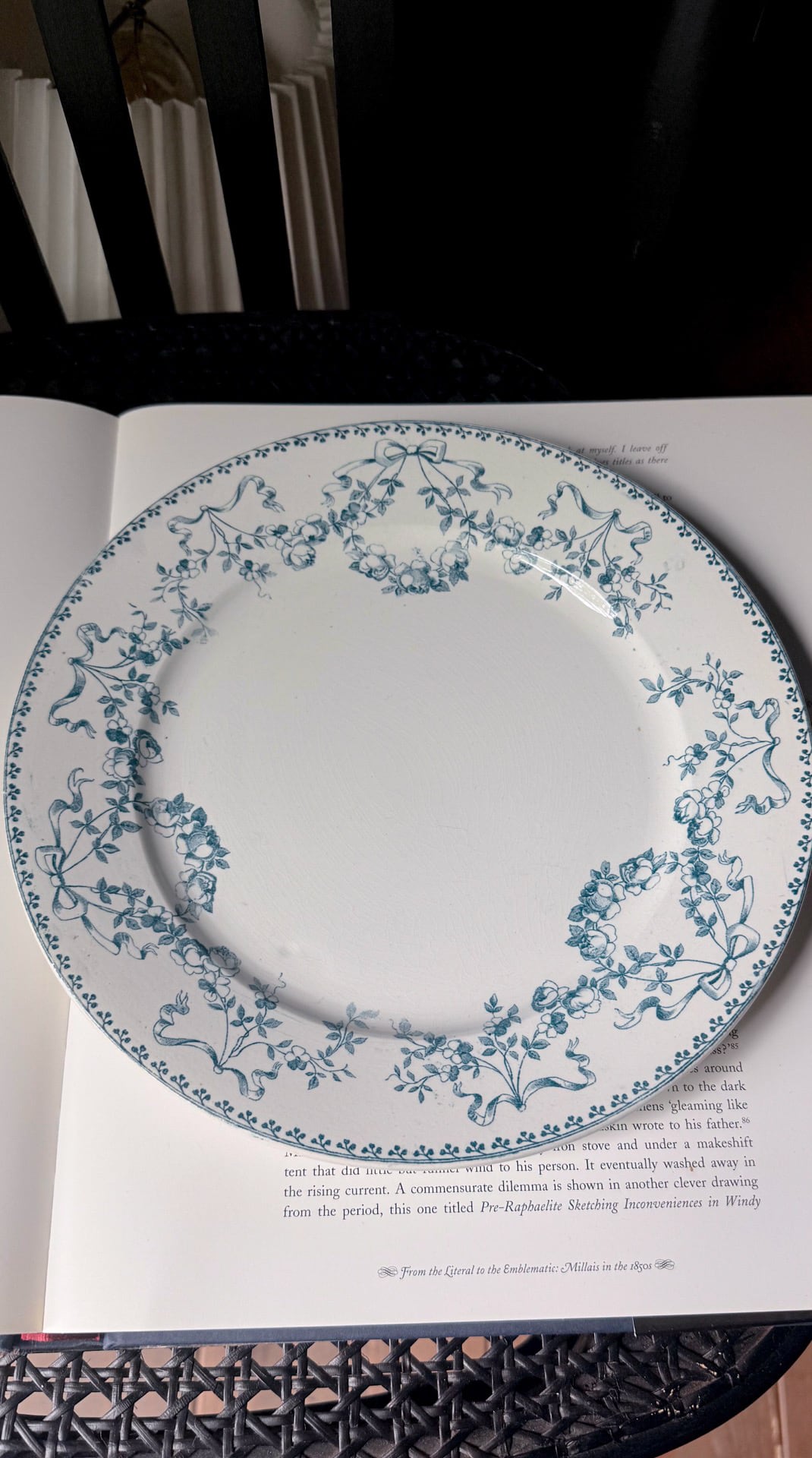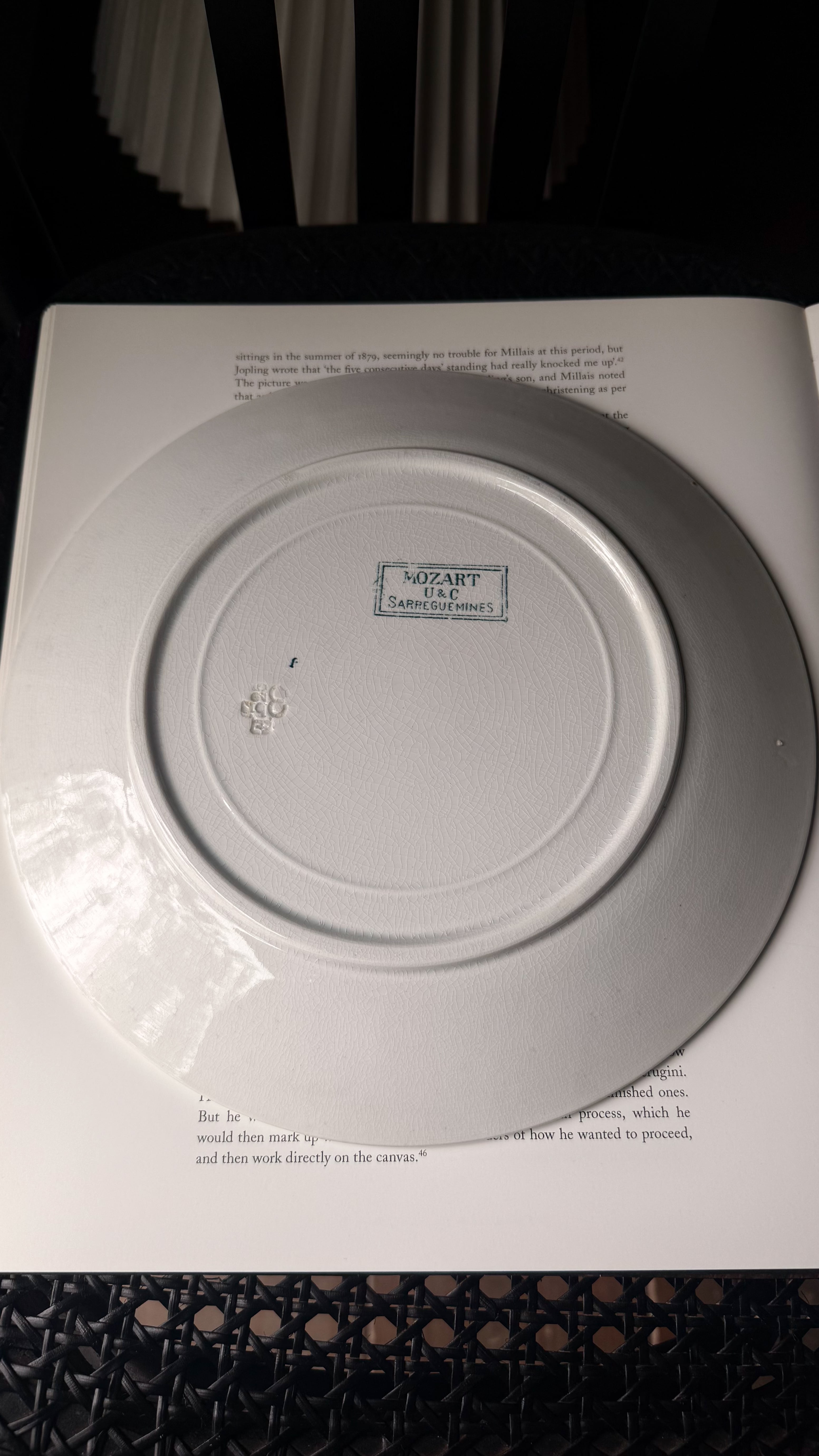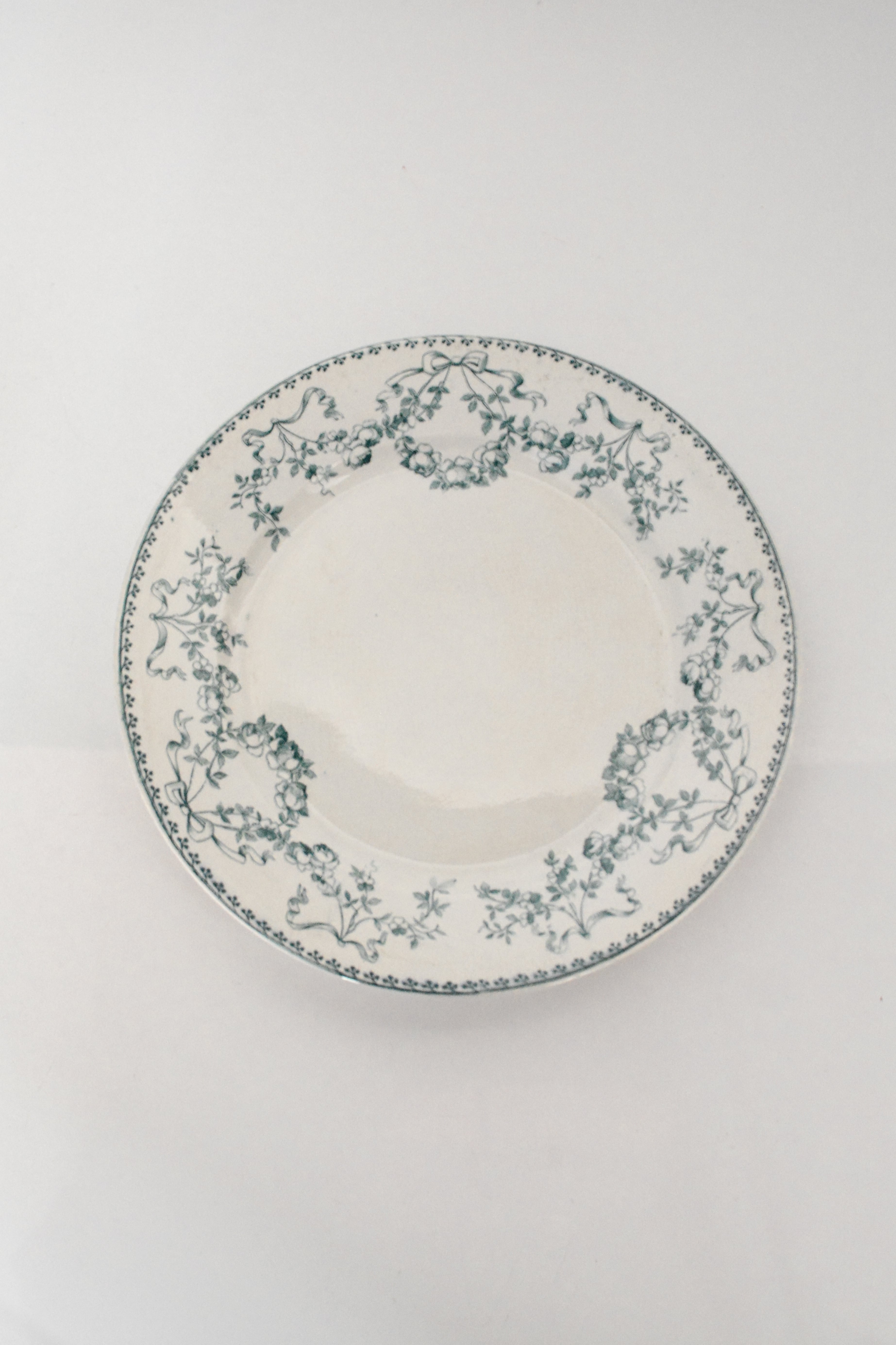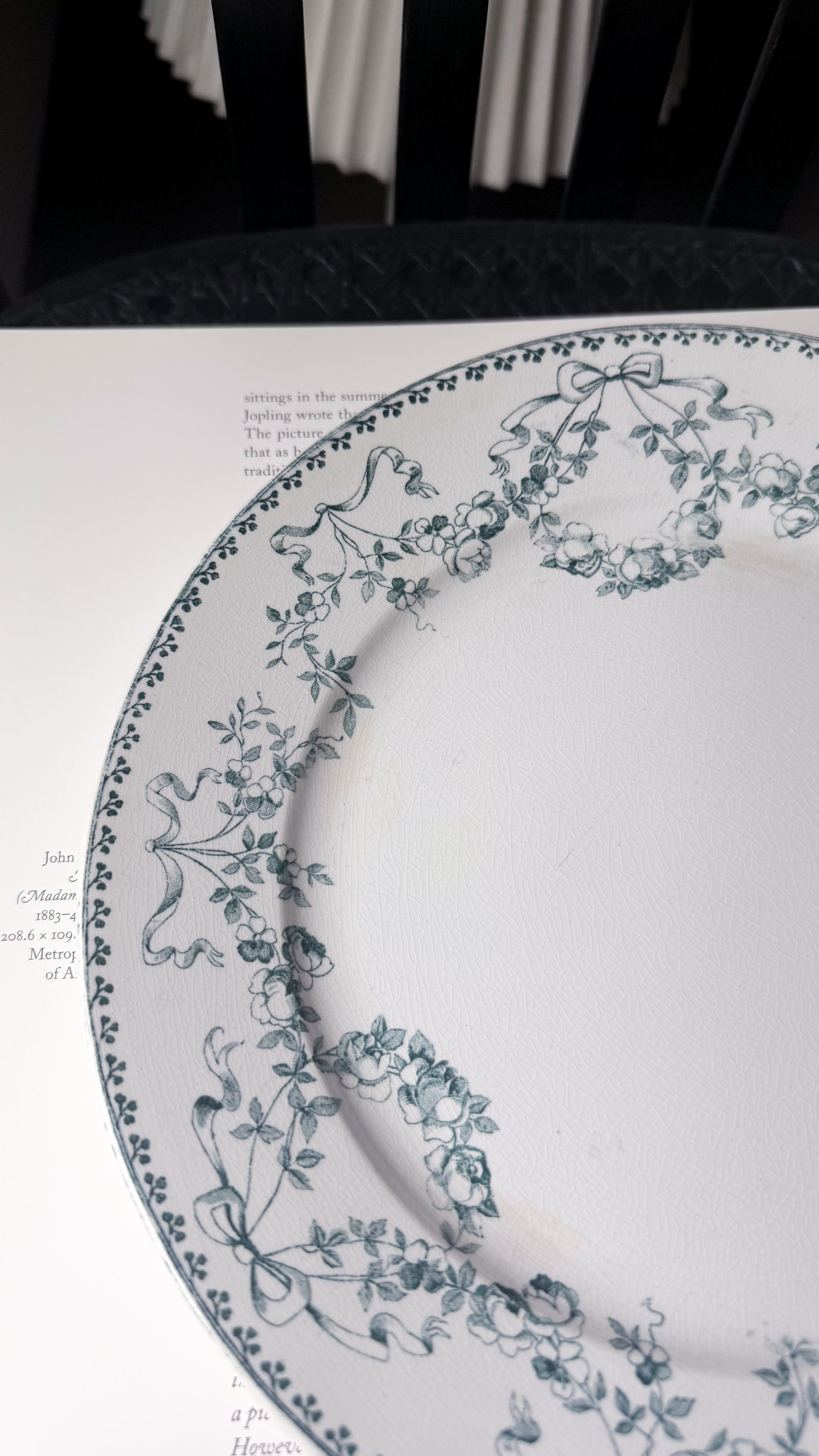 細やかな蔦と、ひらりと結ばれたリボン。小さな花が、ぐるりと輪になって踊るように縁をめぐるSarregueminesのMozartシリーズ。光があたると、うっすらと入った貫入が静かな時間のひびきをそっと浮かび上がらせます。年月を経て生まれた、釉薬表面の細やかな貫入や、ところどころに見られる淡い古色、このプレートが辿ってきた時間の証。ヴィンテージならではの柔らかな表情としてお楽しみください。