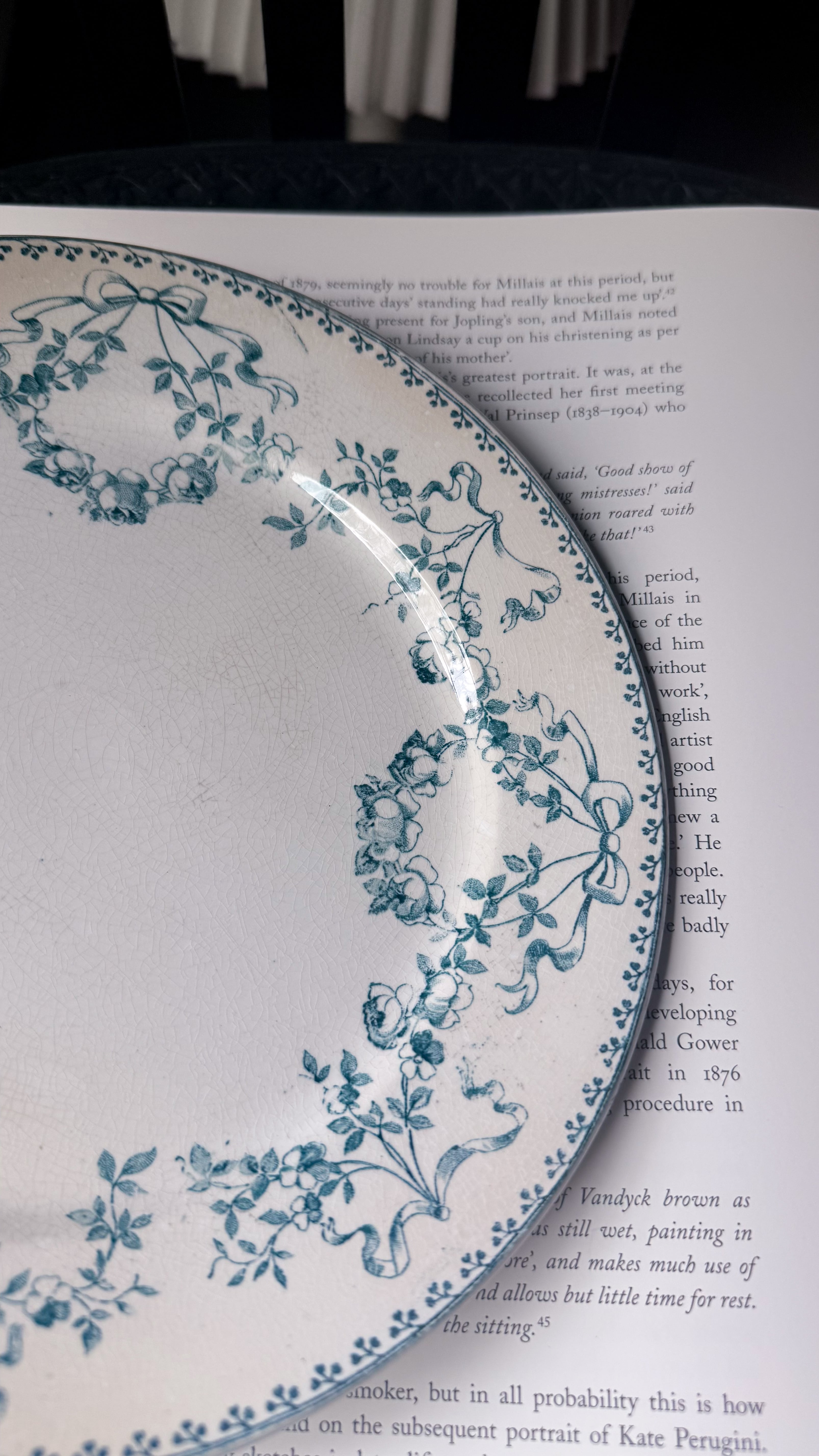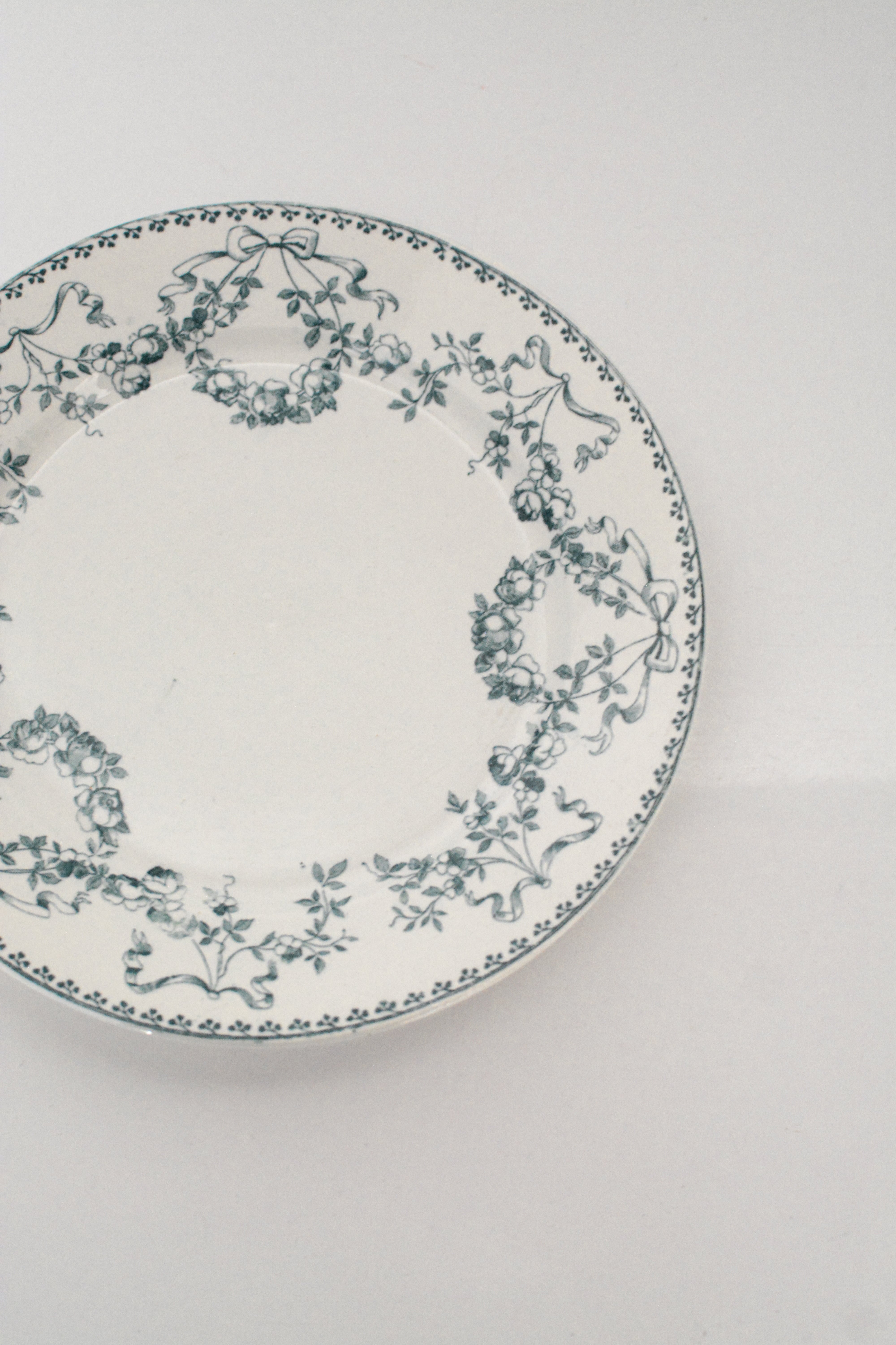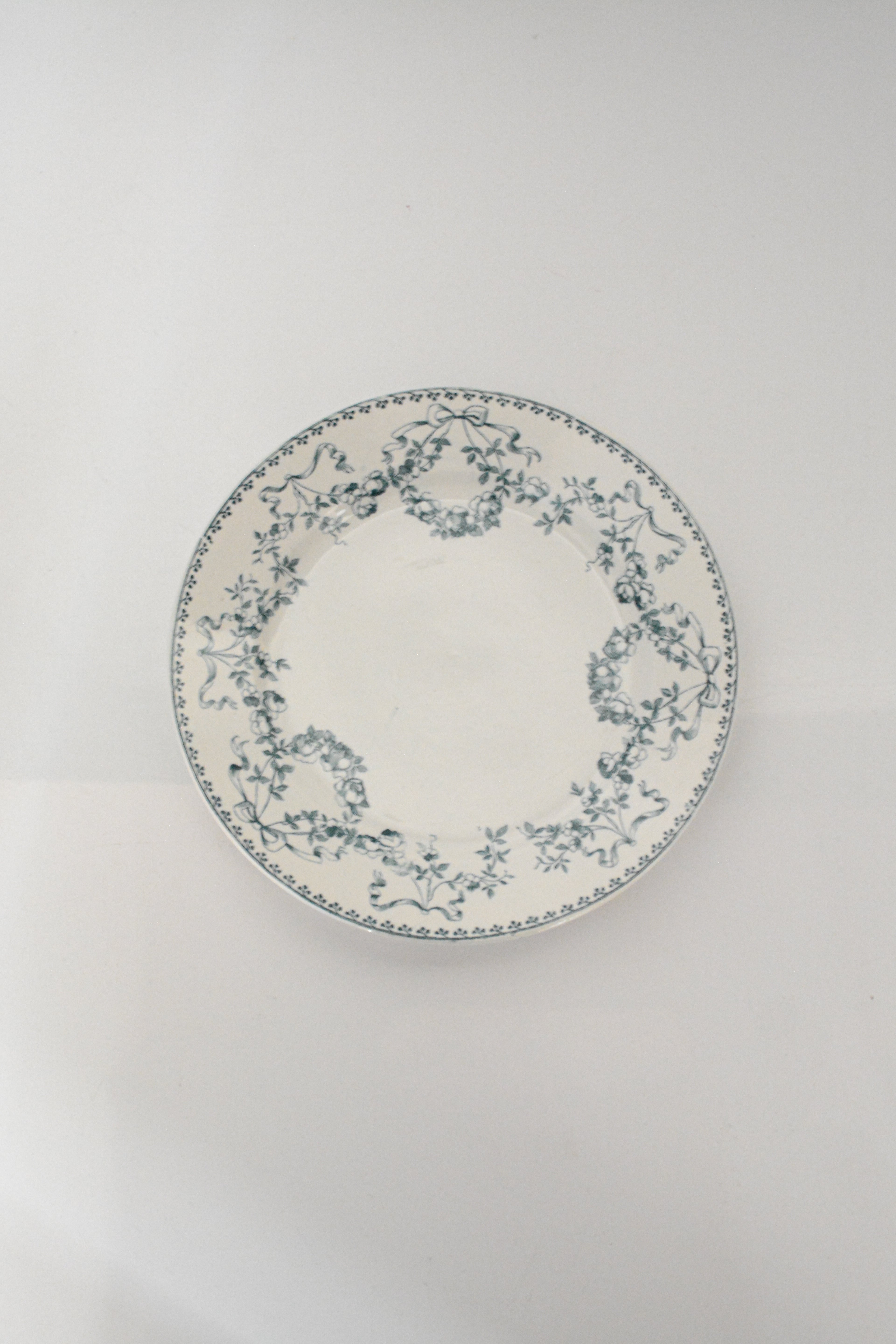 細やかな蔦と、ひらりと結ばれたリボン。小さな花が、ぐるりと輪になって踊るように縁をめぐるSarregueminesのMozartシリーズ。光があたると、うっすらと入った貫入が静かな時間のひびきをそっと浮かび上がらせます。年月を経て生まれた、釉薬表面の細やかな貫入や、ところどころに見られる淡い古色、このプレートが辿ってきた時間の証。ヴィンテージならではの柔らかな表情としてお楽しみください。