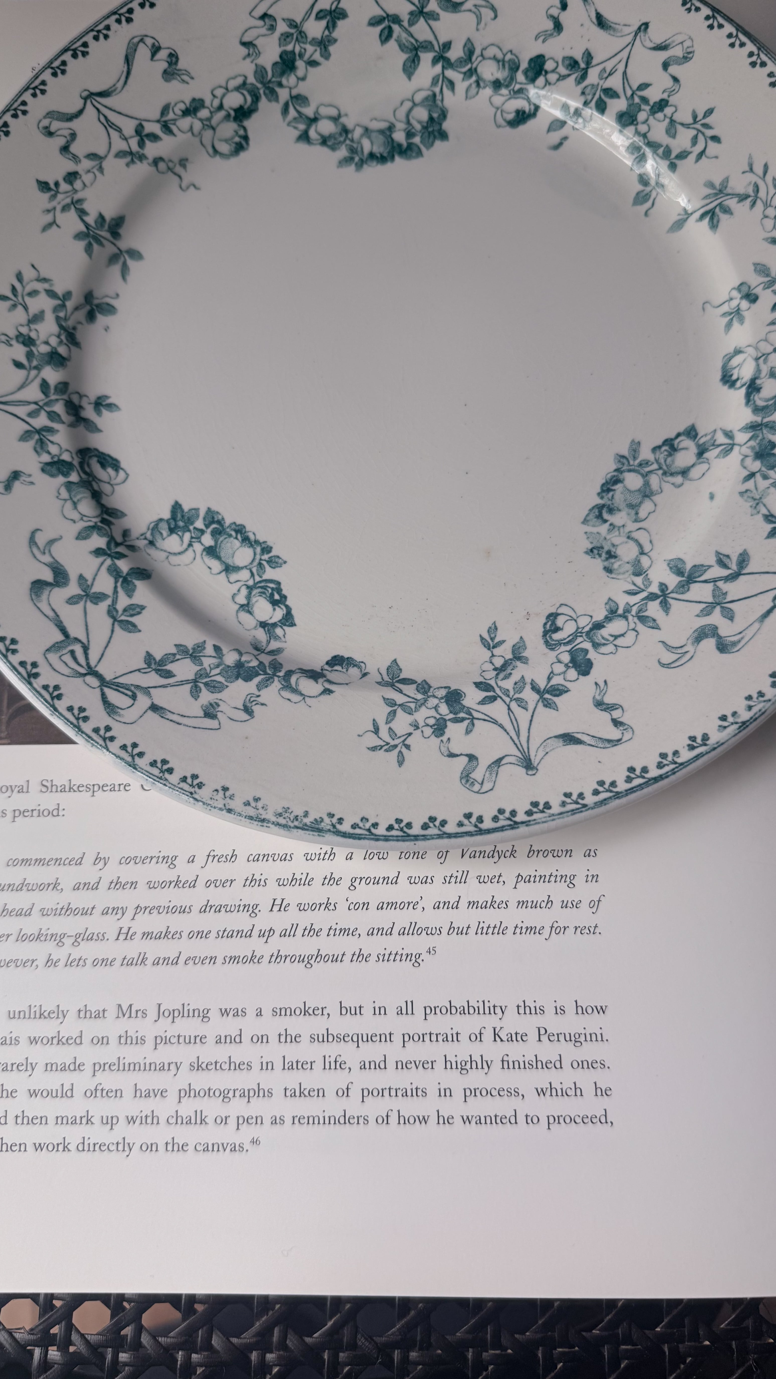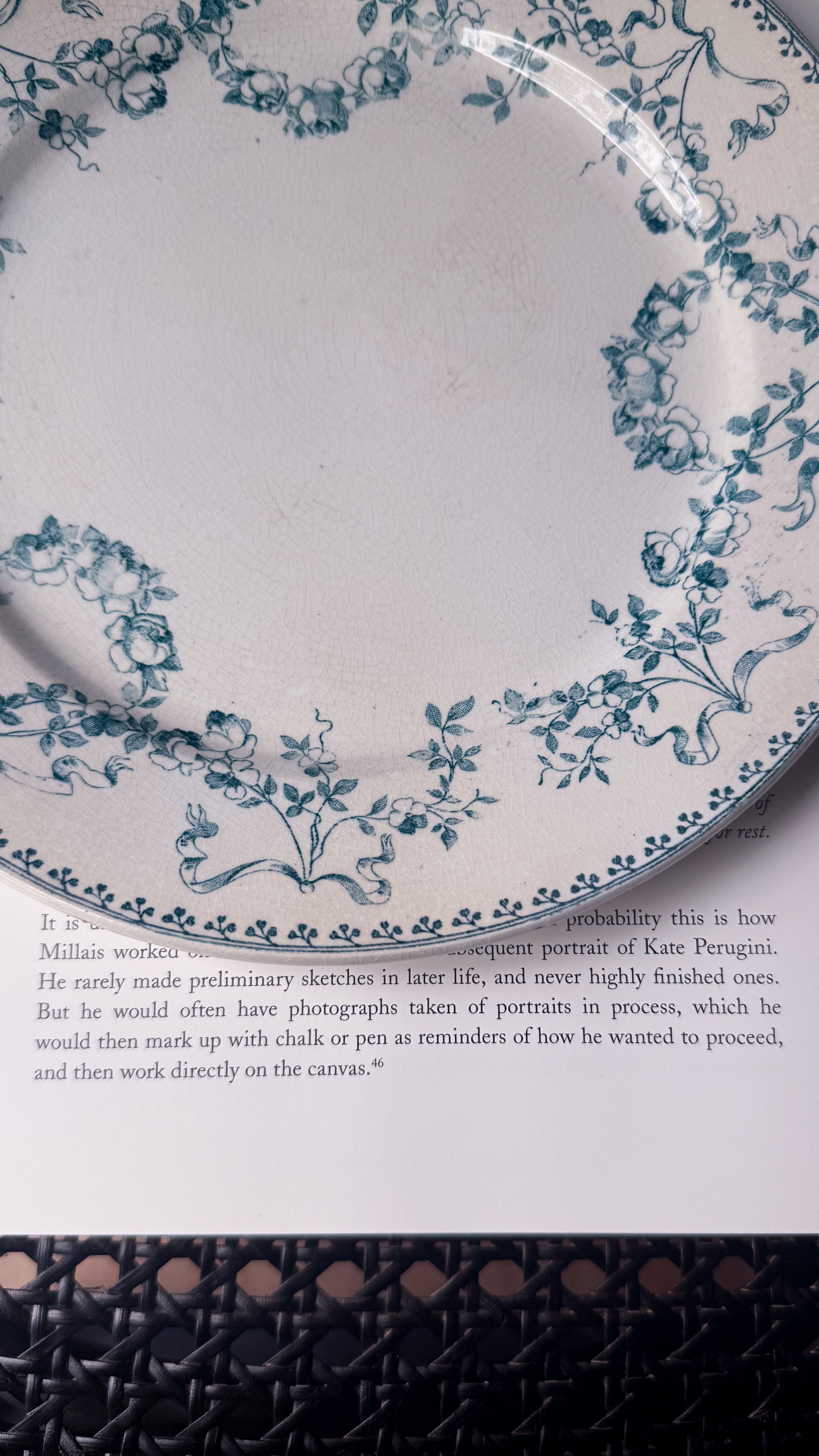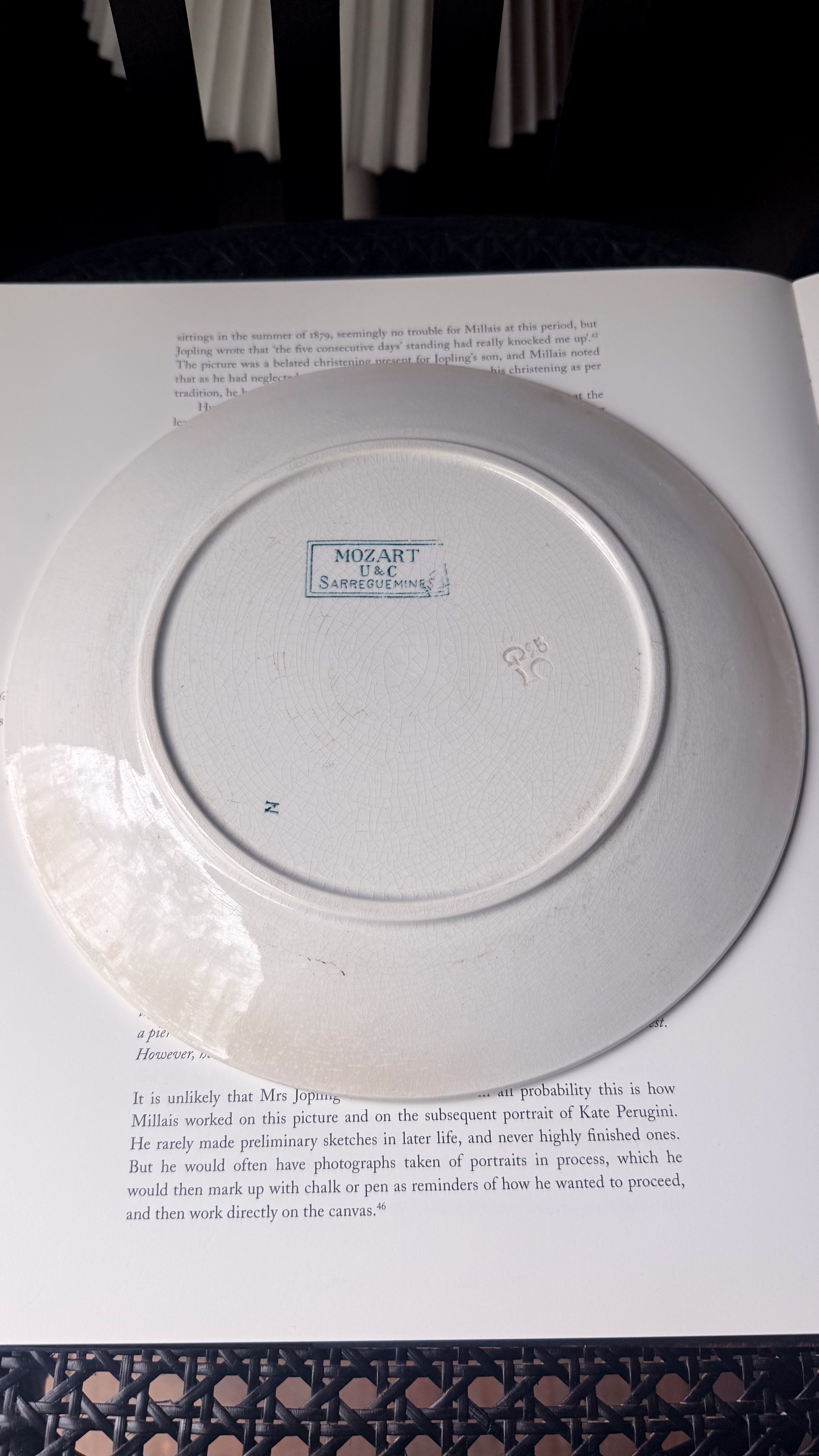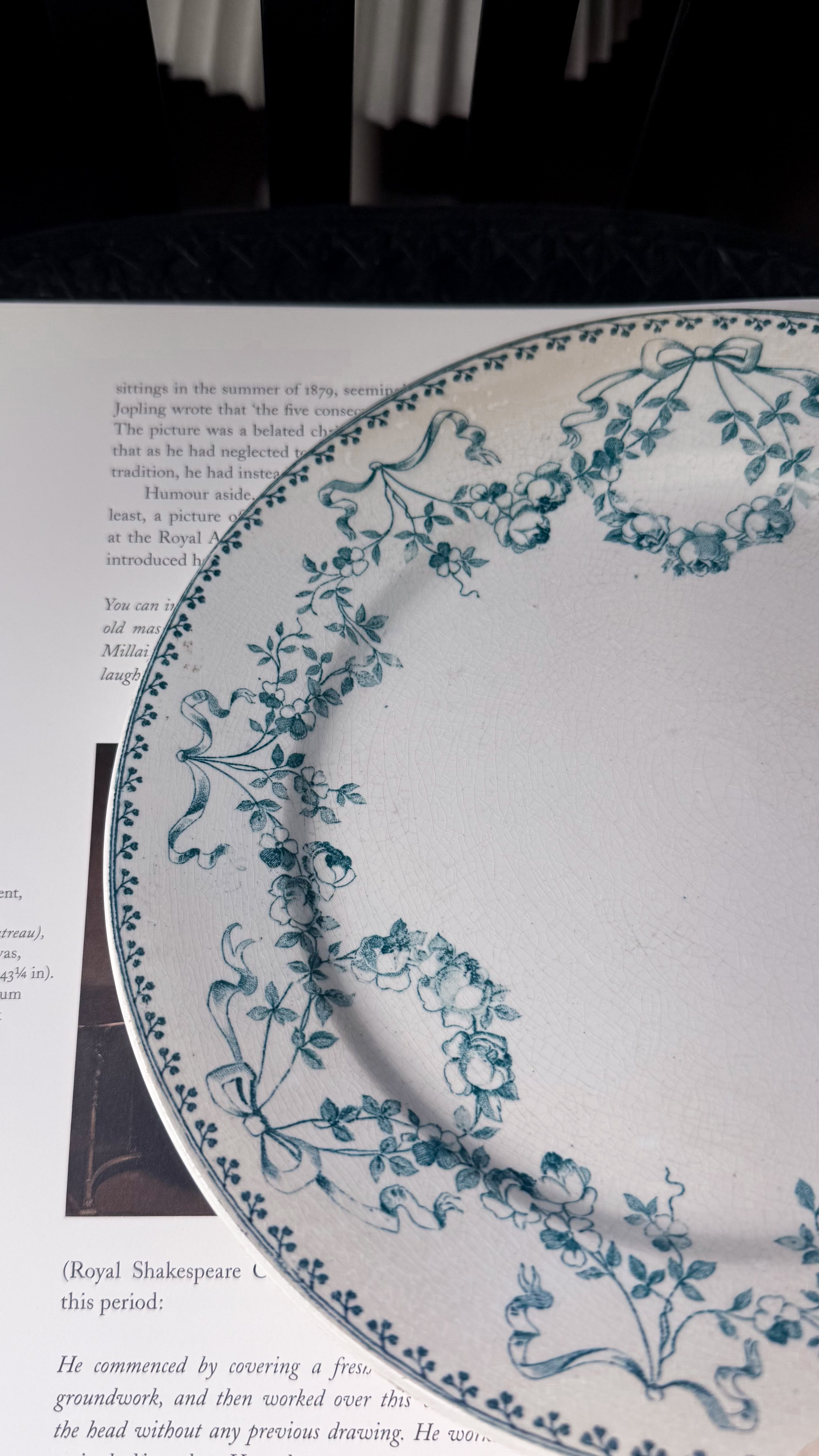 細やかな蔦と、ひらりと結ばれたリボン。小さな花が、ぐるりと輪になって踊るように縁をめぐるSarregueminesのMozartシリーズ。光があたると、うっすらと入った貫入が静かな時間のひびきをそっと浮かび上がらせます。年月を経て生まれた、釉薬表面の細やかな貫入や、ところどころに見られる淡い古色、このプレートが辿ってきた時間の証。ヴィンテージならではの柔らかな表情としてお楽しみください。