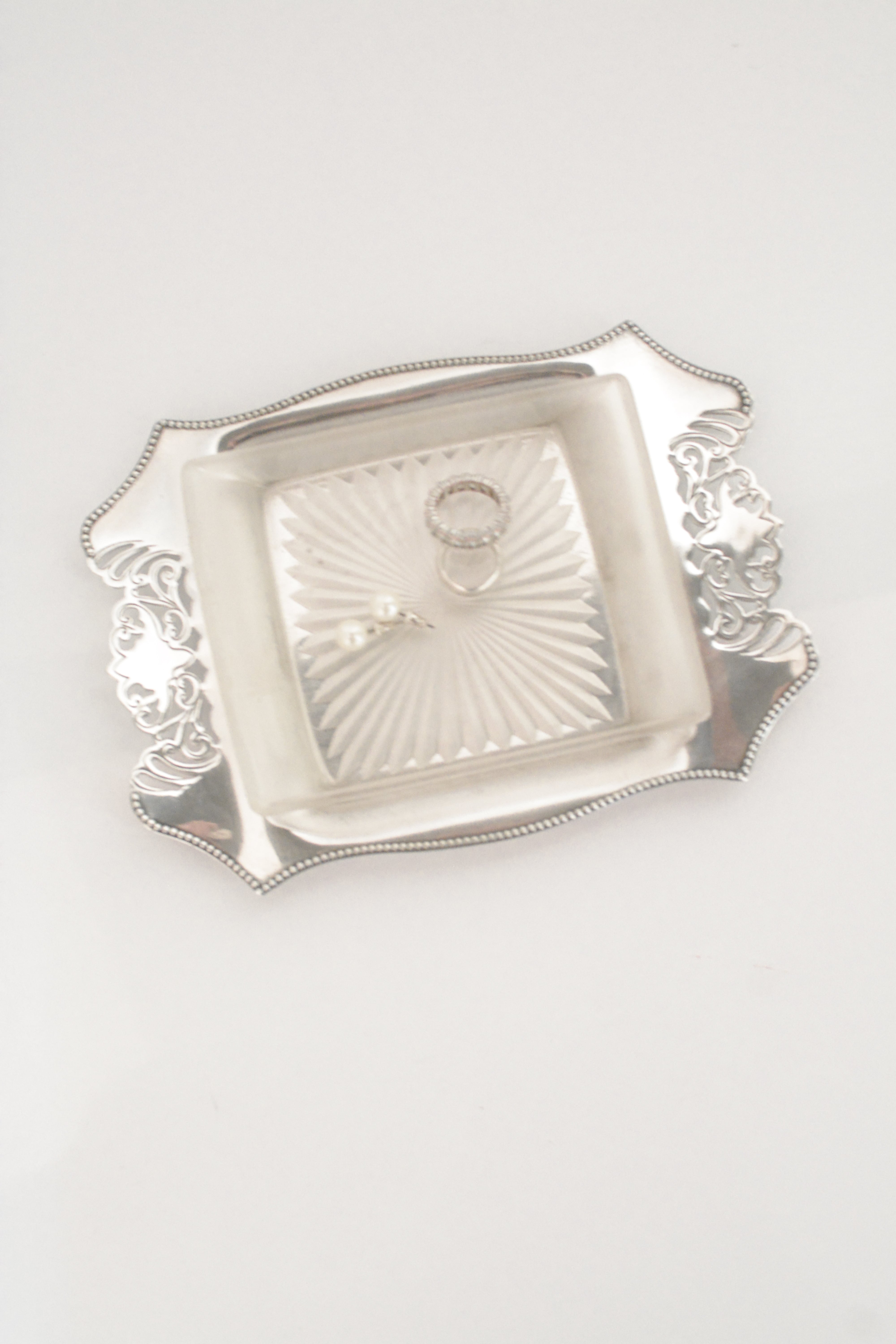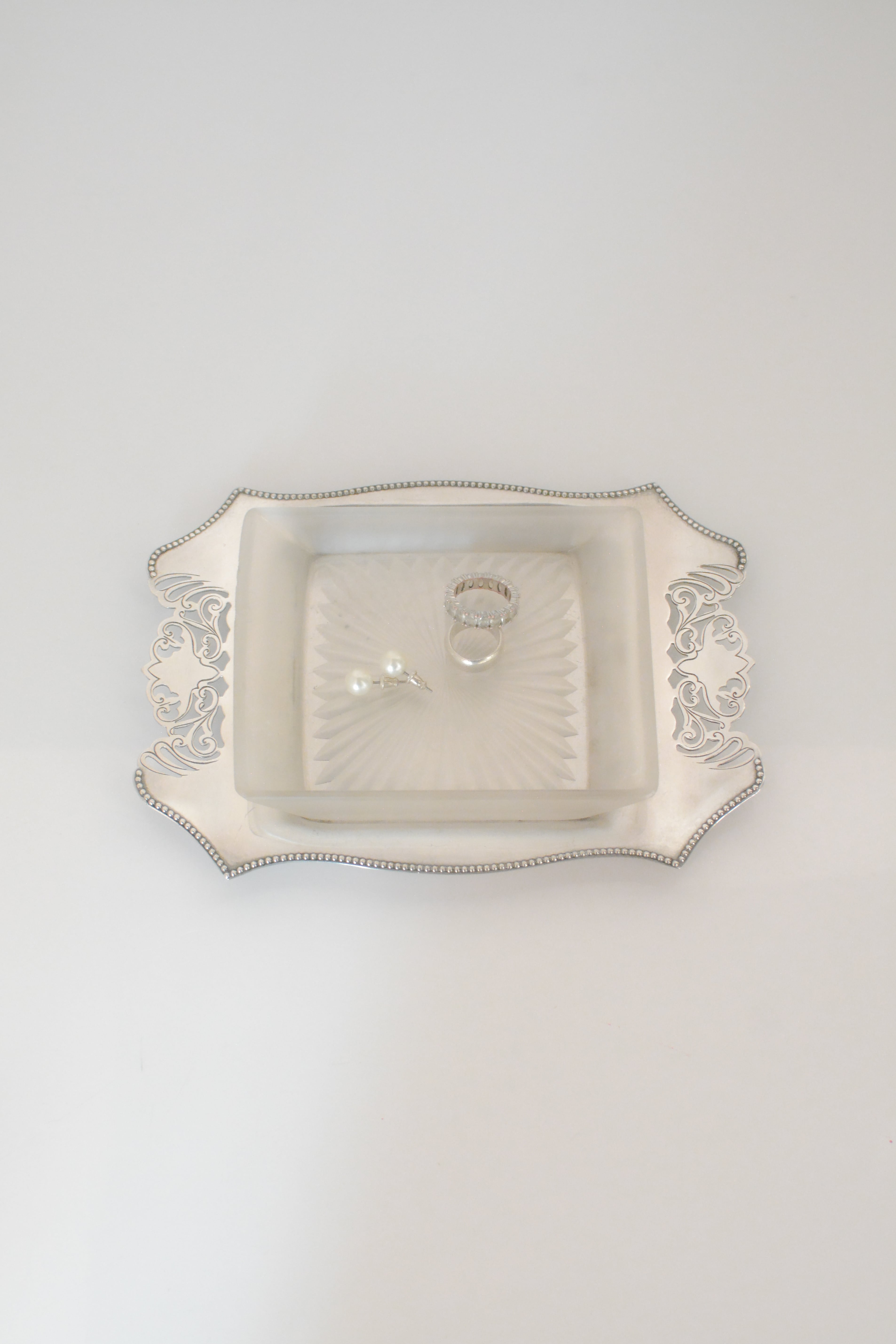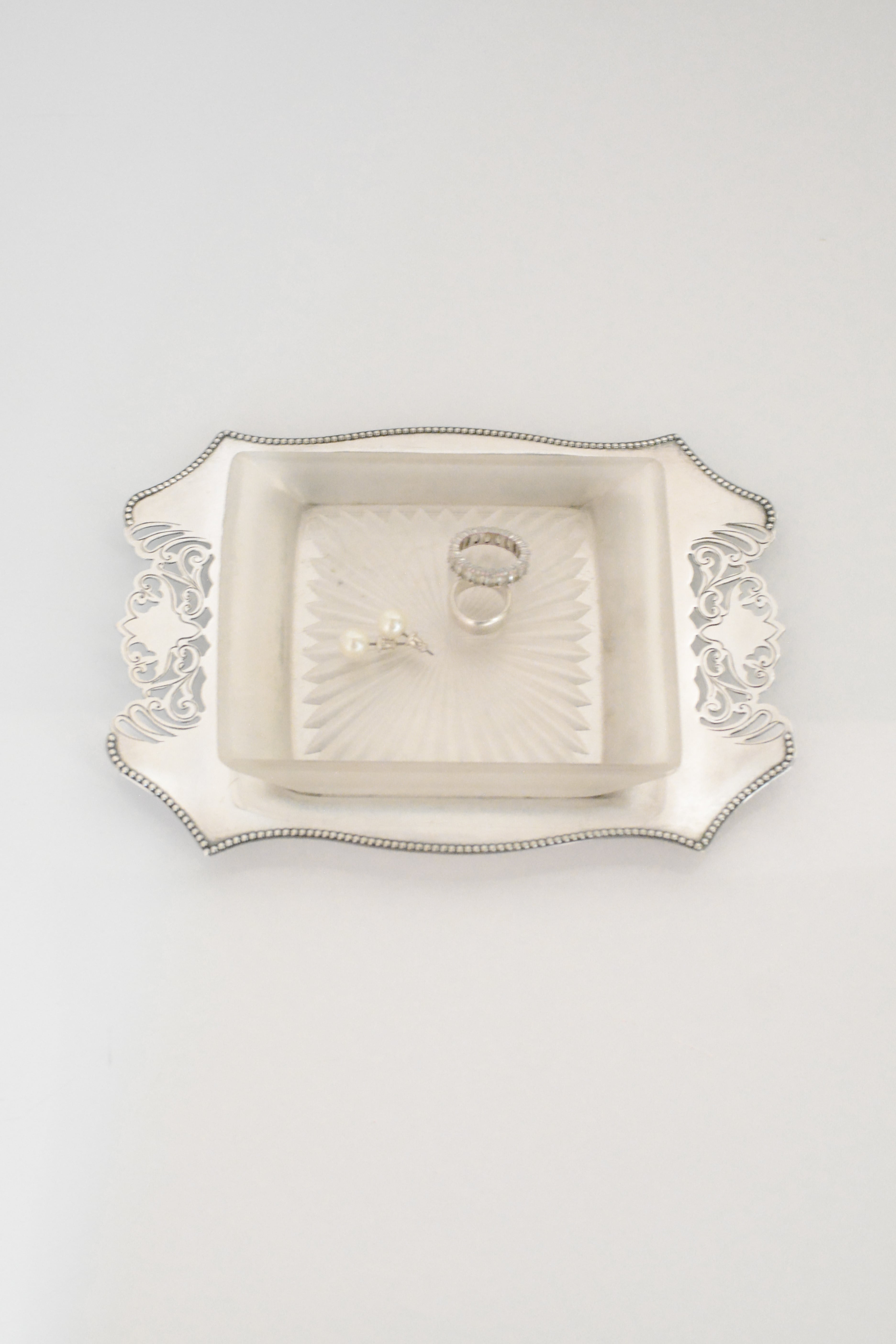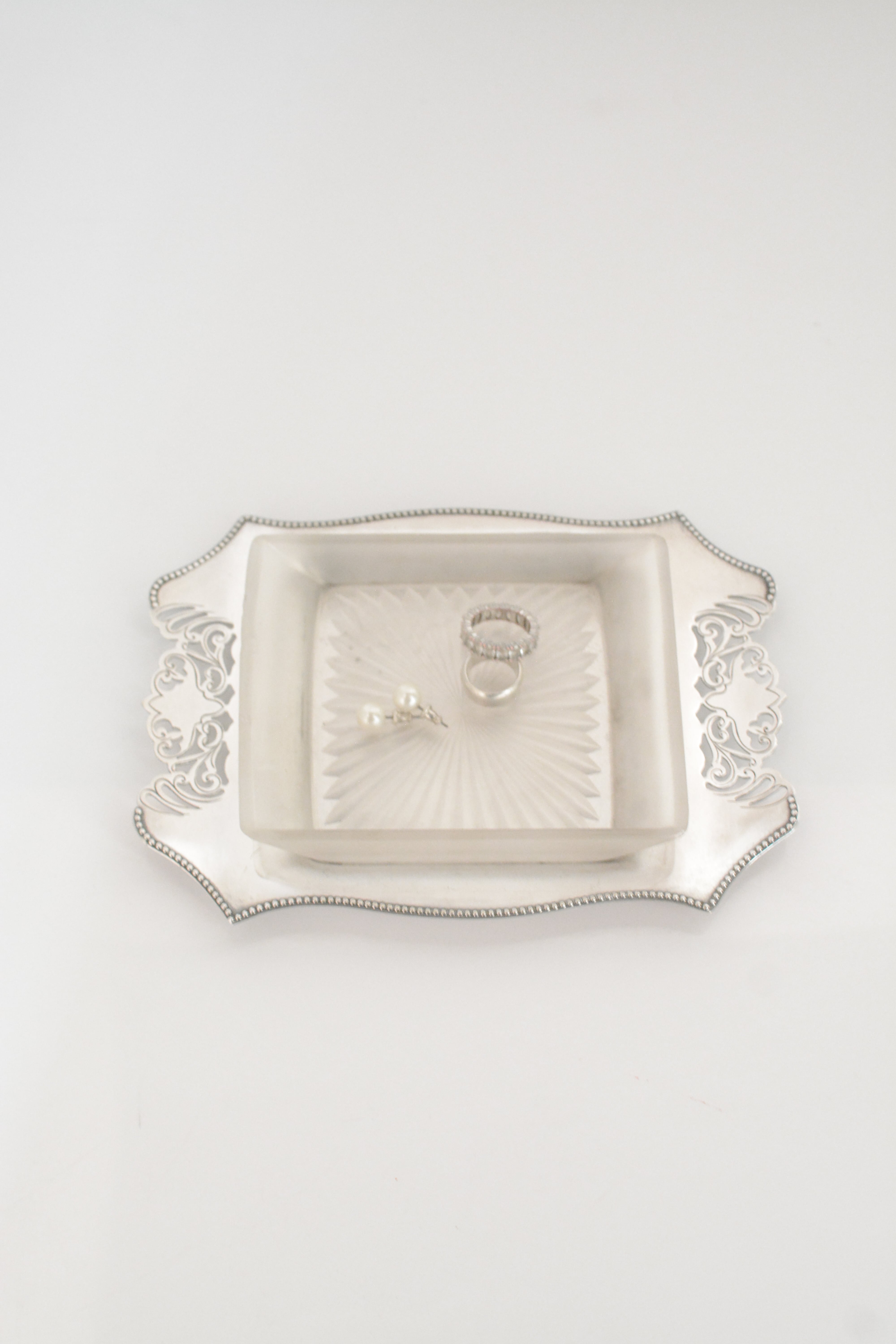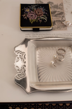 透かし彫りのシルバープレートに、光を受けて静かにきらめくカットガラス。ベースには 「HF&Co S EPNS A1」 の刻印、縁に連なる繊細な装飾が美しいですね。中央に収められたガラスディッシュには、放射状に広がるカットが施され、その一角に見られる小さな欠けは、長い年月を経てきた証のように、光の表情にわずかな揺らぎを添えています。バターやジャムをのせる食卓の道具として使われていたかと思いますが、指輪やピアスを休ませる場所としても、凛とした存在感を放つひと品。時を経たからこそ宿る、時の気配と奥行きをお楽しみいただけます。全体として、経年を重ねたヴィンテージならではの良好なコンディションです。